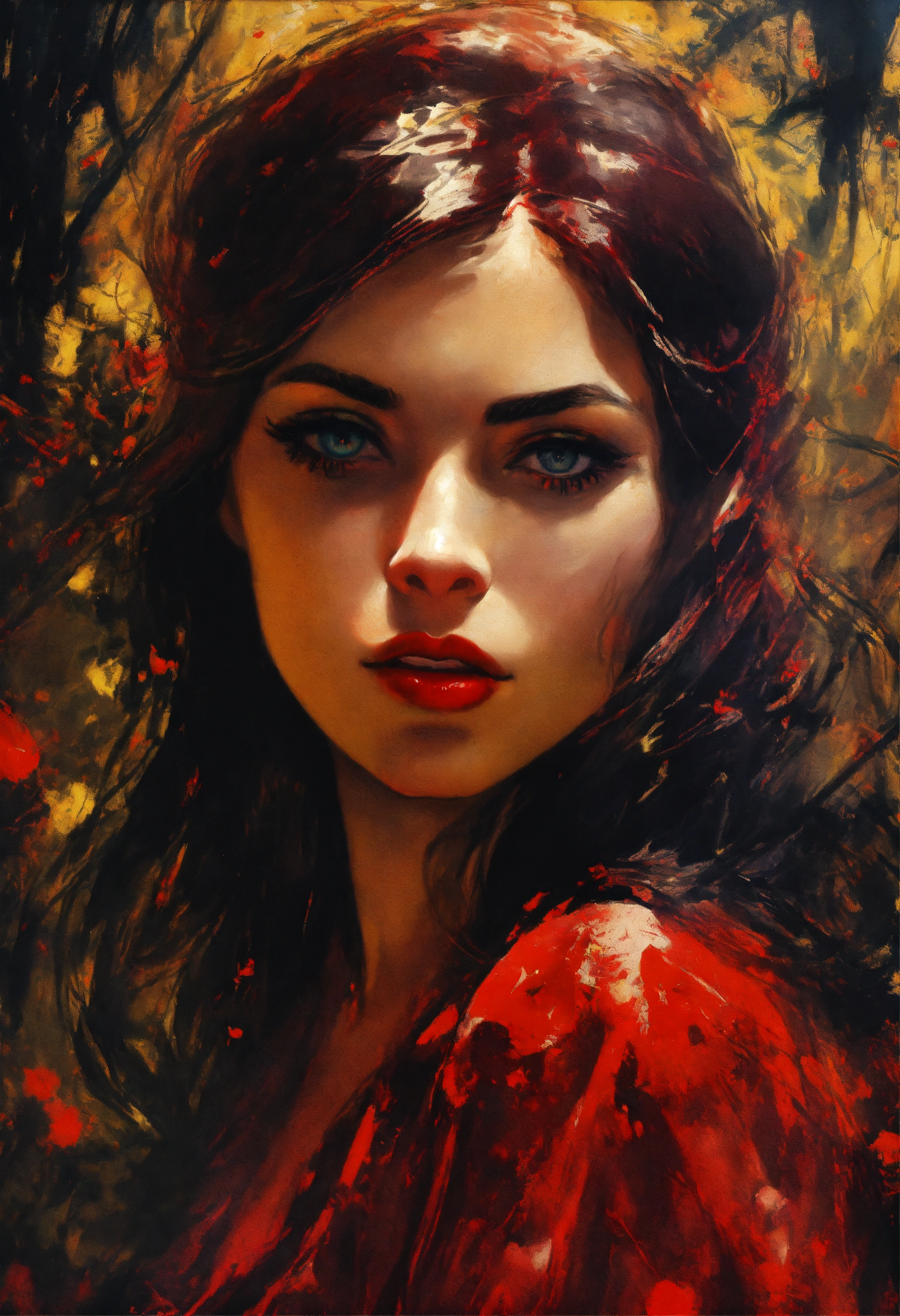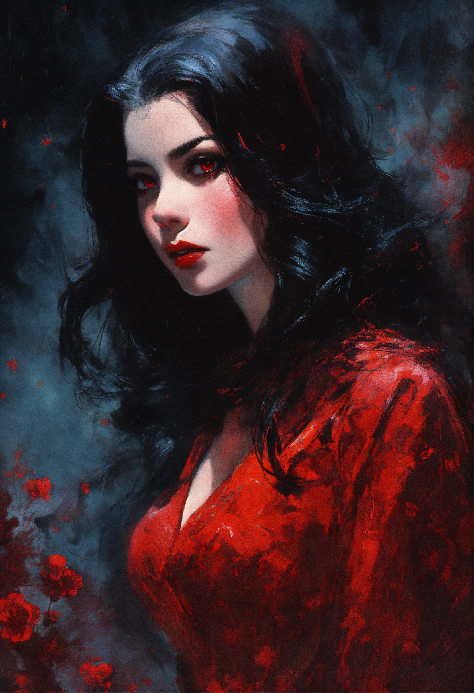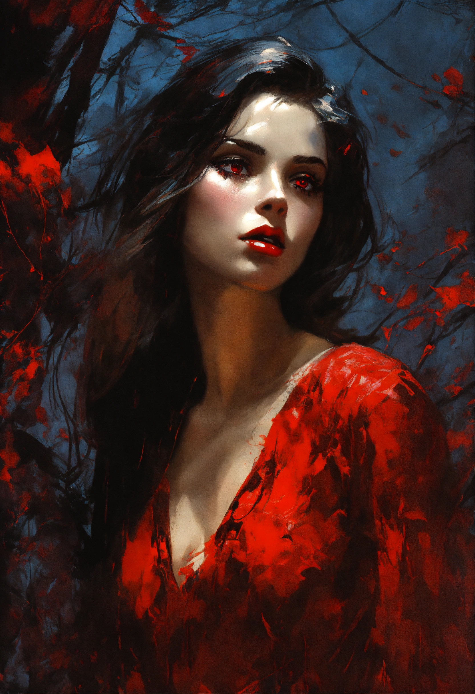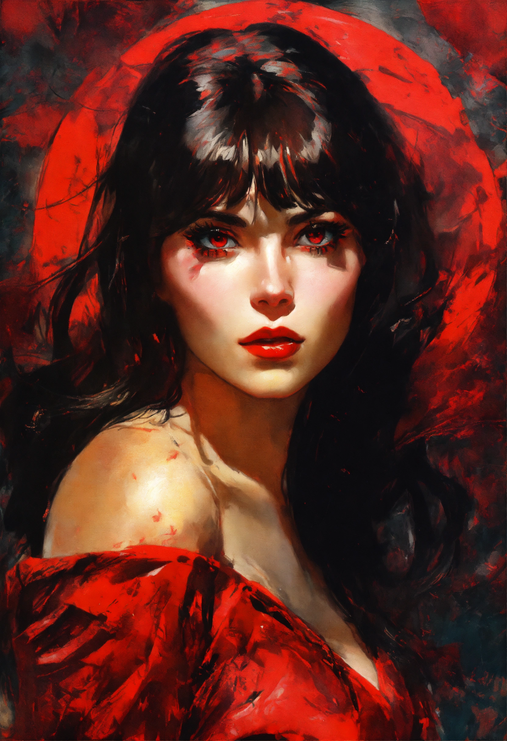 1960s impressionism, photo-realistic, mysterious beautiful female vampire, red eyes, radiant ruby, fantasy, concept art, sharp focus, intricate, highly detailed, smooth, subtle moonlight, art by jackson pollock, comic book art style