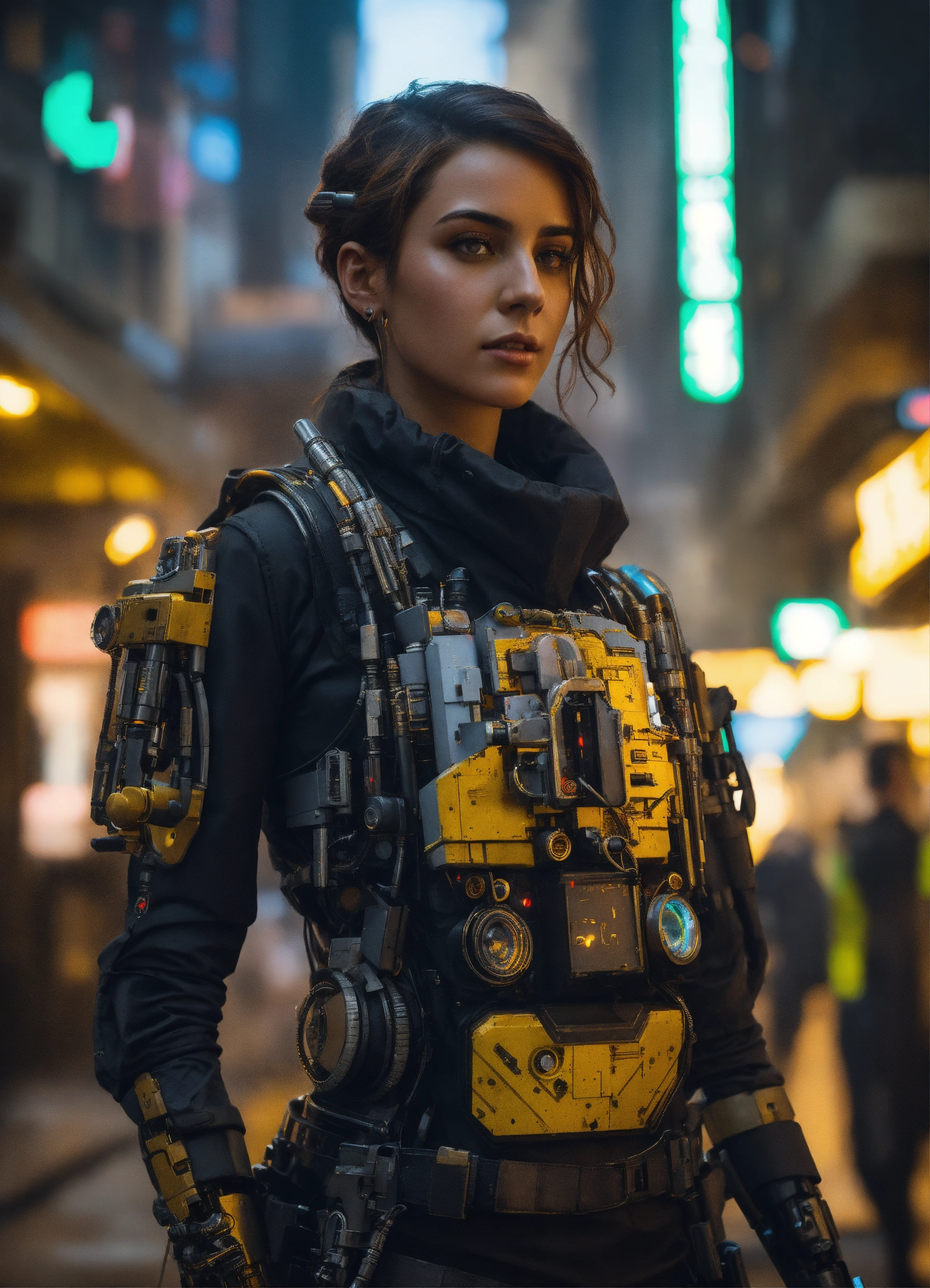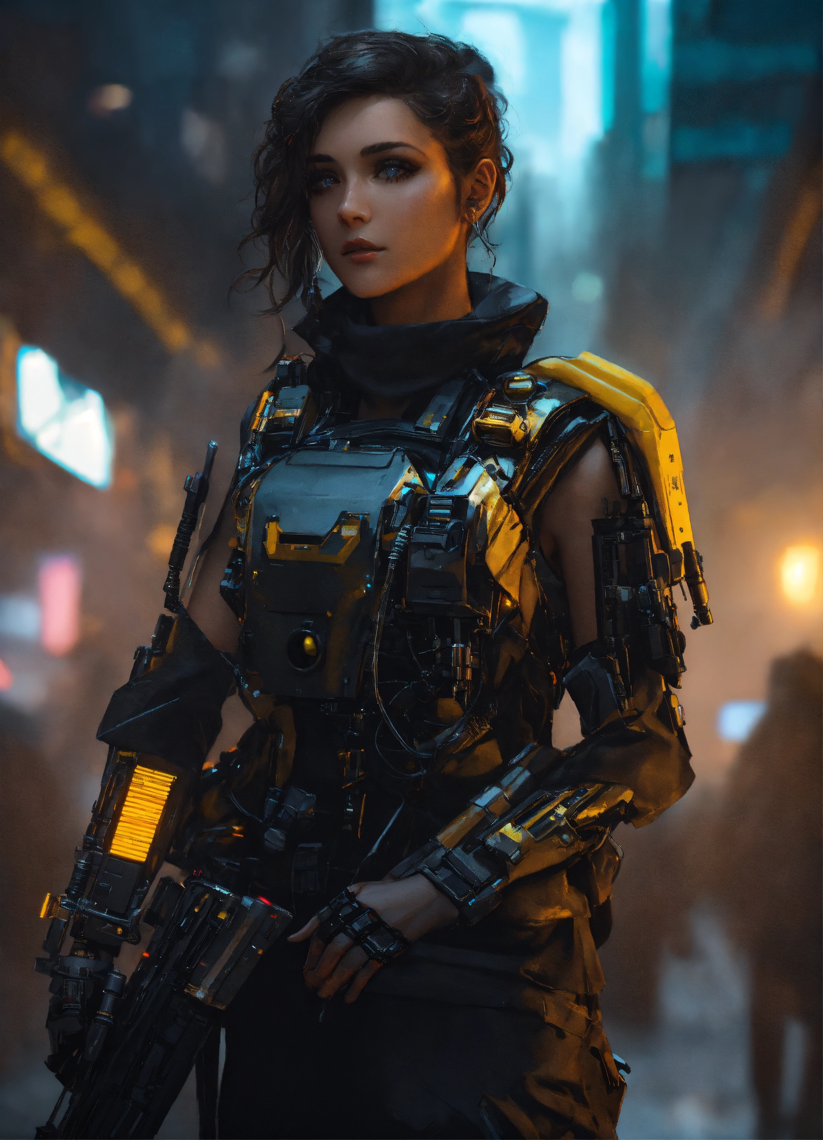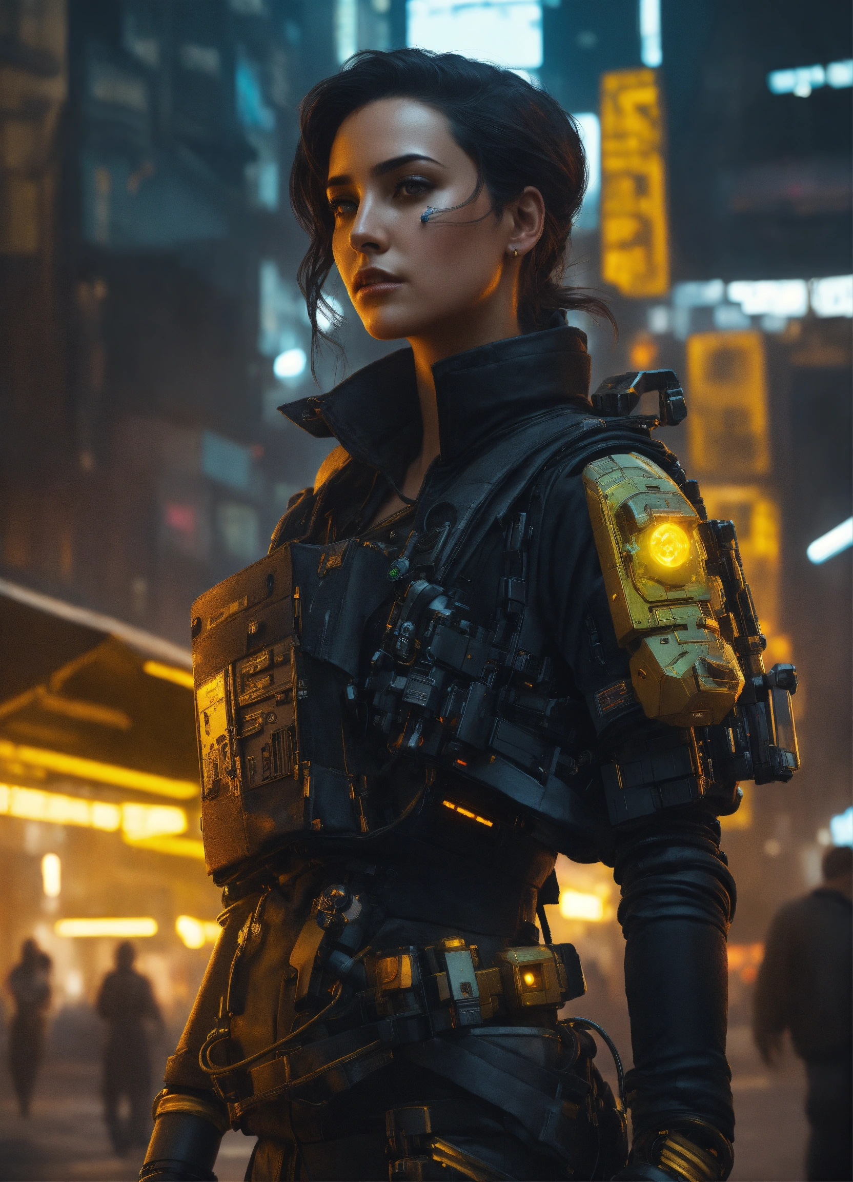 Serious middle eastern female medic wearing black and citrine bullet proof vest and a robotic arm, in a dark dystopian city, hyper detailed, cyberpunk style, greg rutkowski, alphonse mucha, wlop face view