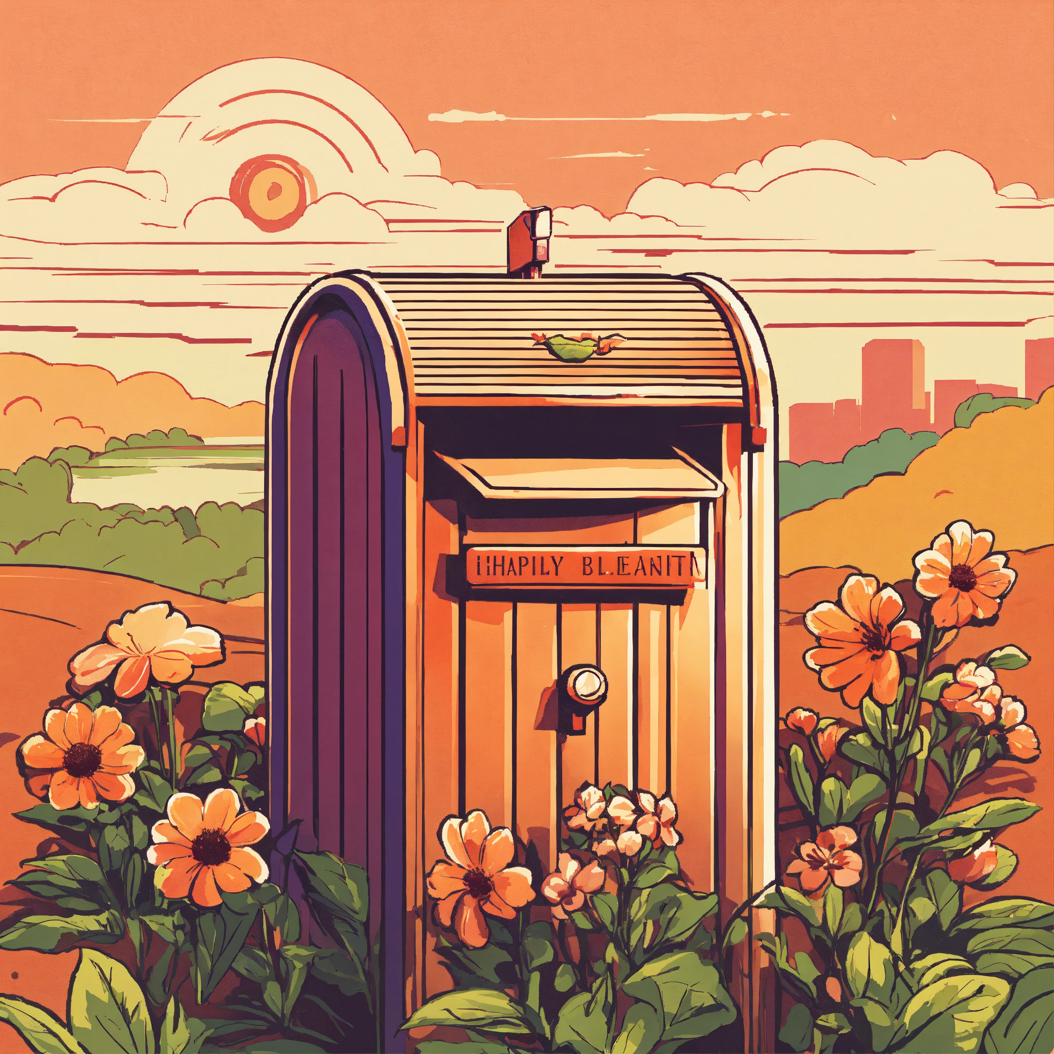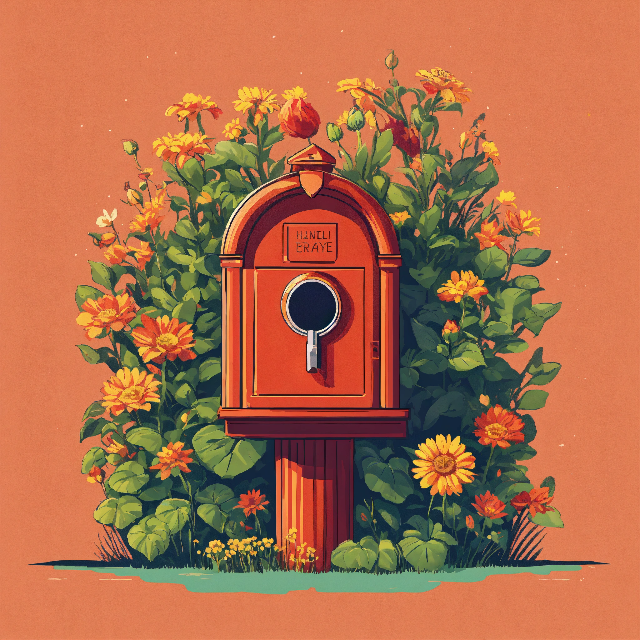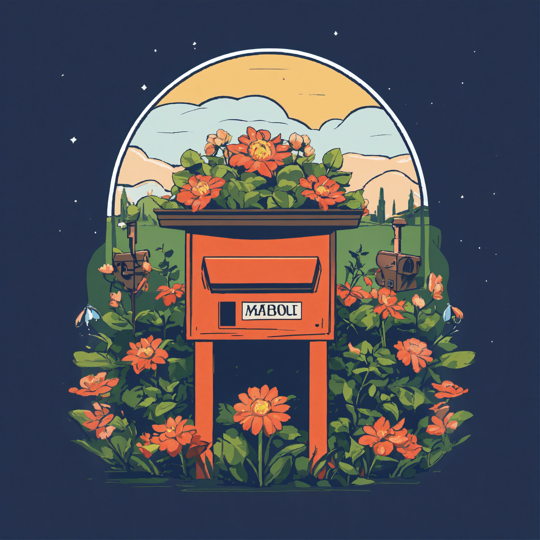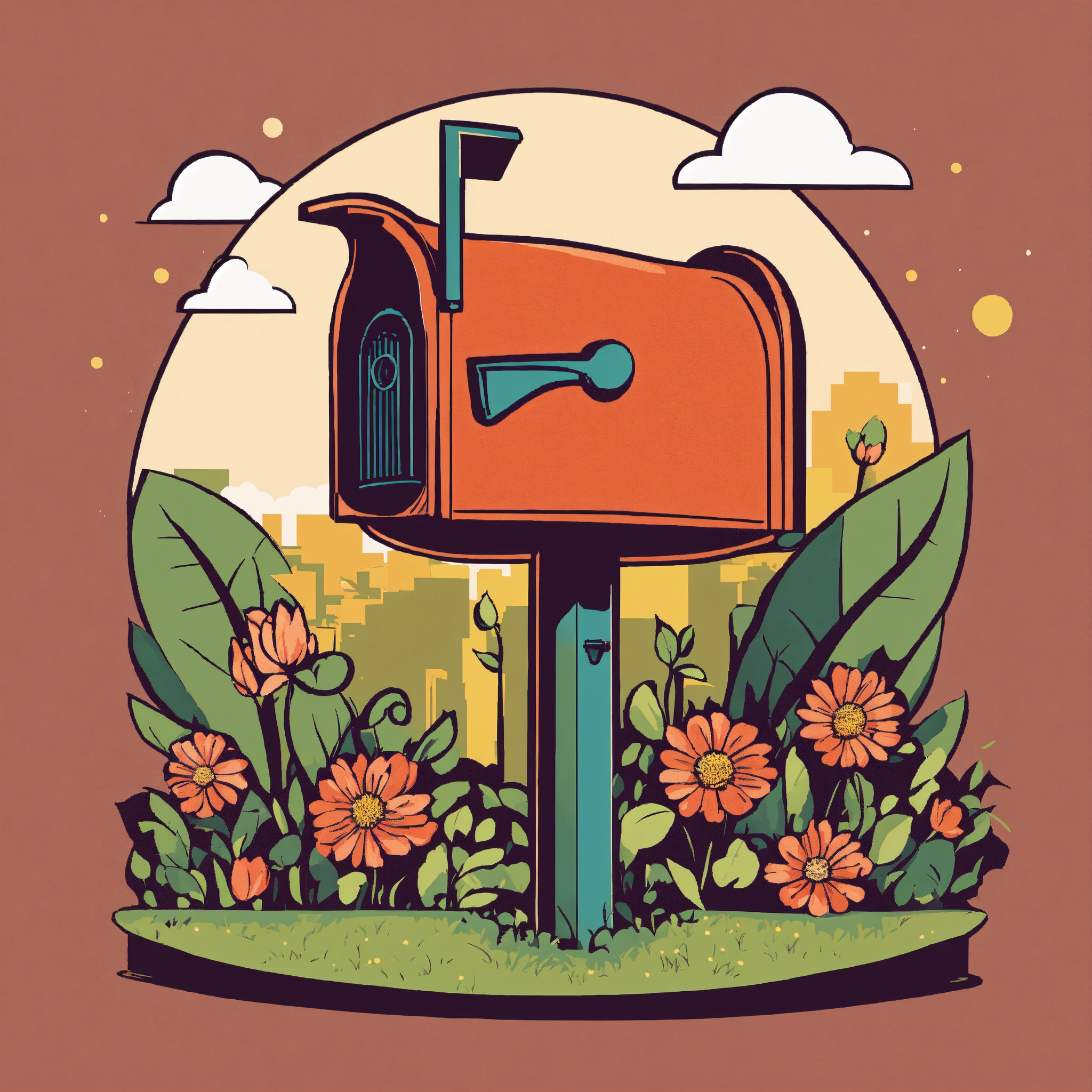 T-shirt vector illustration, centered design of a quirky mailbox, from which sprouts a flowering plant, set against a suburban backdrop, celebrating unexpected beauty. simplistic, centered vector illustration, solid background color.