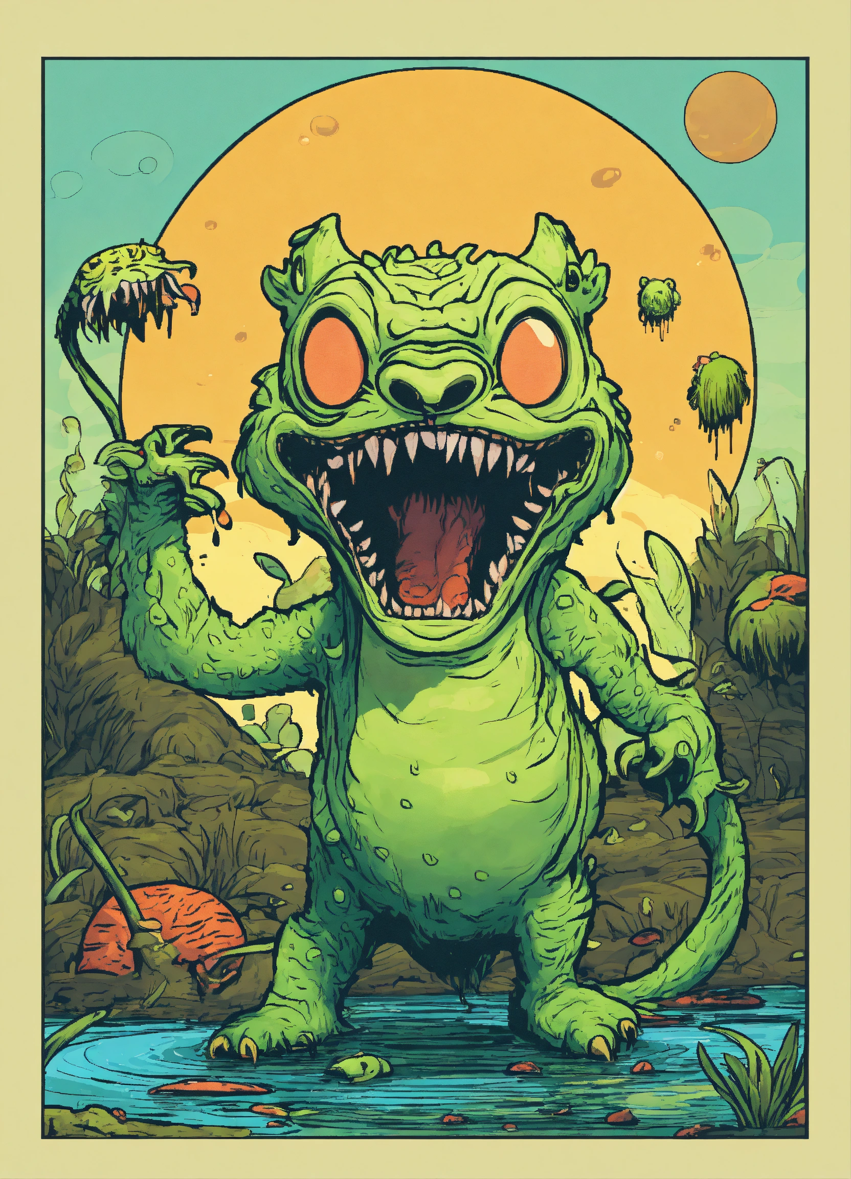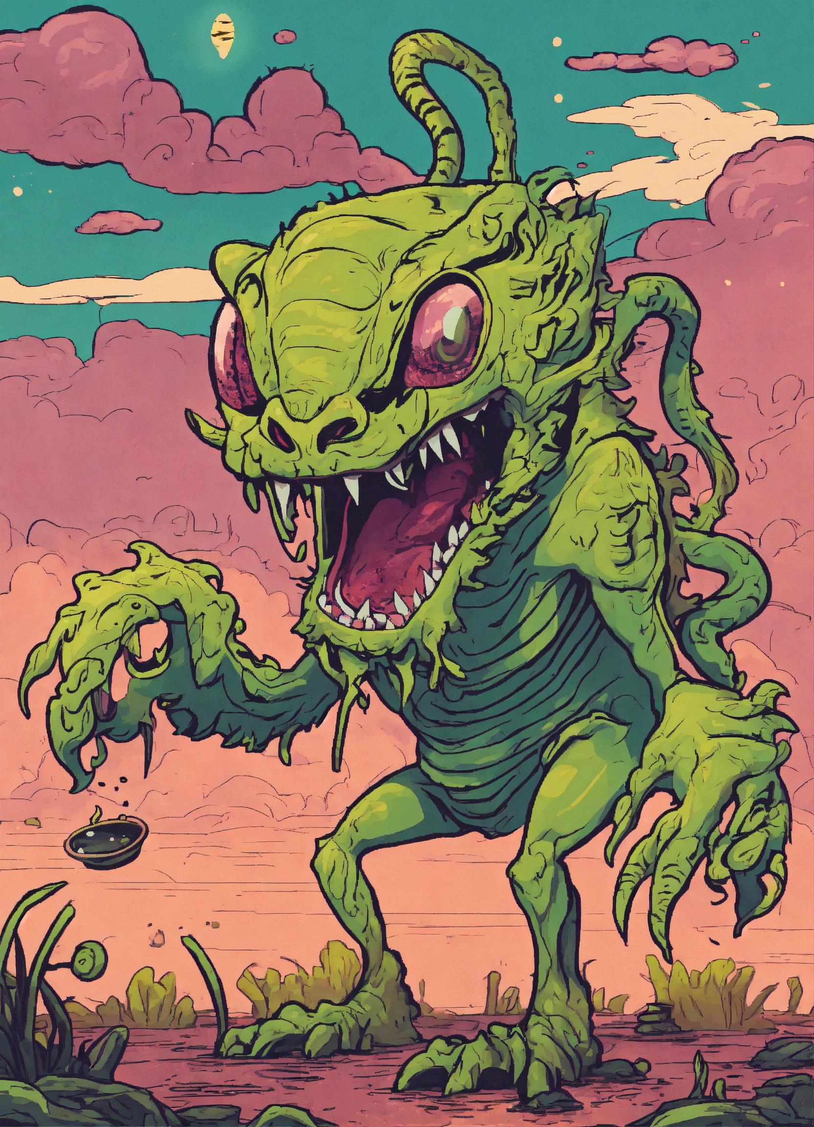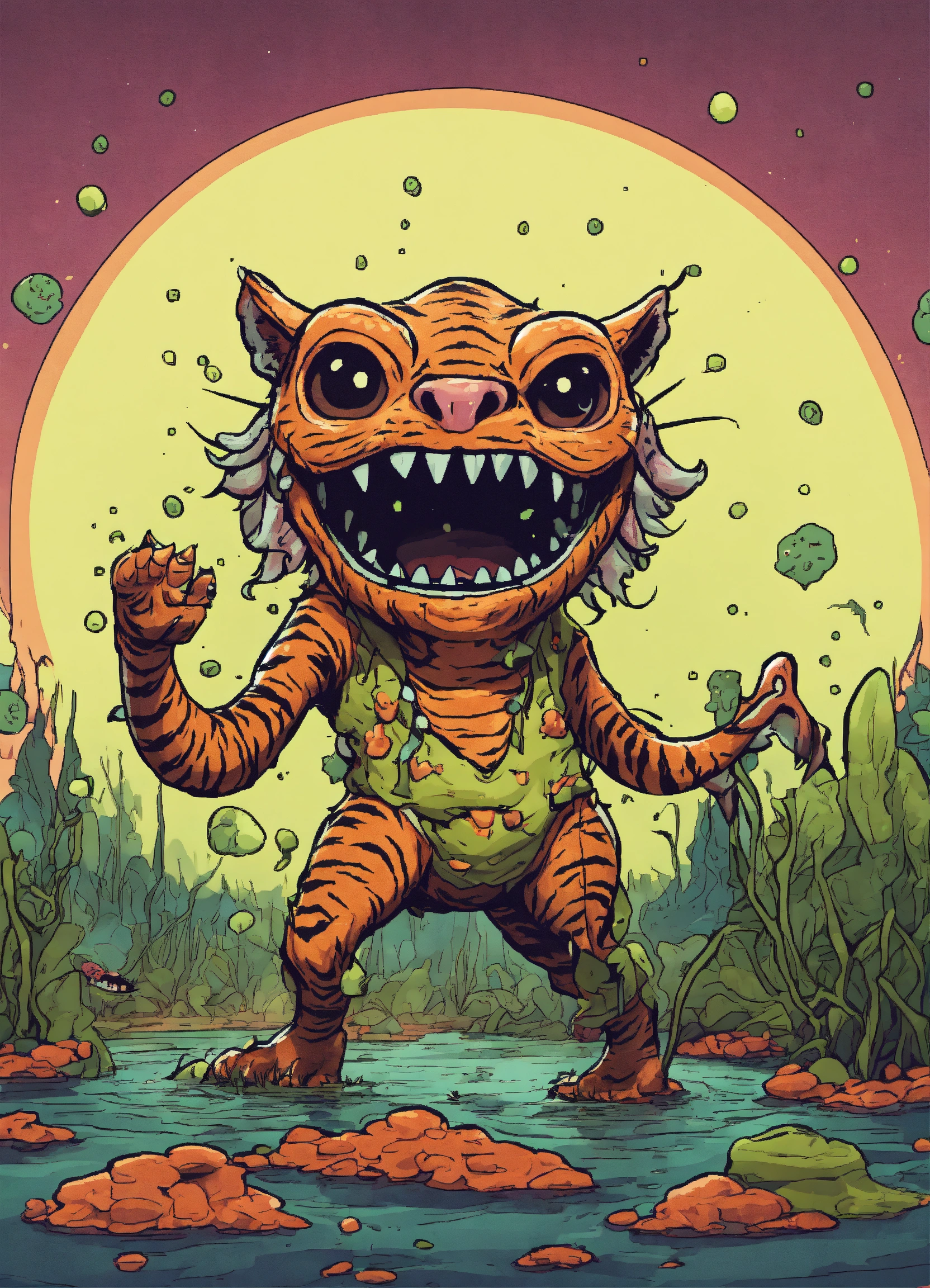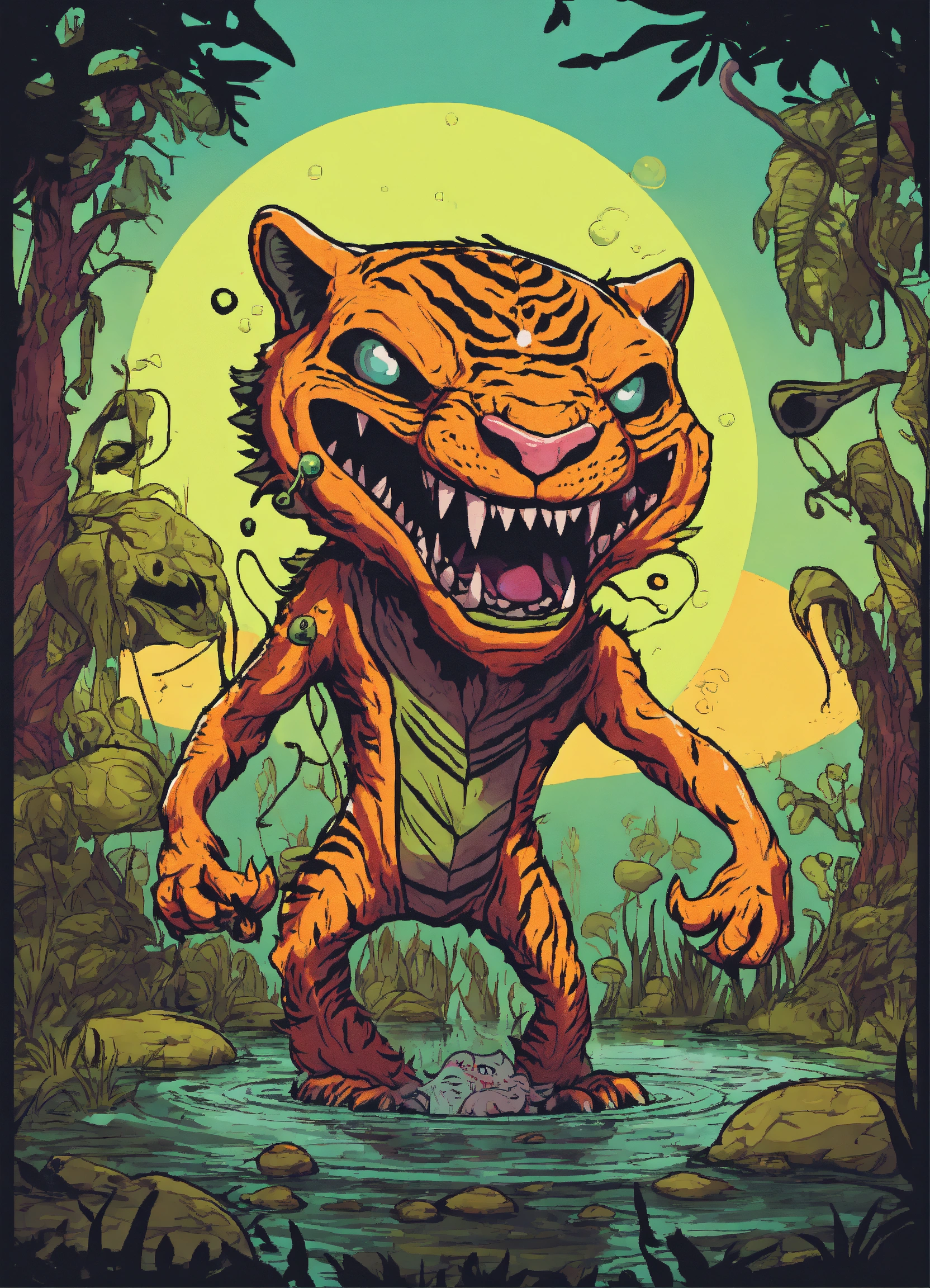 Pop-wonder-nft frumpy swamp-bog-tiger alien-monster-head dancing sideways with a huge grin and spaced out head crazy-lazy hump-day-happy-hour in a hand-drawn vector, svg, cult-classic-comic-style, squid-trash