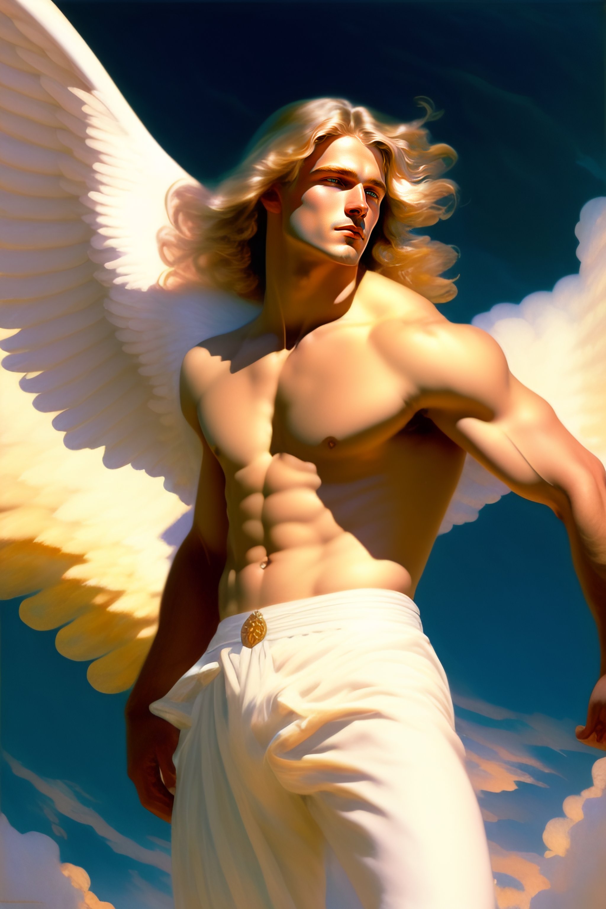 A male angel flying and dancing among the clouds, blond hair, in the center of the images, hyper realistic, ultra realistic, intricate, dynamic, white pants, 8k, art by krenz cushart and edward hopper and alphonse mucha, gilbert williams