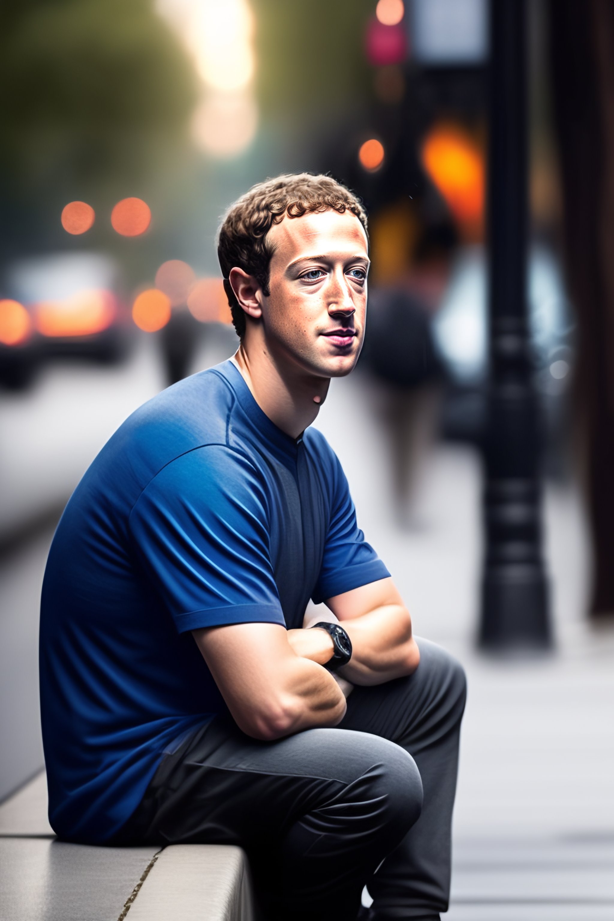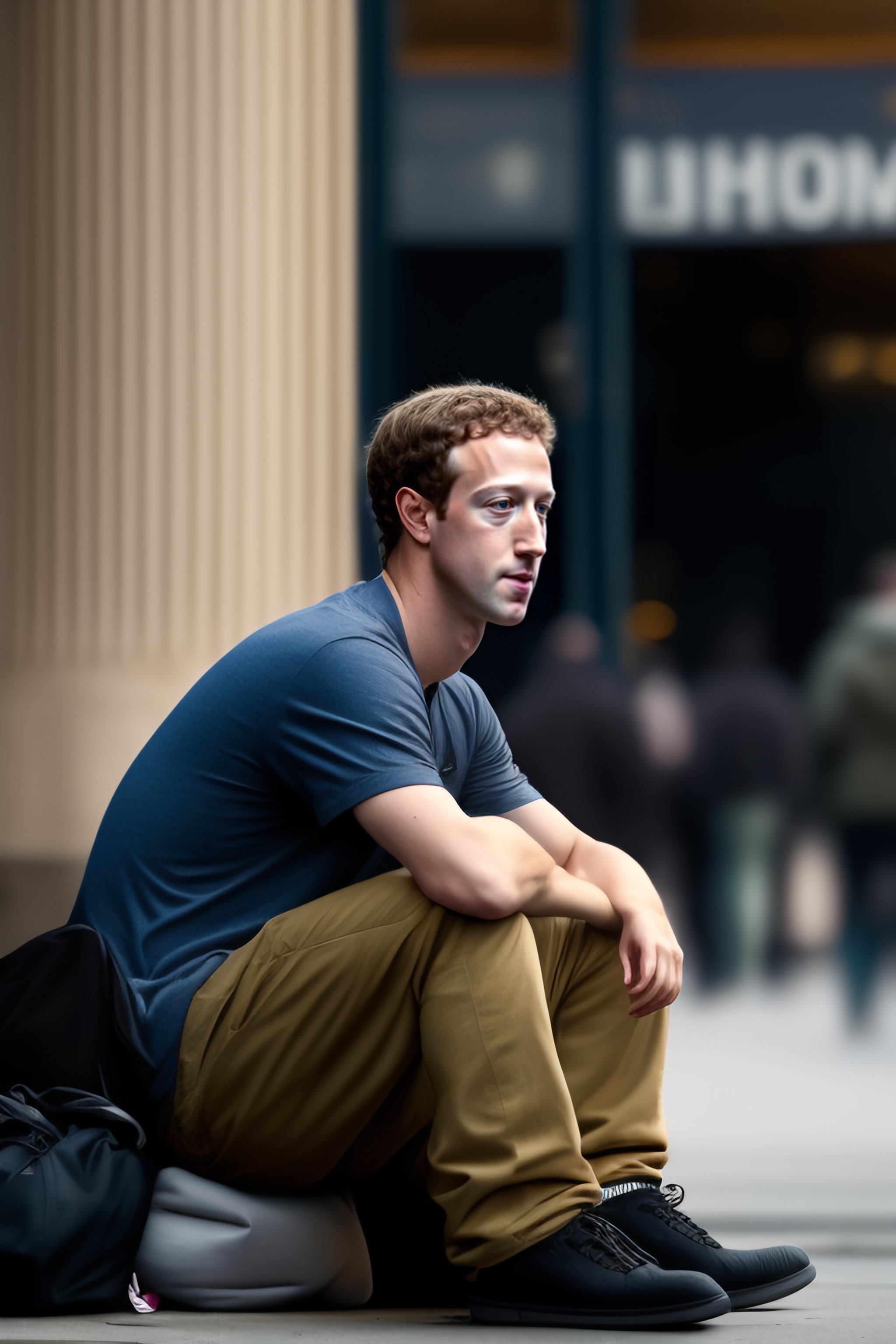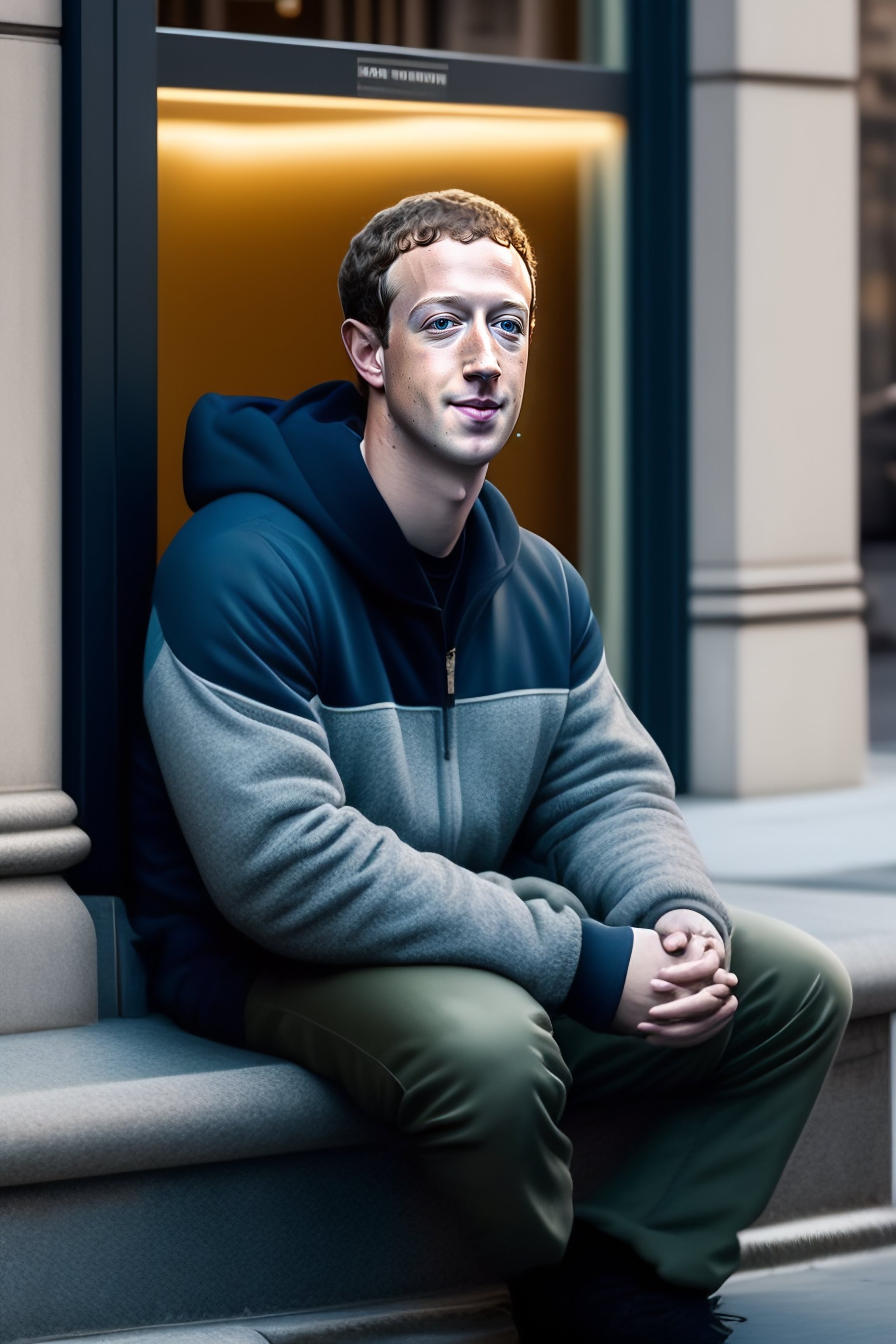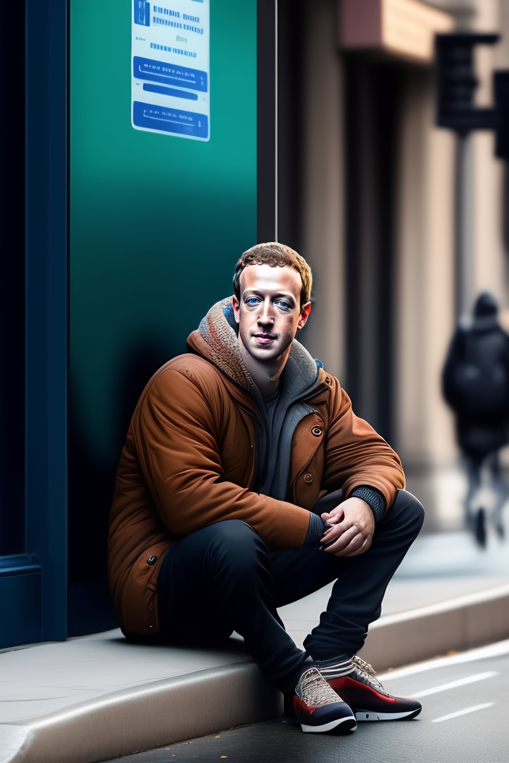 Portrait of mark zuckerberg as a homeless with a beard sitting in street corner