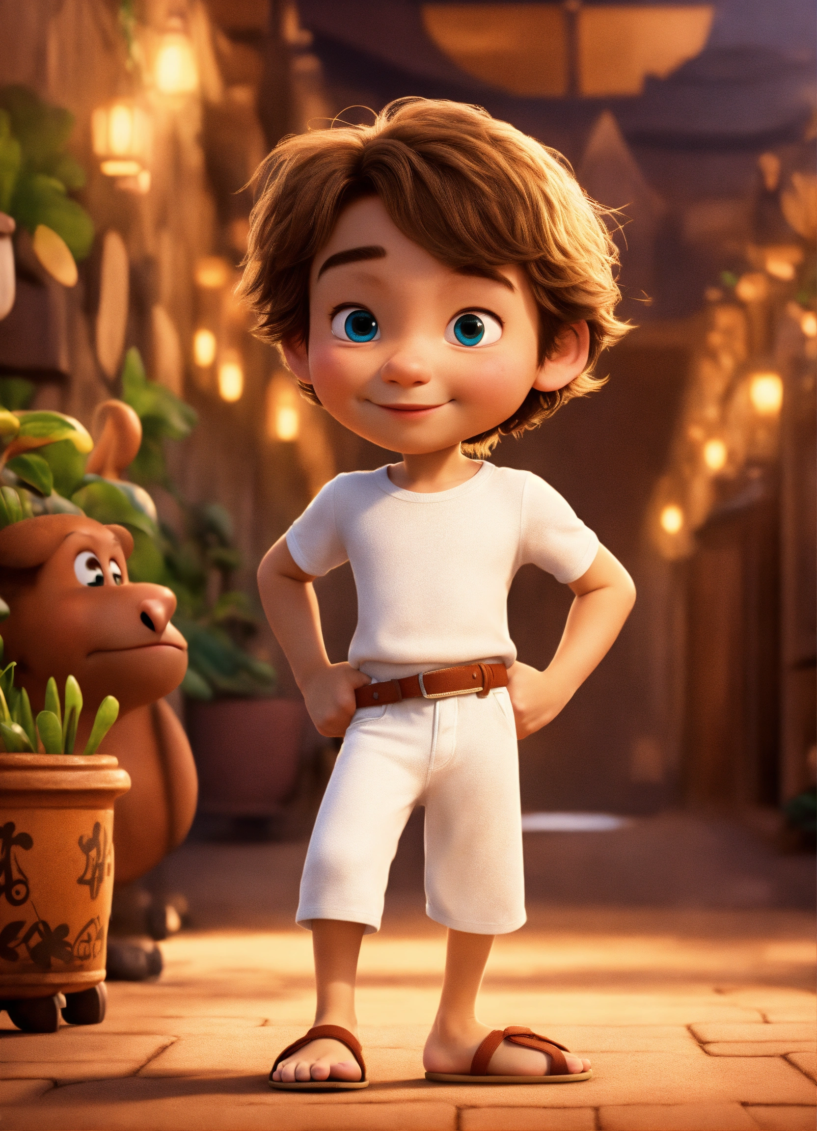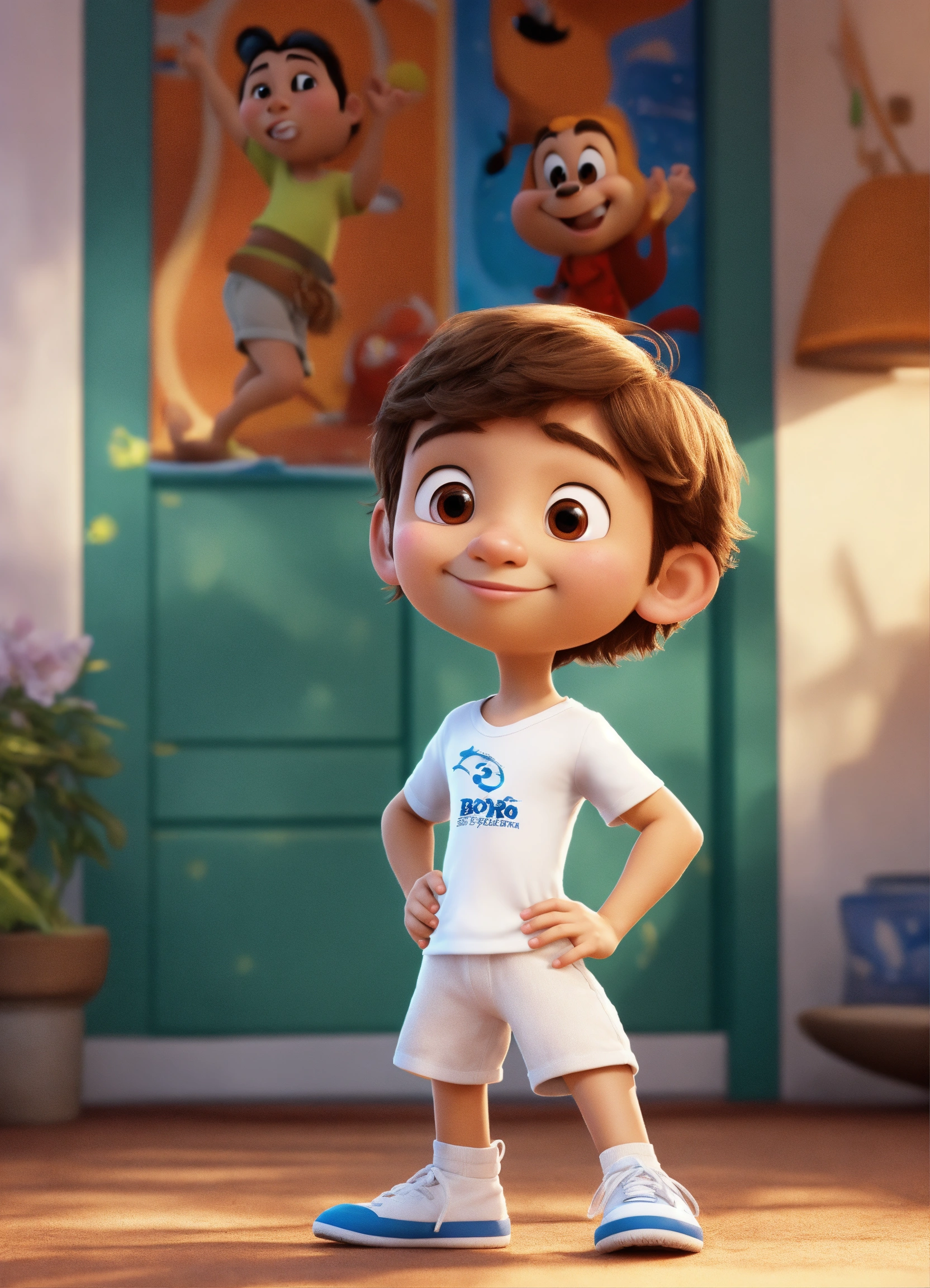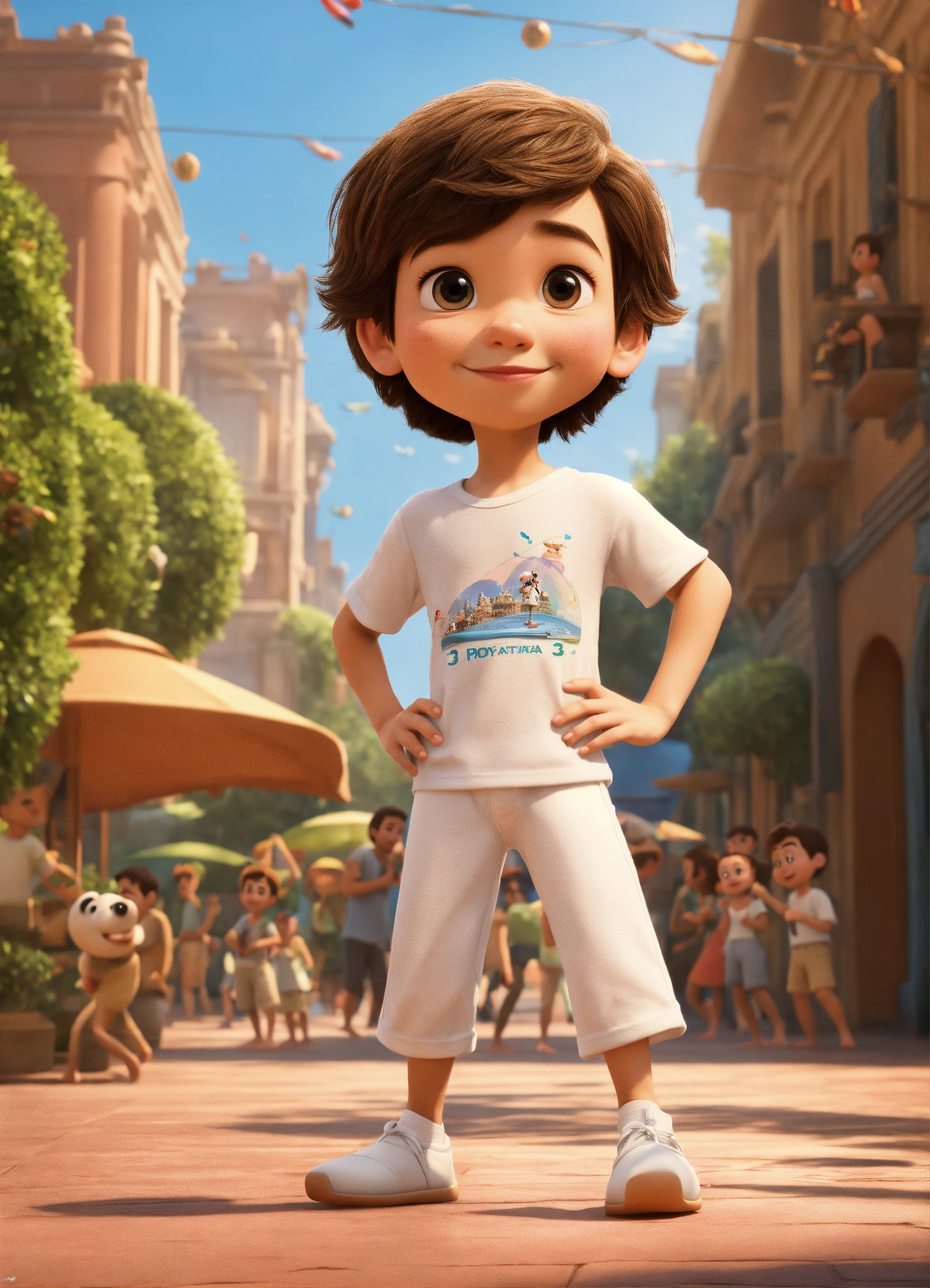 A disney-style 3d poster from pixar, with a cute young caucasian boy, short bob hair with white tshirt and white long pants, without shoes, ele é lutador de capoeira