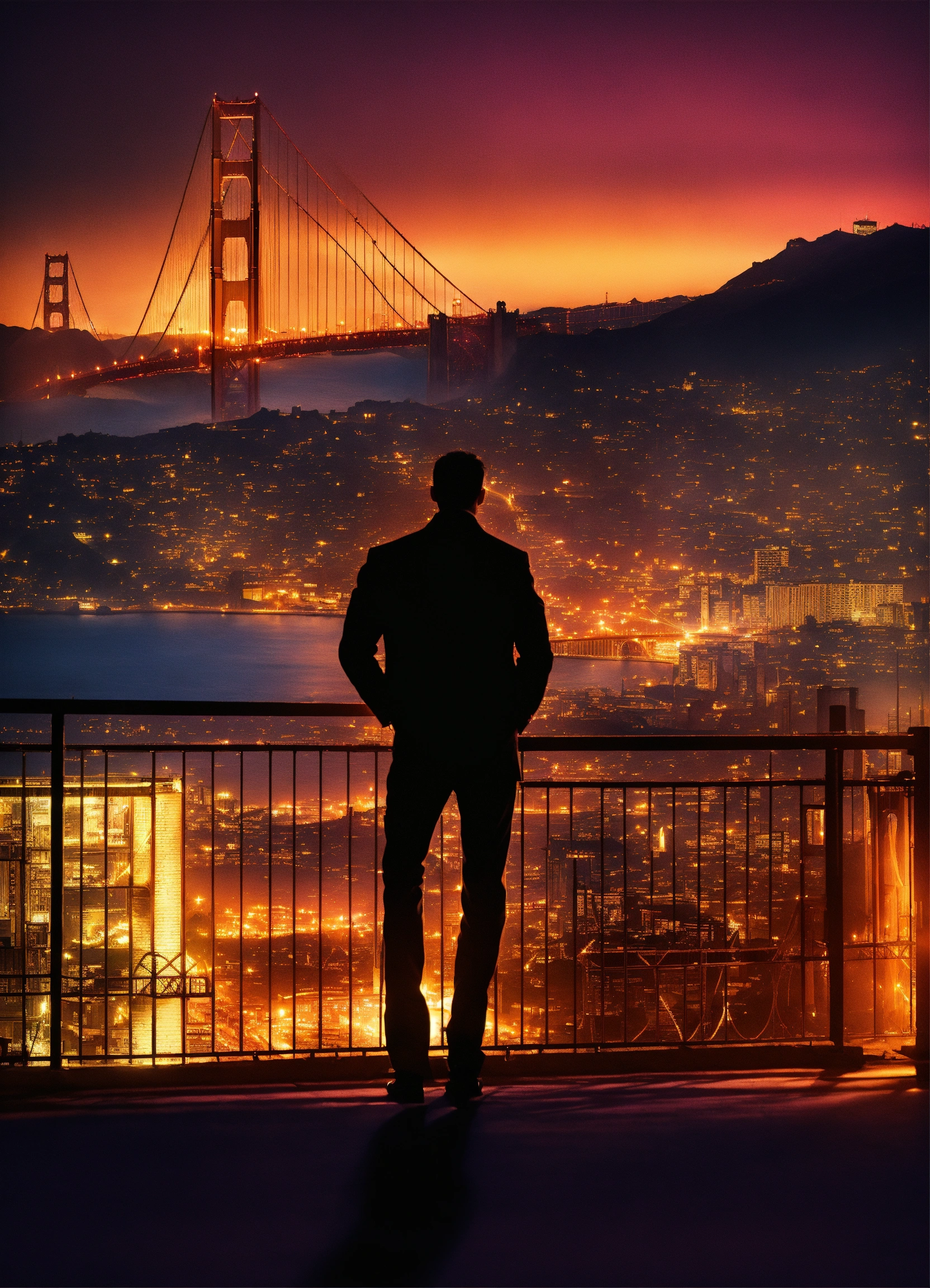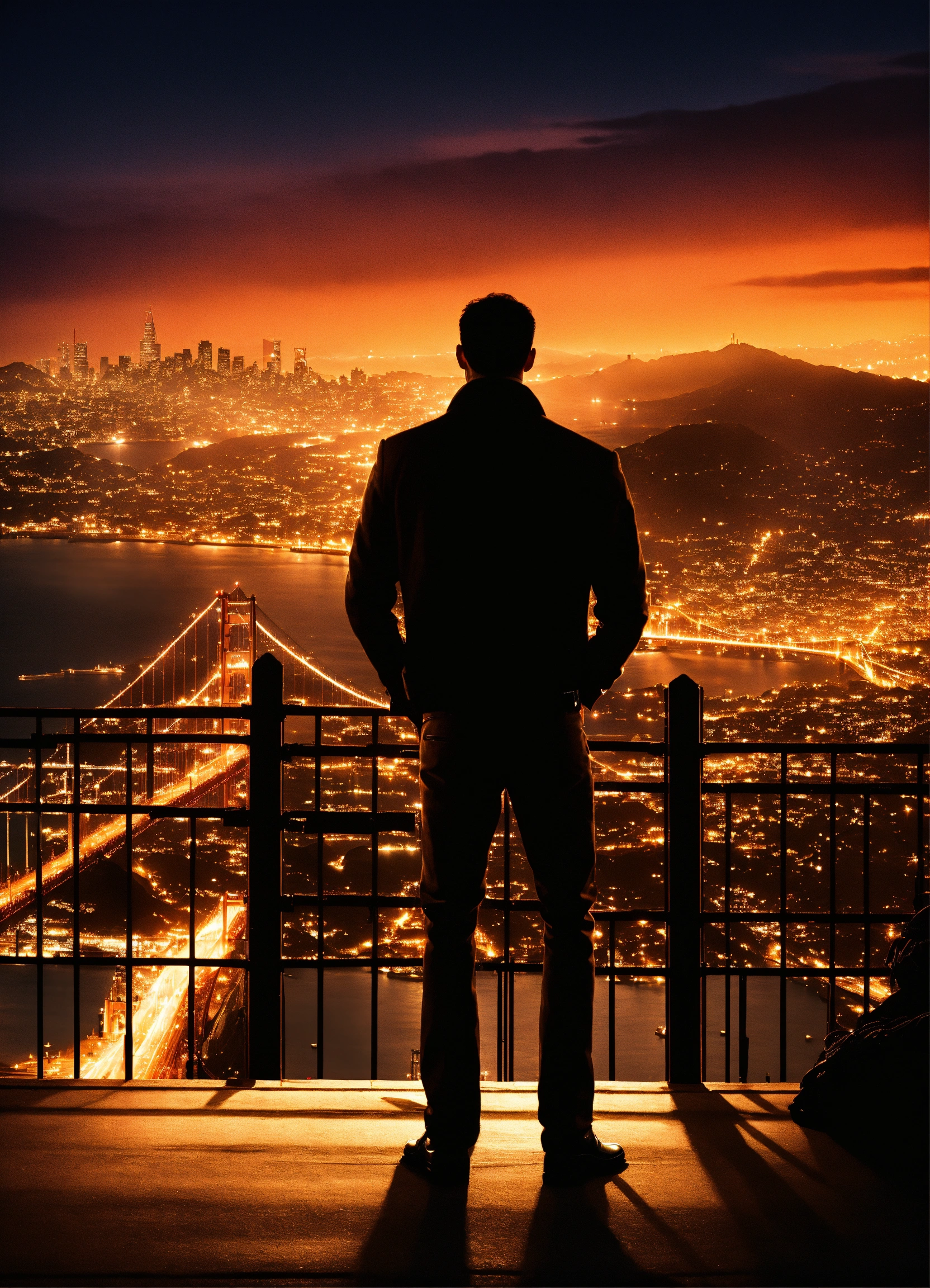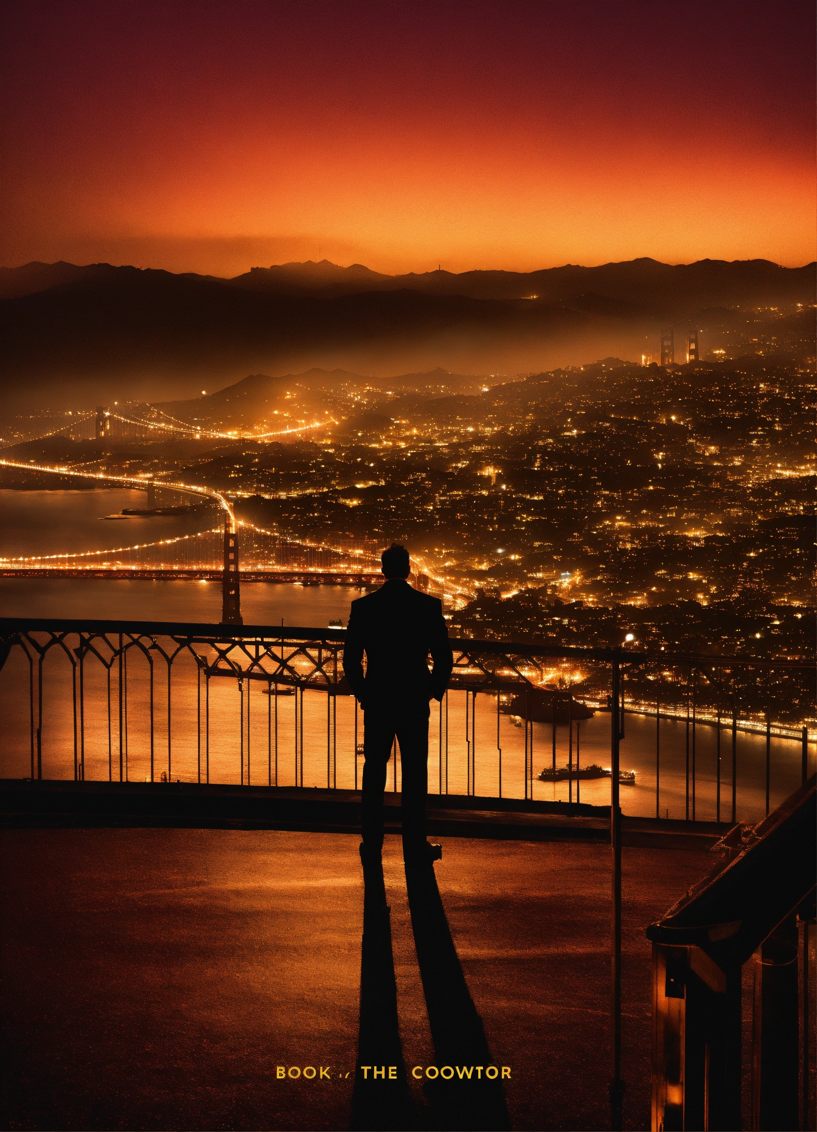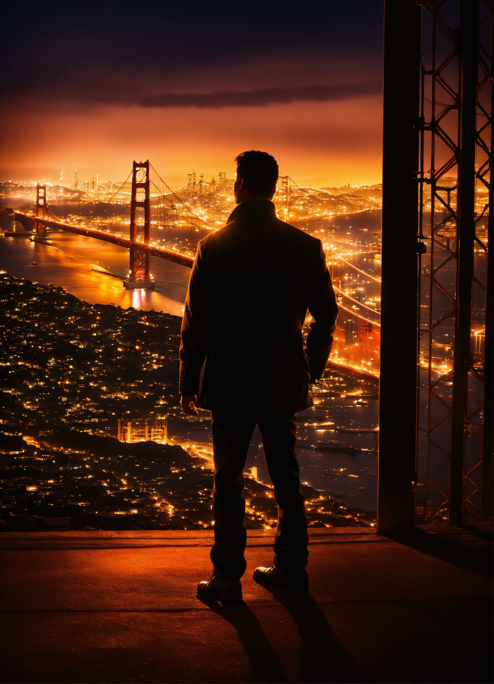 Create a captivating cover design that conveys the theme, city, night life, crime, thriller silhouette of a man overlooking city with standing in golden gate bridge in the background, inspired by the book of mark dawson "the chameleon (charlie cooper thrillers book 2)", photoreal, photorealistic, with lighting and shadows effect, city lights at night