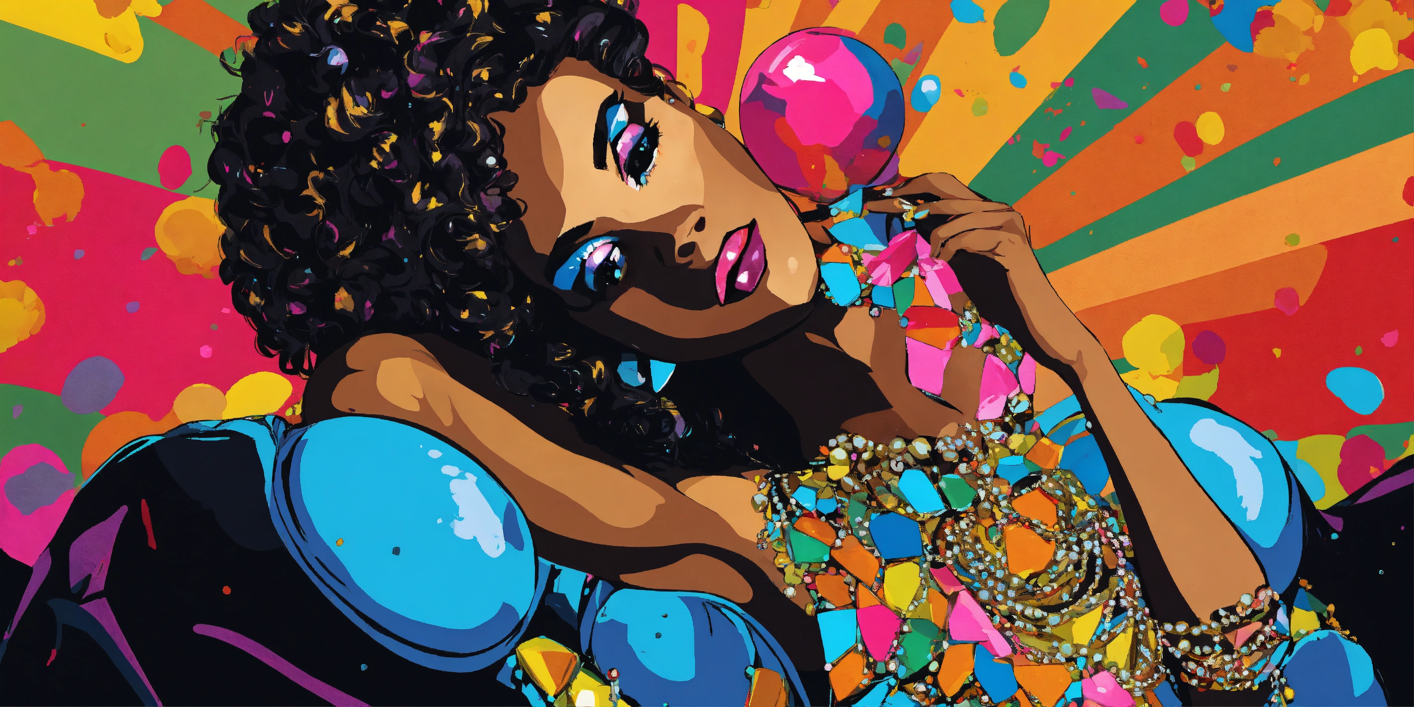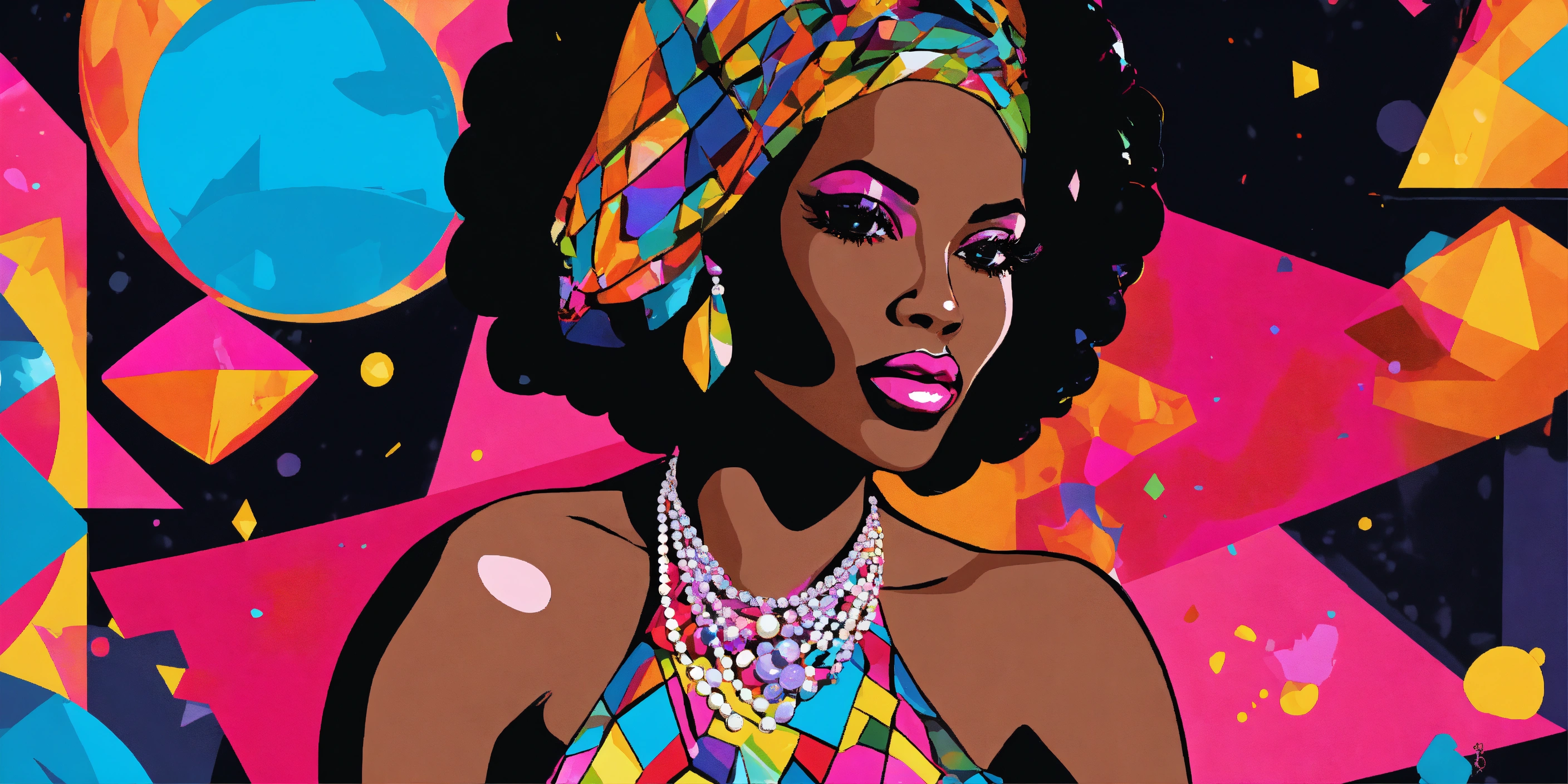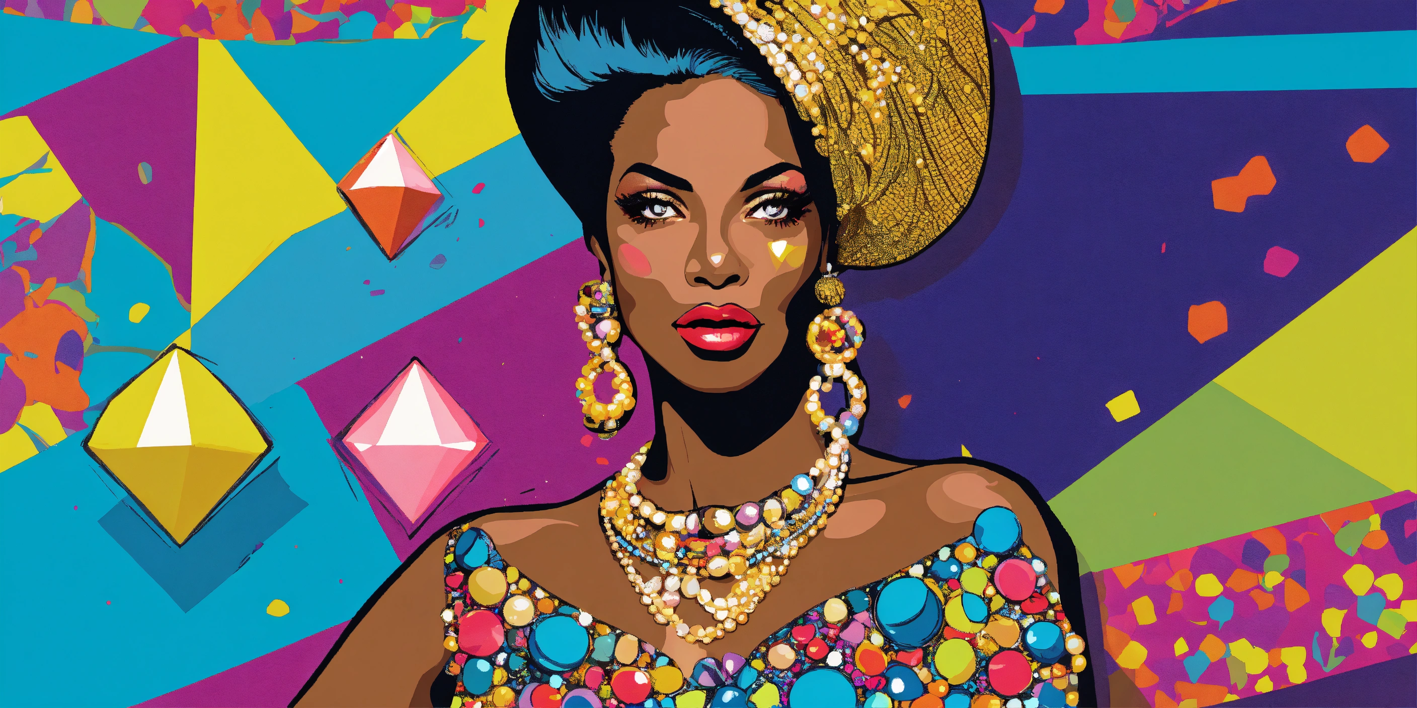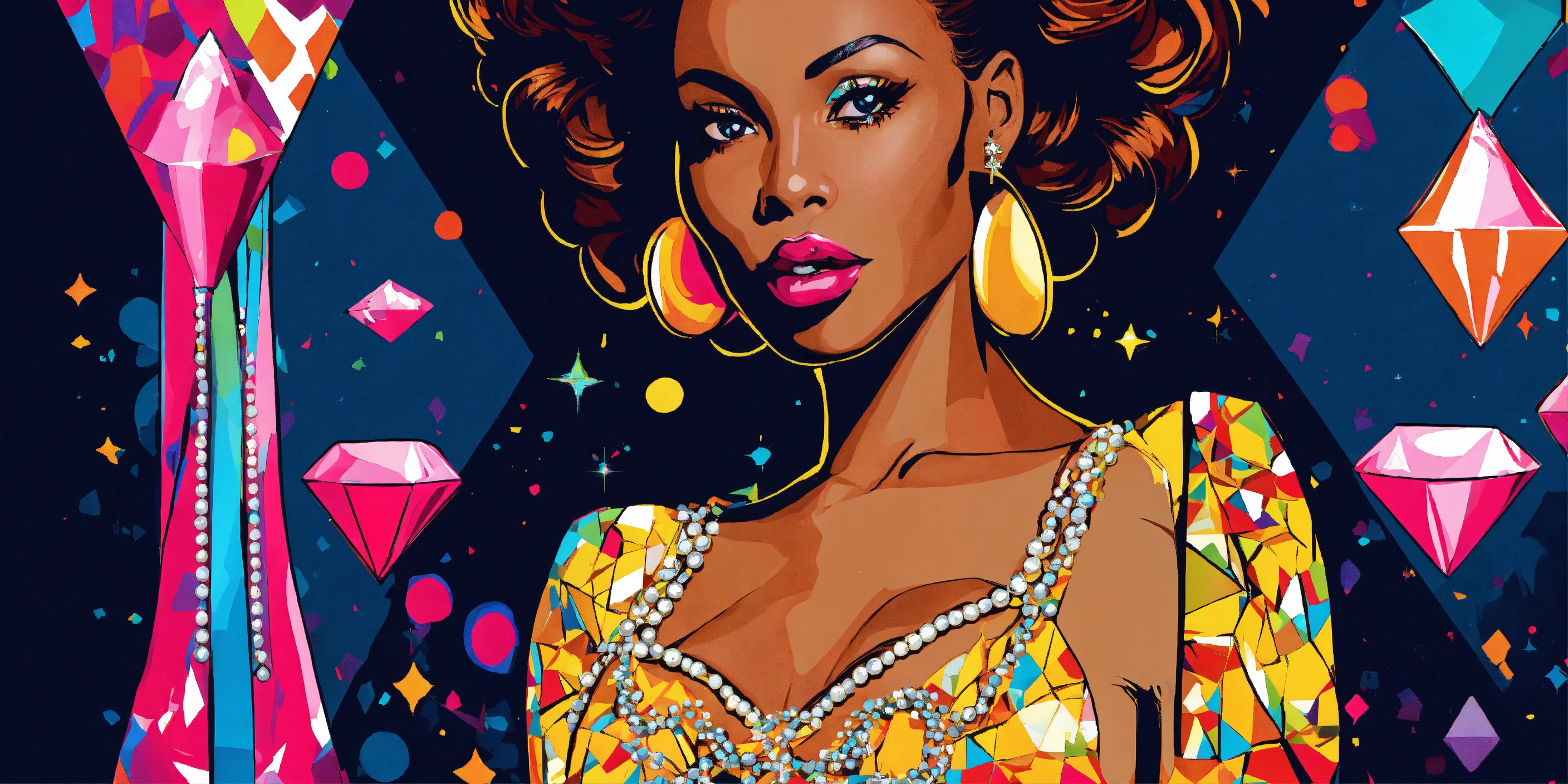 Pop art glamour black woman in a glamorous pop art gown, surrounded by larger-than-life pop art diamonds and pearls — t-shirt design graphic, vector, contour, black background.