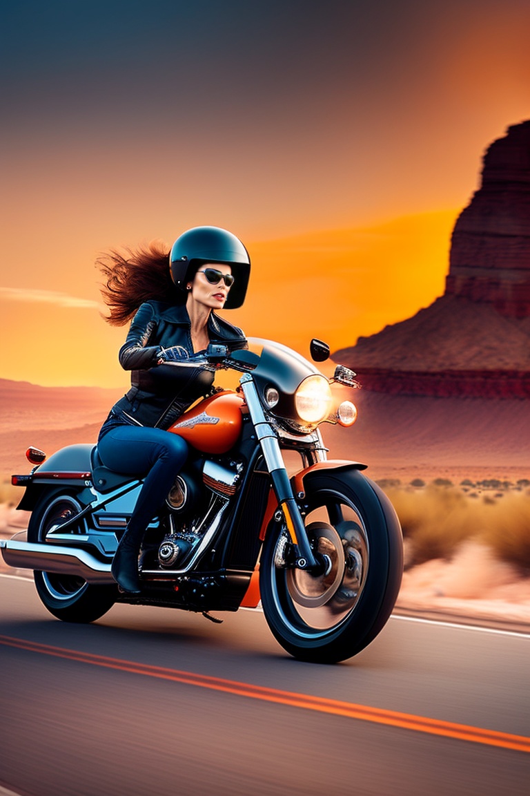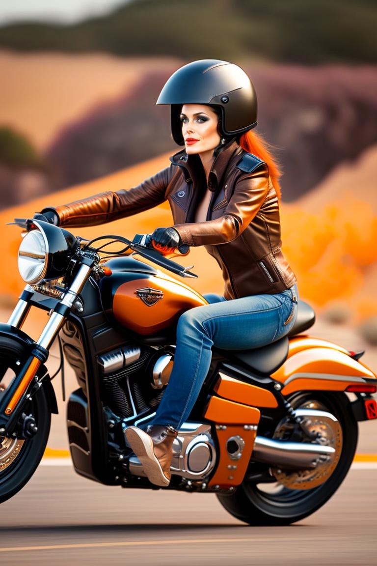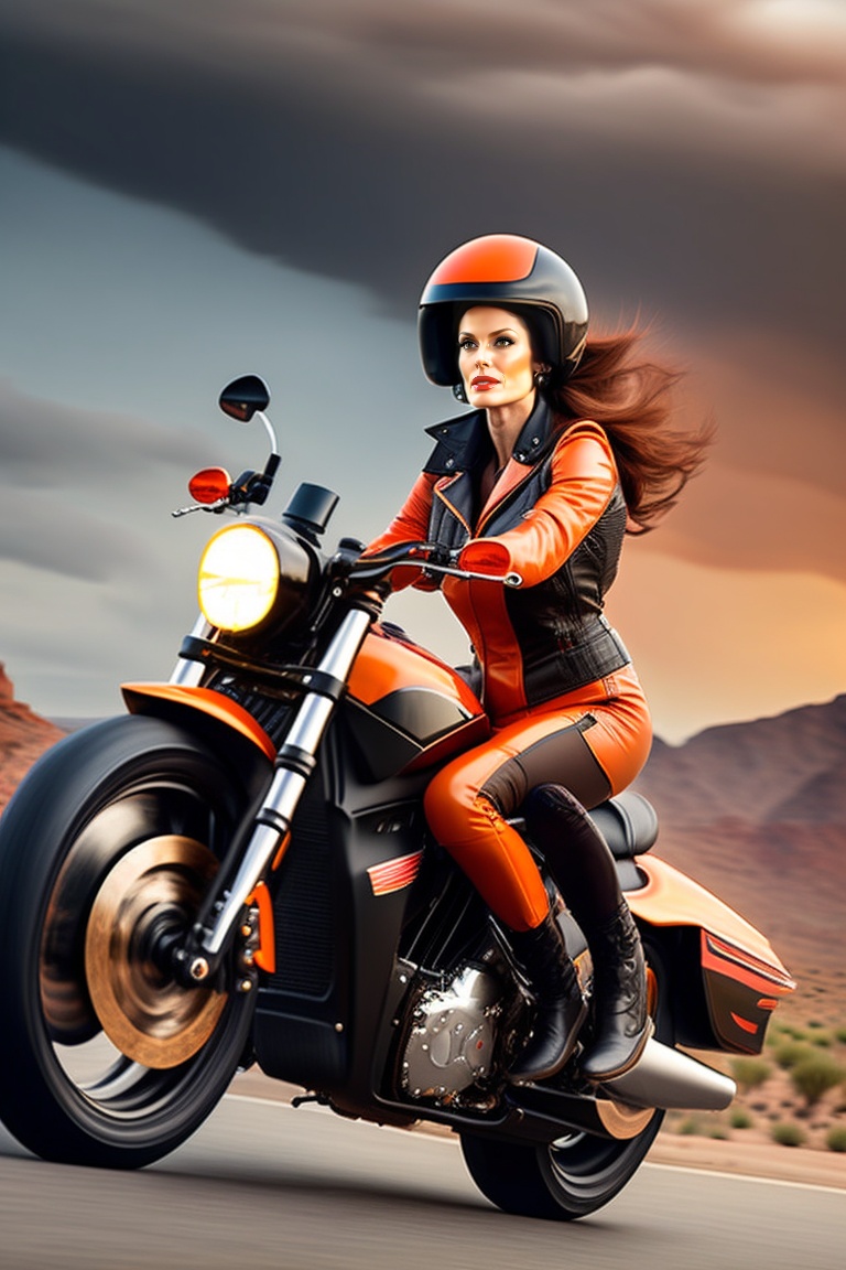 Angelina jolie, in leather, helmet and gloves riding down the road on a harley-davidson breakout™ 117, orange