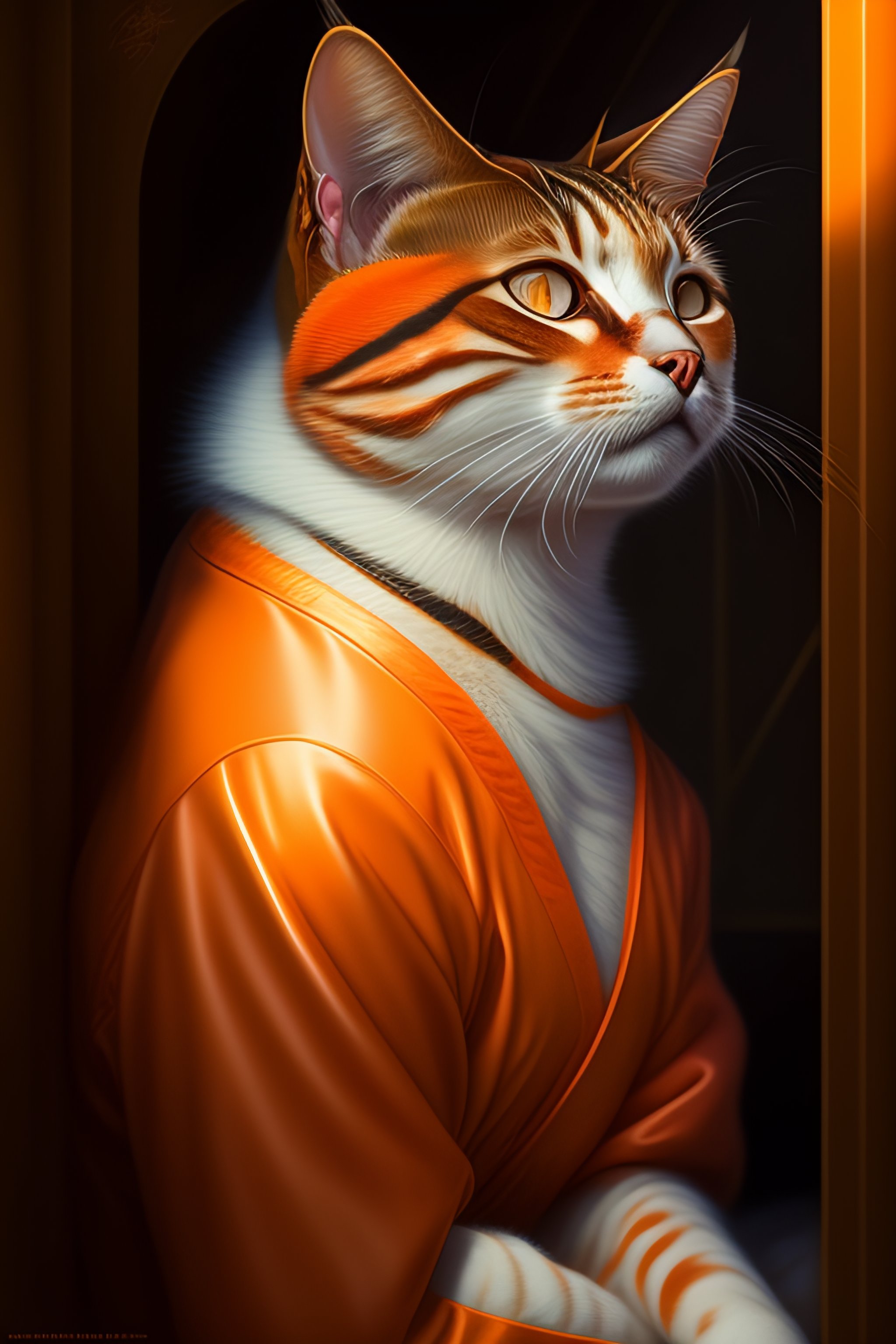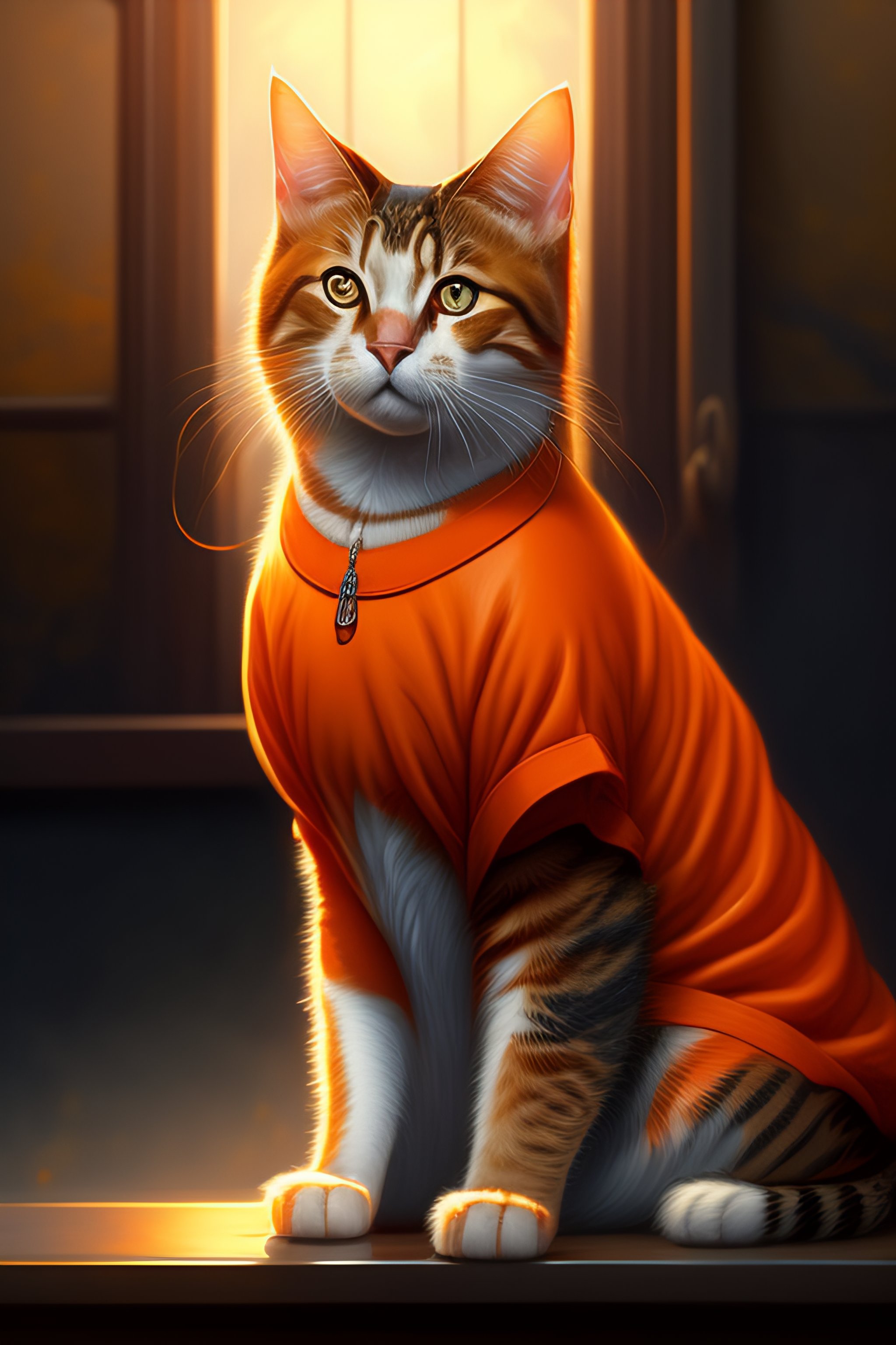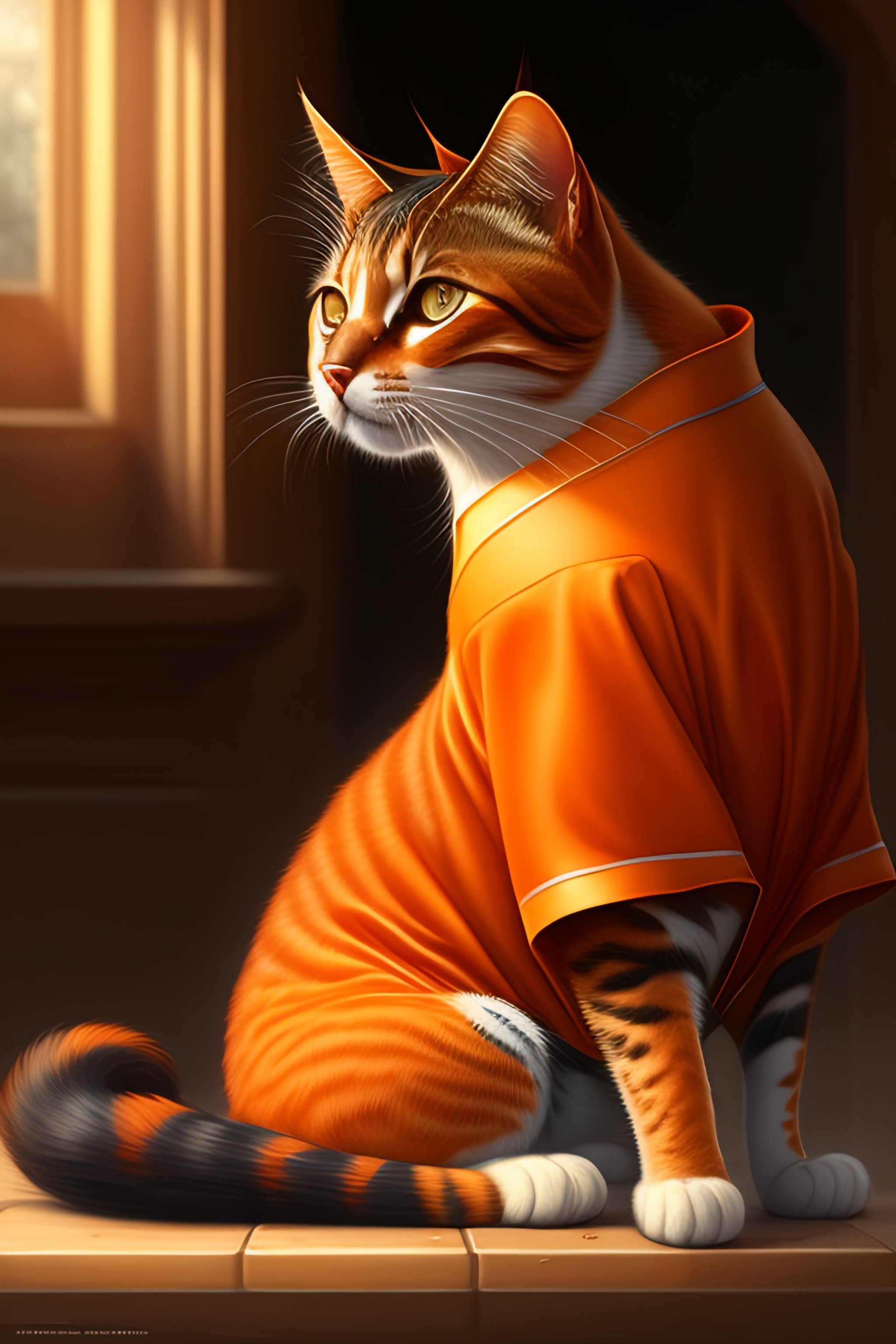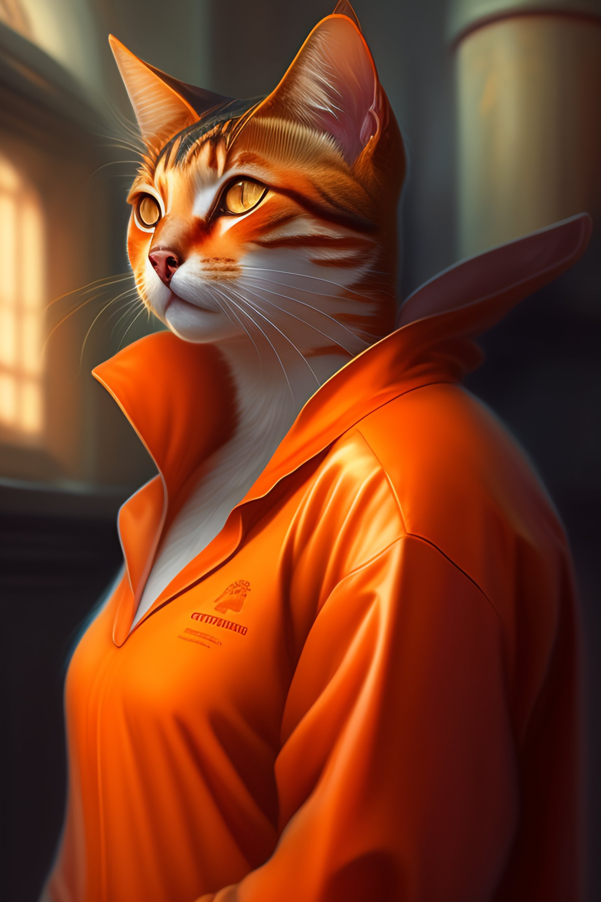 A tabby cat wearing orange prison pajamas locked up in an asylum prison, highly detailed, digital painting, artstation, concept art, smooth, sharp focus, illustration, art by artgerm and greg rutkowski and alphonse mucha