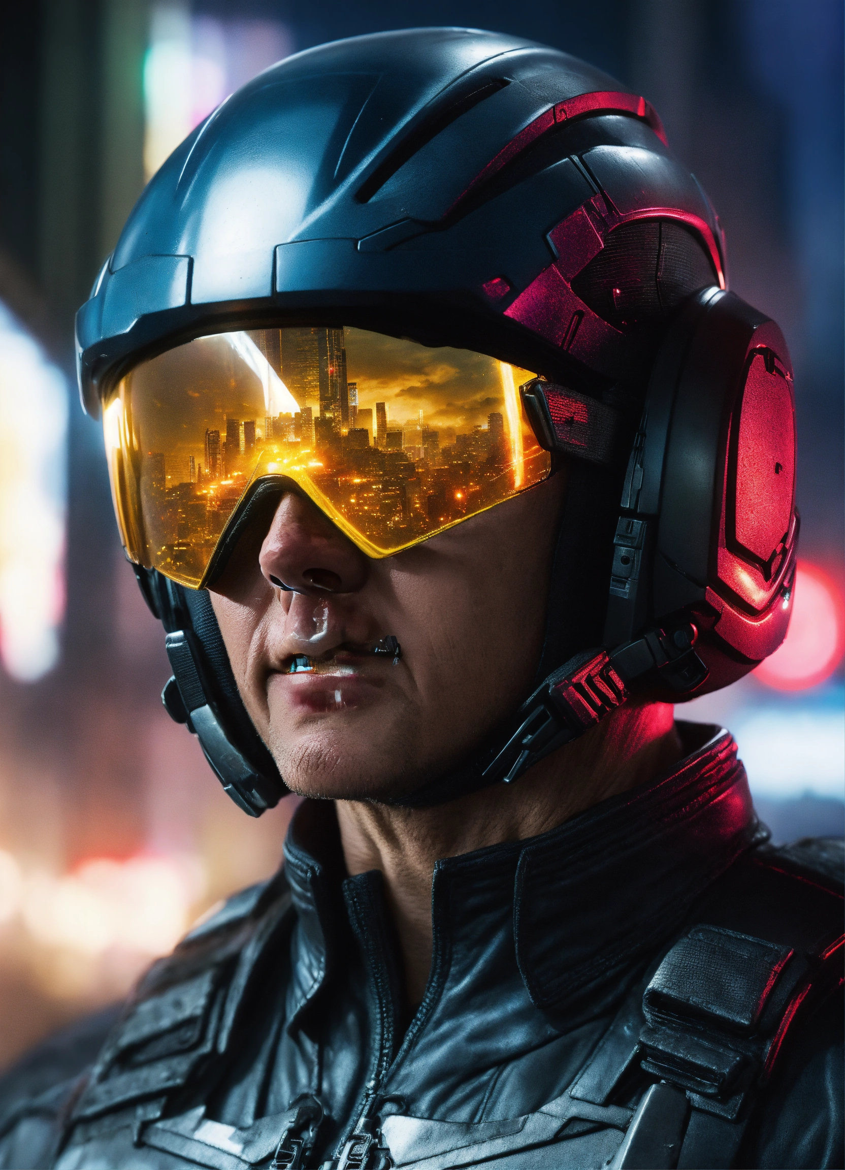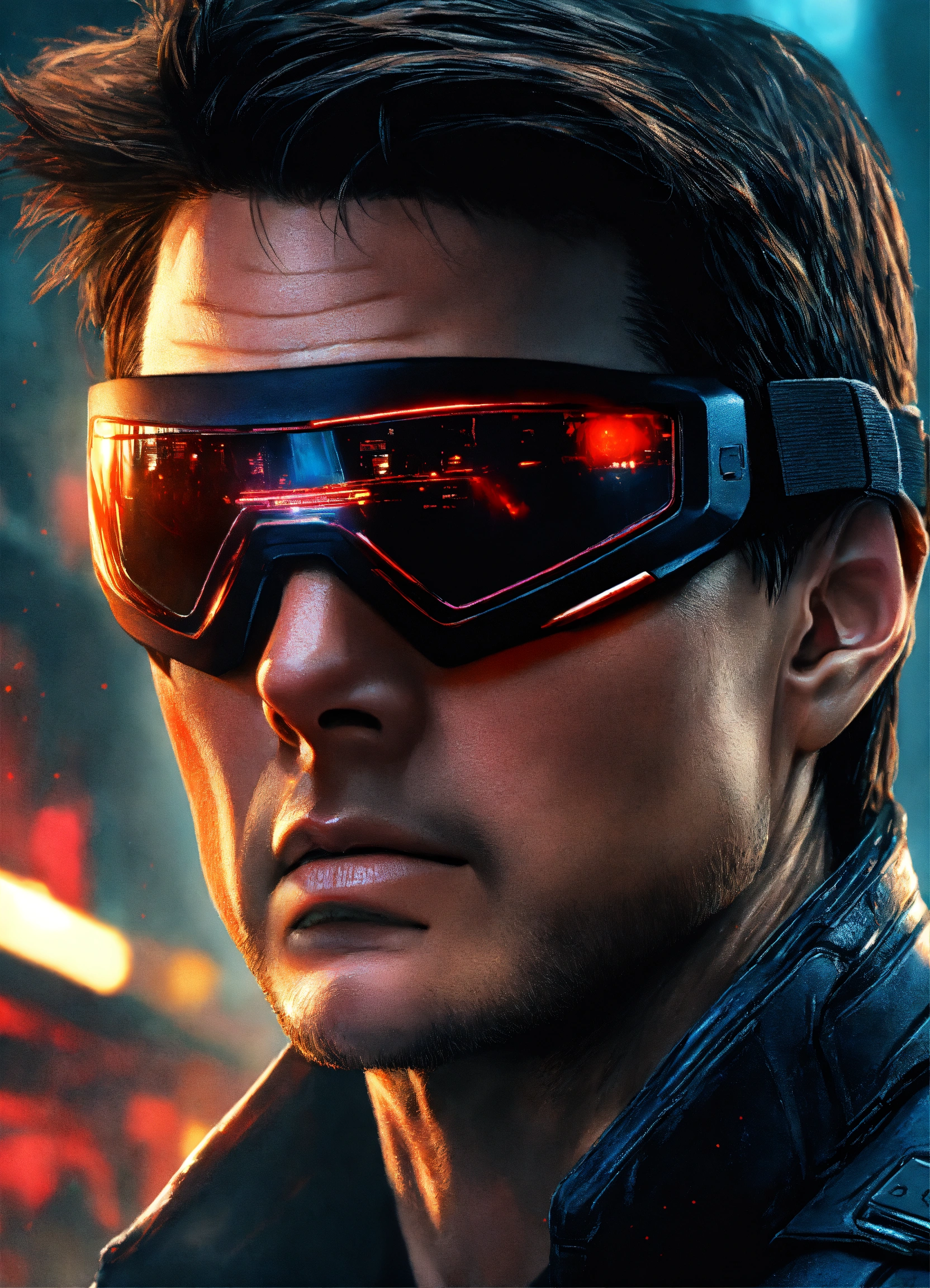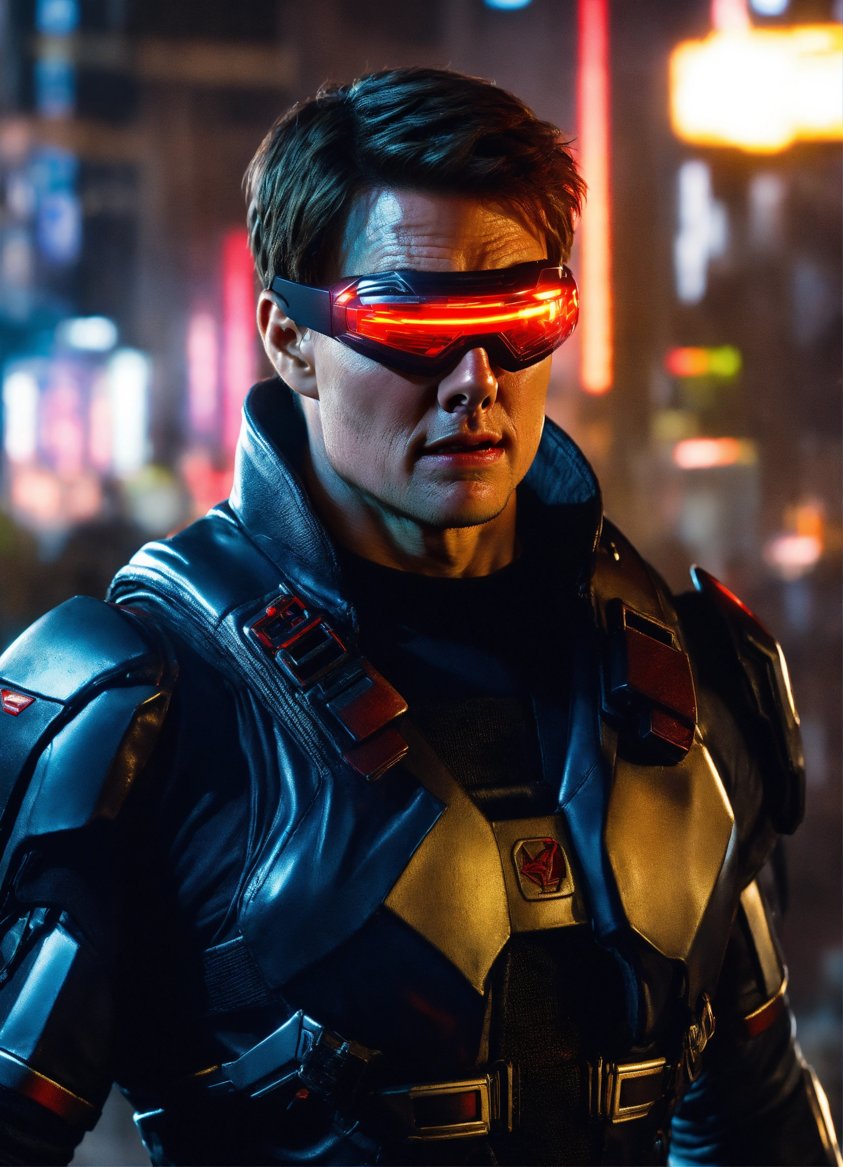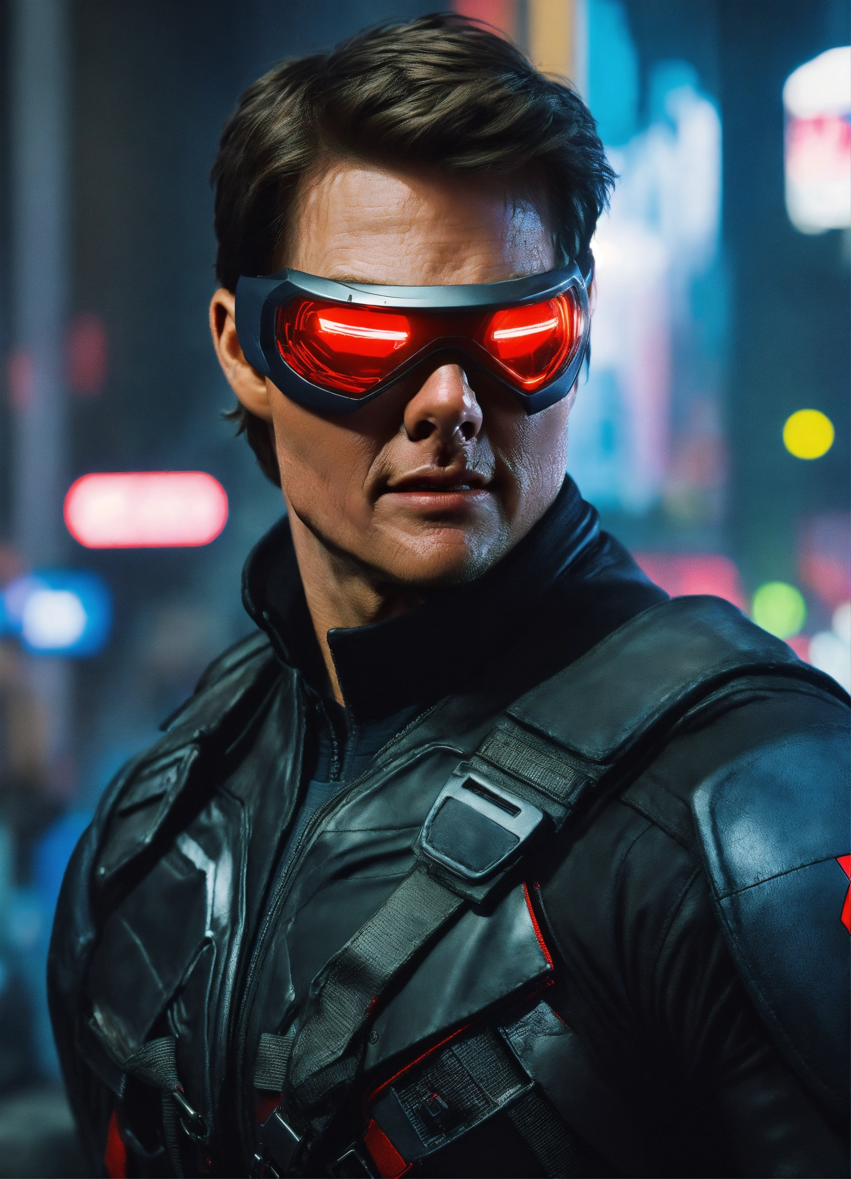 Tom cruise, 40 years old with cyclops visor designed by jim lee, is cyclops of x-men in a cyberpunk metropolis, photorealistic, 8k resolution, hyper detailed