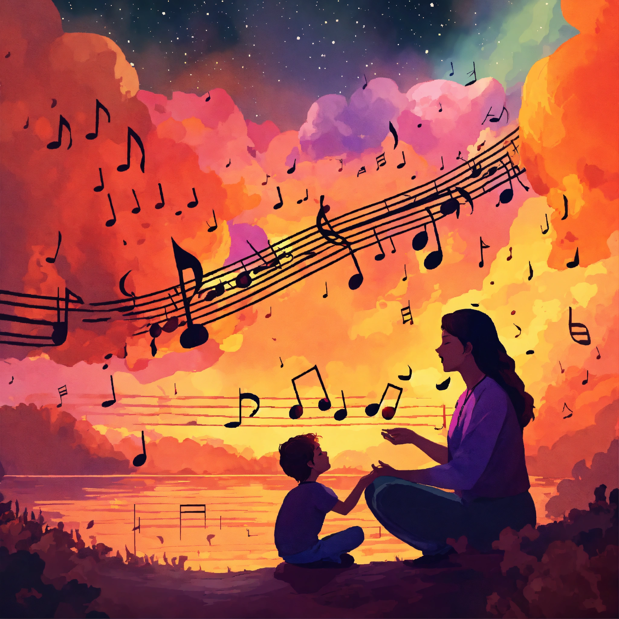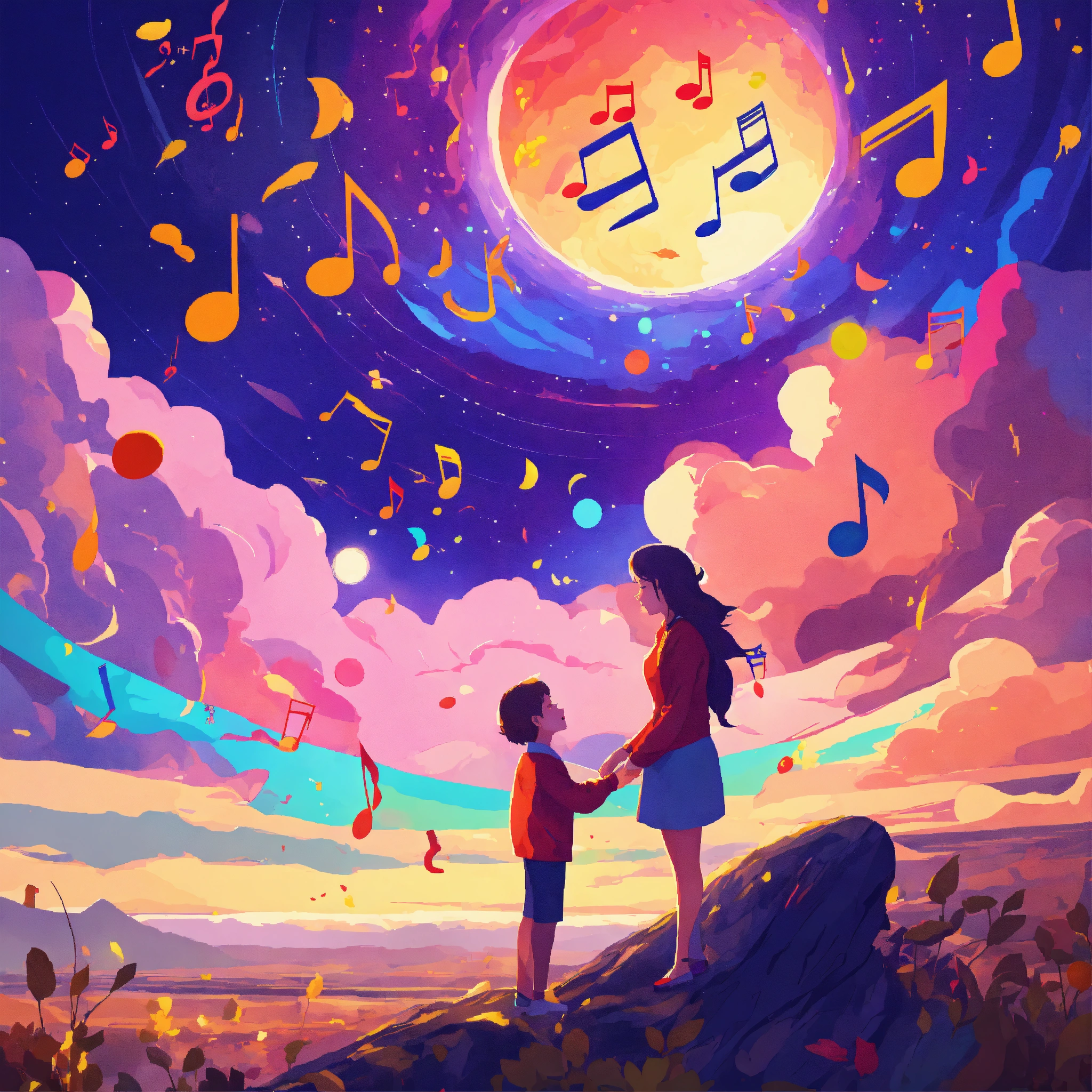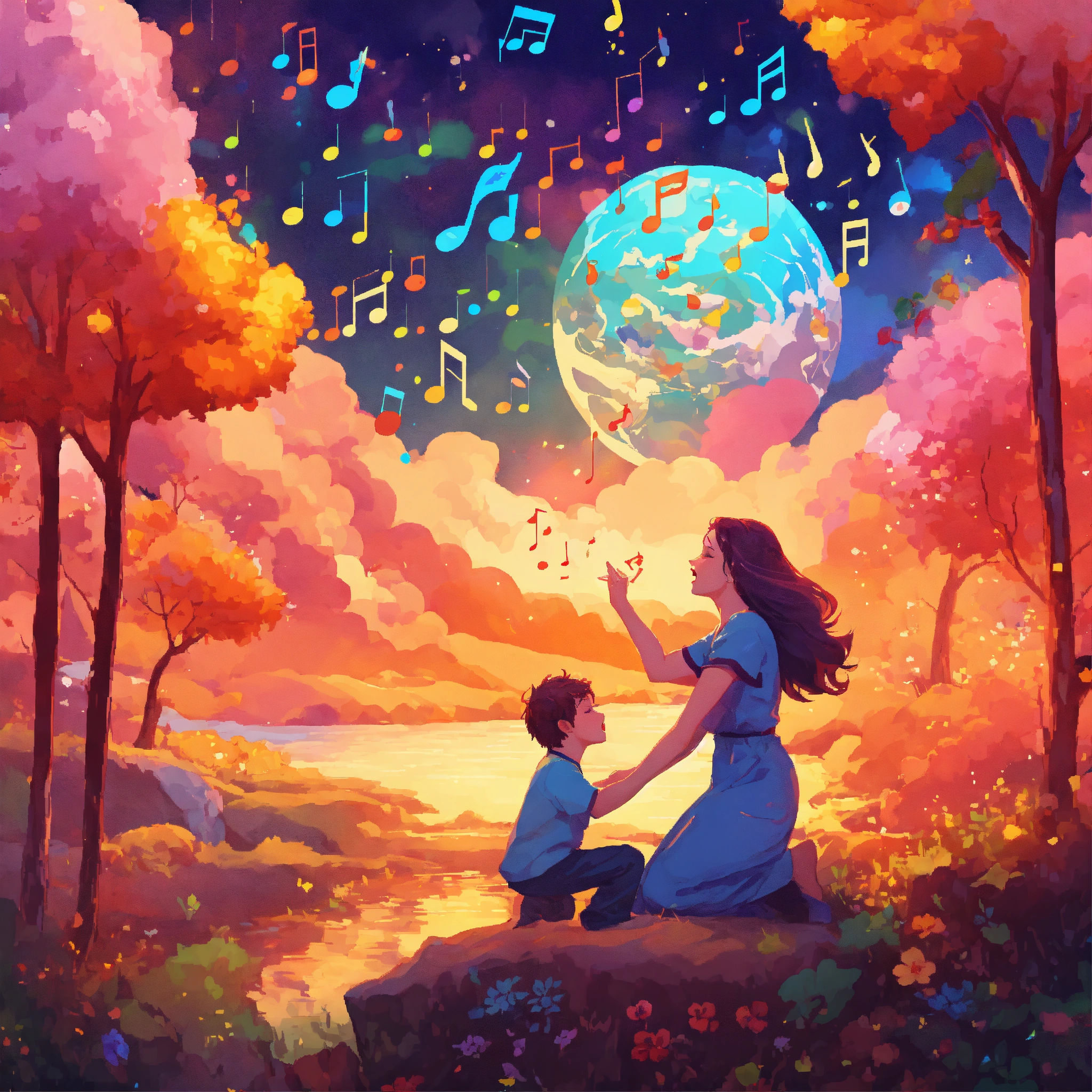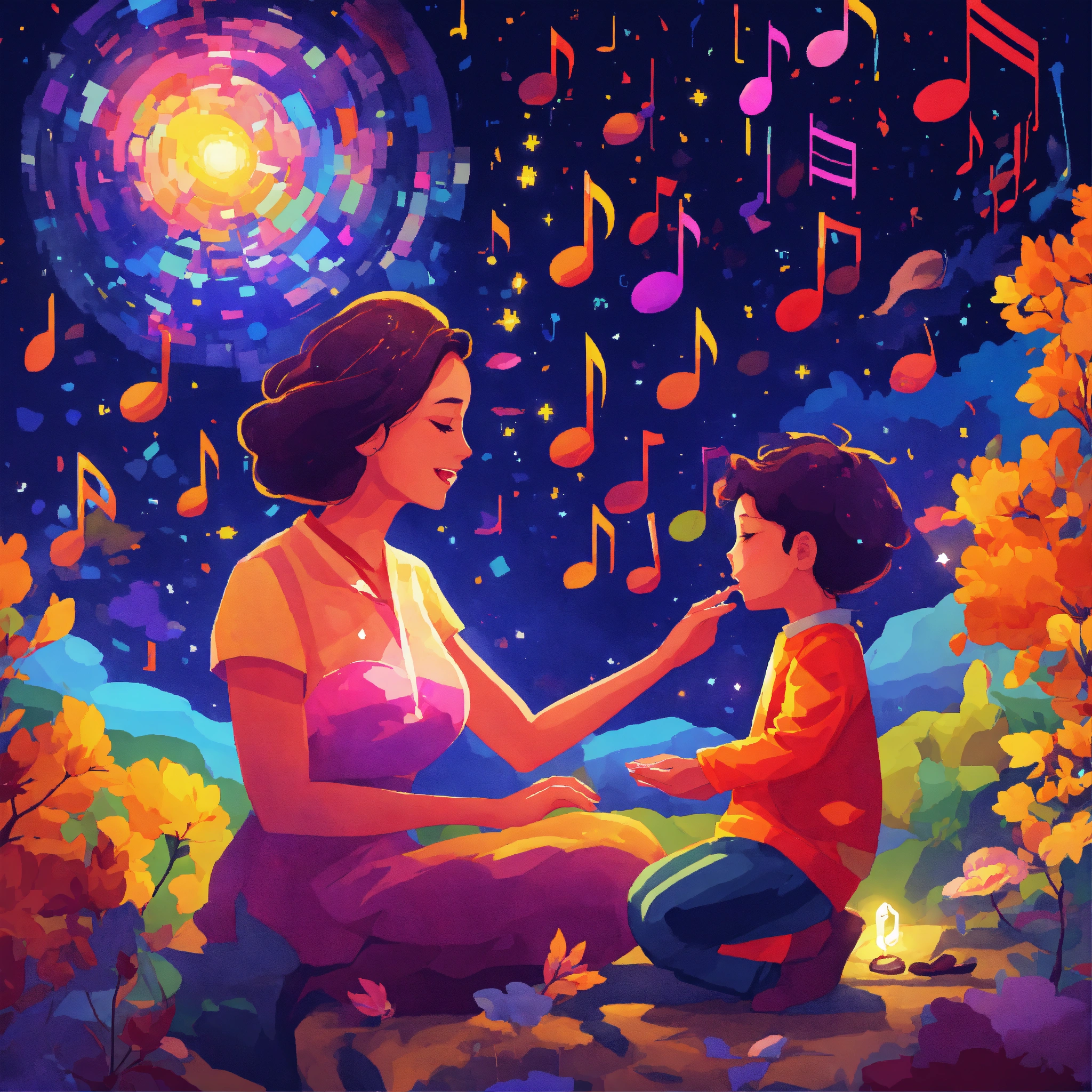 Mother singing wise lessons to her son with musical notes accompanying the scene, love and compassion, colorful illustration, natural expression, nature, universe, holism, digital pixel art