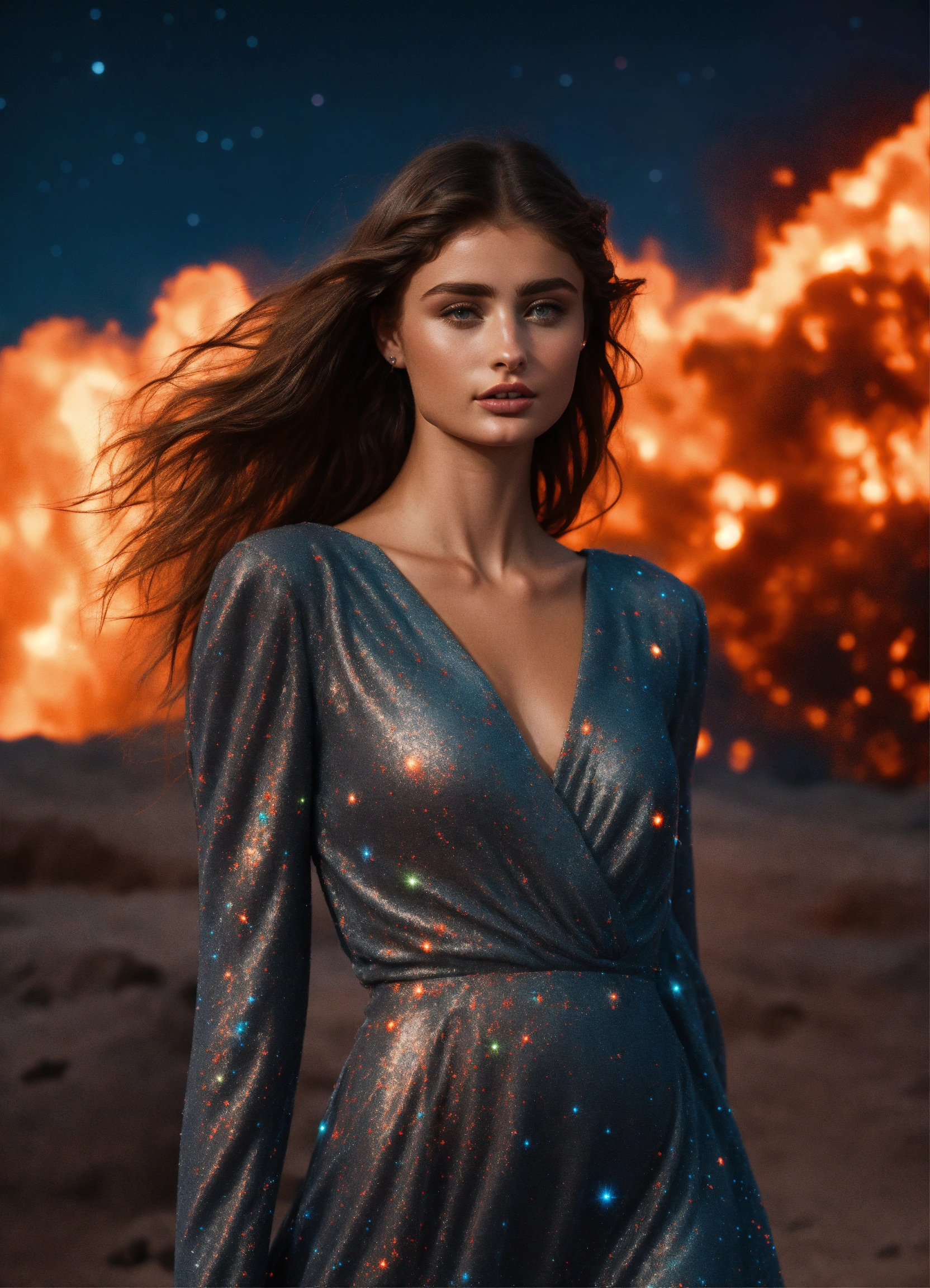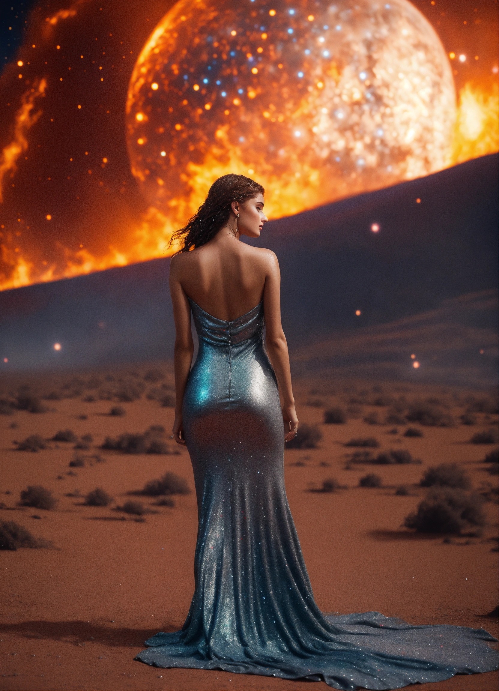 Taylor hill in a burning grey glitter dress on a desolate planet, drenched hair, realistic. galaxy with planets. over the shoulder look. full natural body view. 4k real photoshoot.