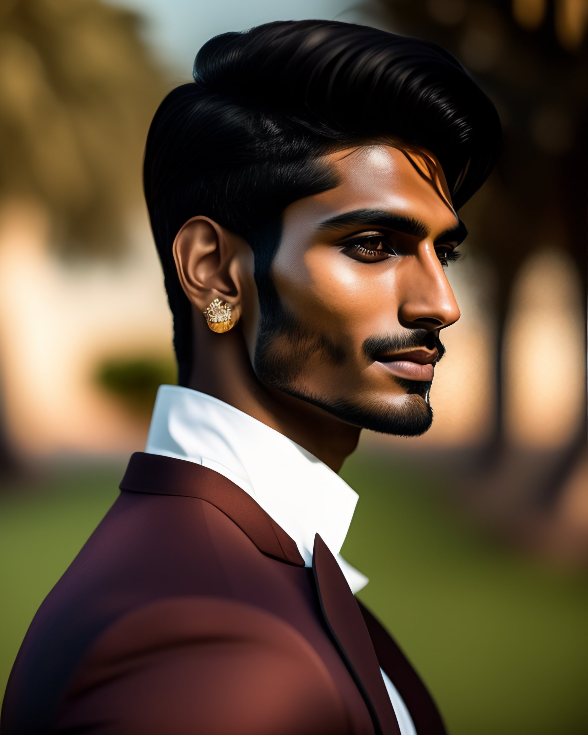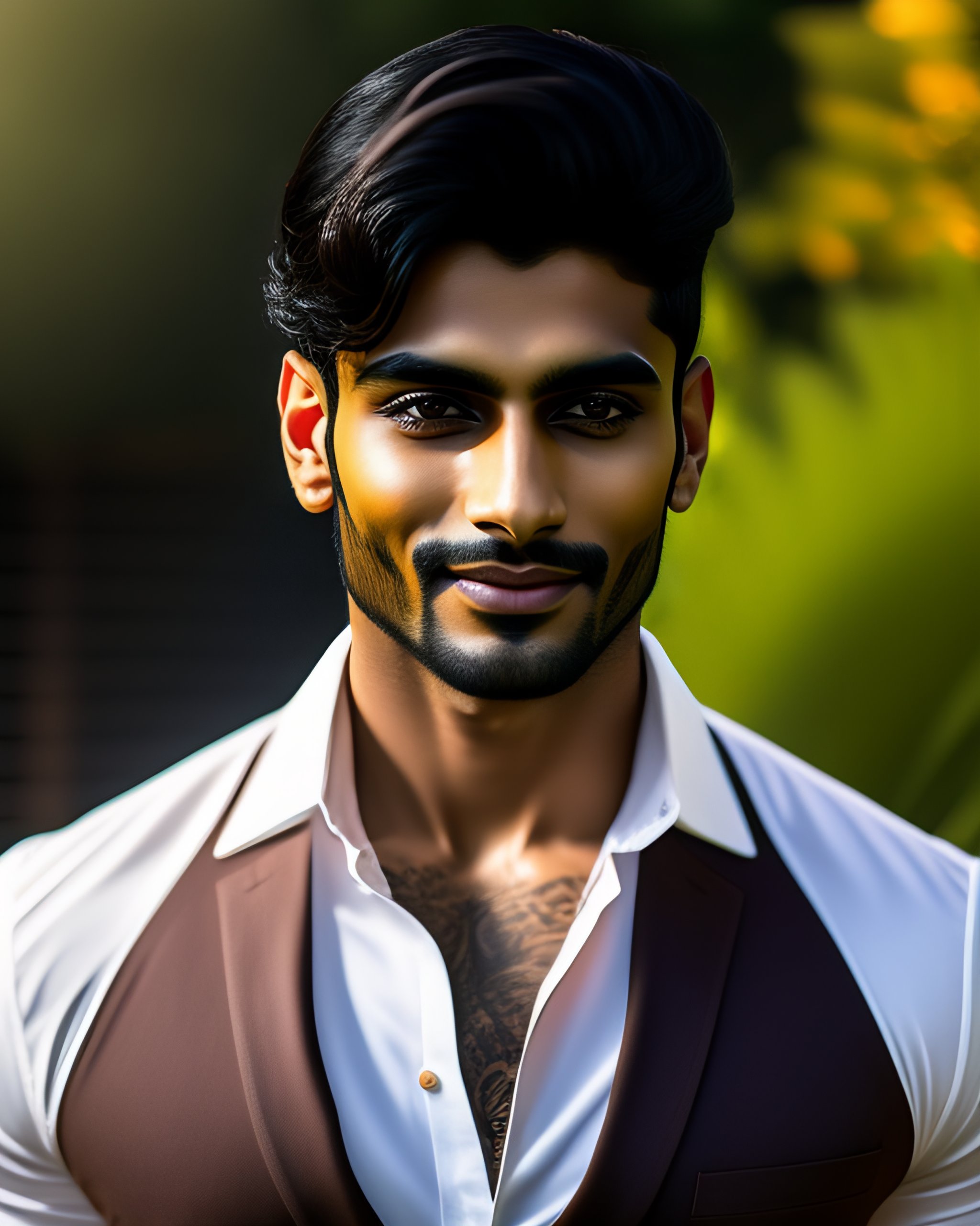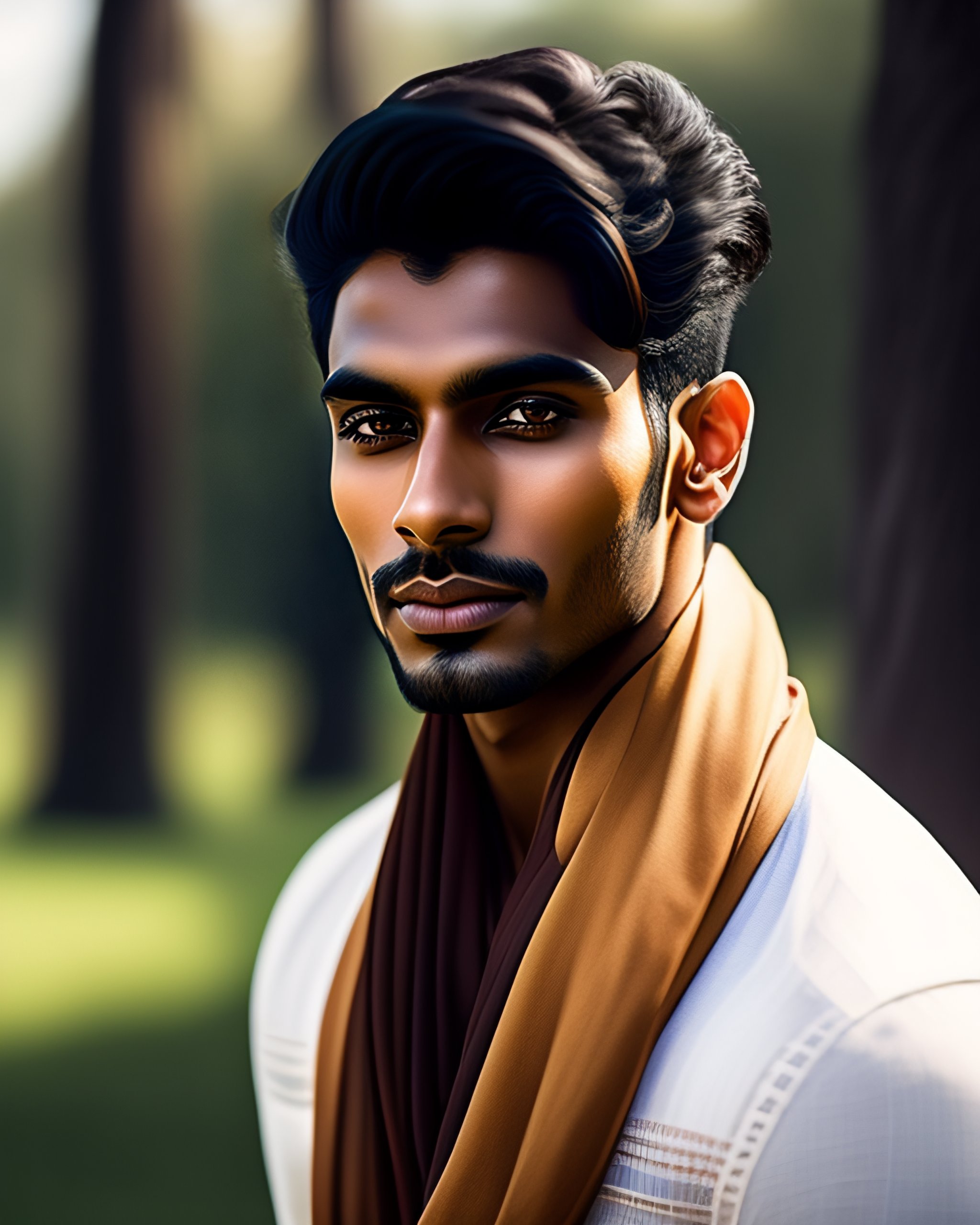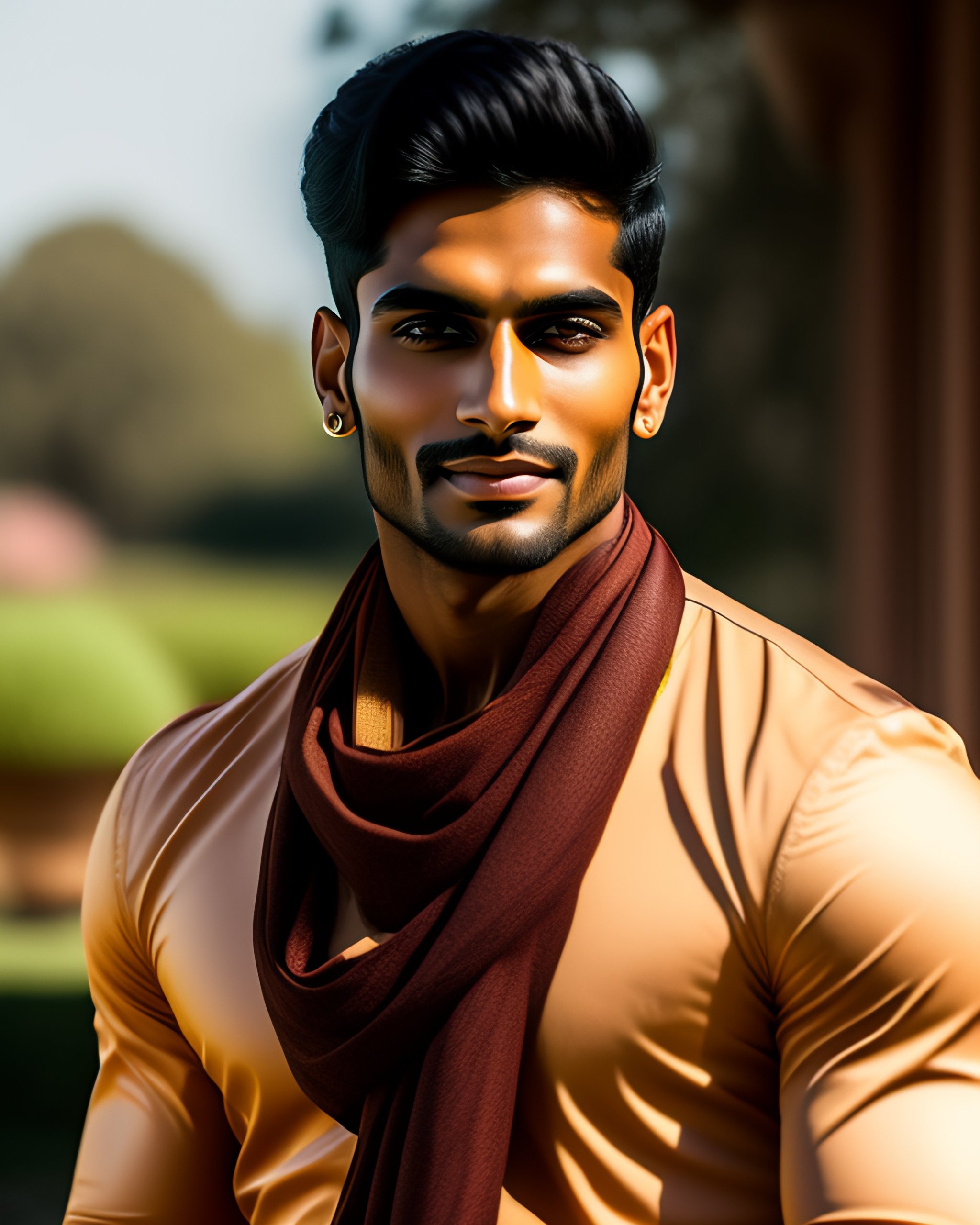 A young slim indian man with smooth brown skin wearing a shirt and an elegant scarf sat on the grass posing for a picture at daytime, yard background, beautiful portrait, intricate frame, tender depiction, detailed, sharp focus, clear lighting, joyful, classical oil painting