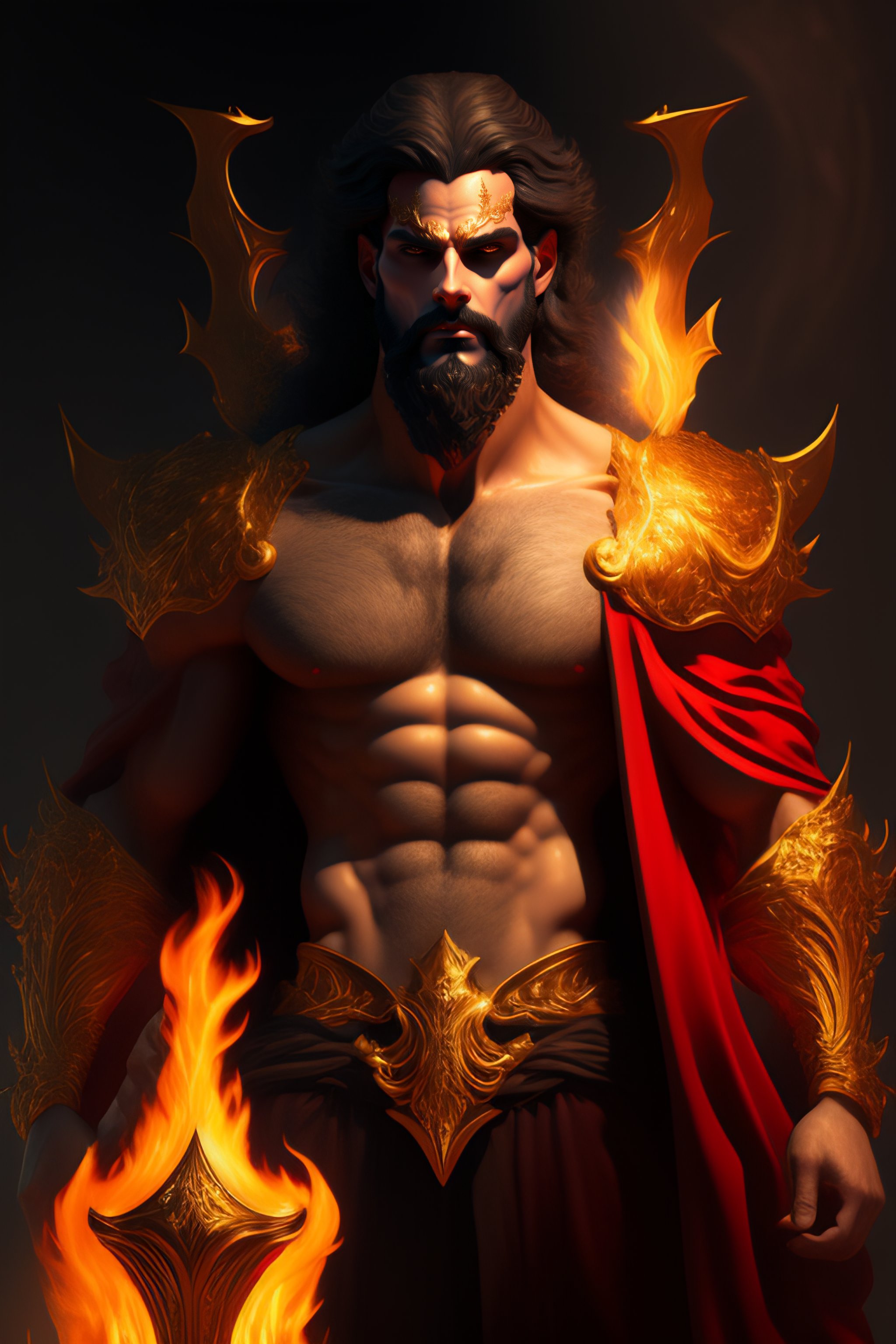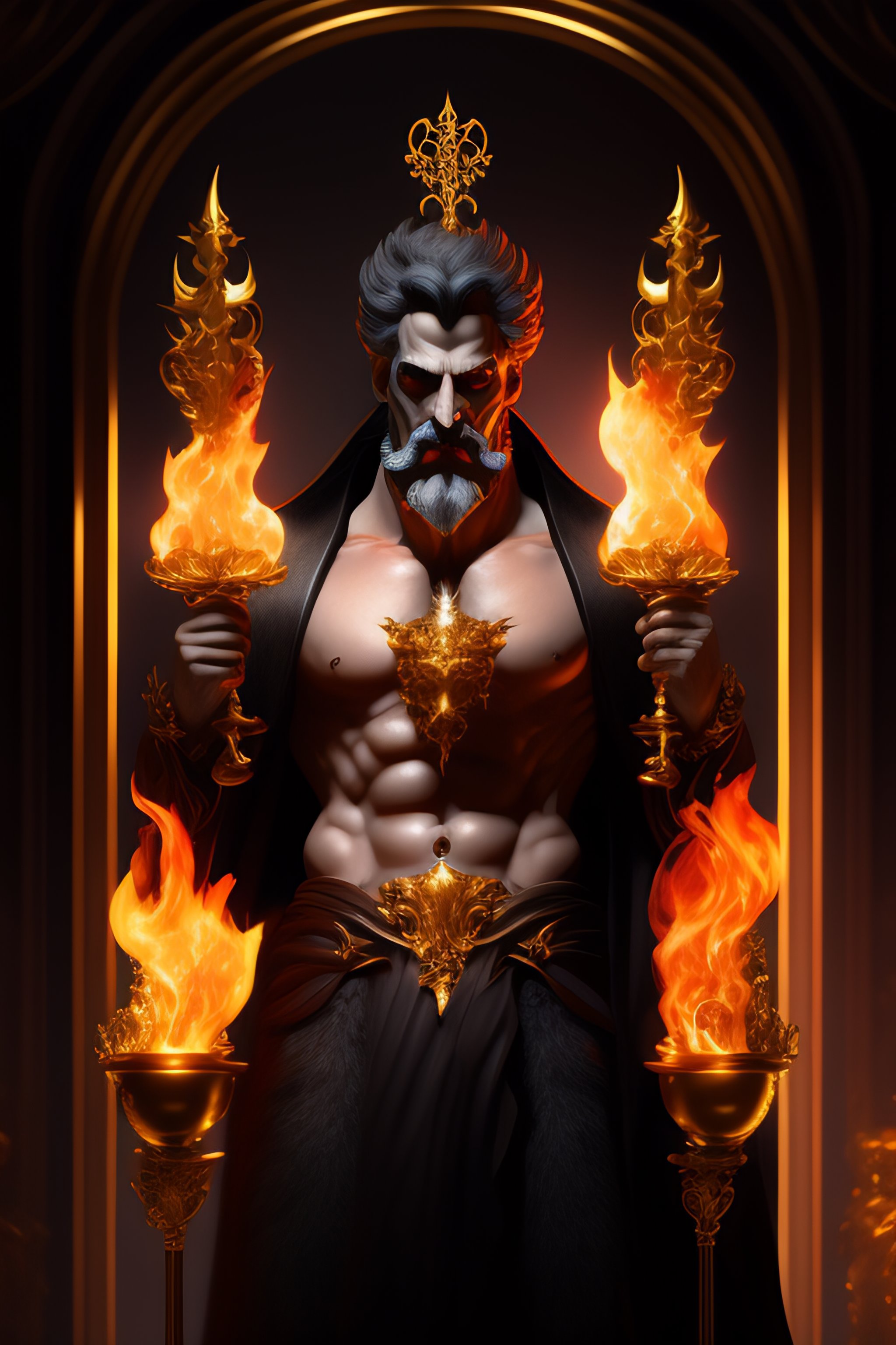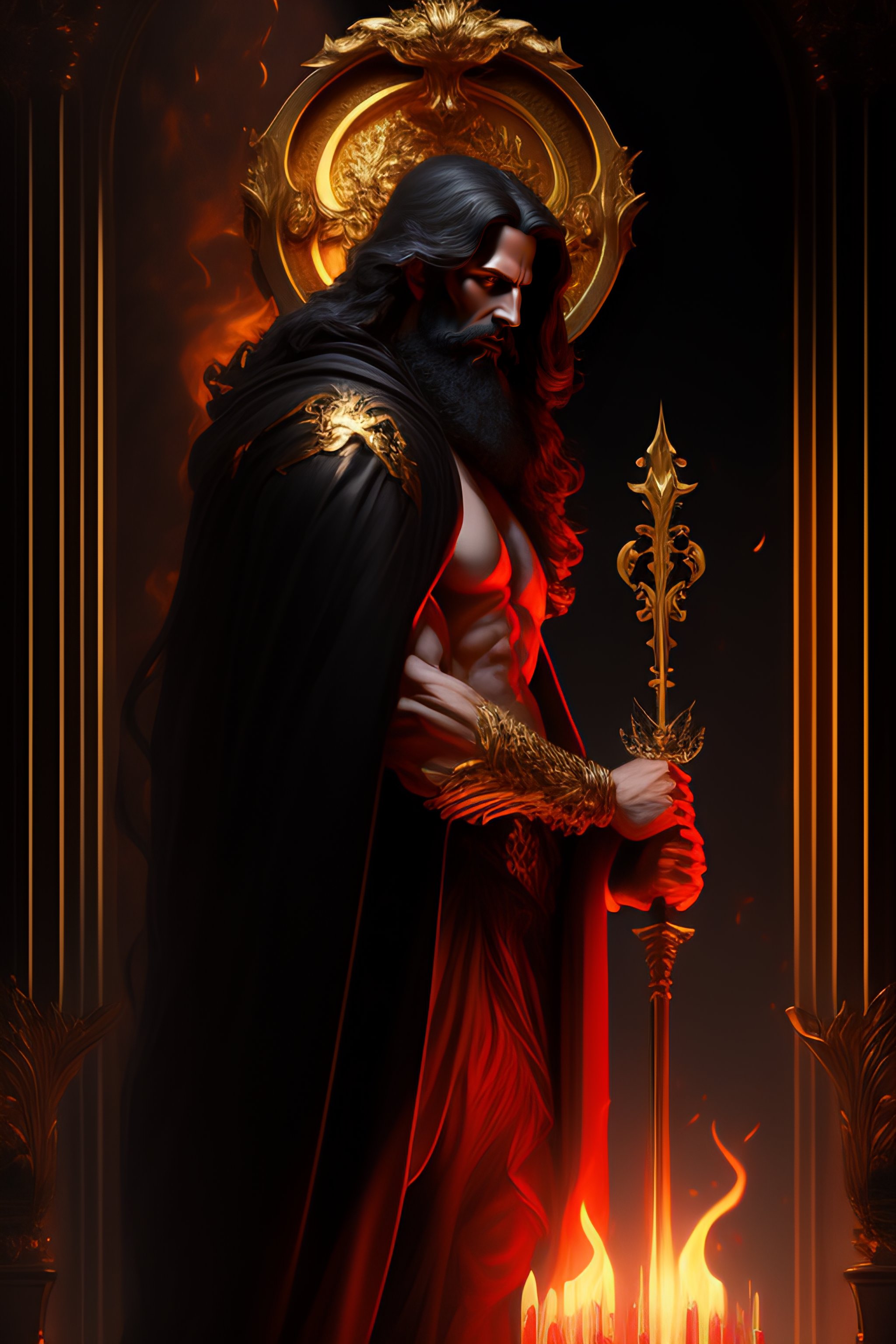 Perfectly detailed greek god hades surrounded by a brilliantly beautiful palace of gold, carrying a two-pronged pitchfork!! blessed by hell with physical perfection man with black beard, intricate and highly detailed dark painting, divine hellenic perfection. digital painting, art station, concept art, sharp soft focus, illustration, art by artgerm and greg rutkowski and alphonse mucha, dante scene, dark portrait. fire, death, skulls and bones, light dark, black clothing