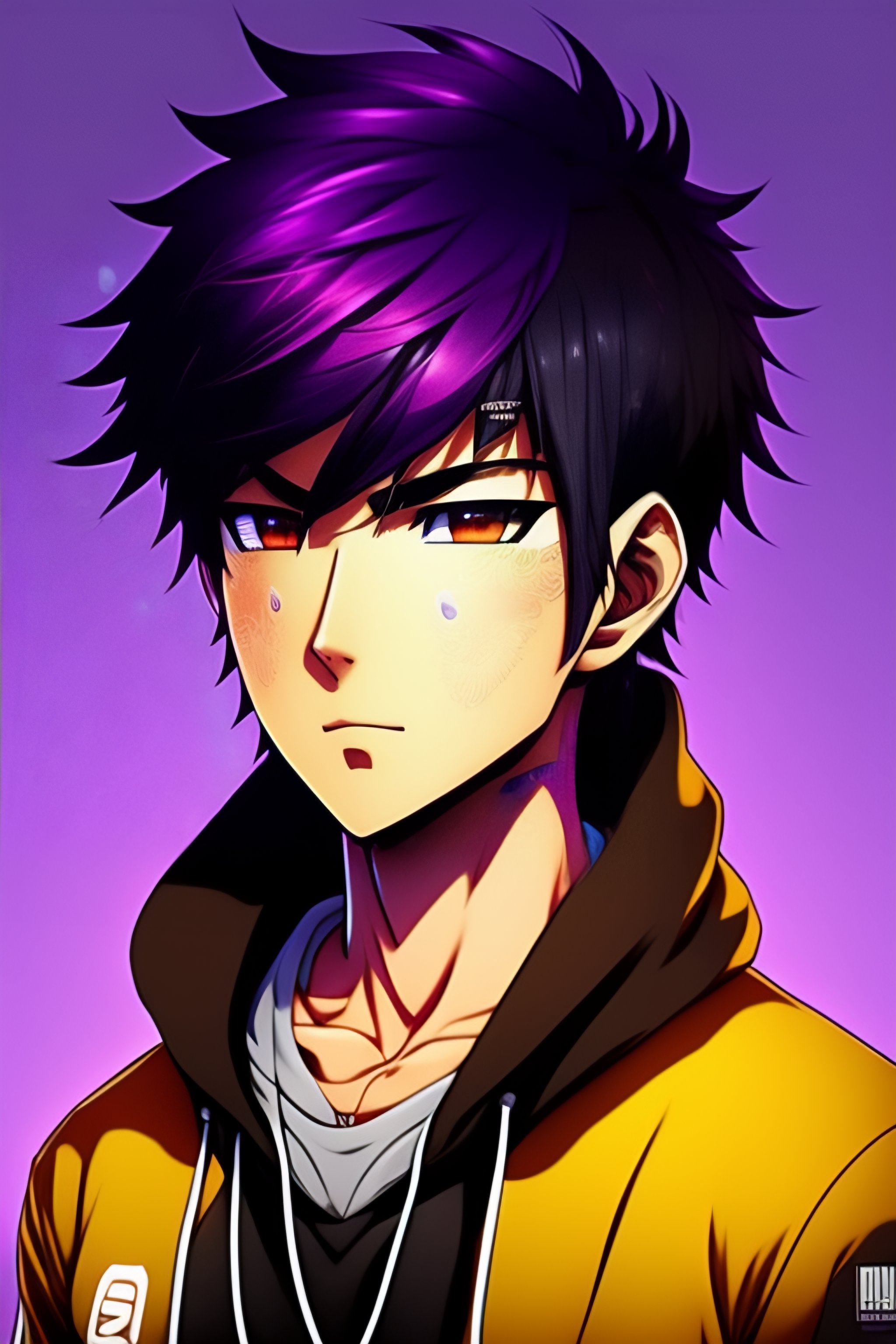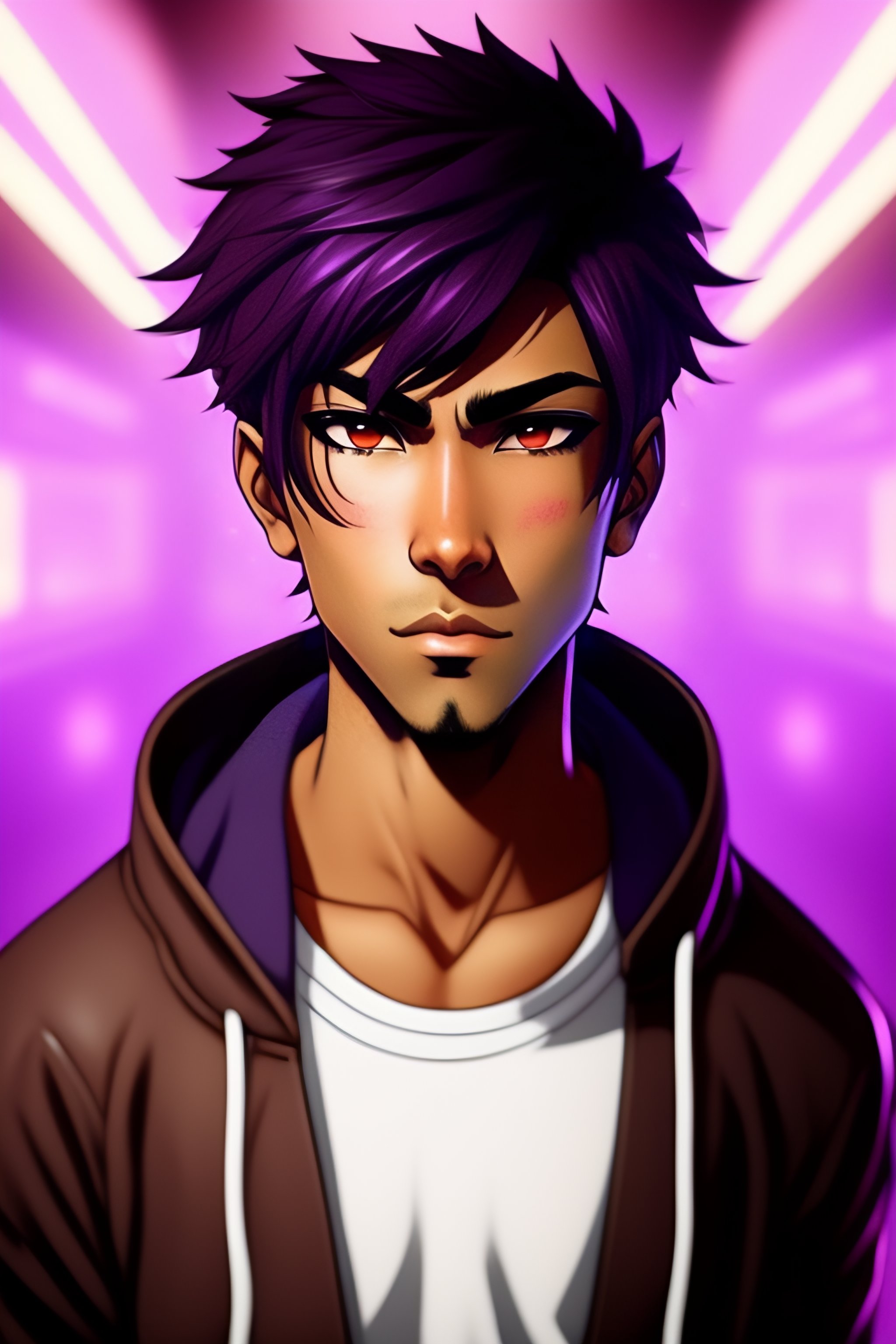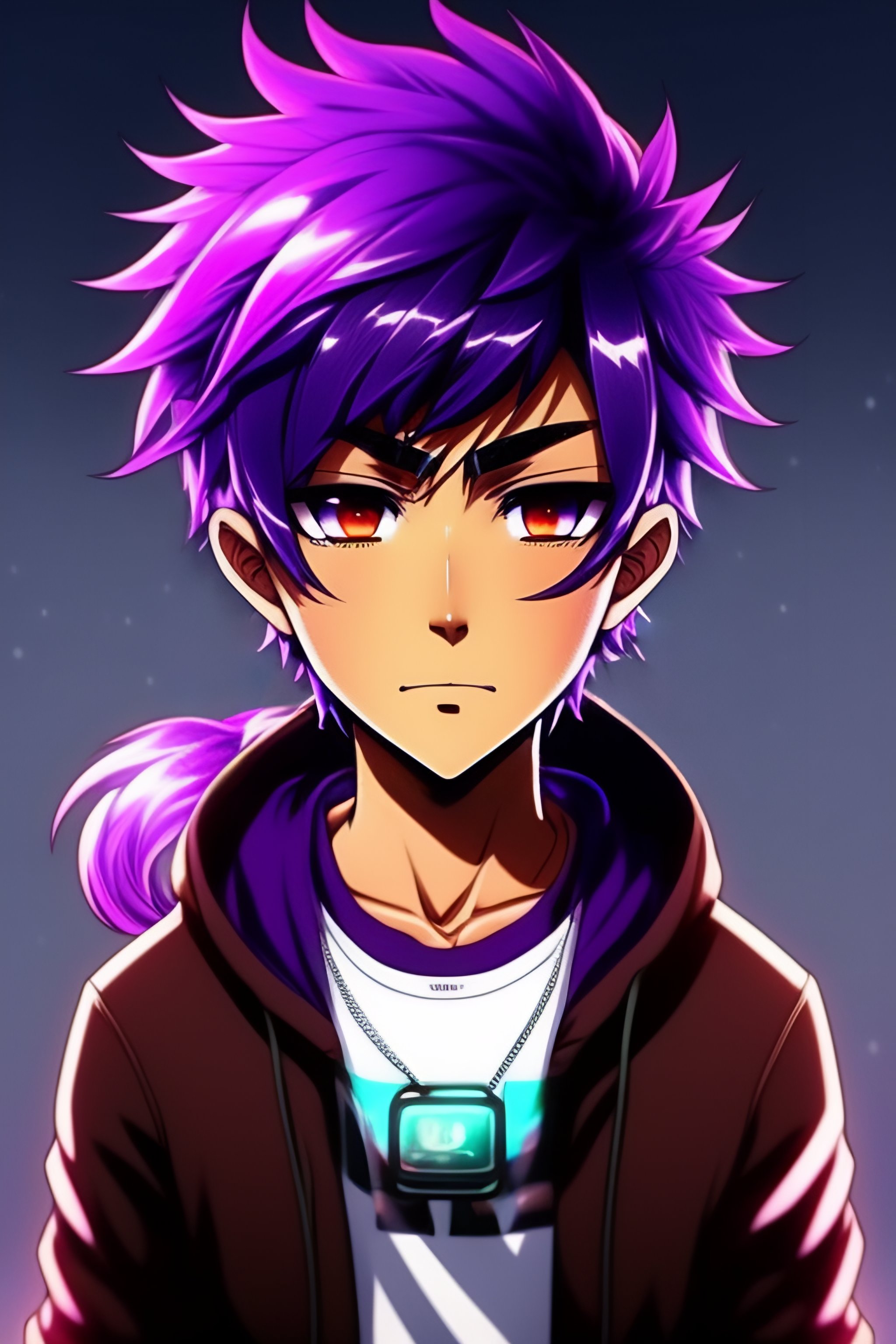 Purple hair anime brown guy, indian, dark skin, brown face, hoodie, light brown skin, hacker, no expression, no emotion, anime style, manga, cartoon, anime