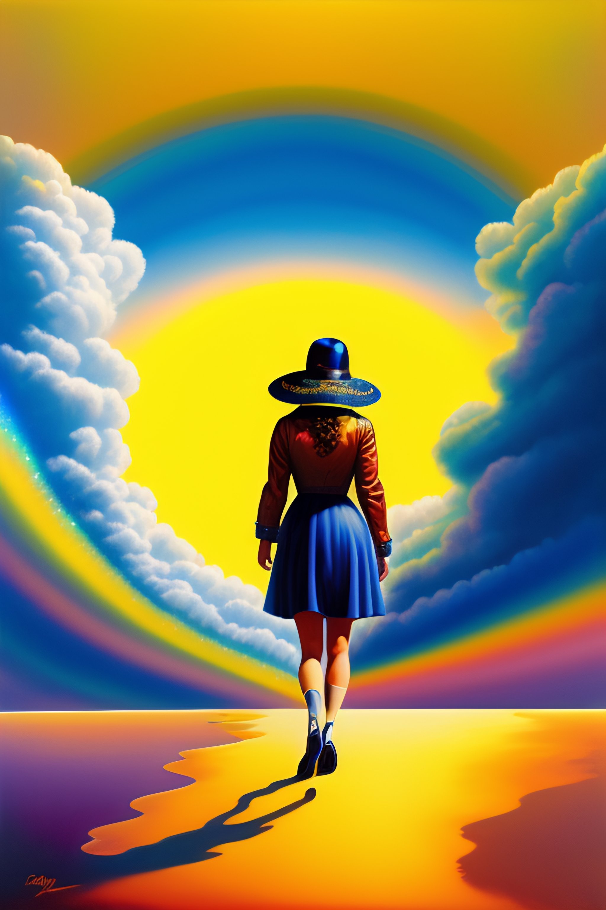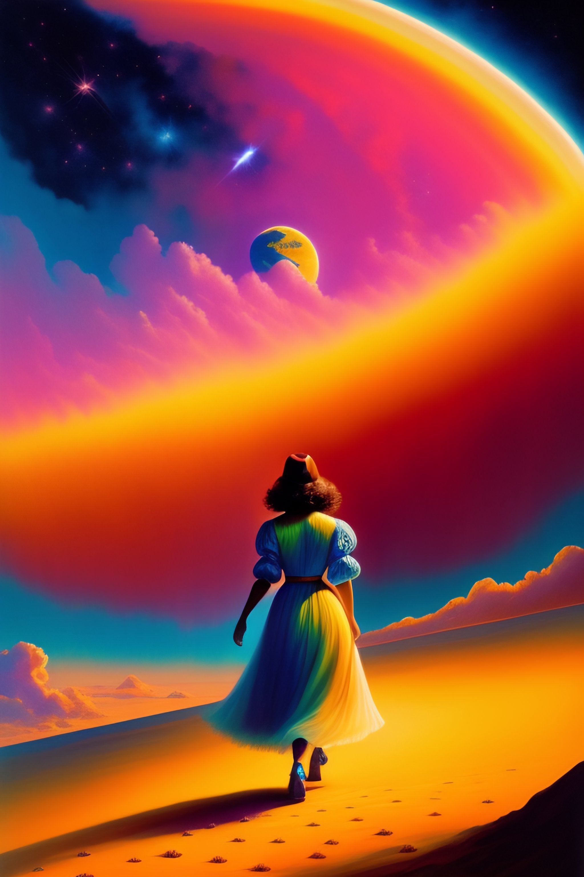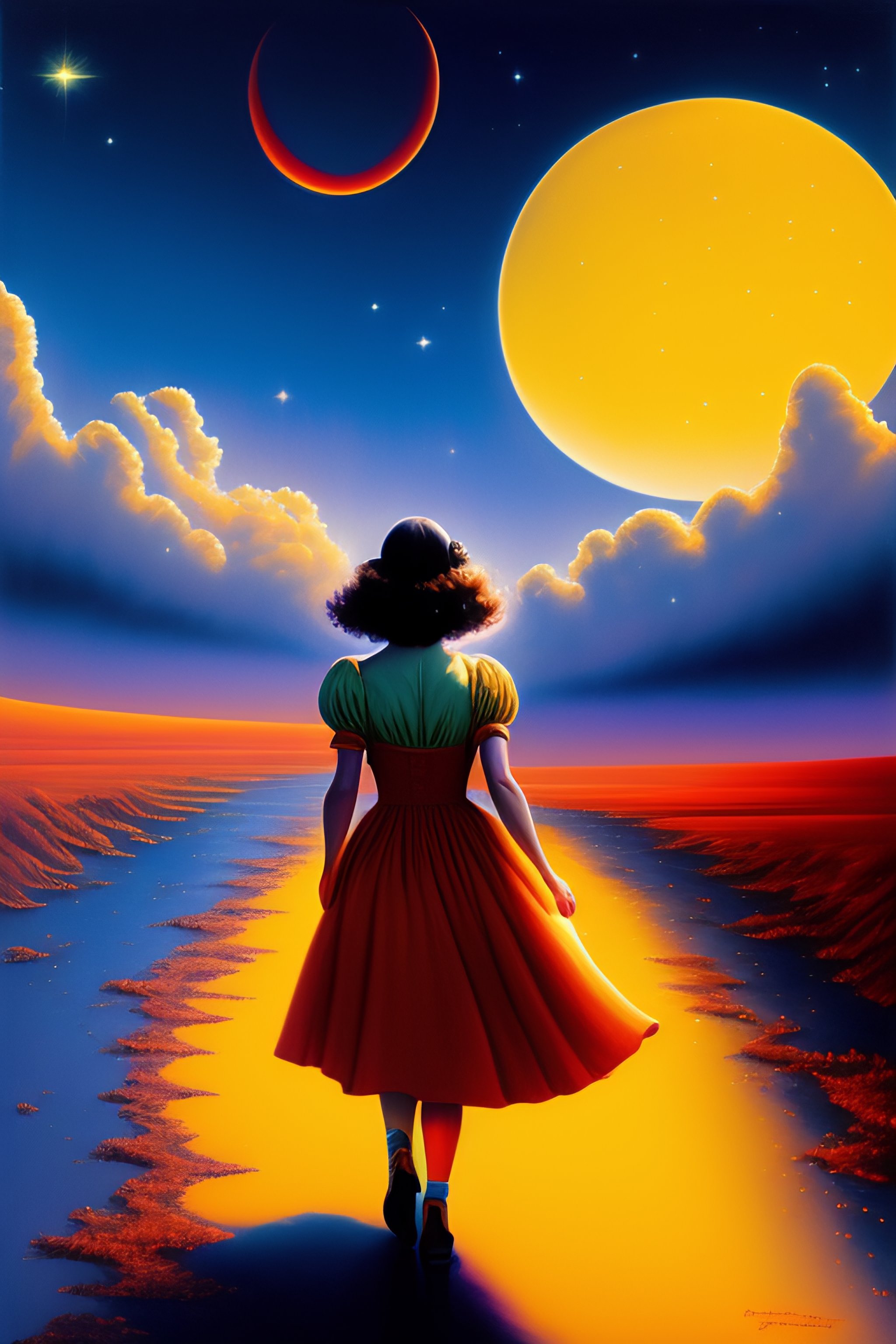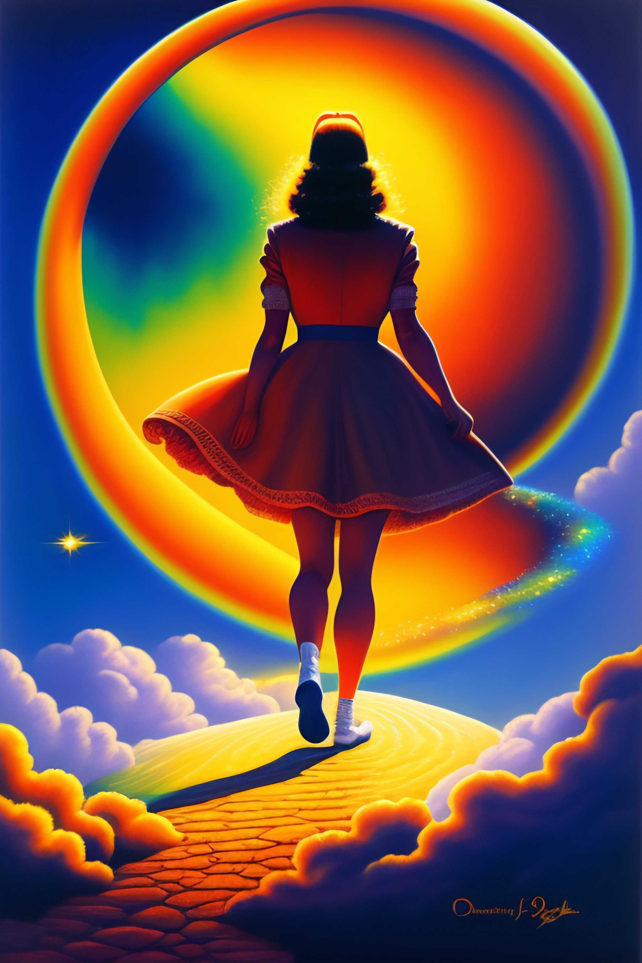 Dorothy walking away, seen from her back, on a yellow iridiscent glowing path on the moon, craters al around, she is wearing red shoes. big blue birds on the sky. rainbow crossing the sky, clouds, dreamy, by frazetta, shooting star, tentacles on the floor
