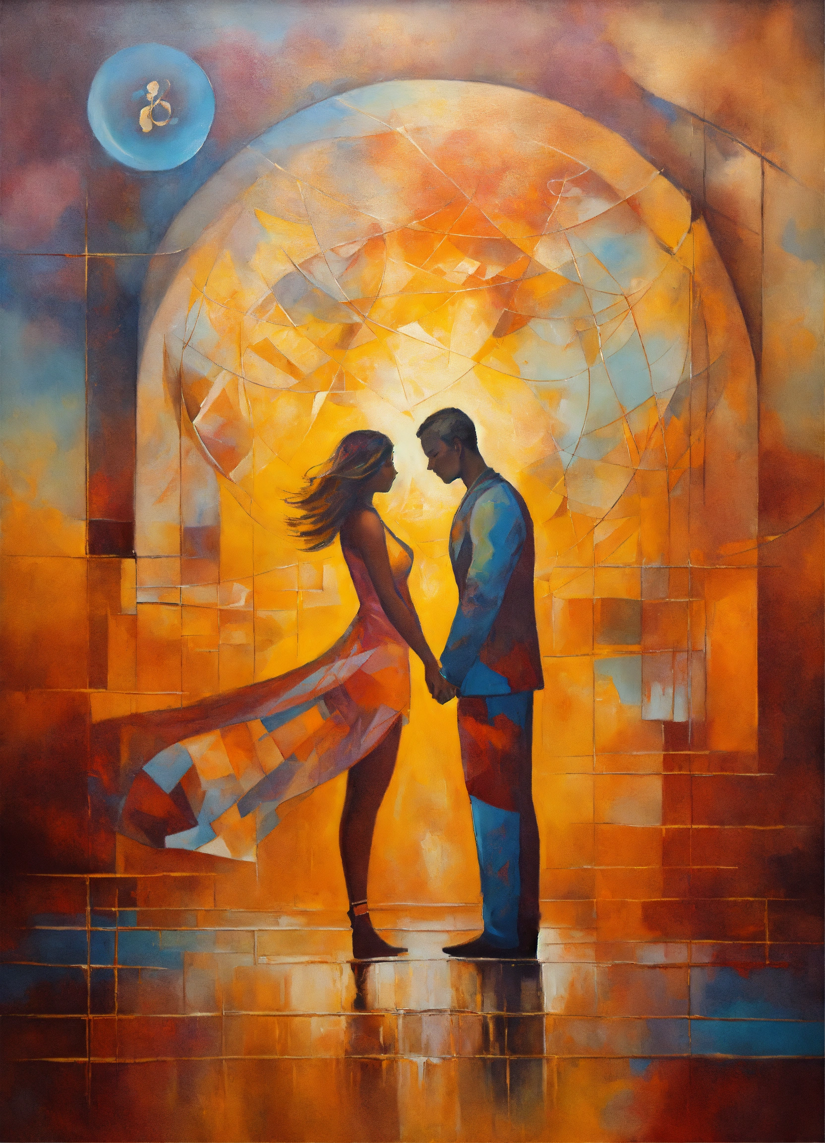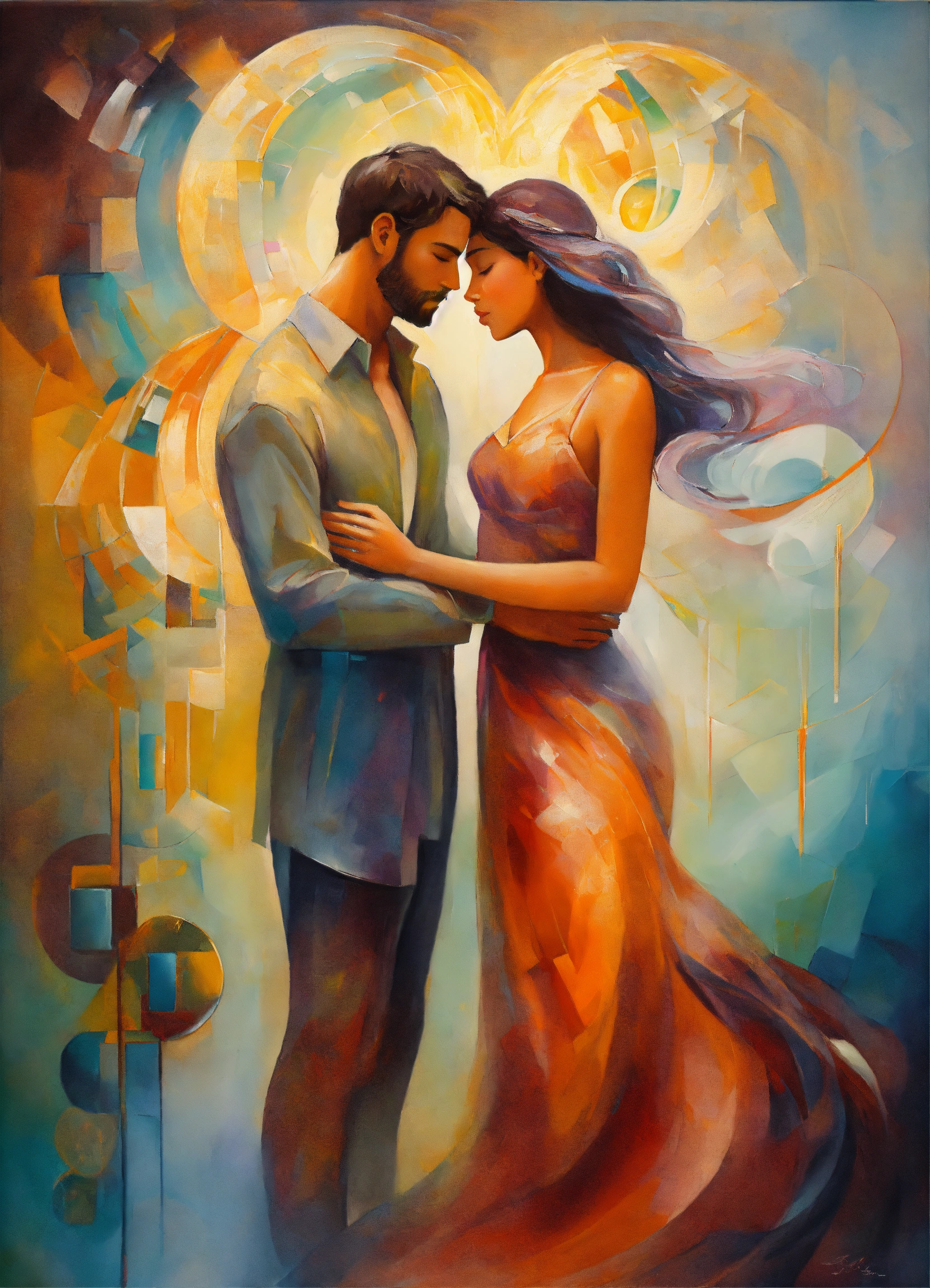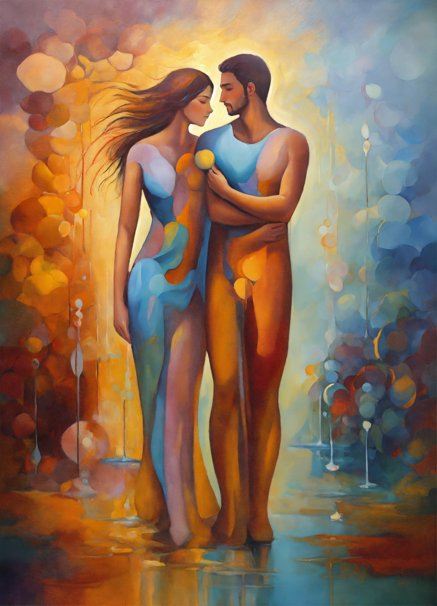 Abstract oil painting of a man and a woman who convey unity, love, balance, harmony, peace, understanding and deep connection of the soul in a mysterious environment in soft tones
