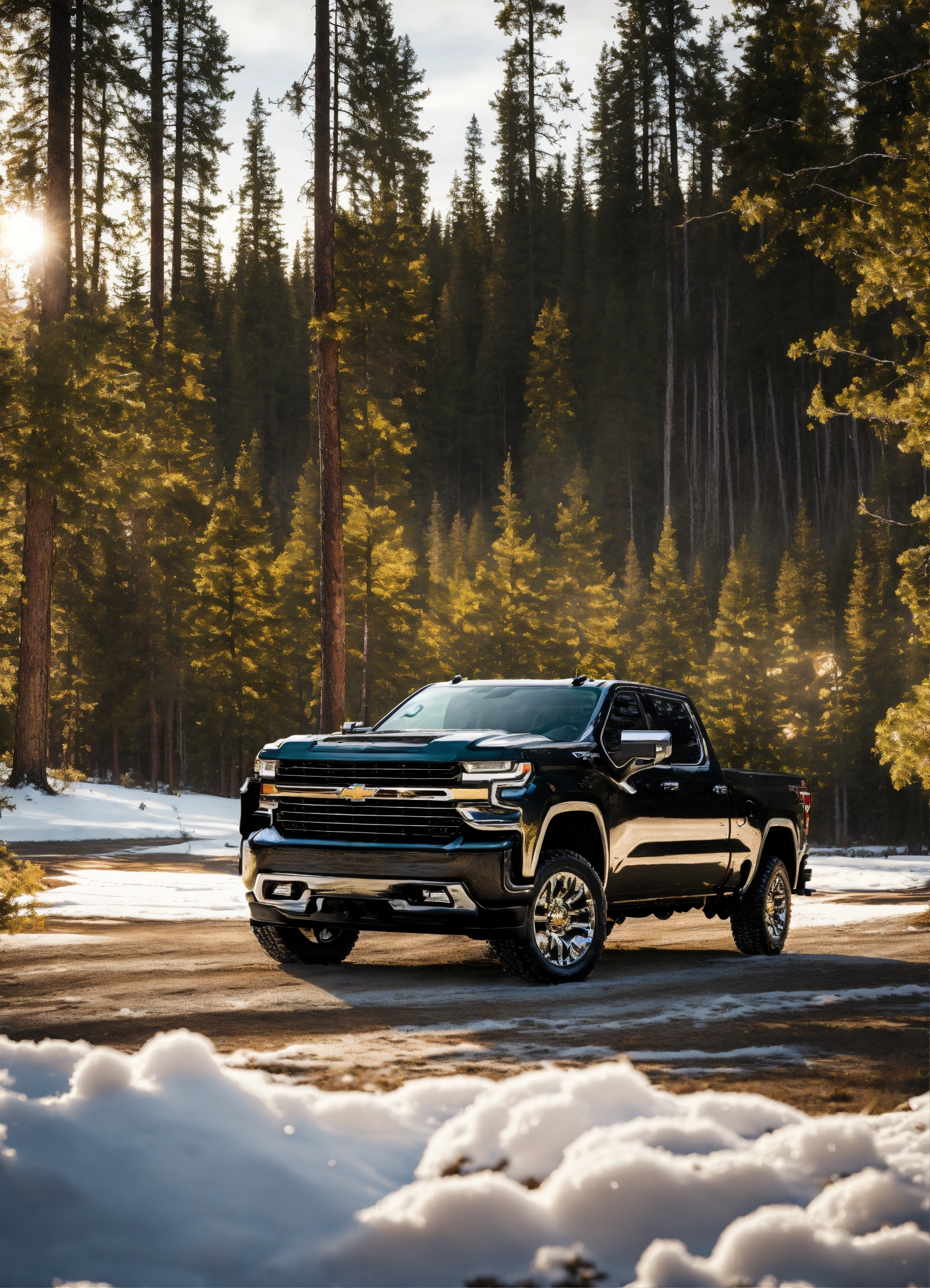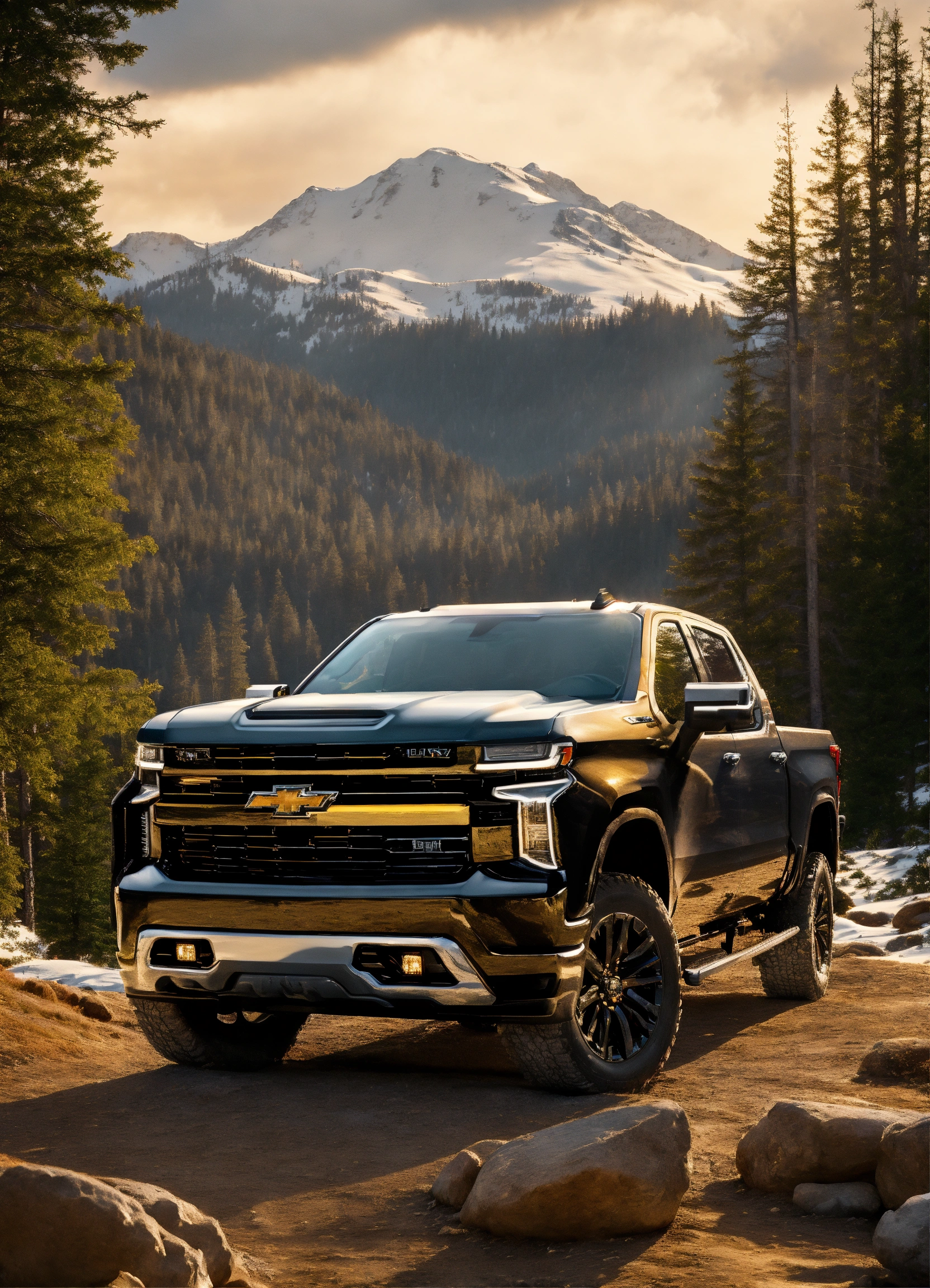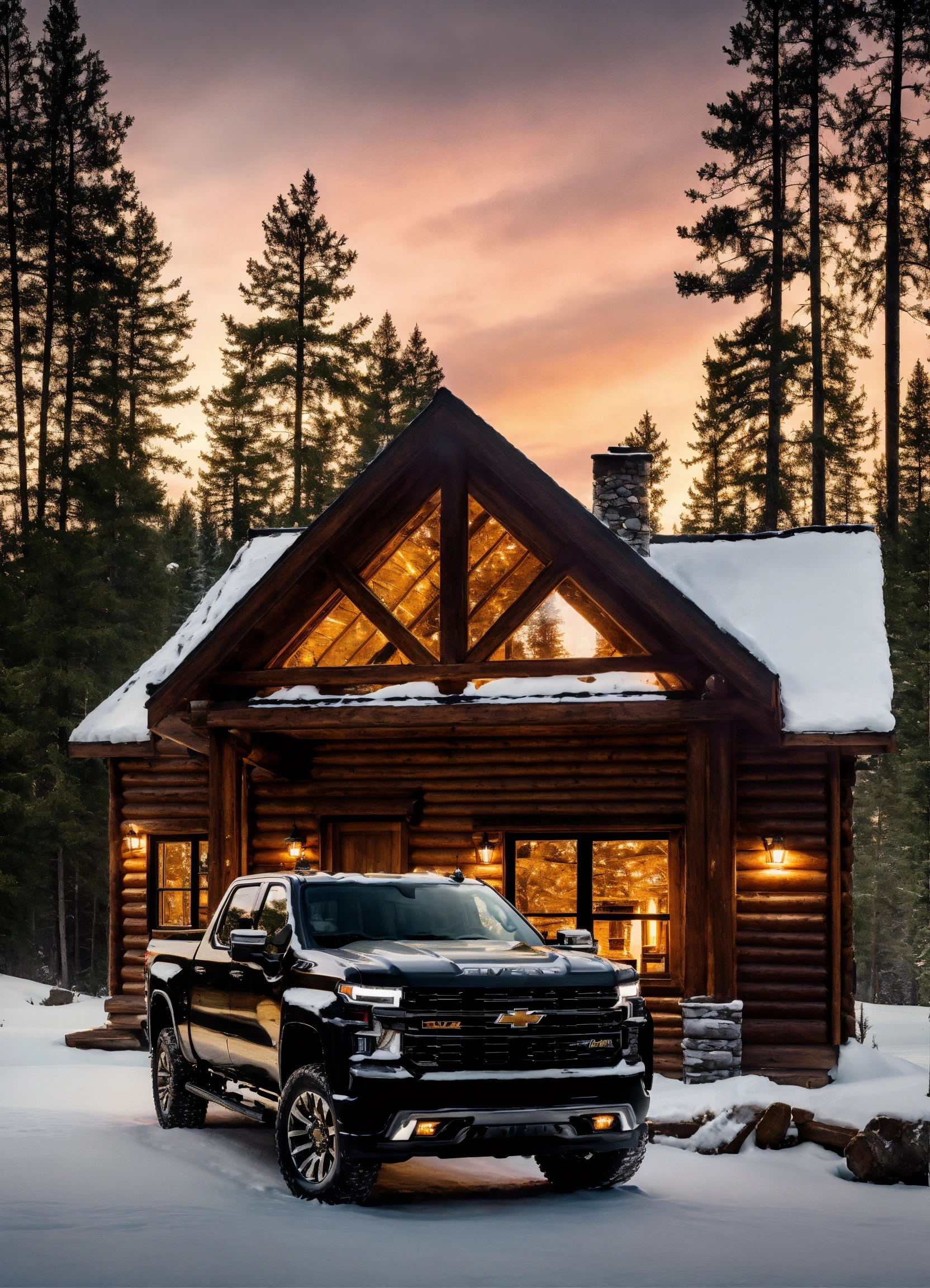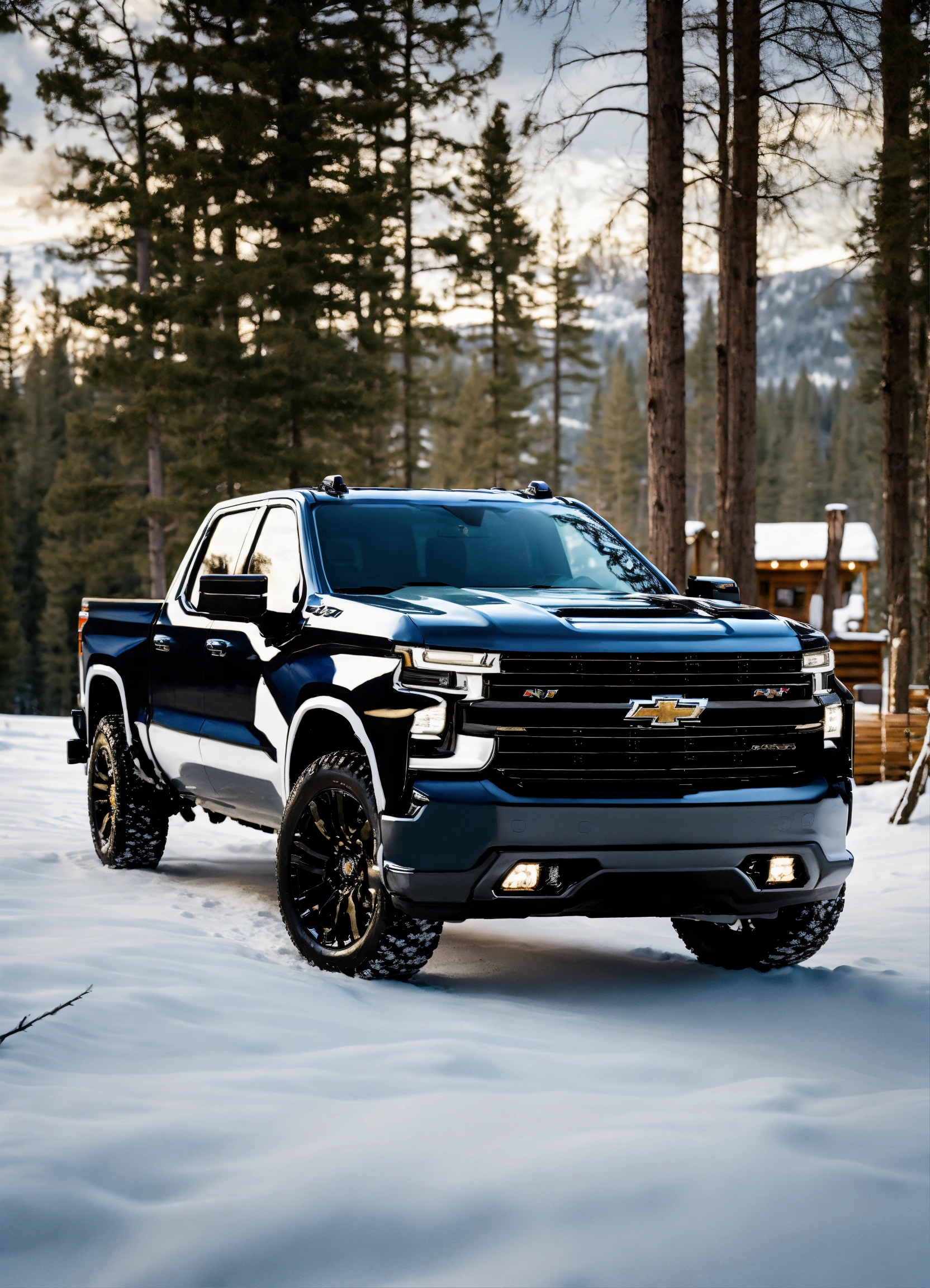 2023 chevy silverado black with gold trim wood cabin snow landscape woodland background