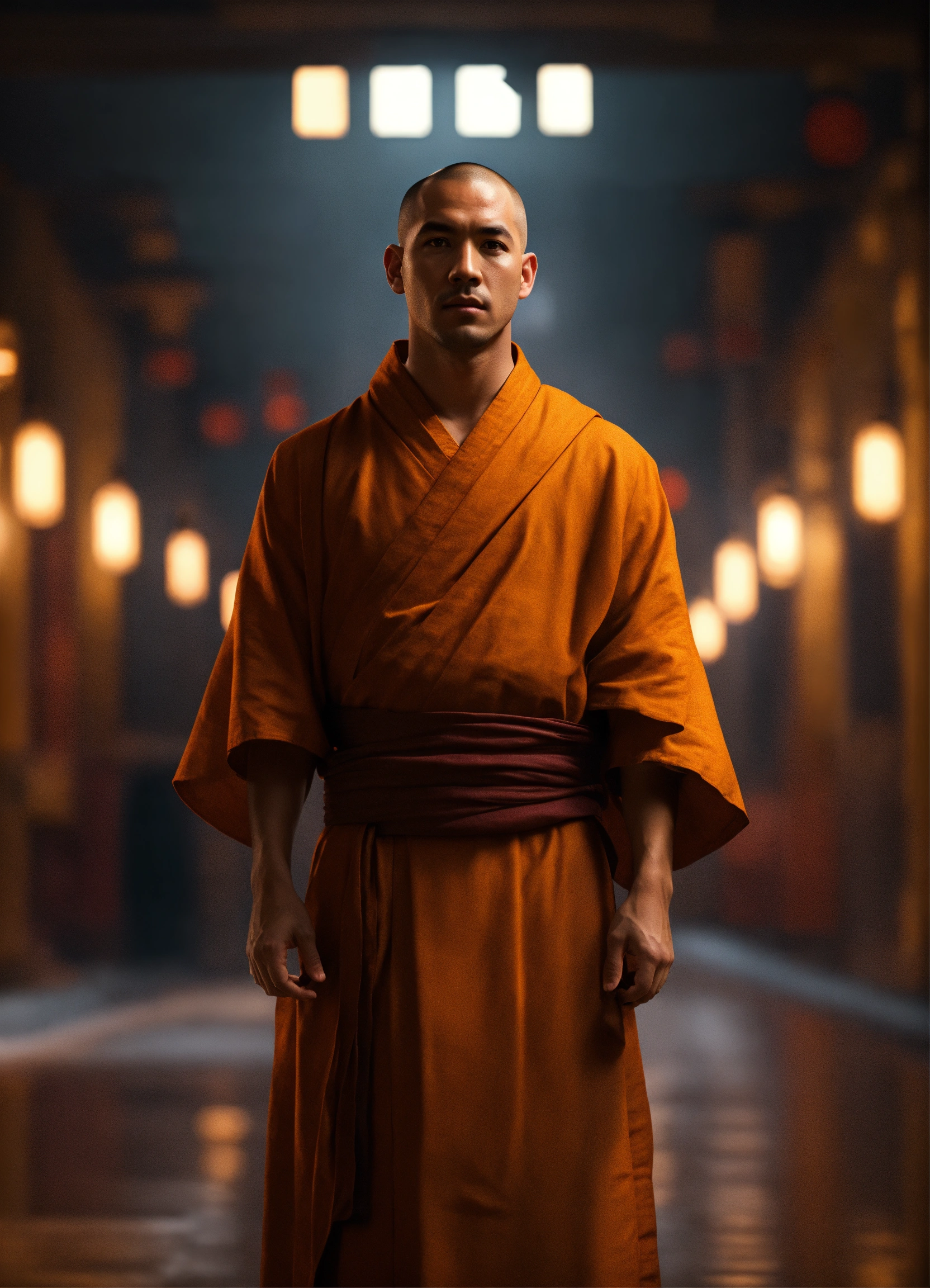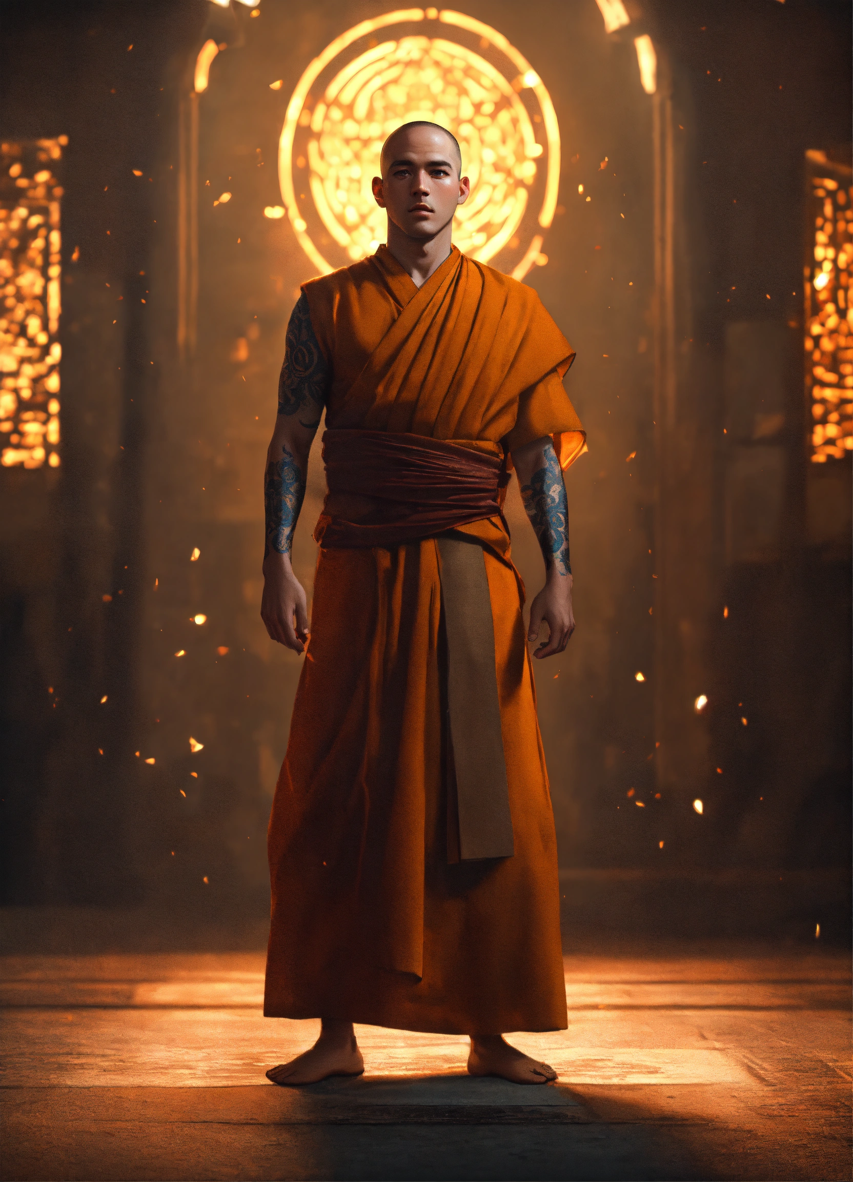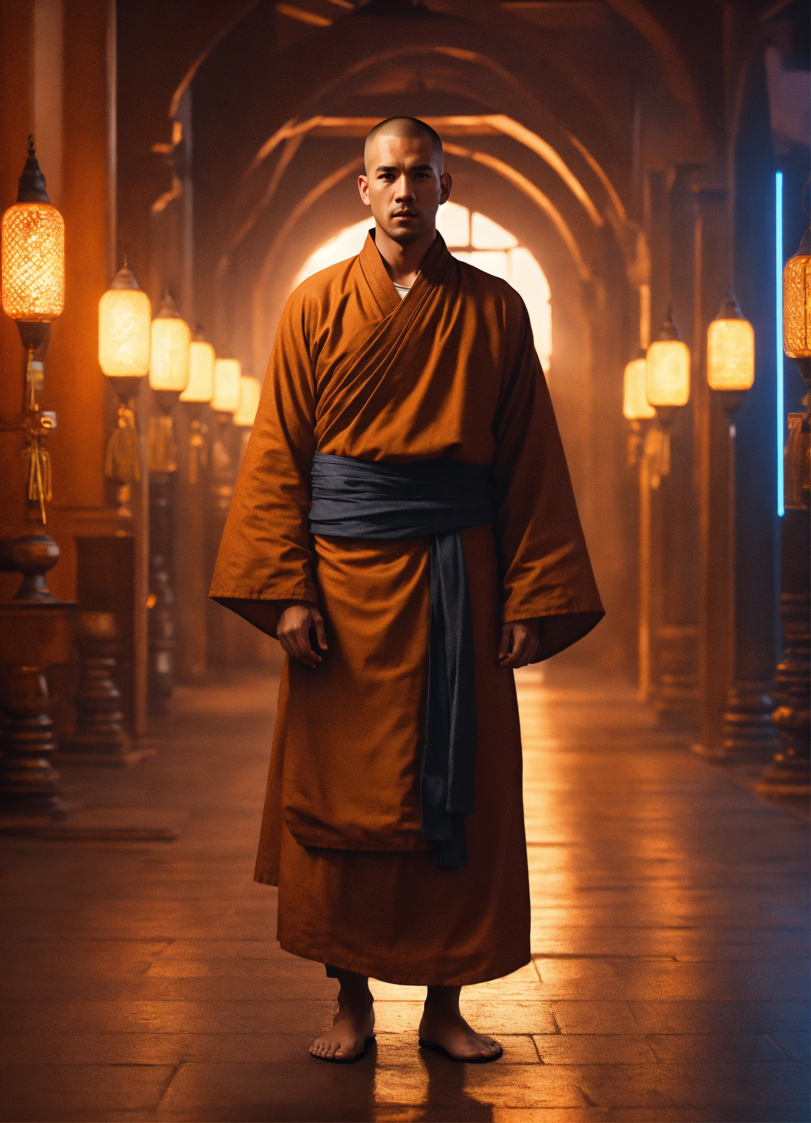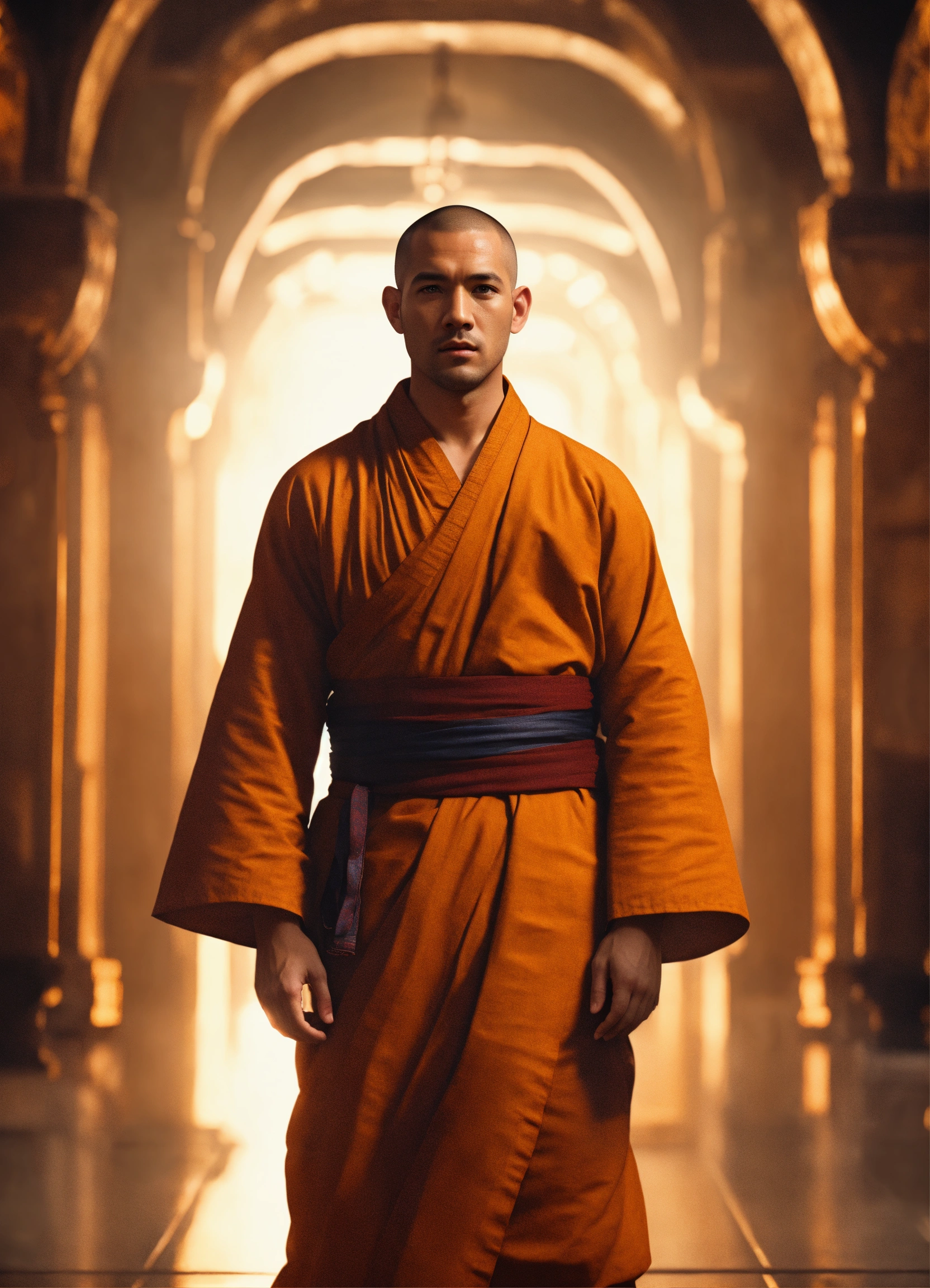 A realistic full body portrait of a male monk, neutral background, moody, photorealistic, cinematic scene, super detailed, hyper realistic, bright lights, 8 k