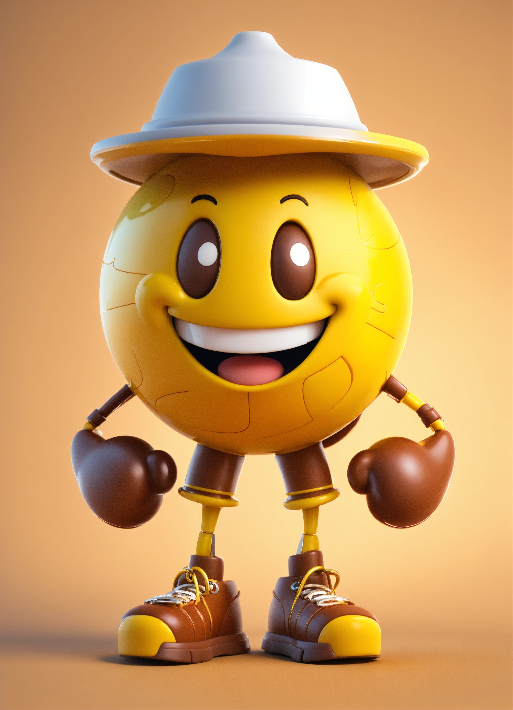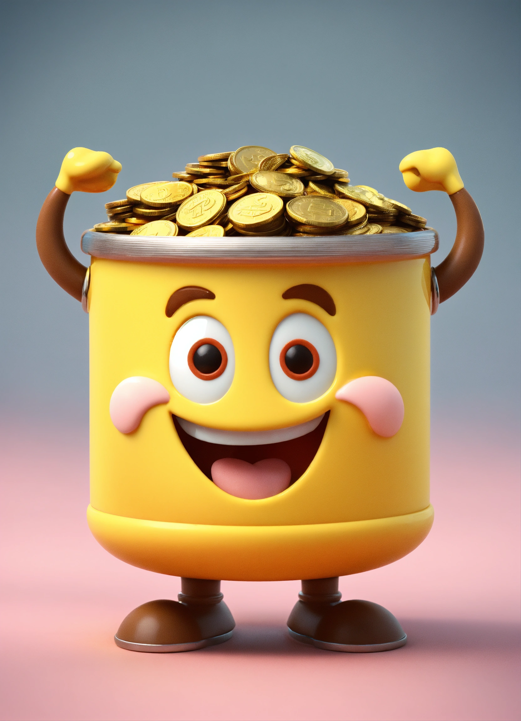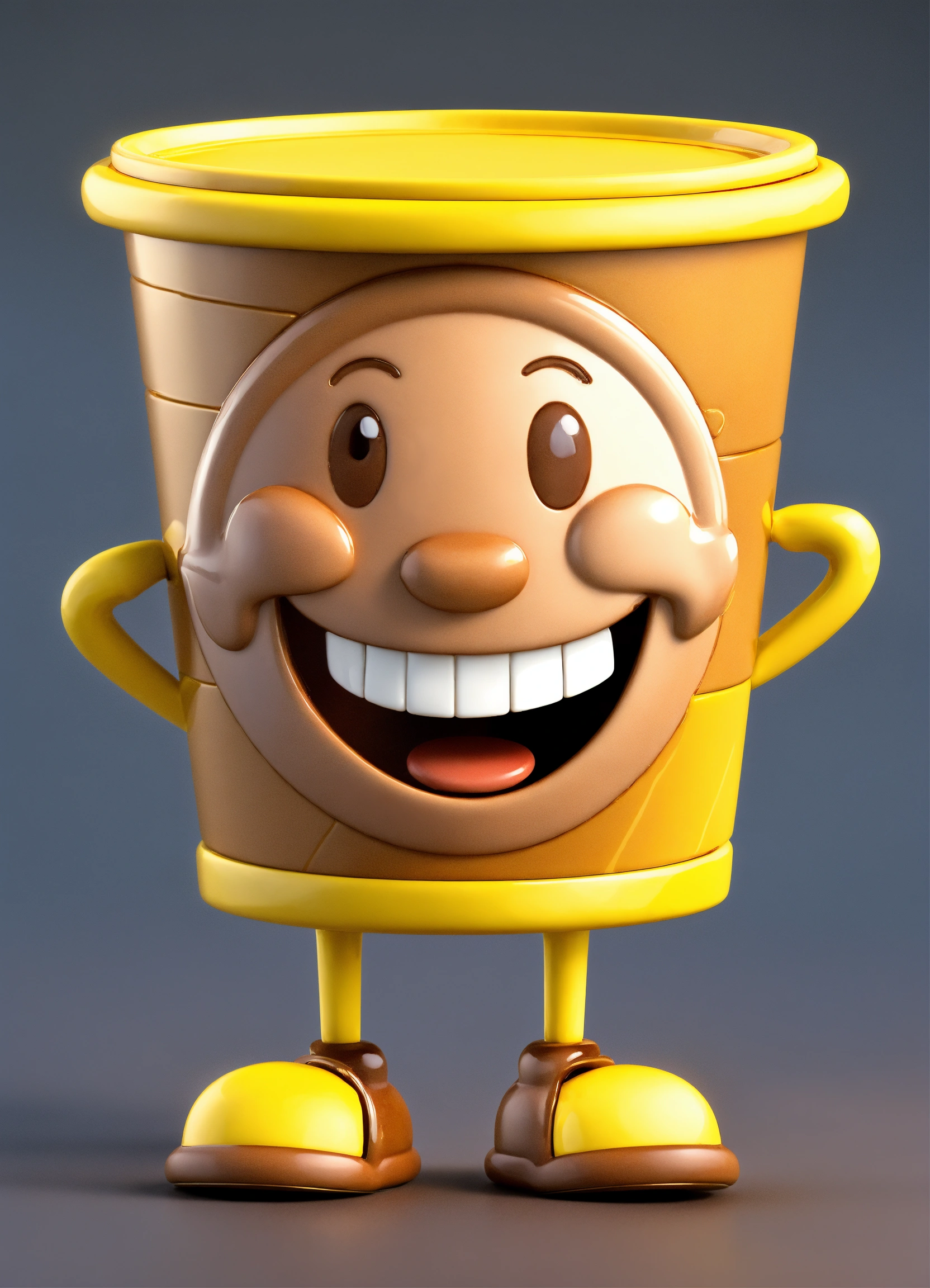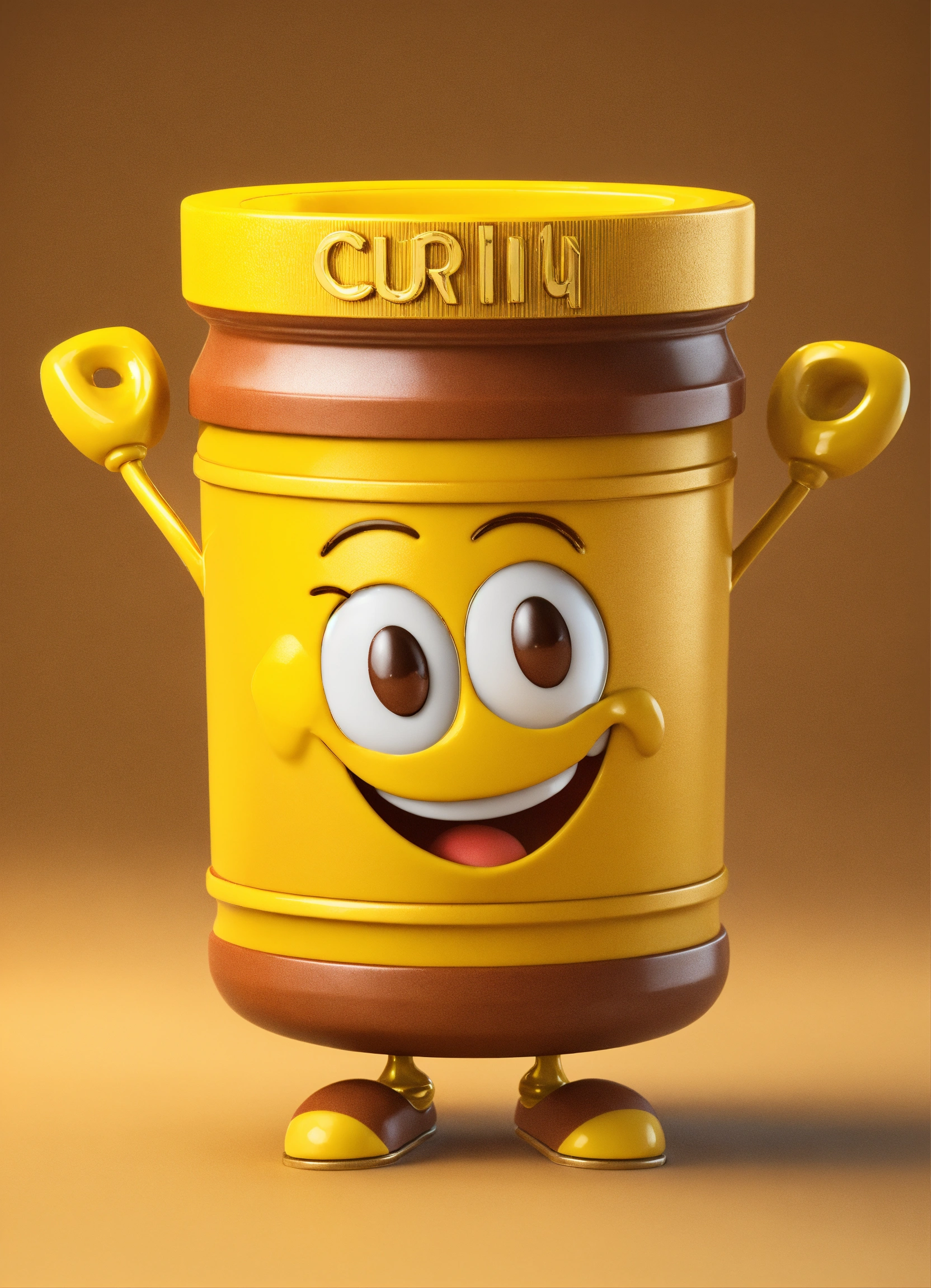 A coin character is a portrait with arms and legs and a smiling face, happy and cute erect yellow and brown name color name is crazycup 3d
