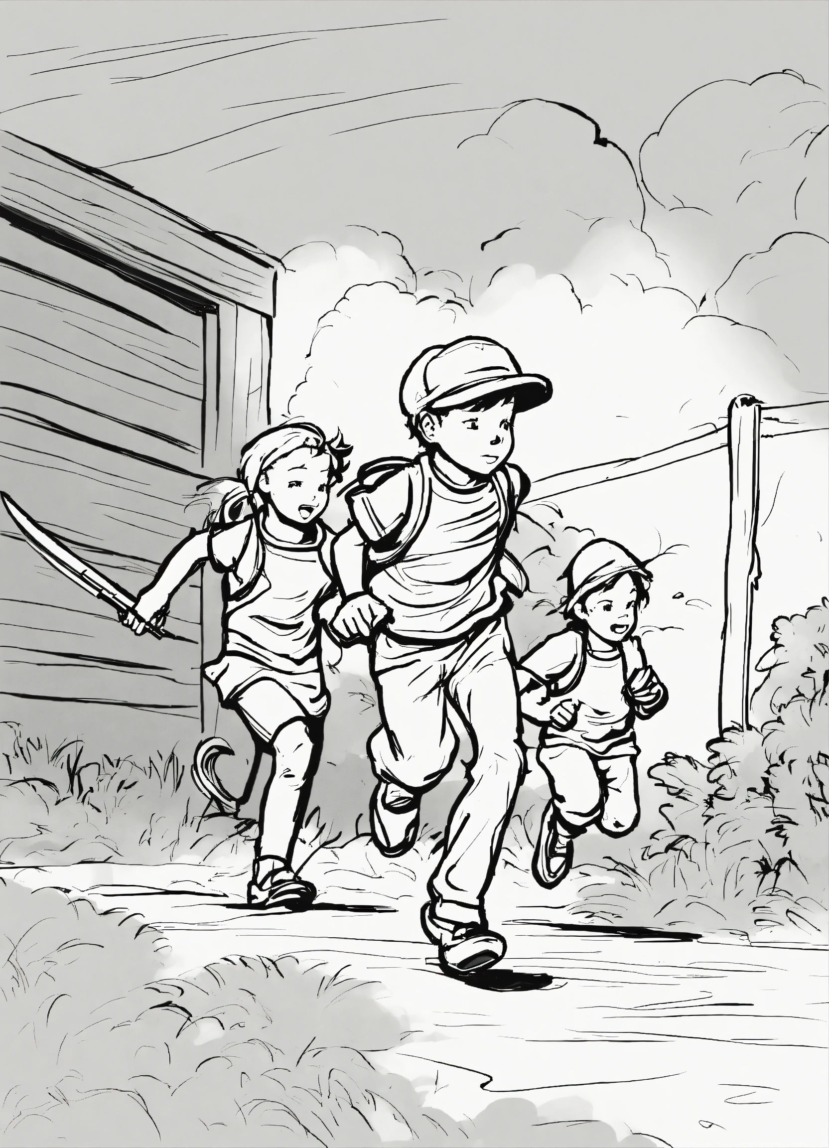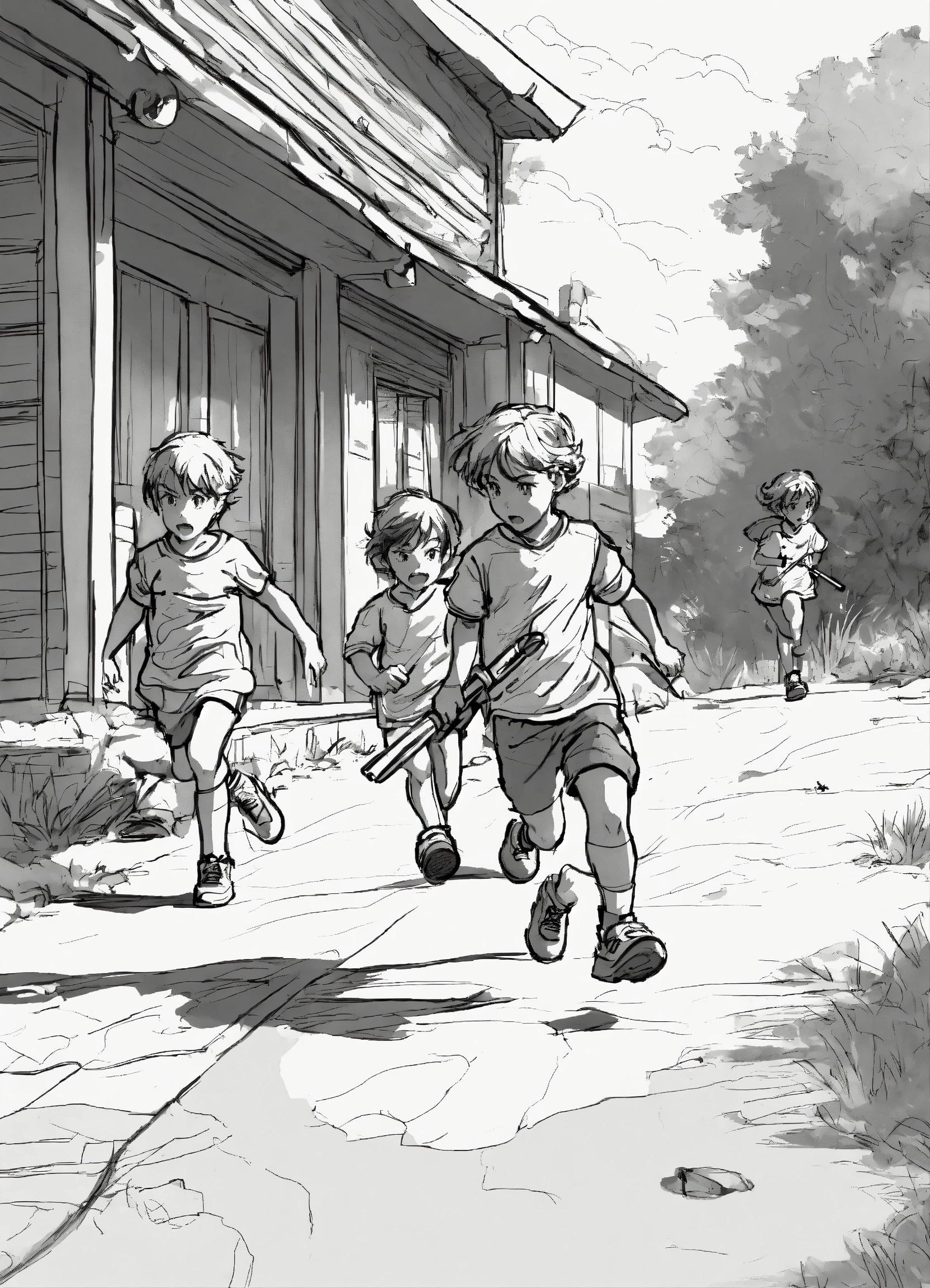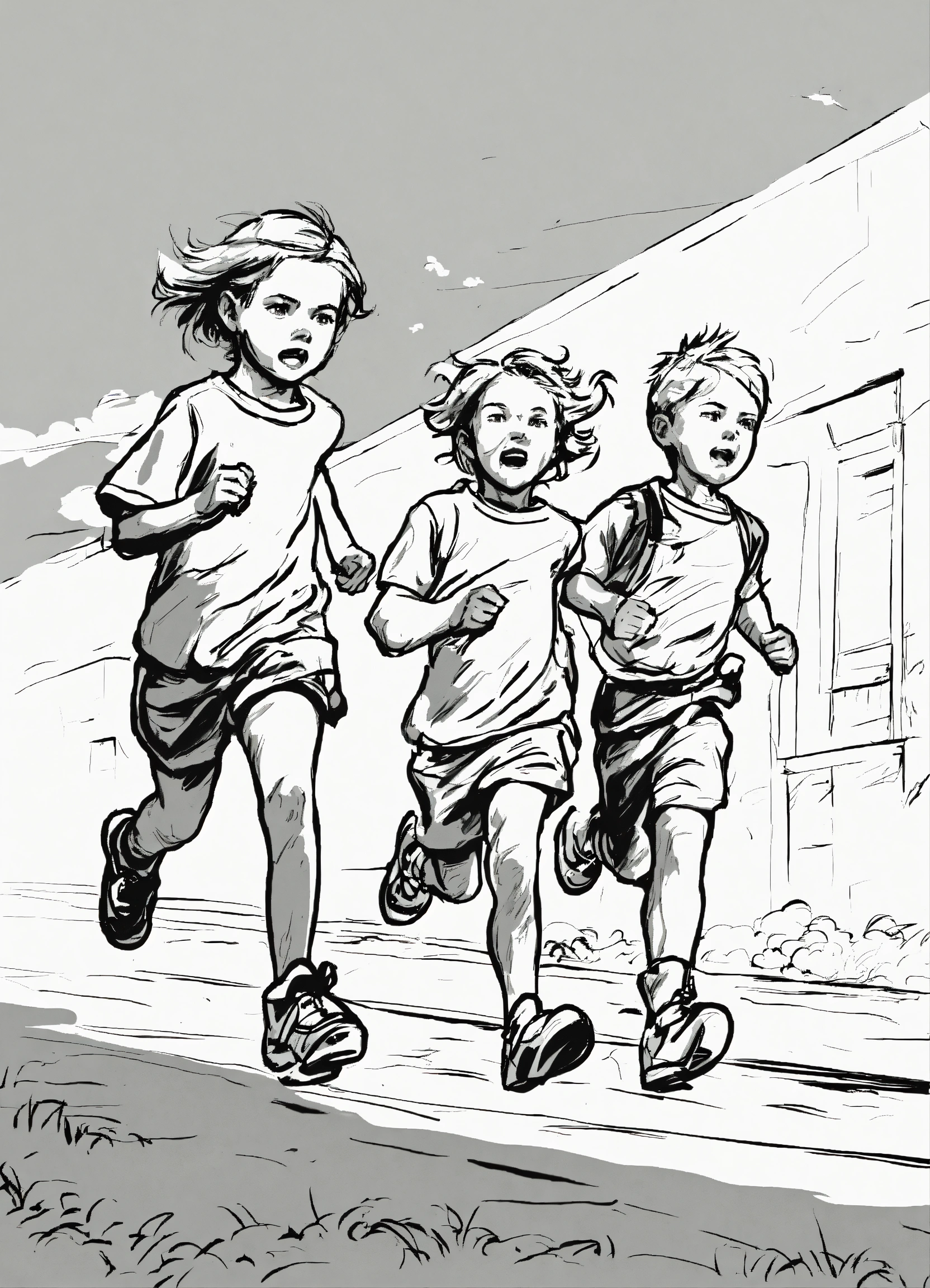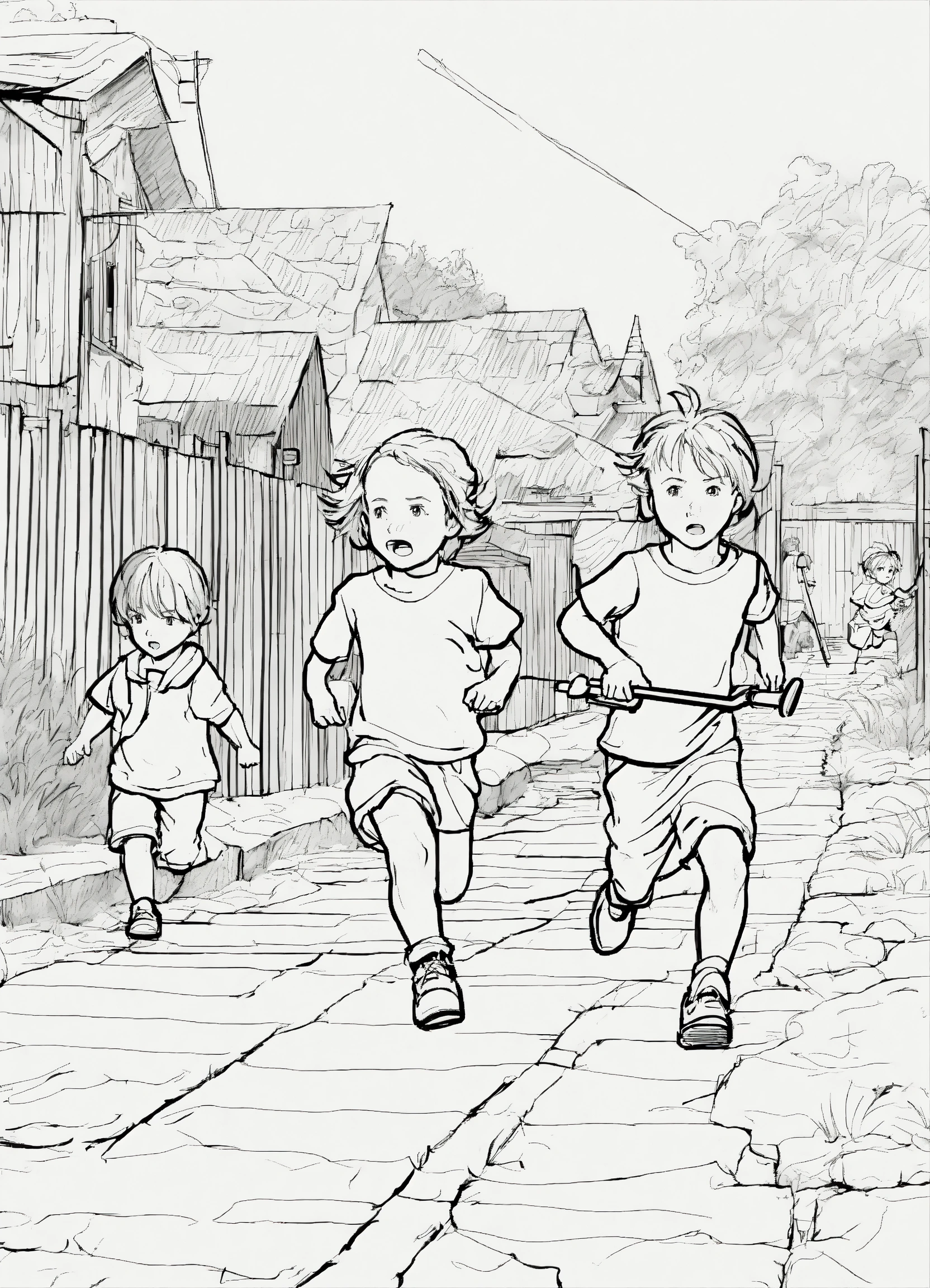A simple line drawing. rough drawing. black and white, unpainted. three children come running with toy weapons.angle from the side.