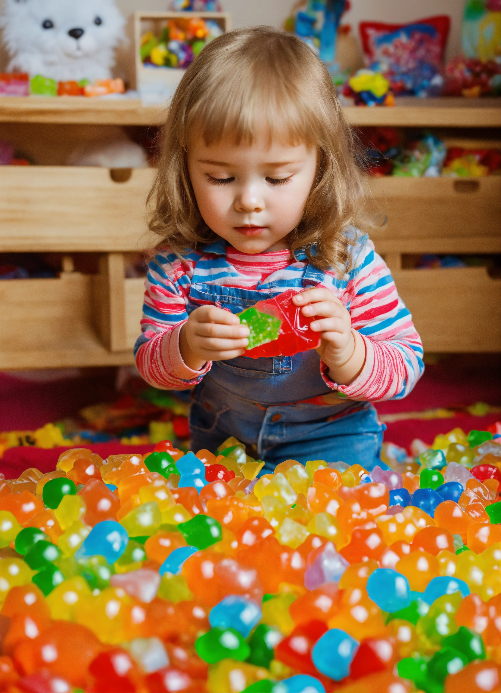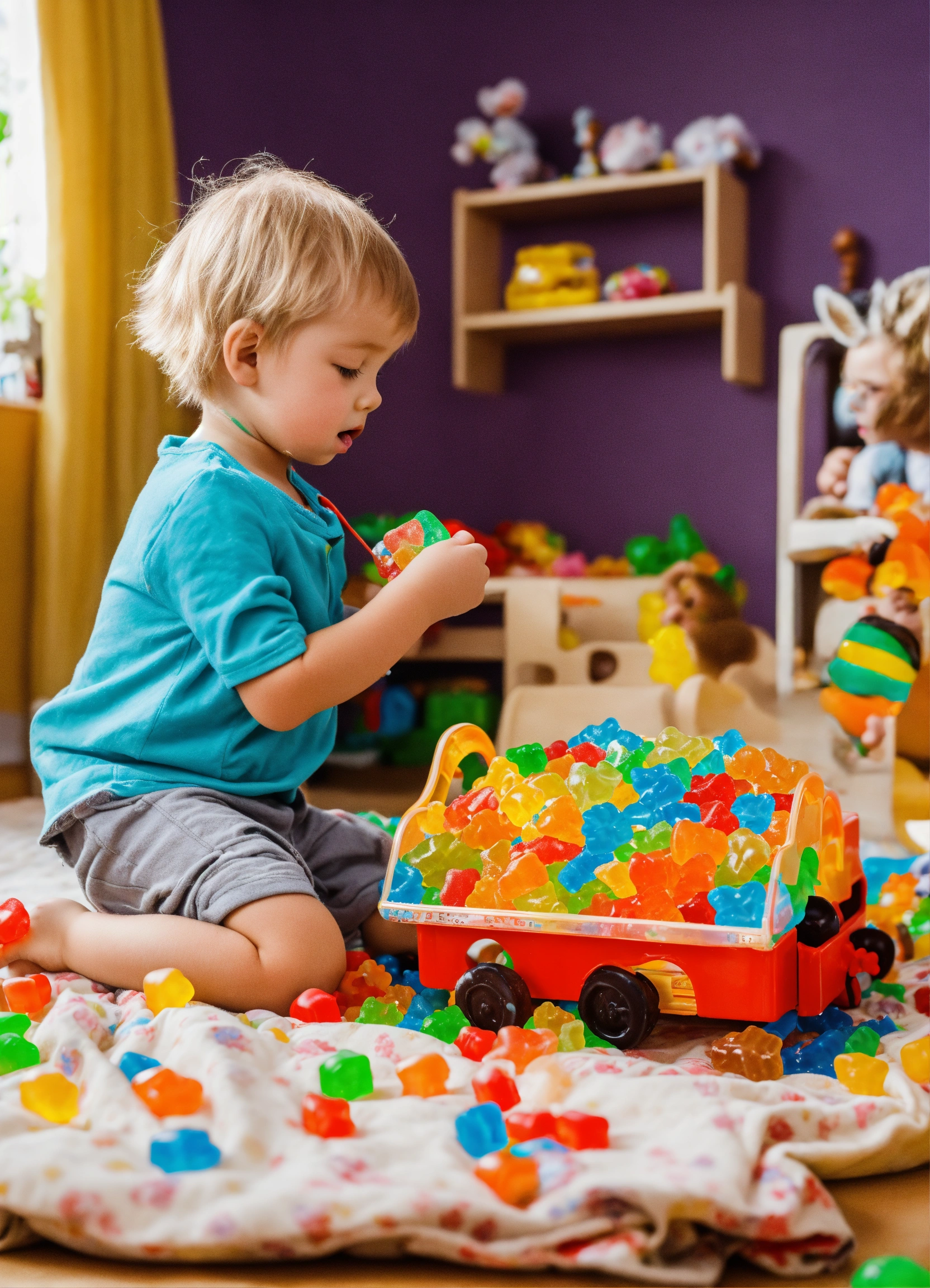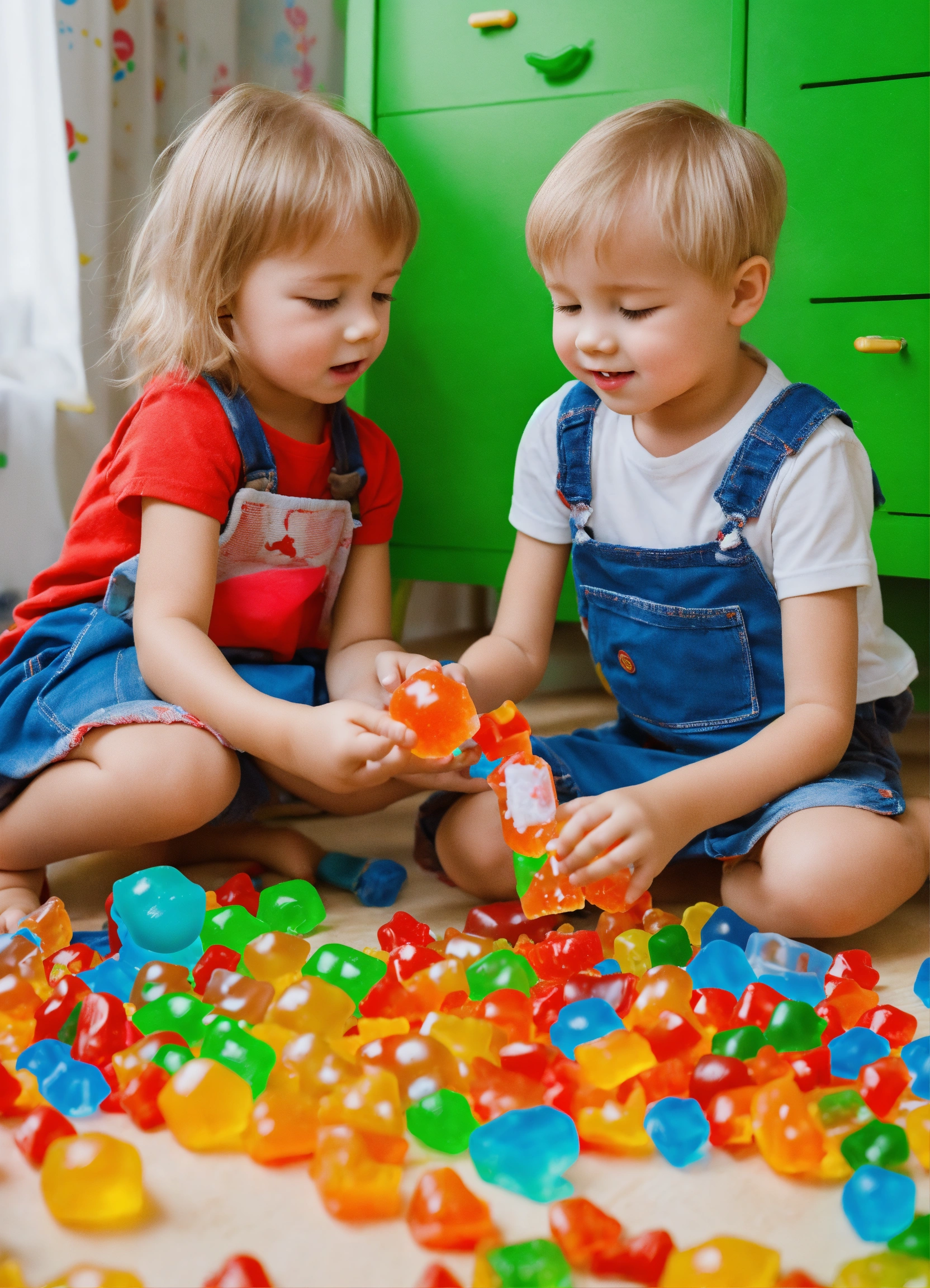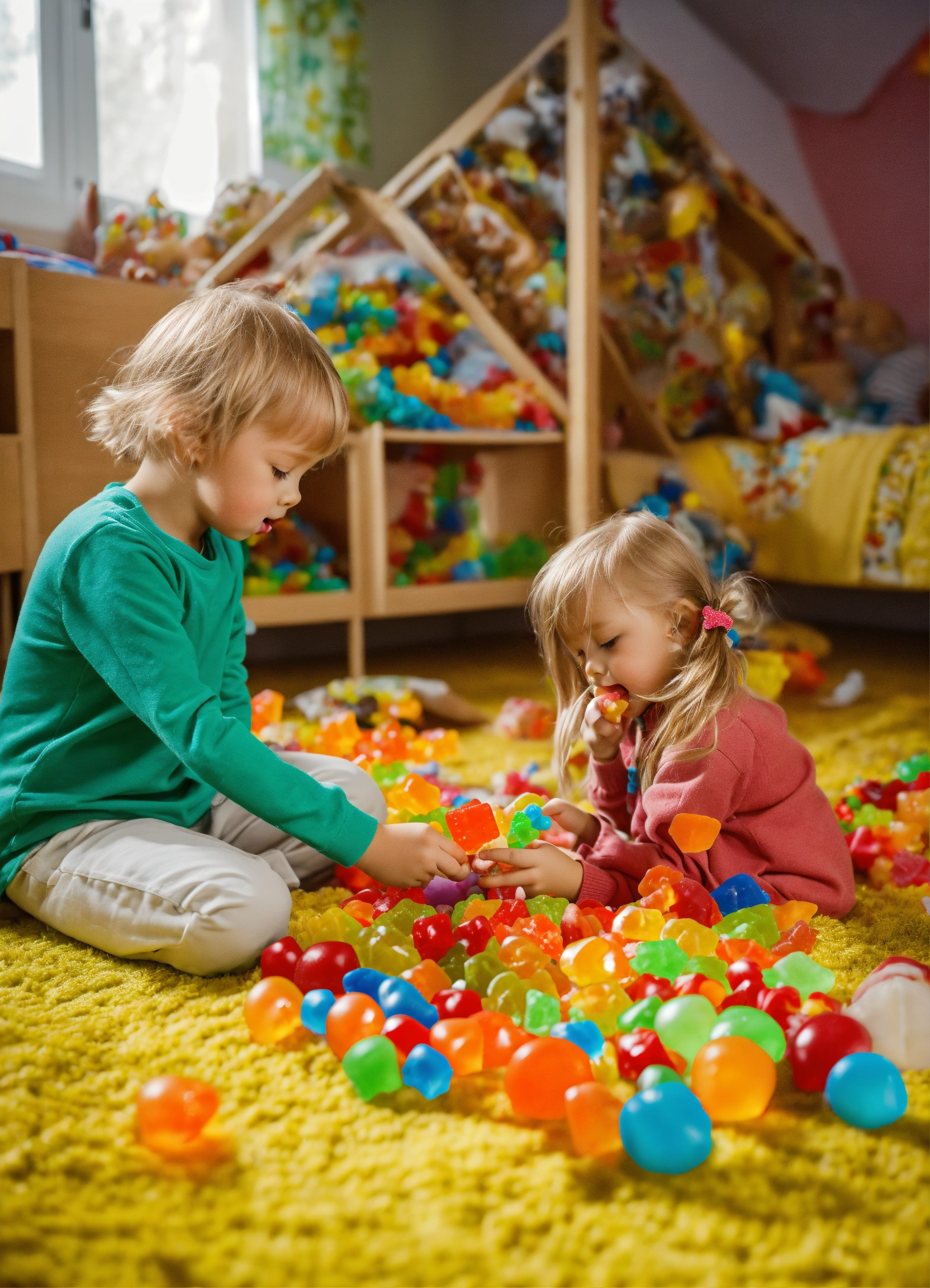 Russian kids boys and girls 5-7 years old play toys and eating gummies candies in kids room