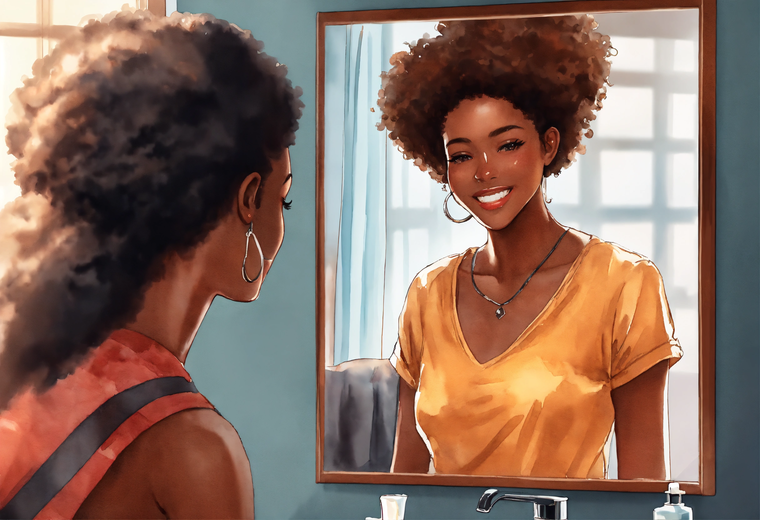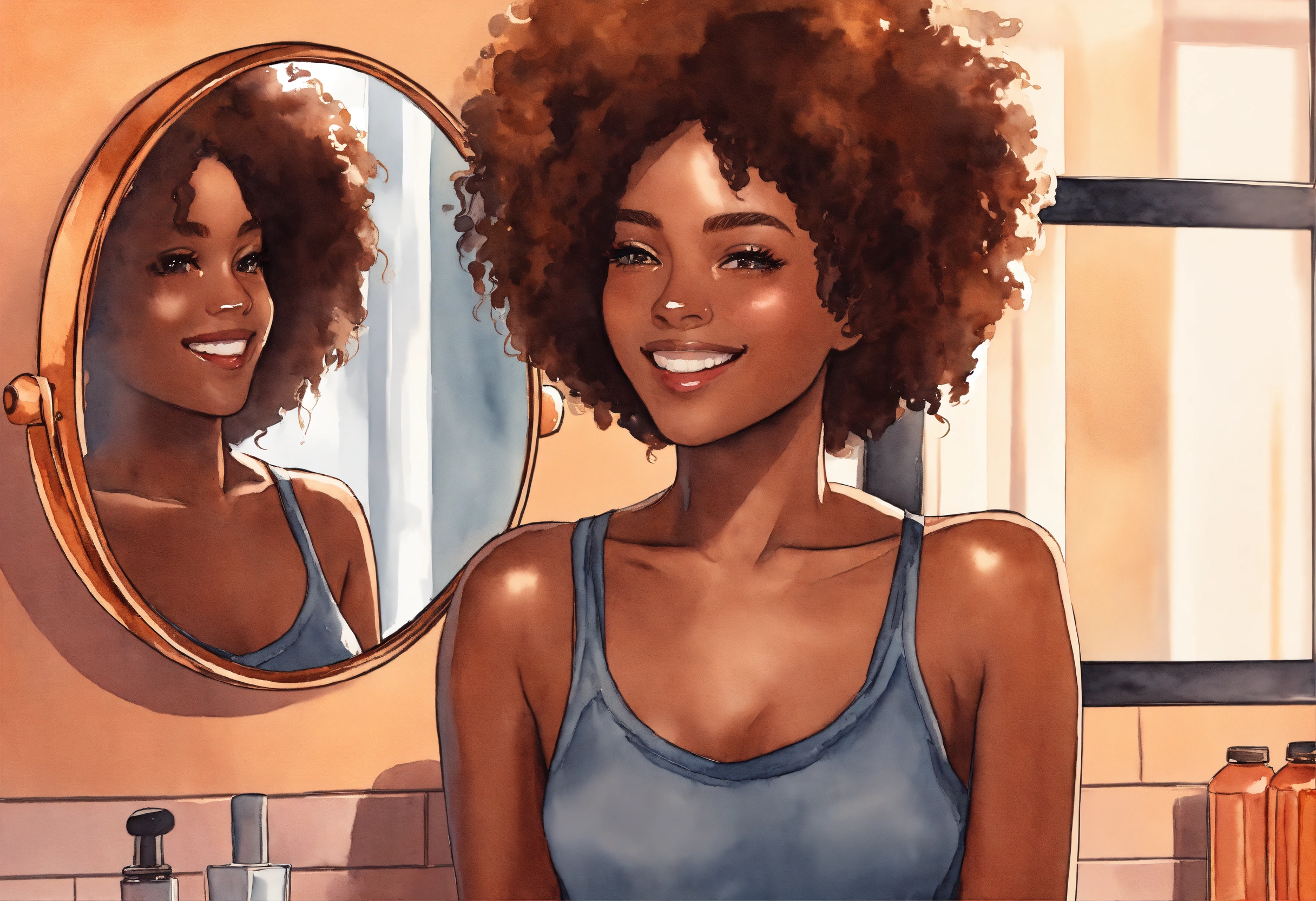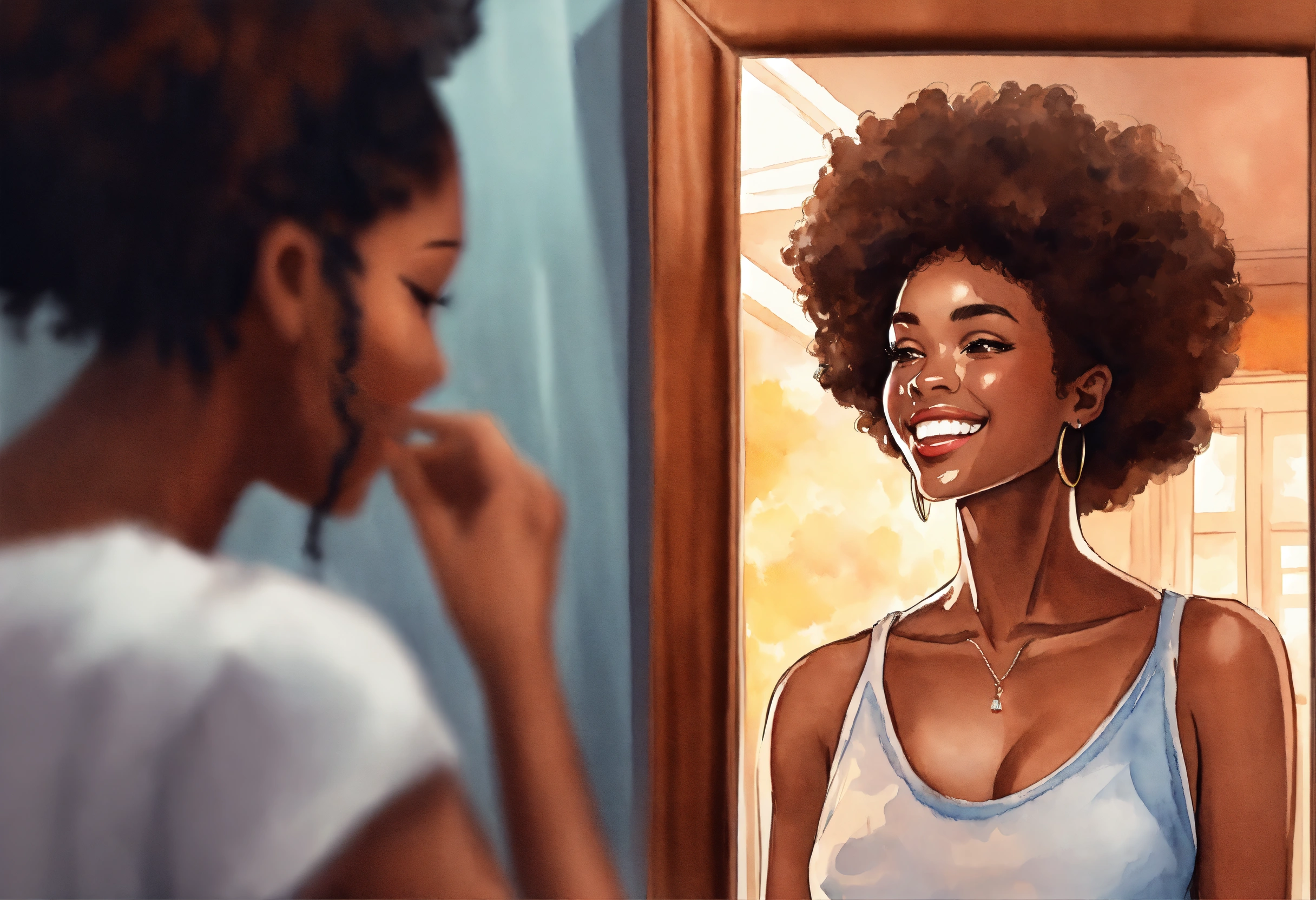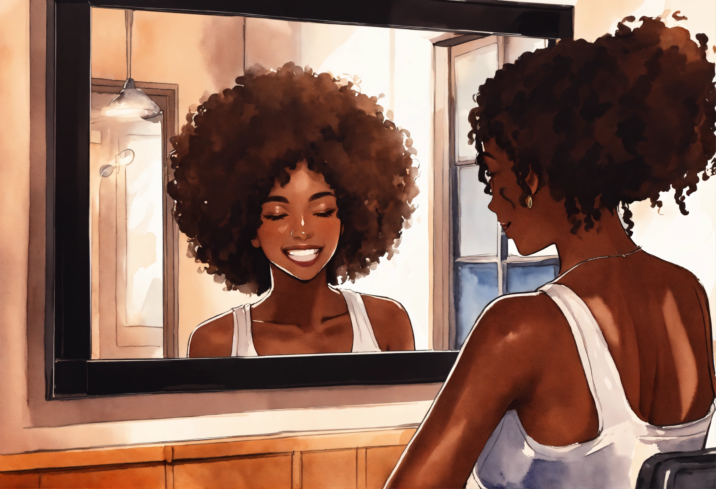 A realistic watercolor painting, 5d, flat vector faceless illustration, extreme close, urban brown skin woman, smiling at herself in the mirror admiring her kinky coily hair. mirror reflection. manga. black character.