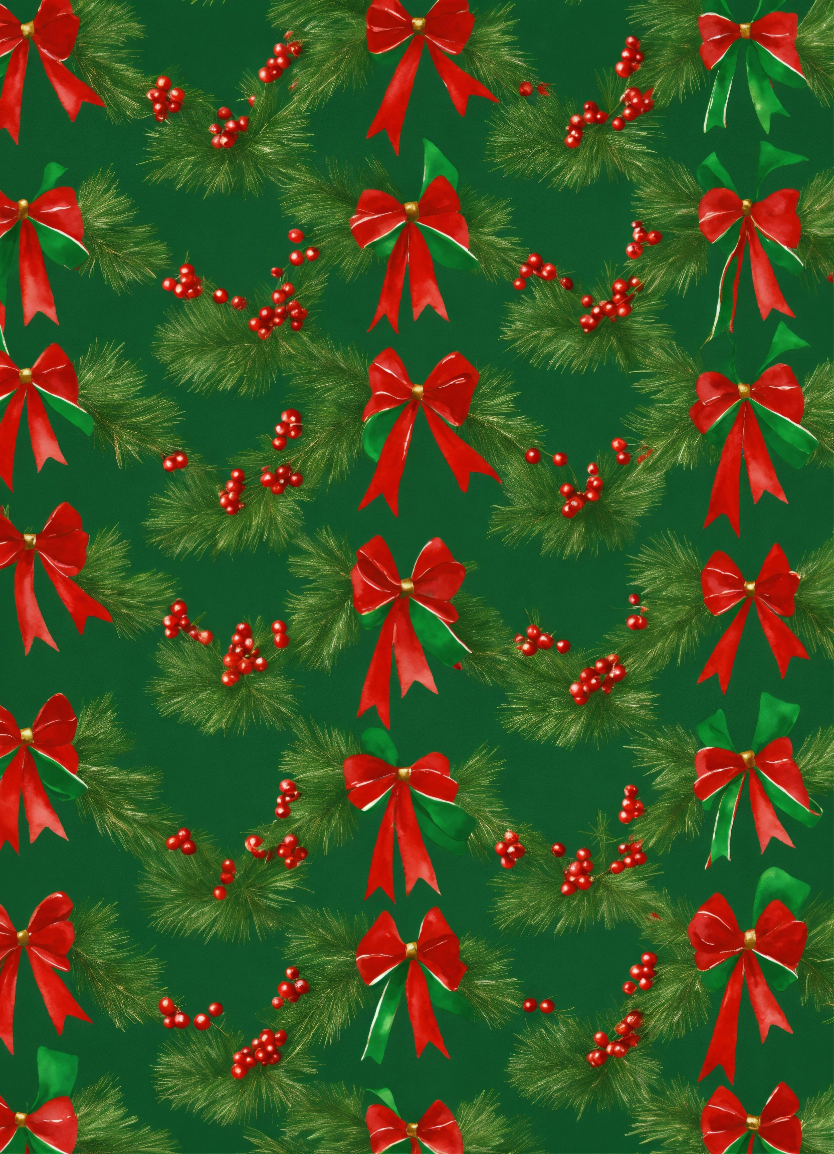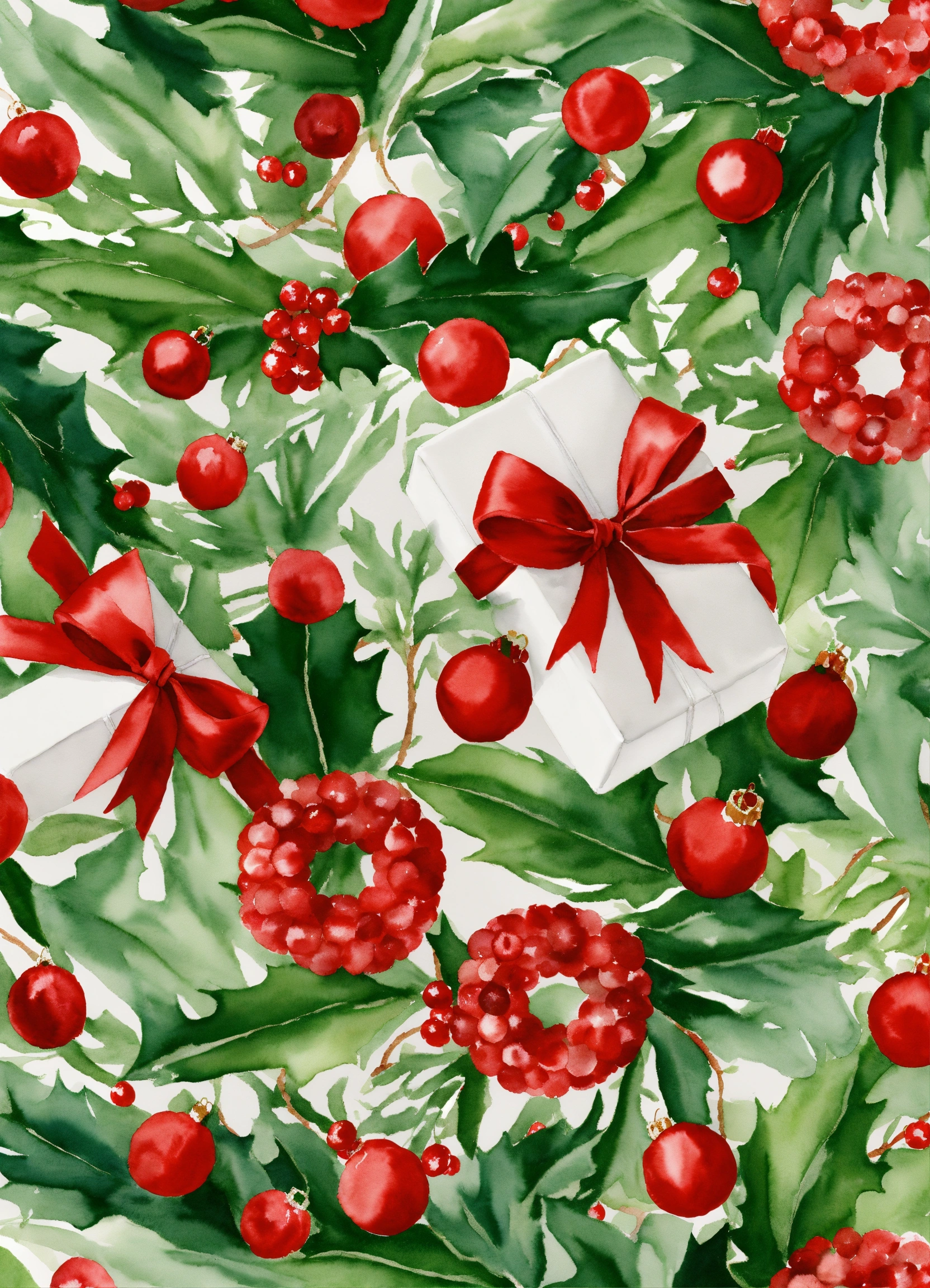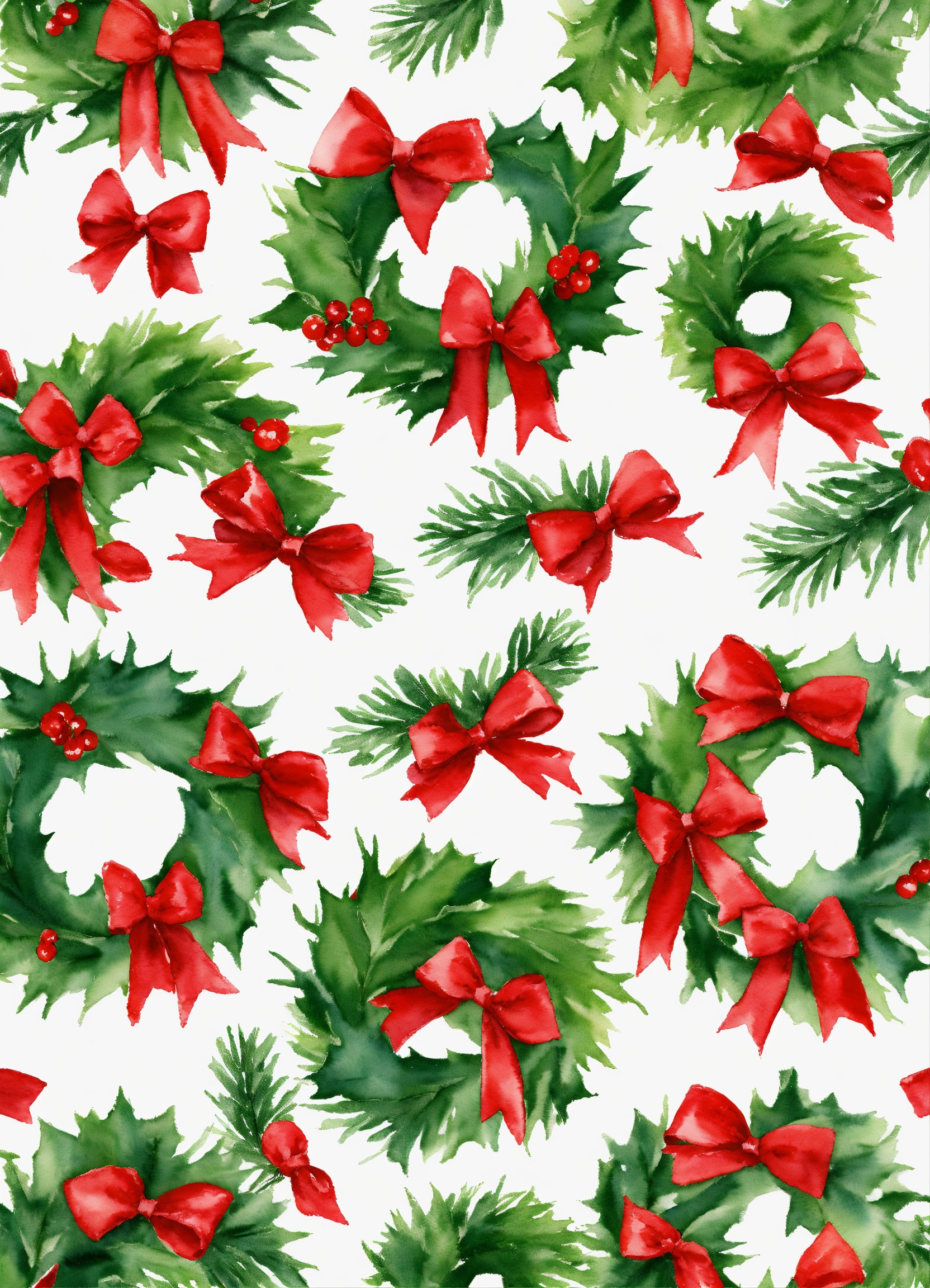 Design prompt for christmas gift wrap paper inspired by a white background adorned with watercolor green christmas small wreaths, each featuring red bows and holly berries. the design should exude simplicity and elegance, making it suitable for a wide range of gift-giving occasions. describe the design's versatility and its potential to enhance the presentation of gifts for friends, family, coworkers, and individuals of all ages and genders.