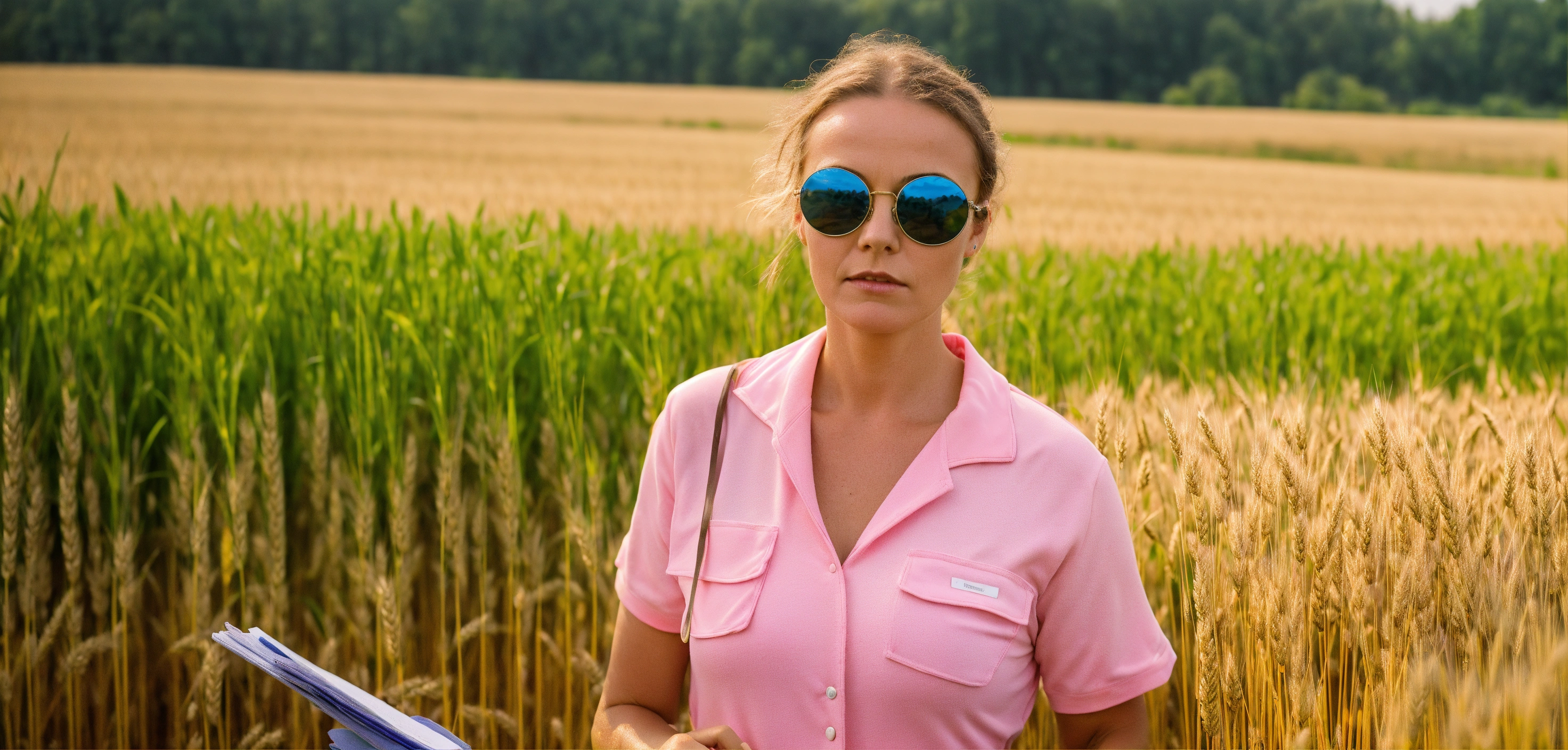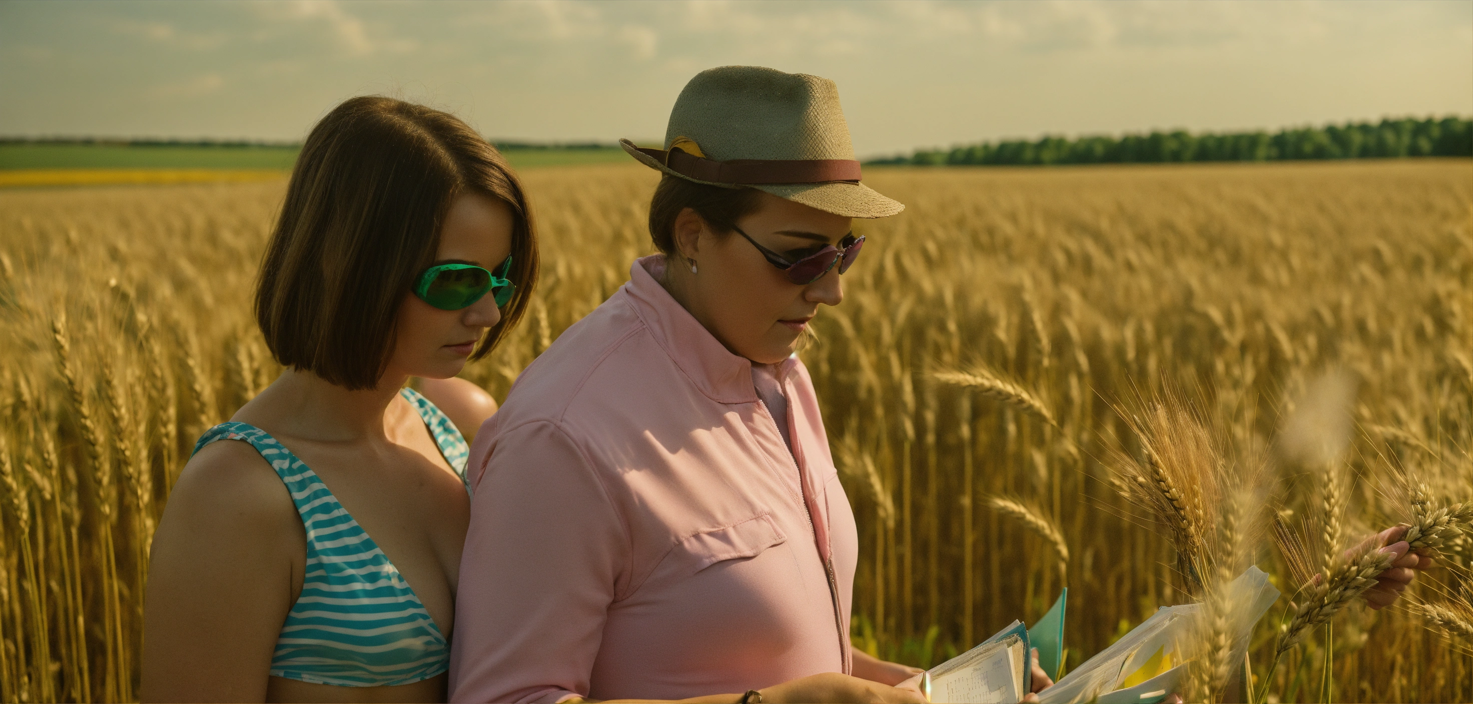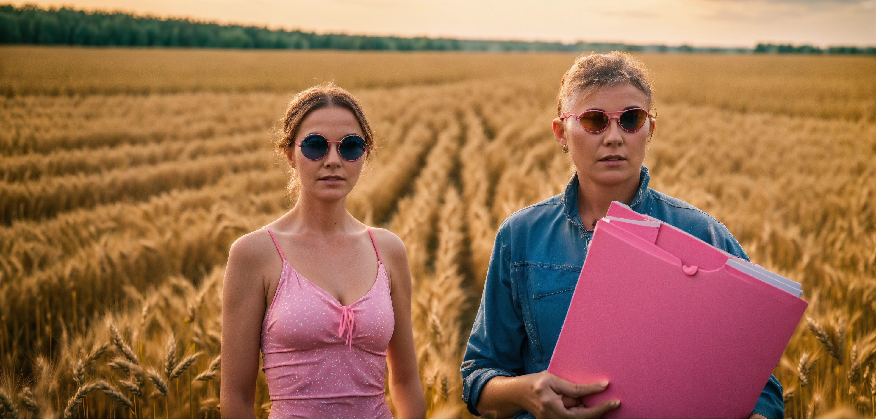 60 years old farmer standing with young lady 20 years old in a pink swimming suit and round sunglasses in a field of wheat in ukraine, looking field records with piles of folders on the ground all over the place