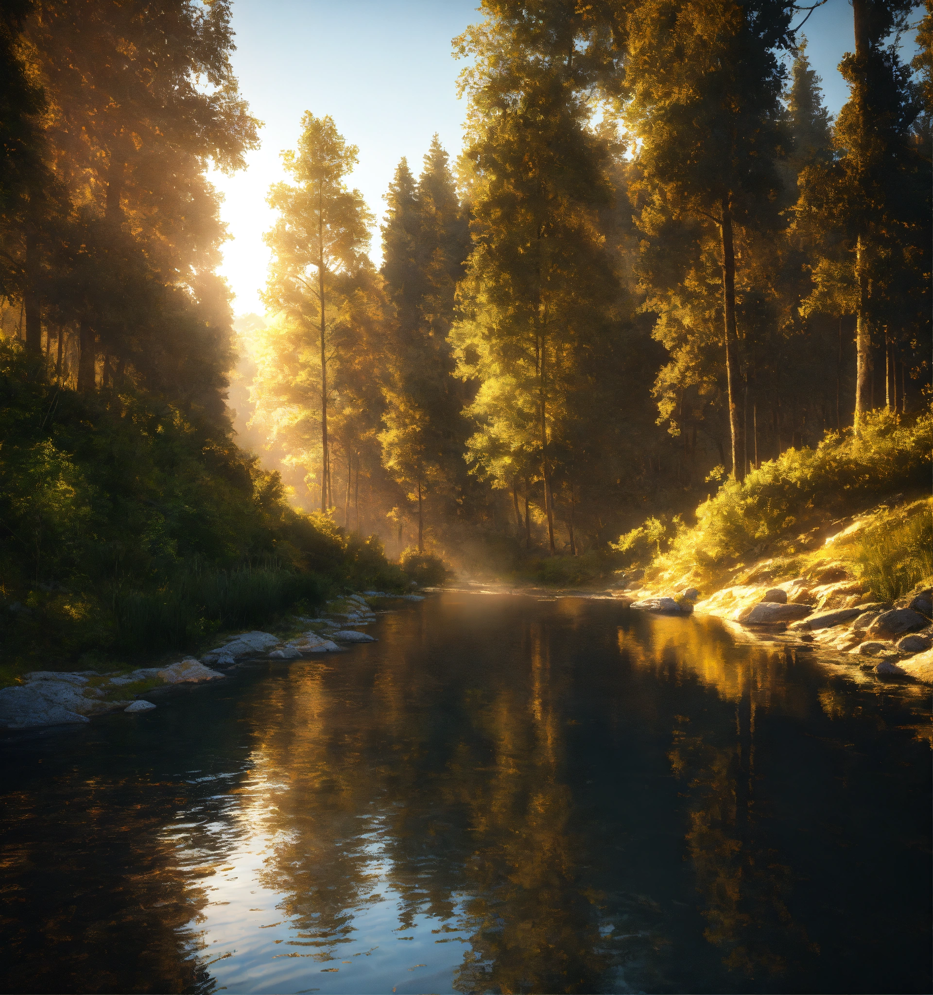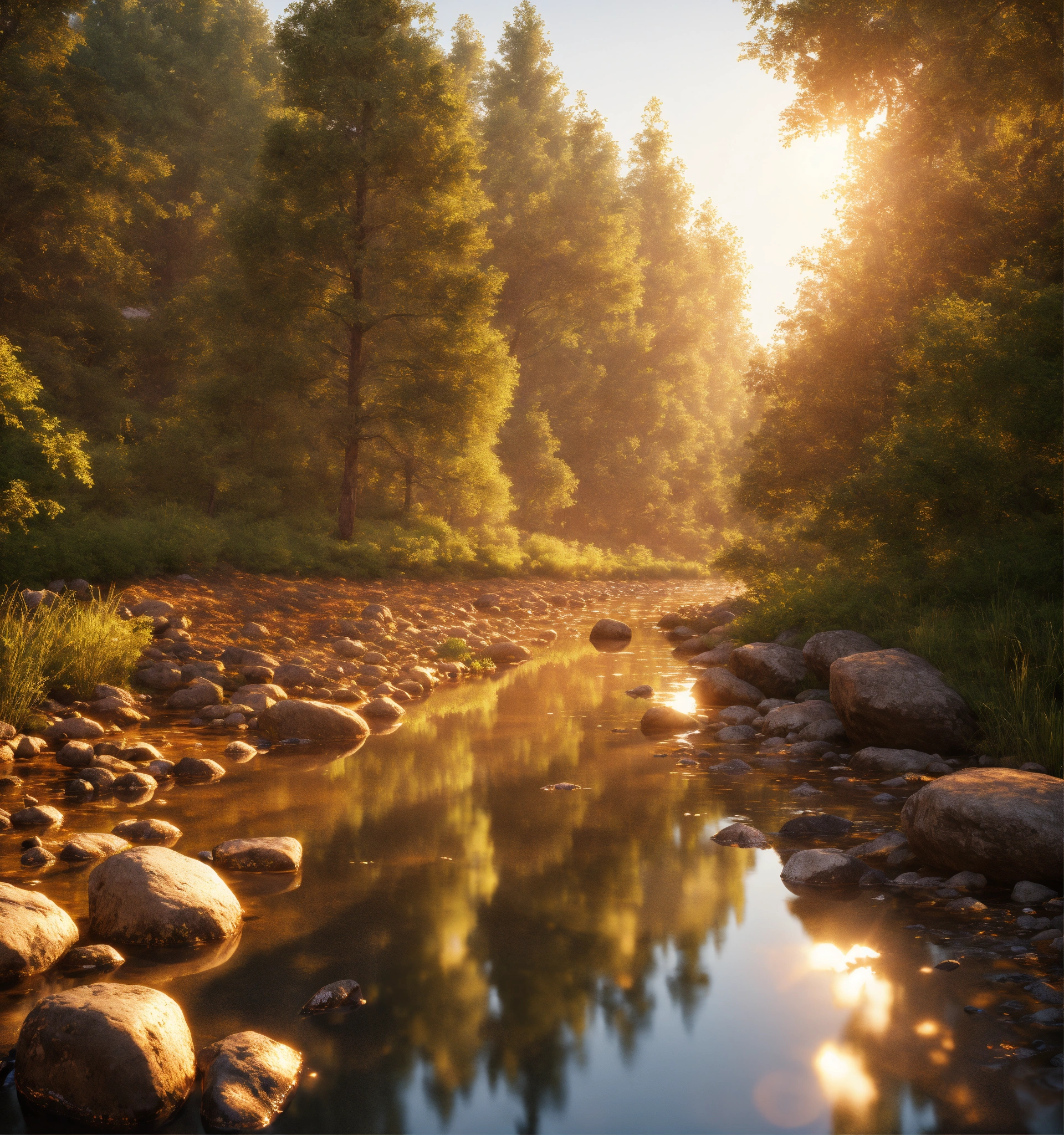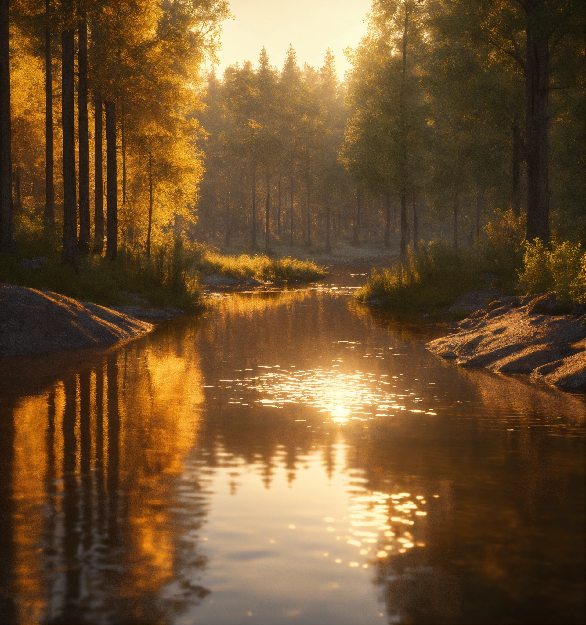River in a forest, golden hour, ray tracing reflection, 8 k, hyper realistic, insainly detailed, hdr, octan render