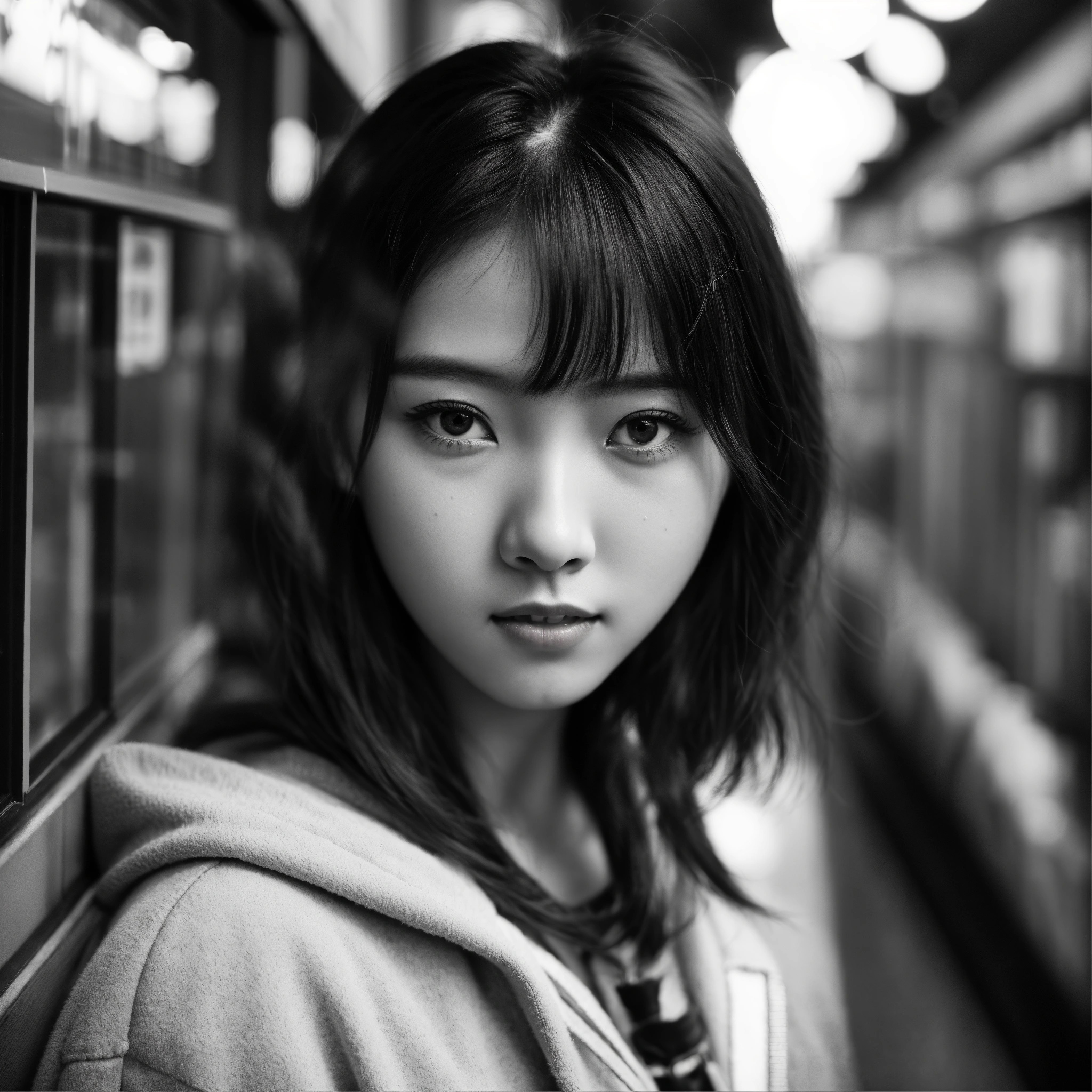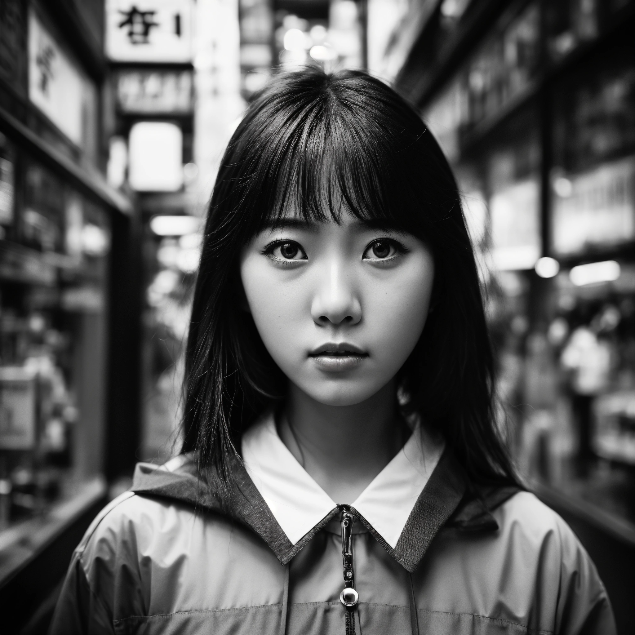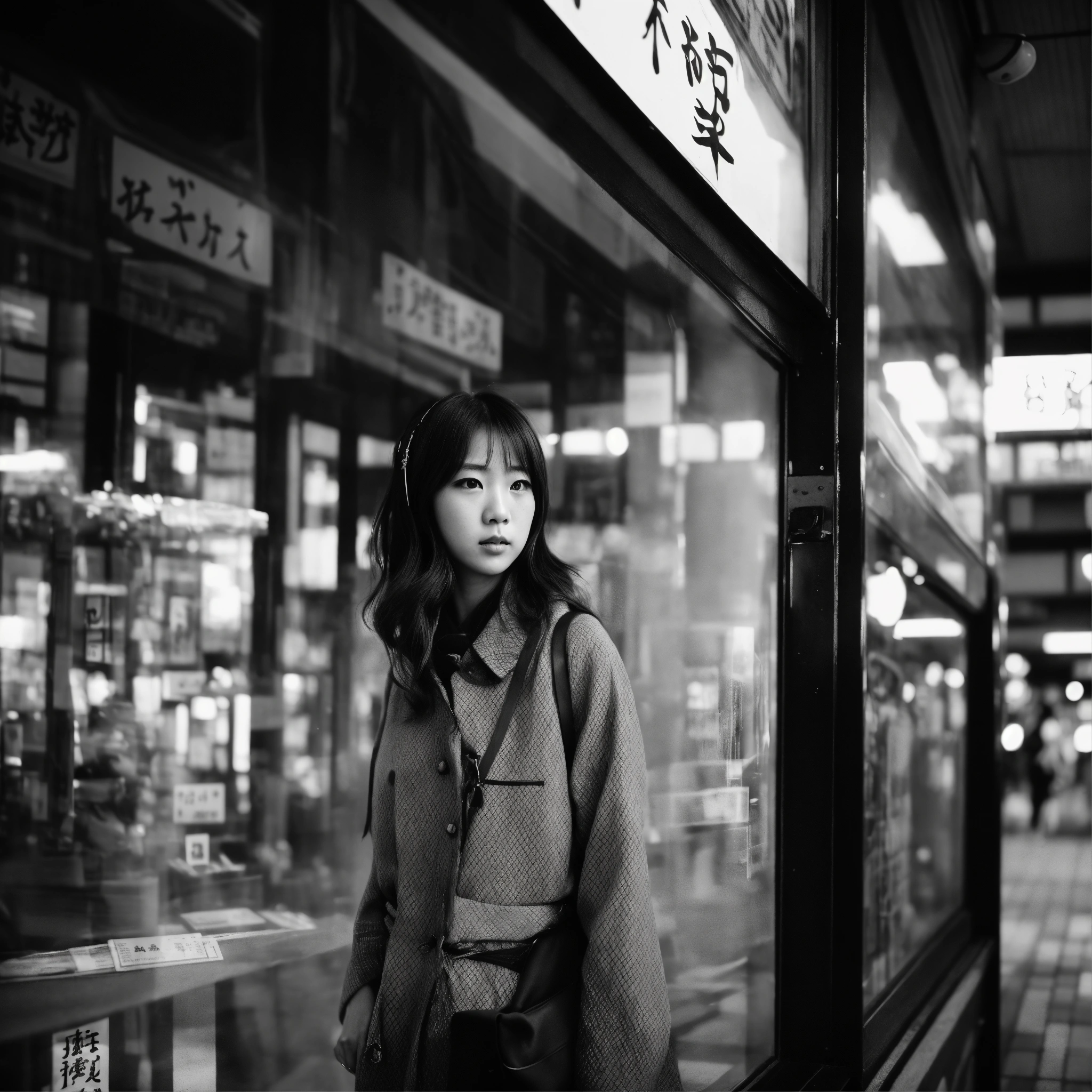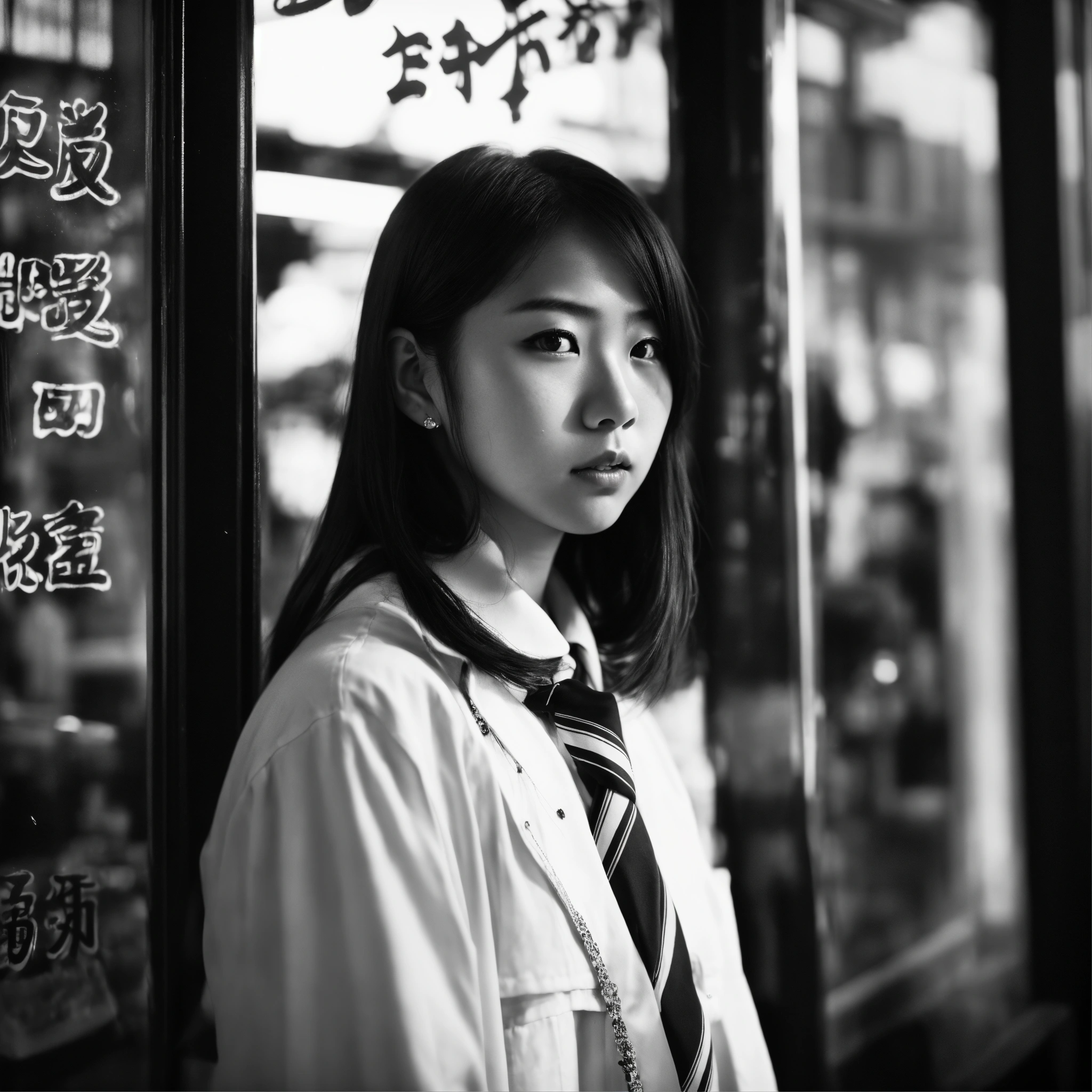 Detailed black-and-white photographs, set in the midst of a bustling japanese urban environment, with the reflections of show windows creating a unique and special visual effect. the portrait of beautiful japanese high school girl, her expression does not reveal any emotion.