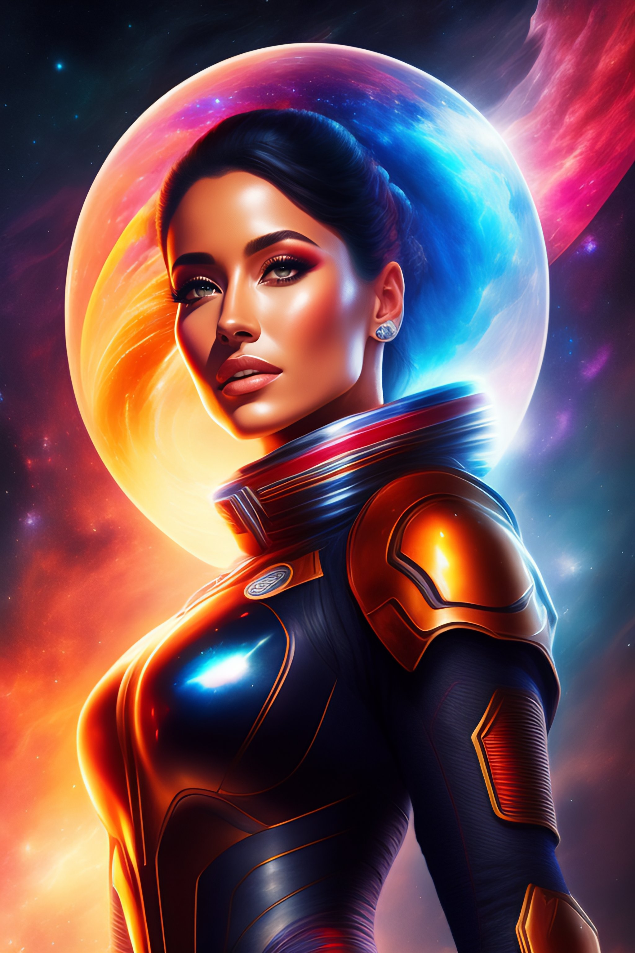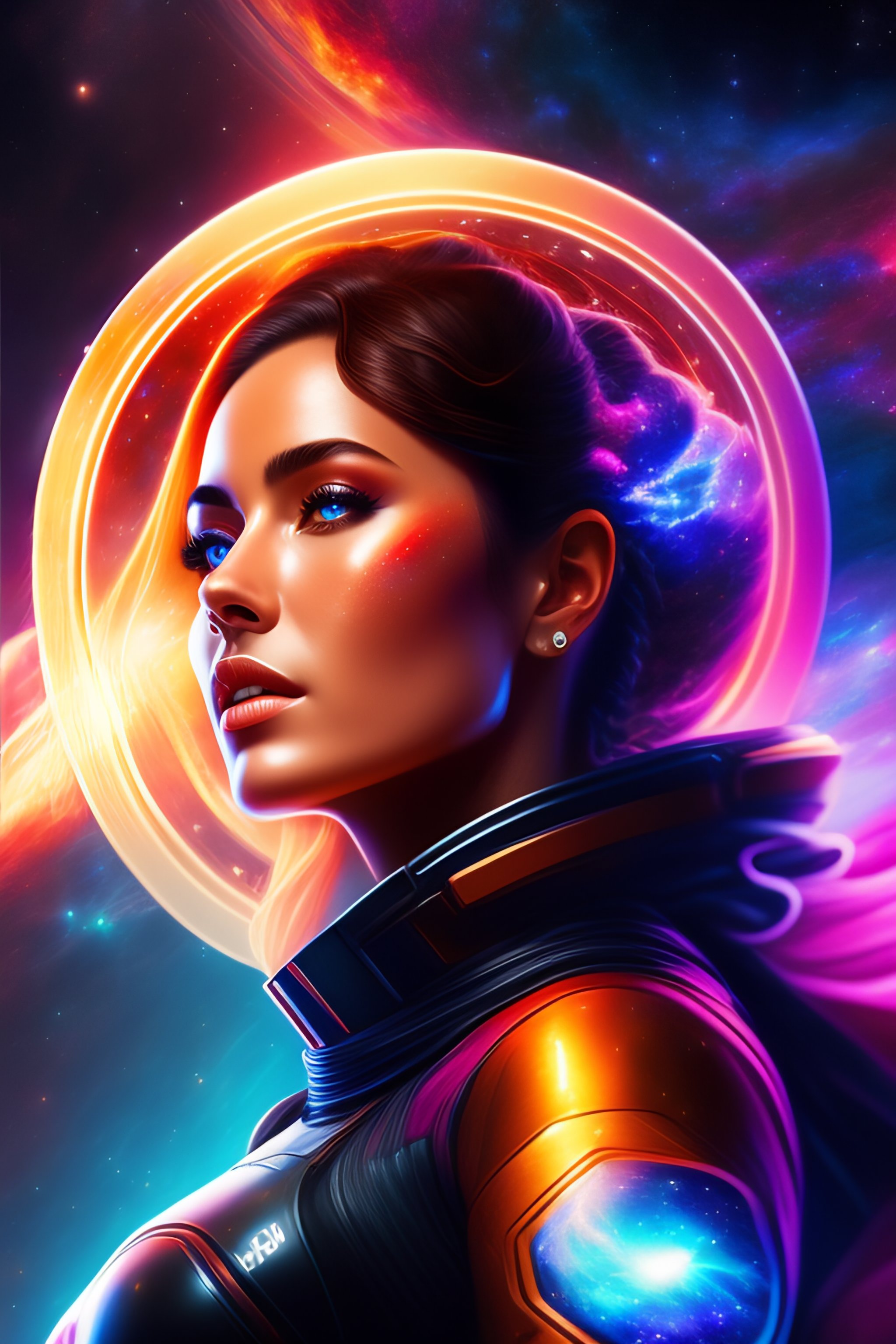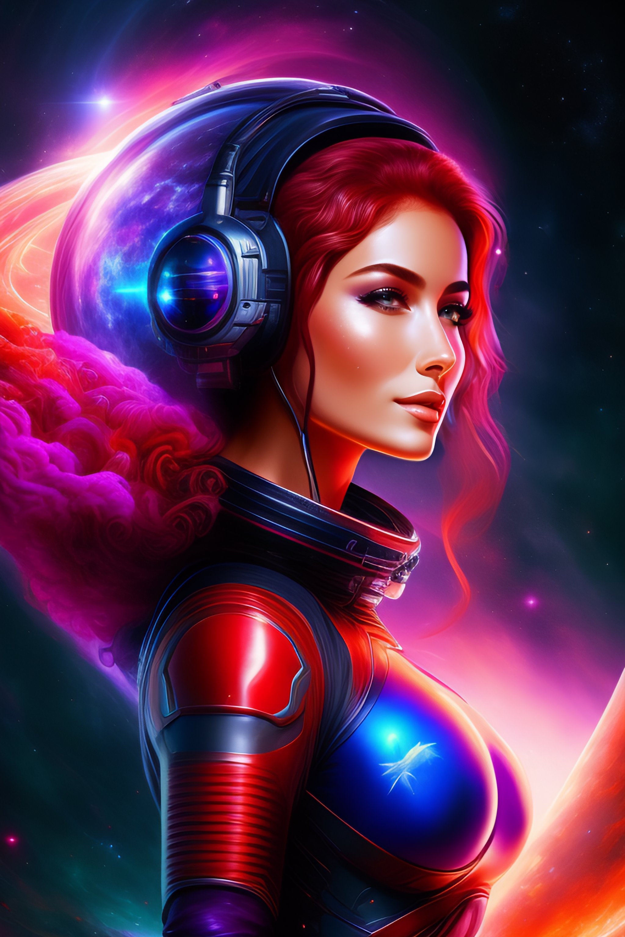 Complete body is in the picture, of a beautiful woman surrounded by space and nebulas, actionphoto of beautiful young hot spacegirl, stargate, some red water, the future of 2300, highly detailed, artstation, illustration, sylvari portrait