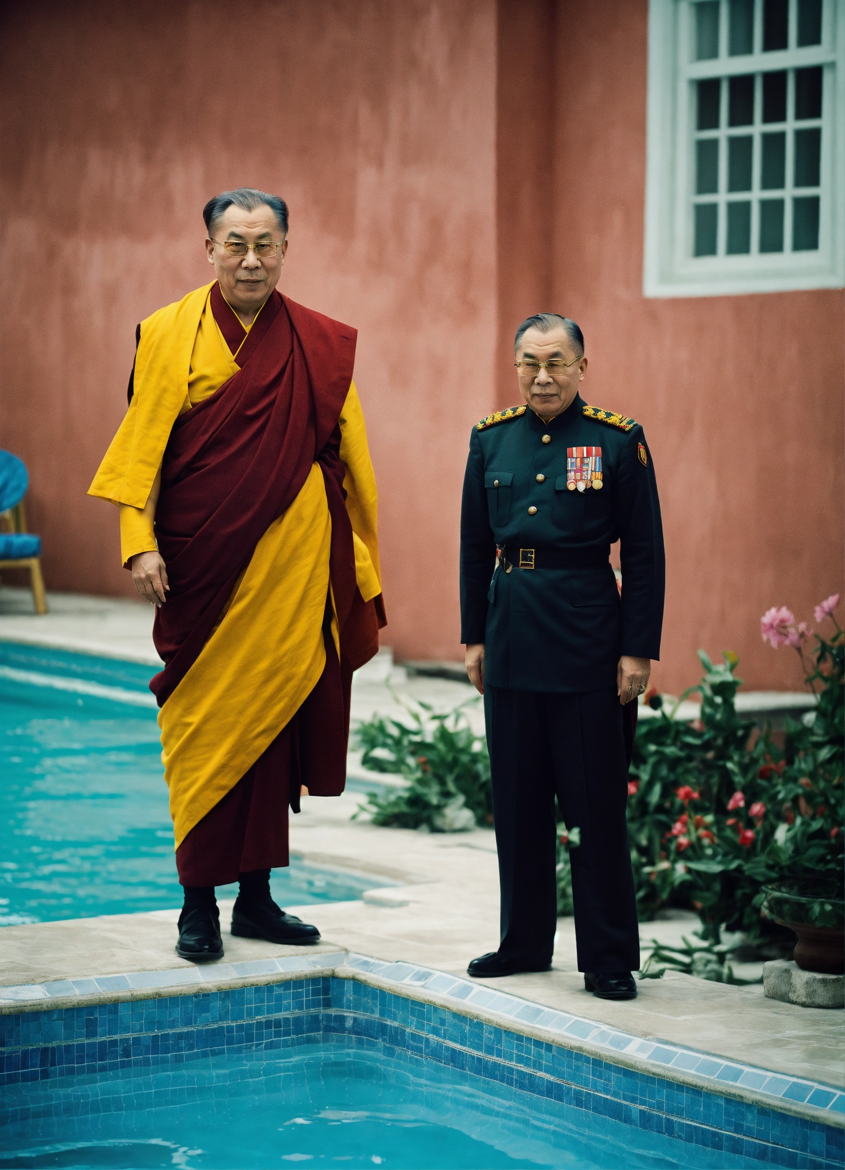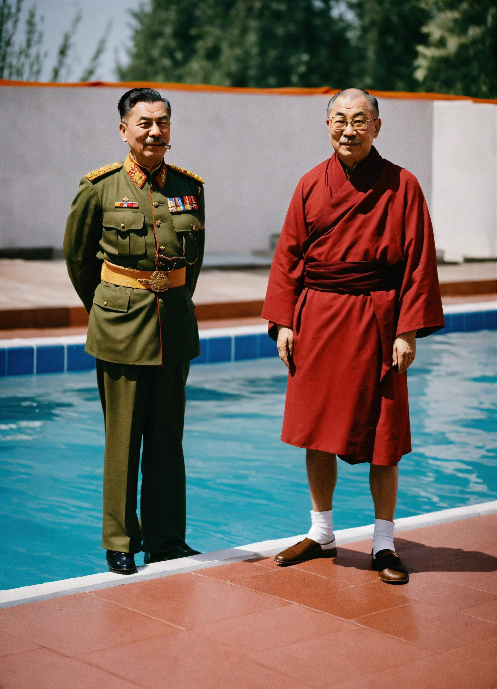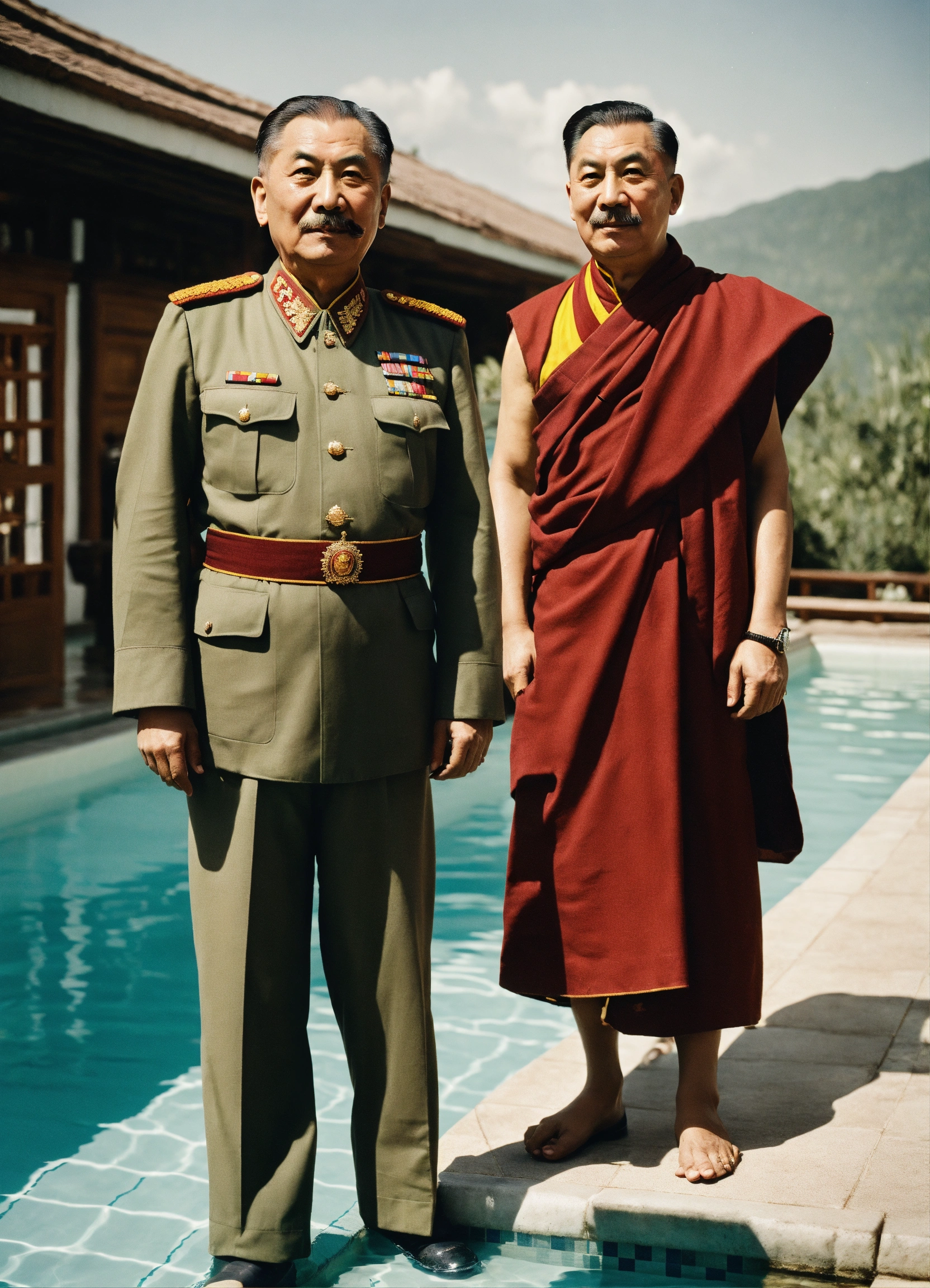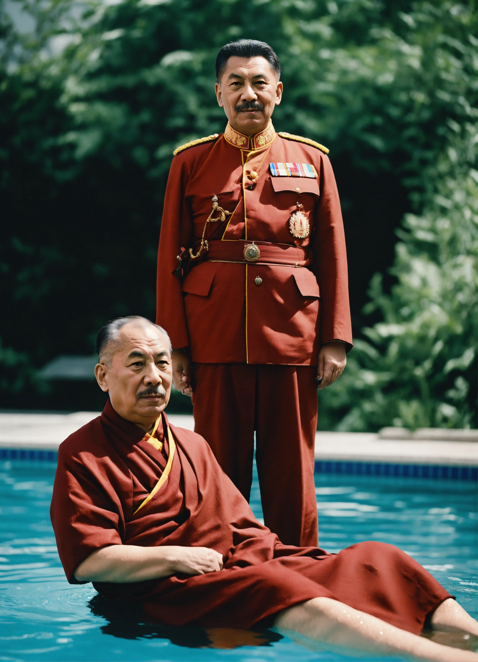 Josef stalin in a sovjet millitary uniform and the dalai lama in a swimming pool
