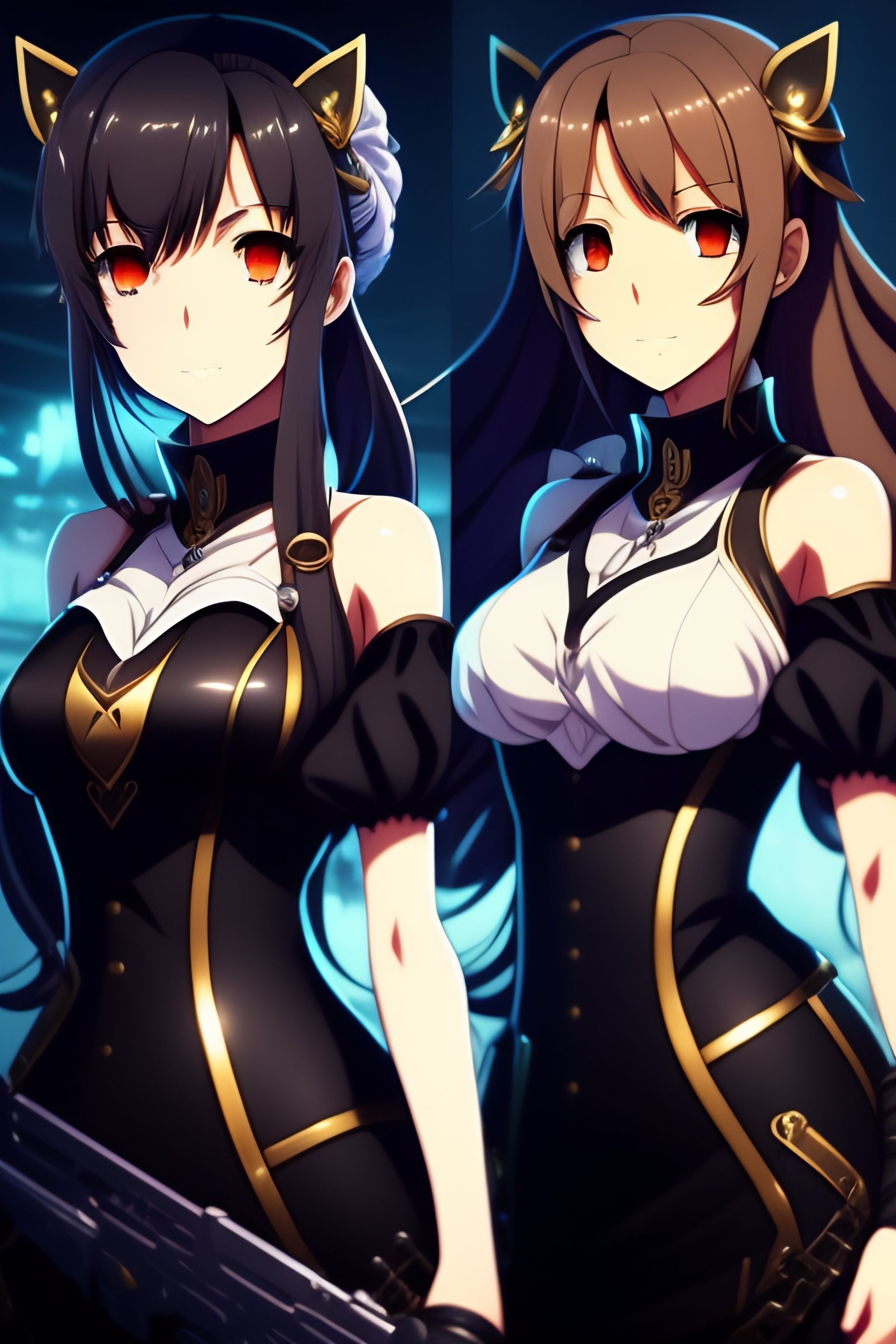 Female action anime girl, black dress, holding weapon symmetrical faces and eyes, middle shot, madhouse anime studios, black lagoon, wit studio anime