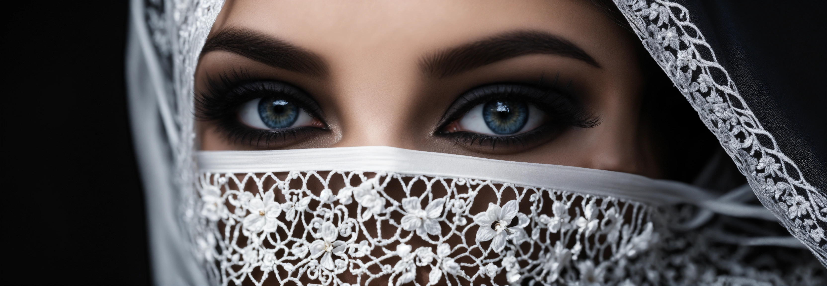 Photo black16k, and white ultra detail, muslim woman, totally black background, veiled, white face, black veil, blue eyes, very beautiful woman, beauty, light lighting on the eyes, black and white studio photo, high definition image, professional photography