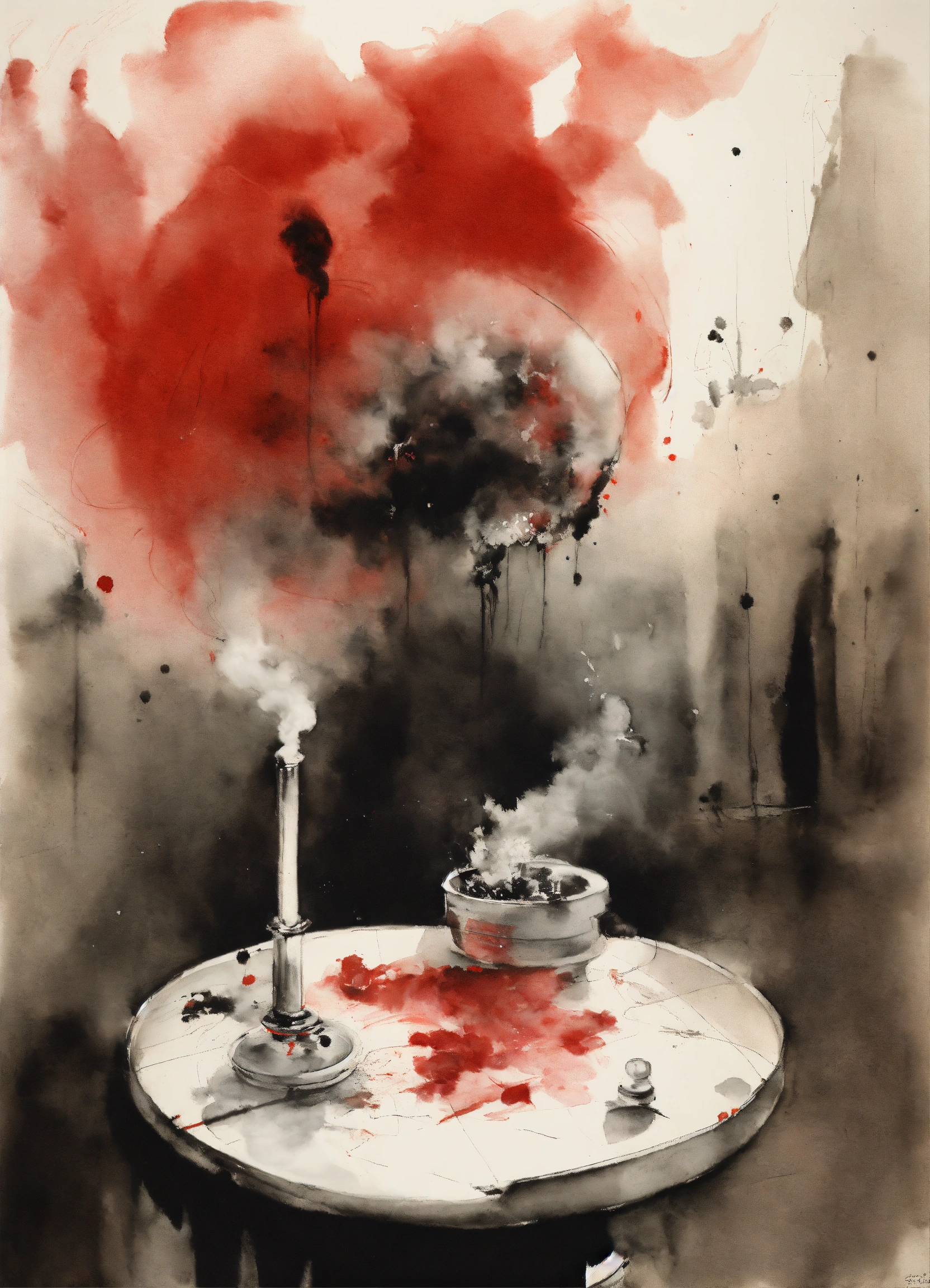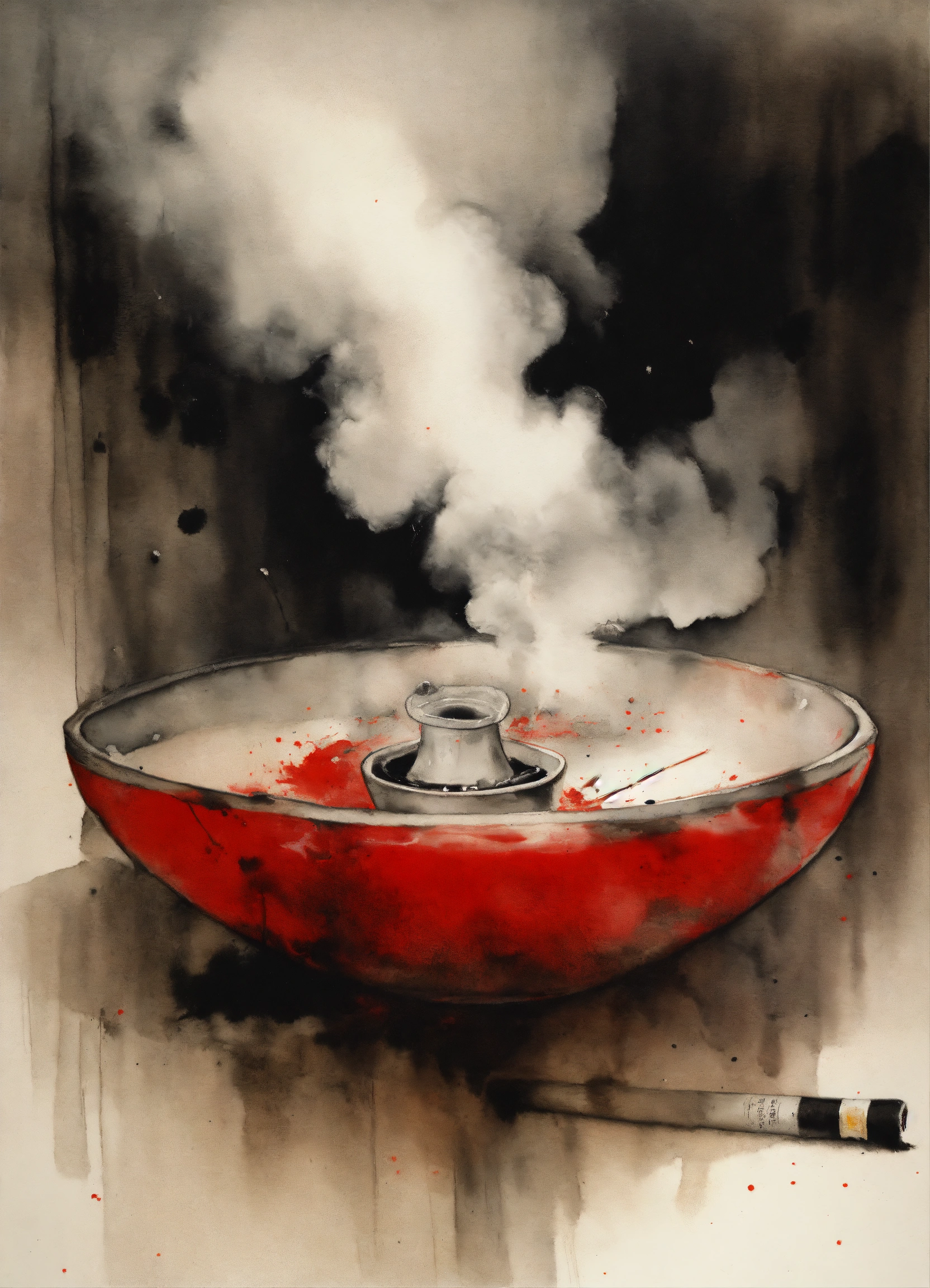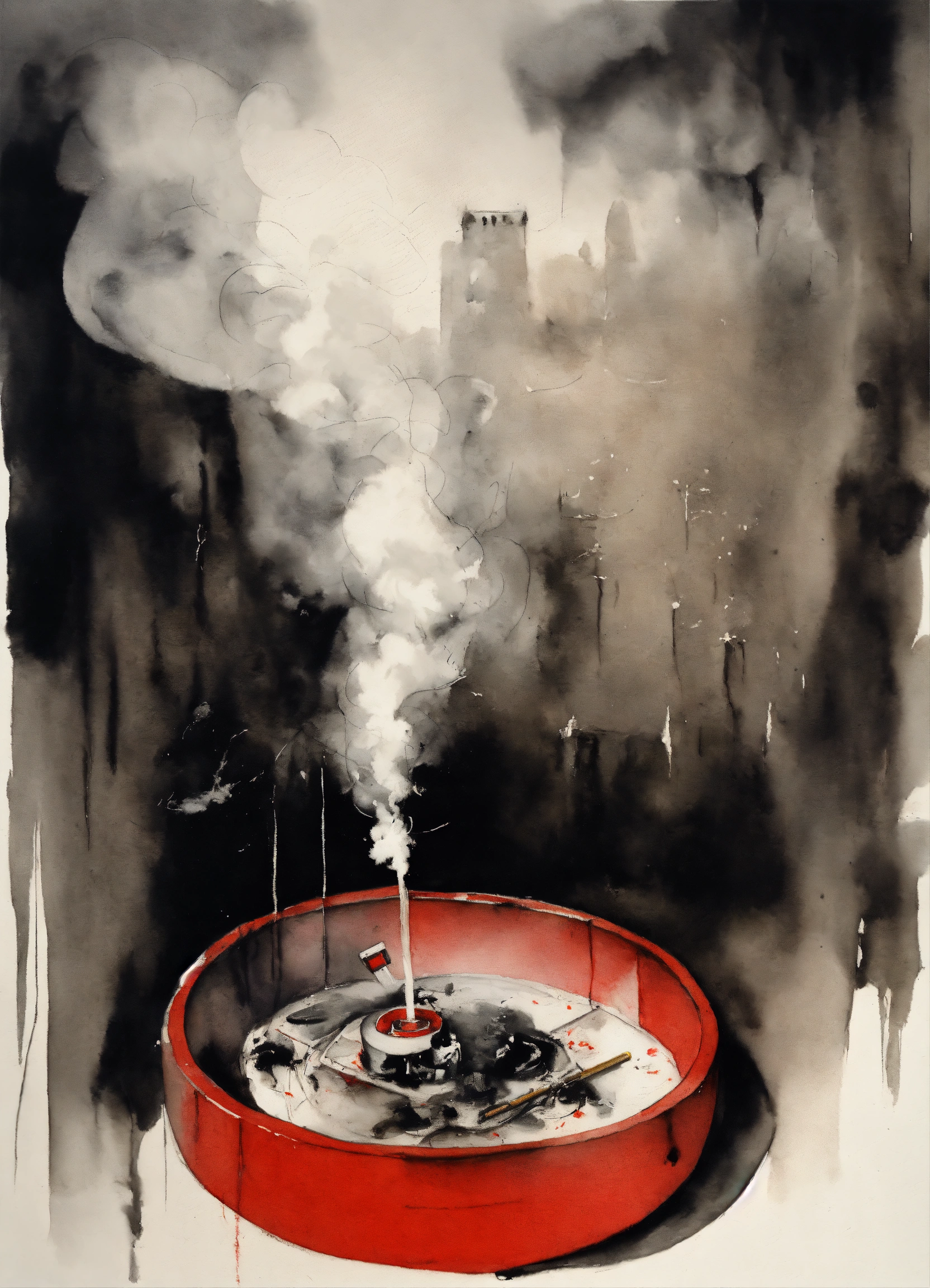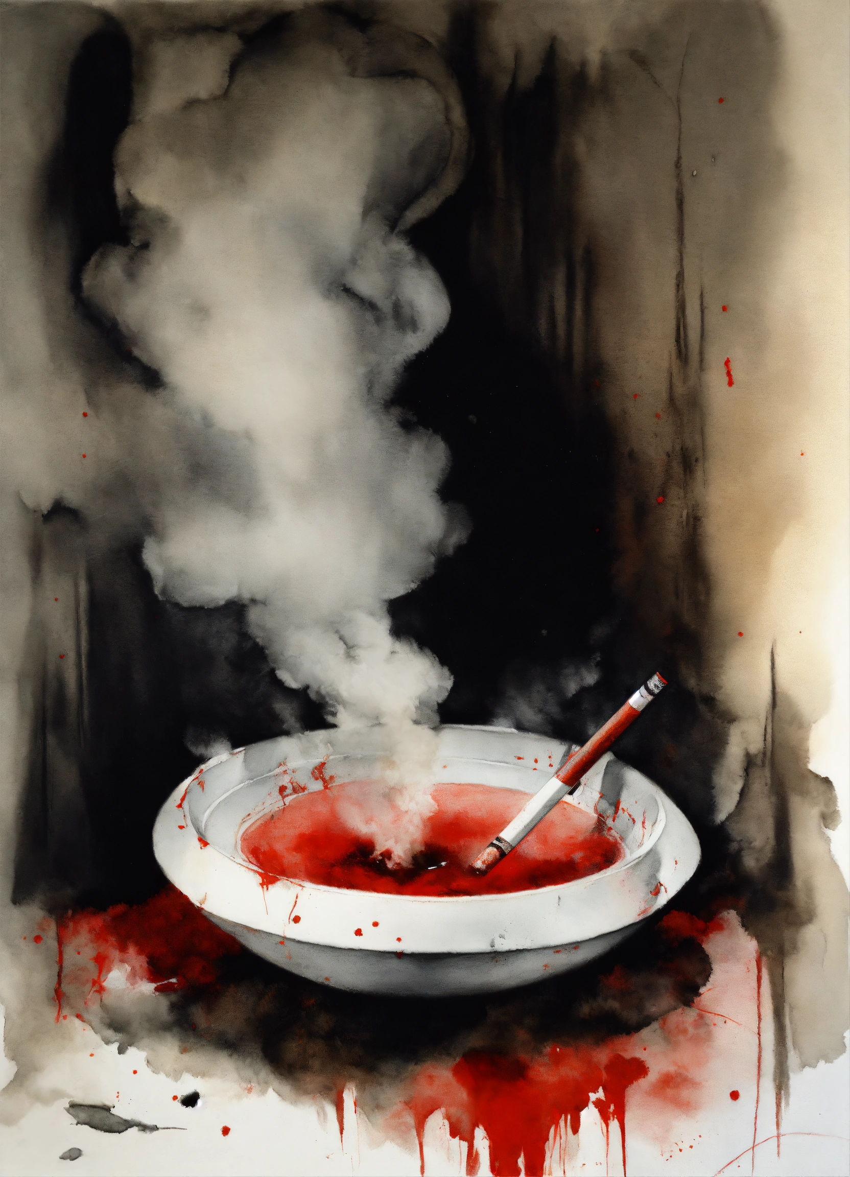 Stephen gammell style, dessin, aquarelle, aquarelles, noir et blanc et rouge, de marais, de sombres créatures, dégoulinant, a cigarette in an ashtray which lets out whitish smoke
