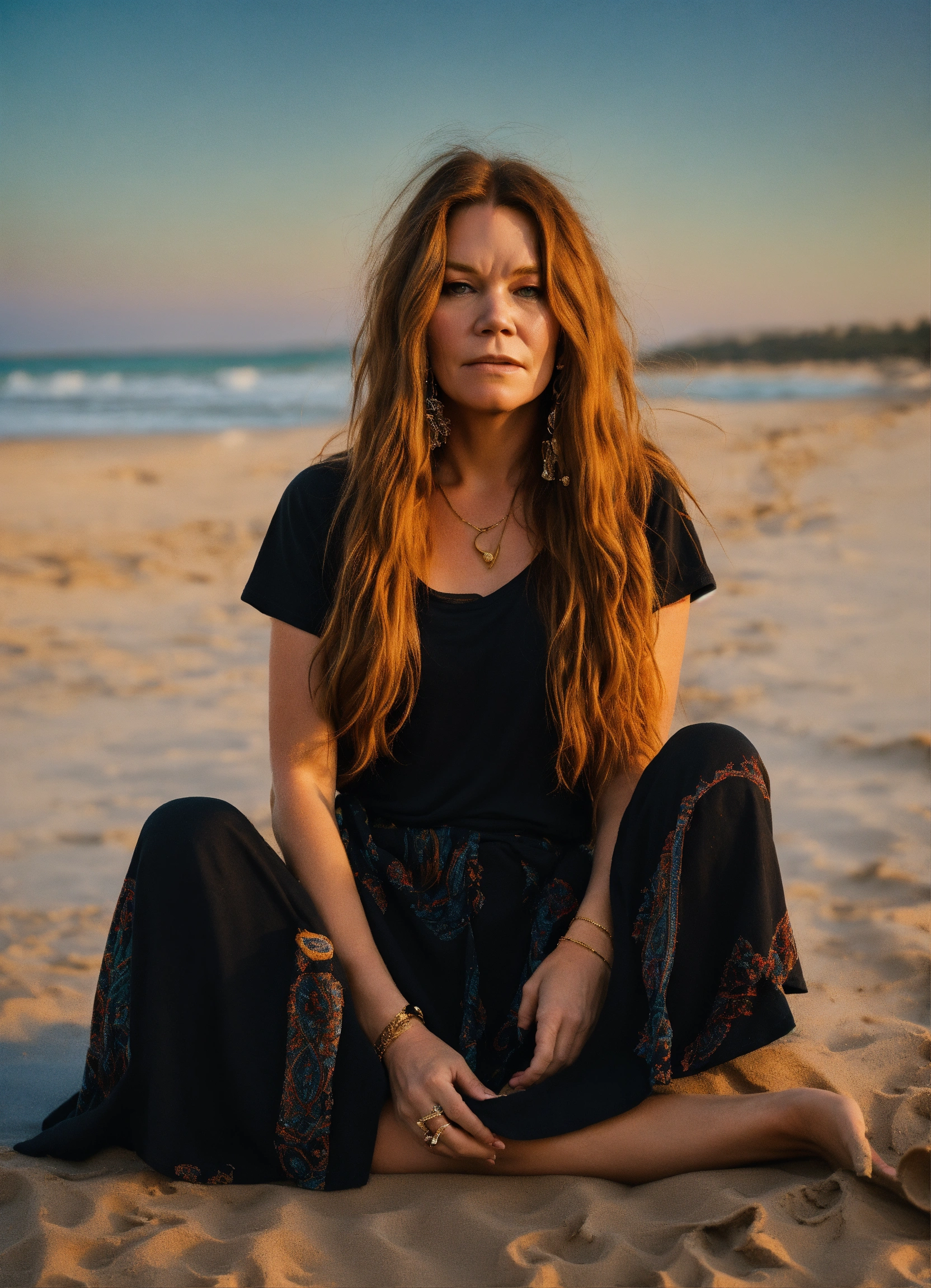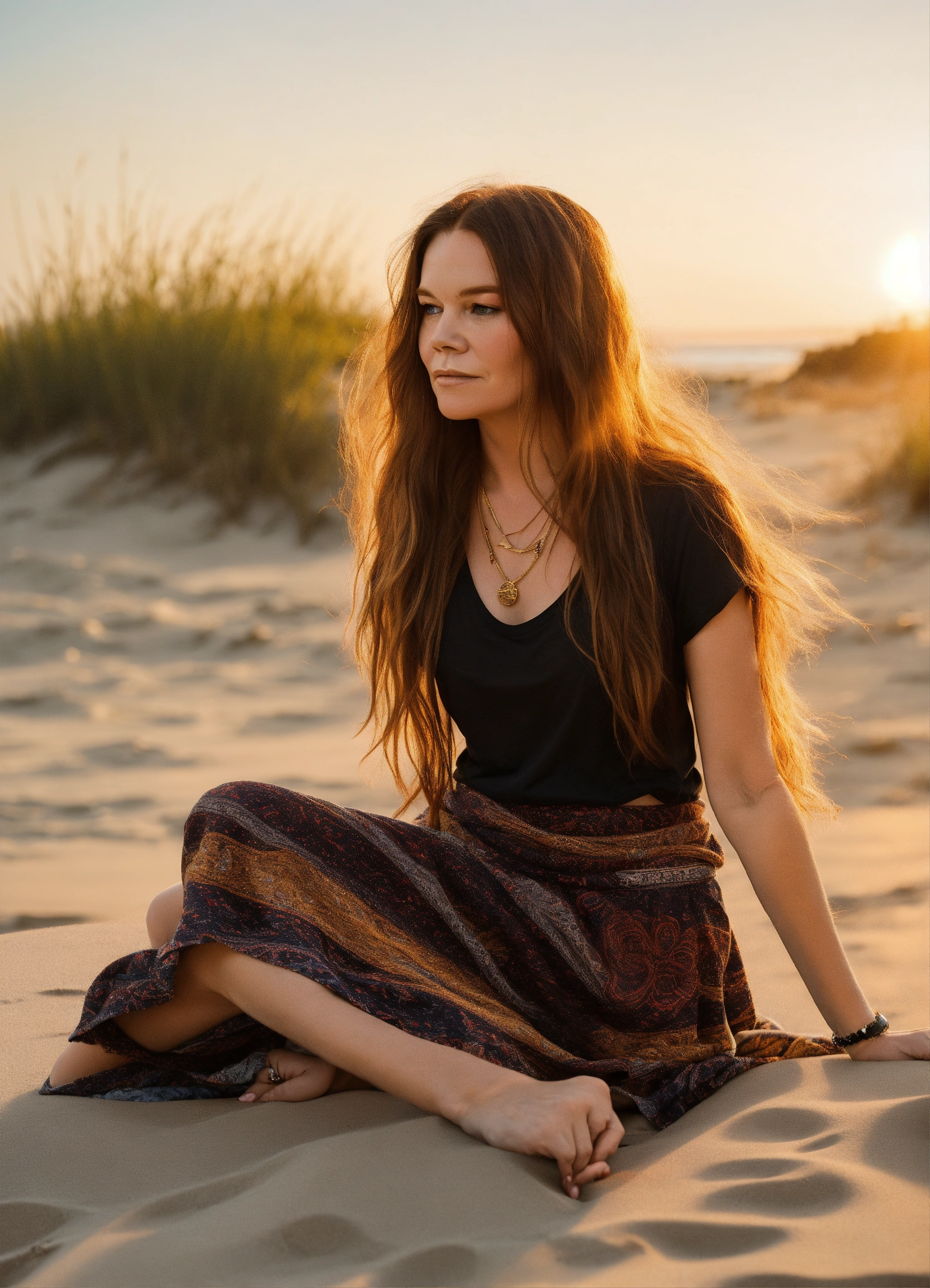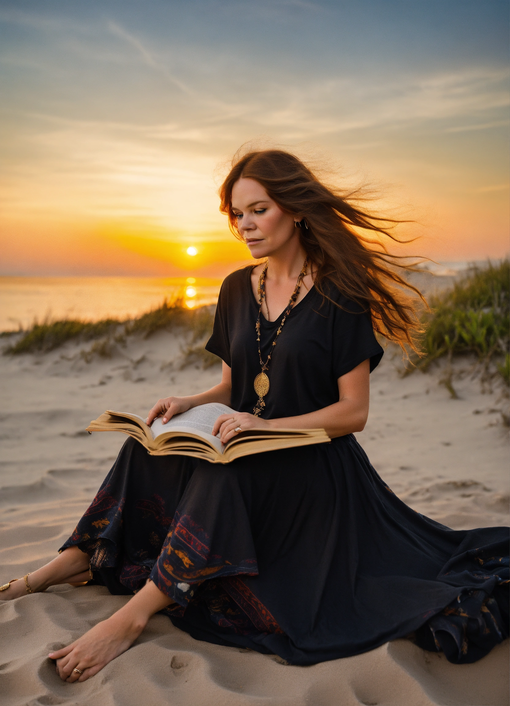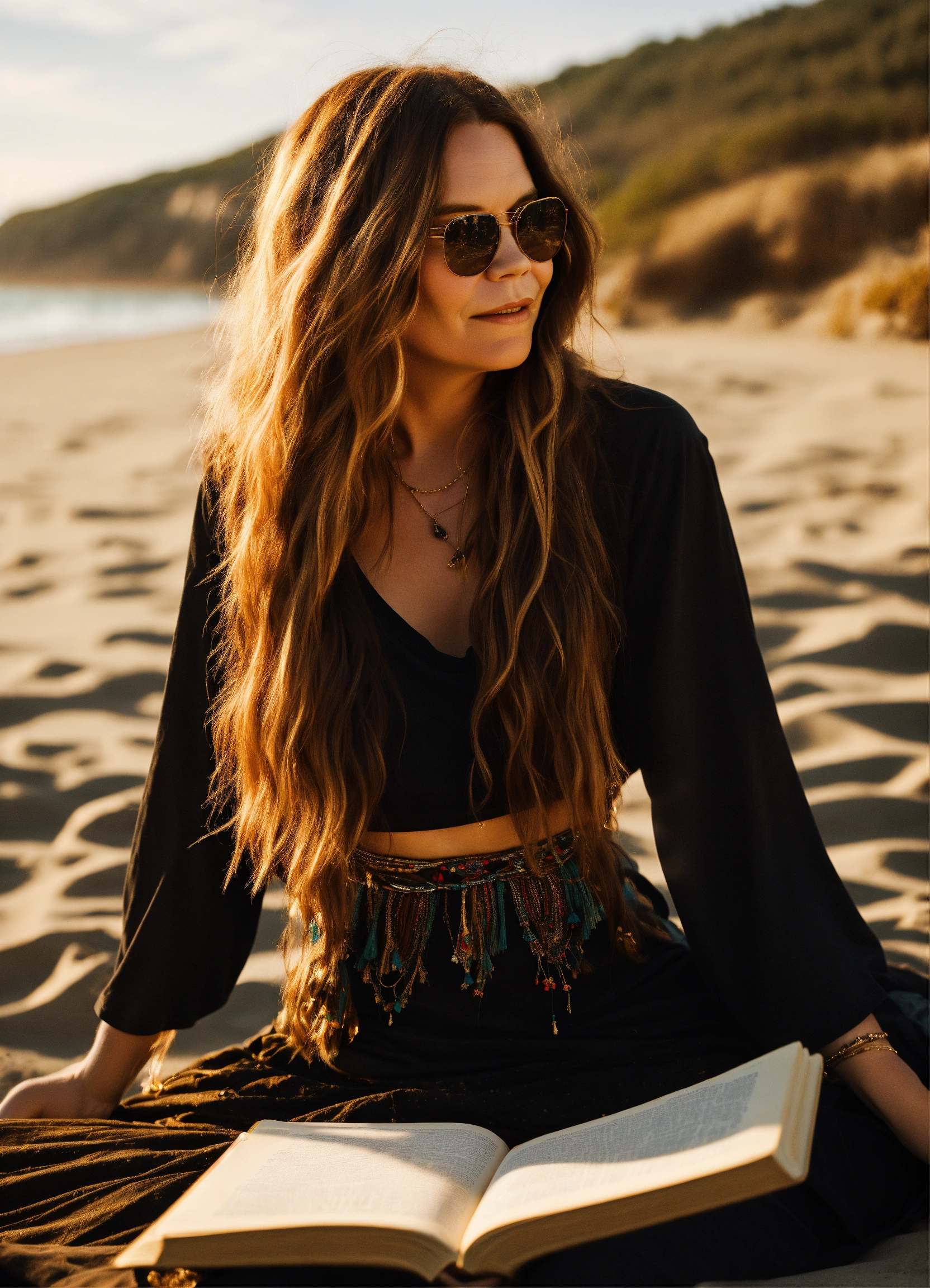 Full body photo of one janis joplin similar model with long beautiful hair, modeling plain blank black t-shirt, boho skirt, at golden hour on the beach, sitting and reading. front of shirt needs to be visible and blank.