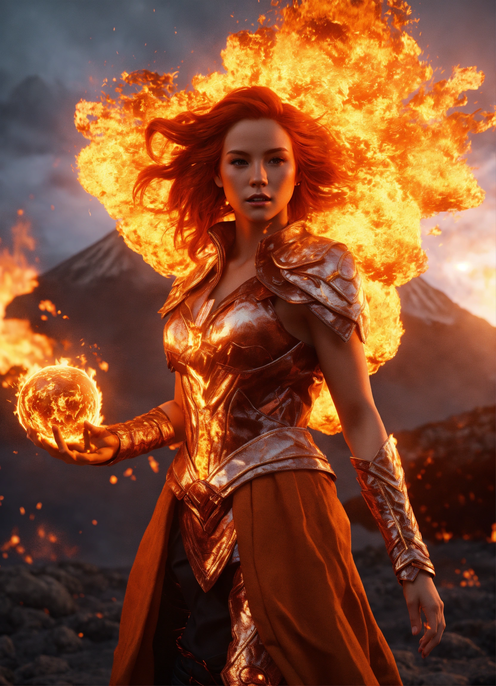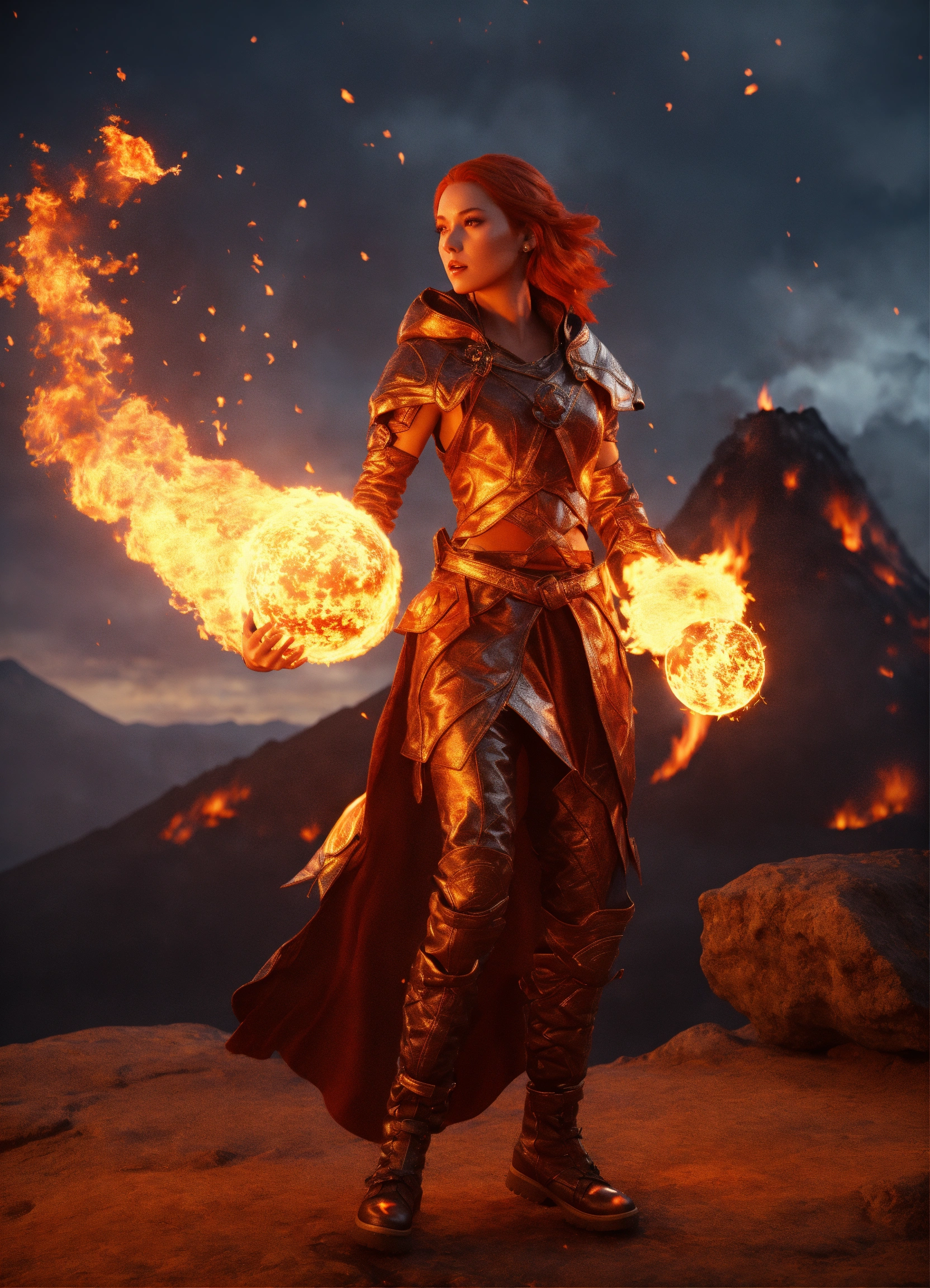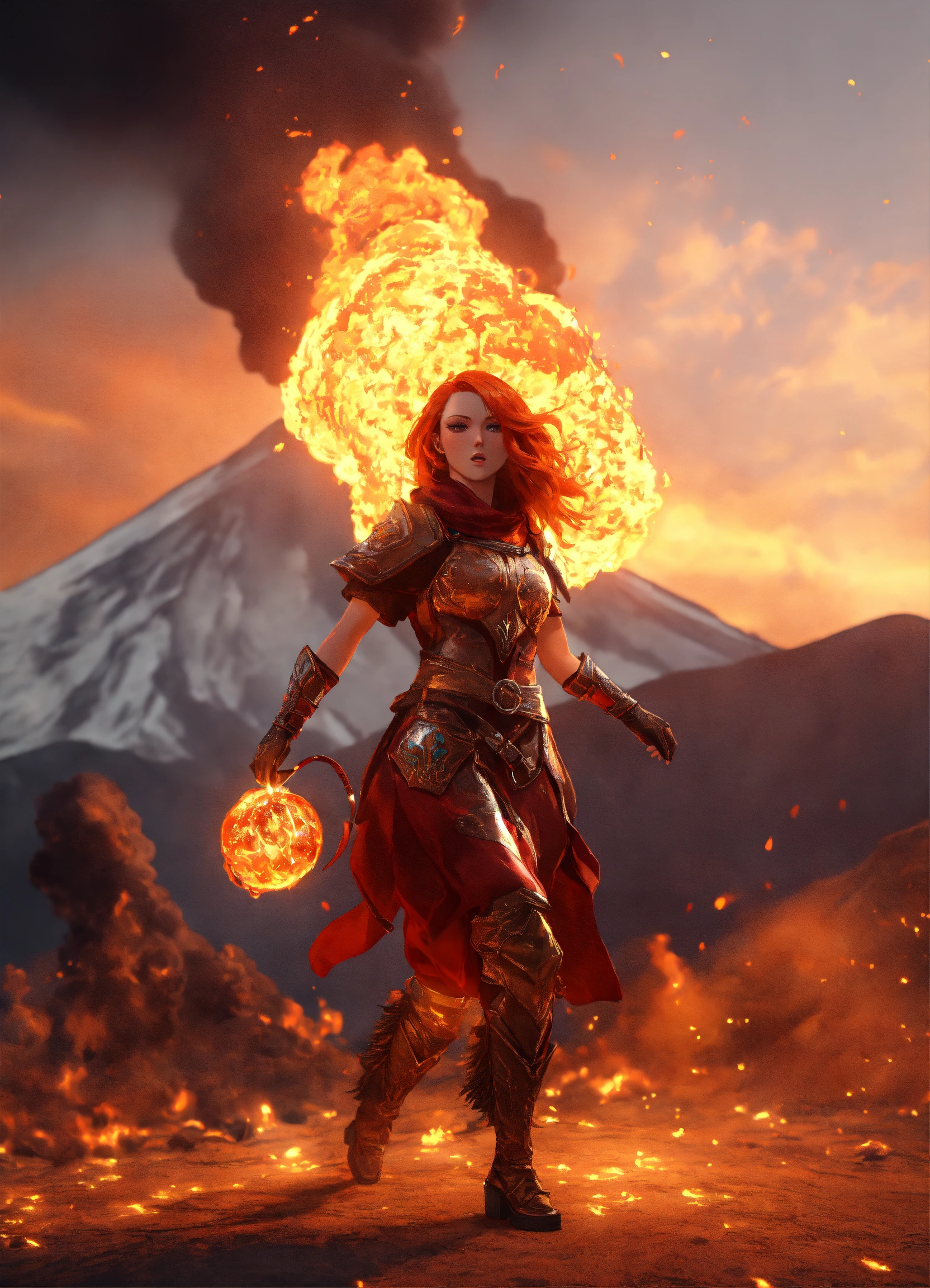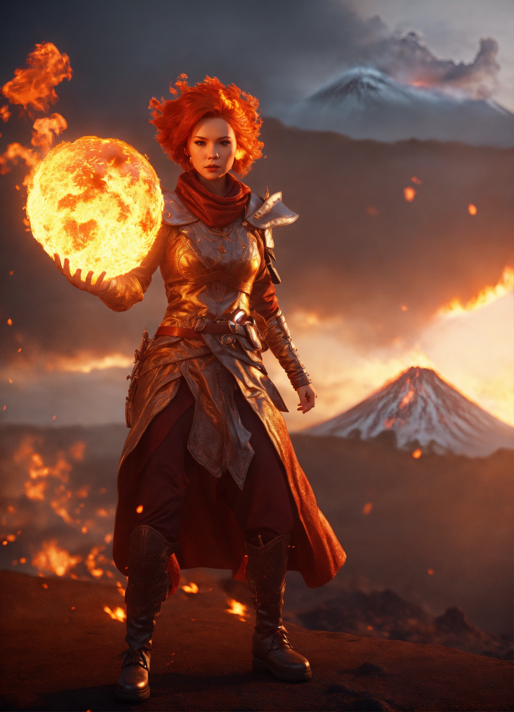 Small female pale skinned redhead fire elemental mage wearing traveling clothing with flaming head throwing a fireball with an active volcano in the background unreal engine render 8k