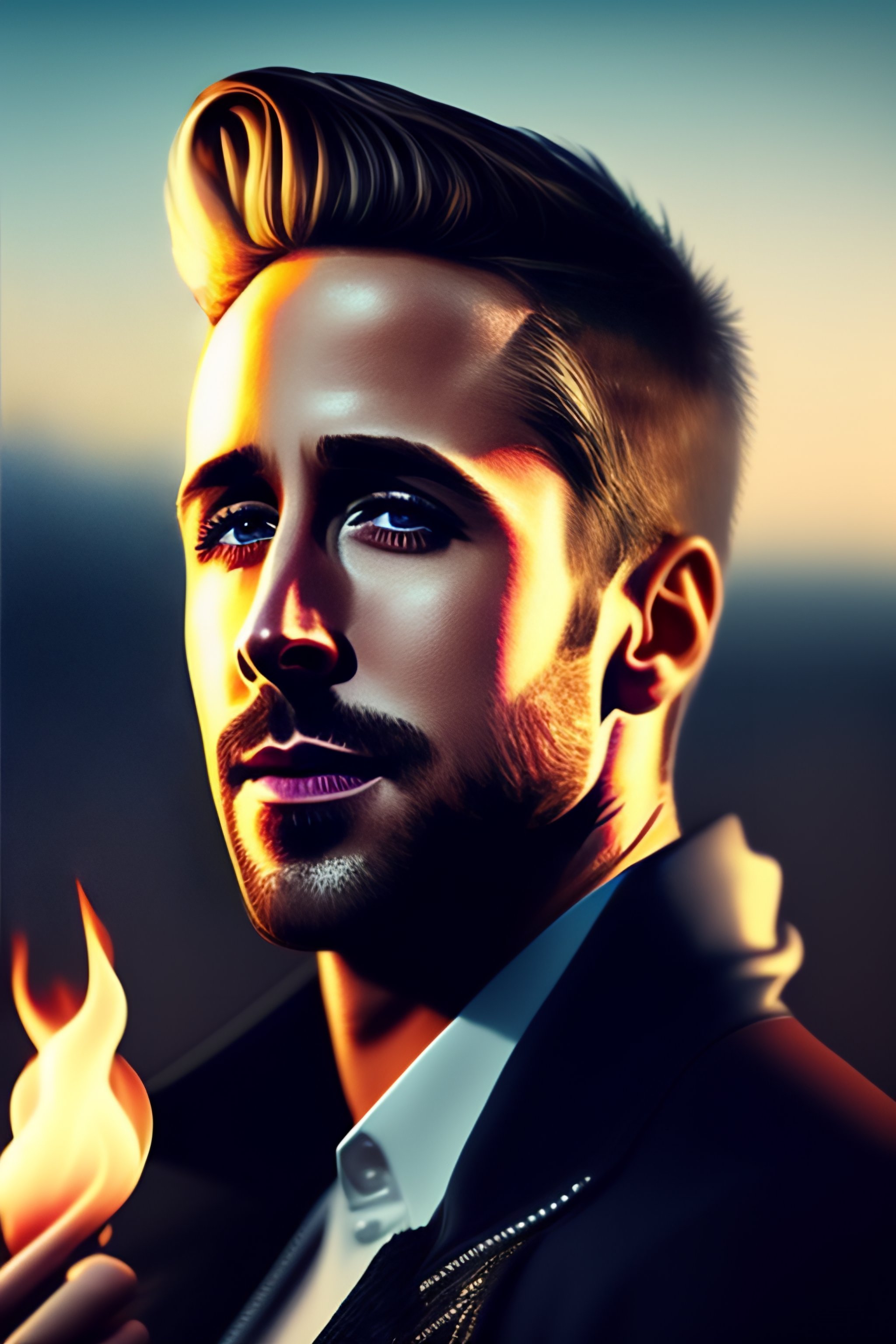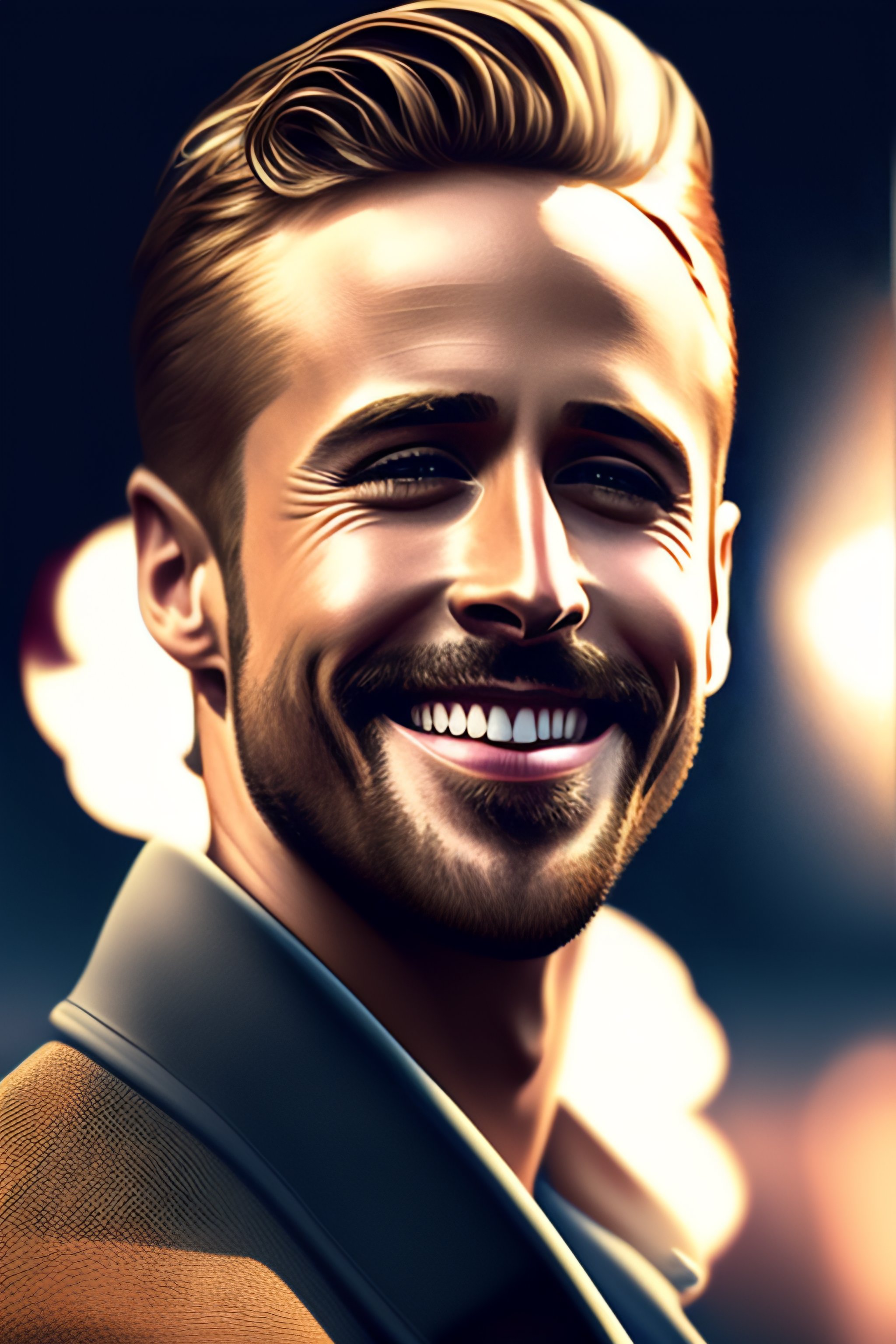Ryan gosling smoking a cigarette and smiling, trending on artstation, artstationhq, artstationhd, photorealistic imagery, photorealistic details, intricate details, 8k detail post-processing, ultra realistic, super detailed, cinematic quality, masterpiece
