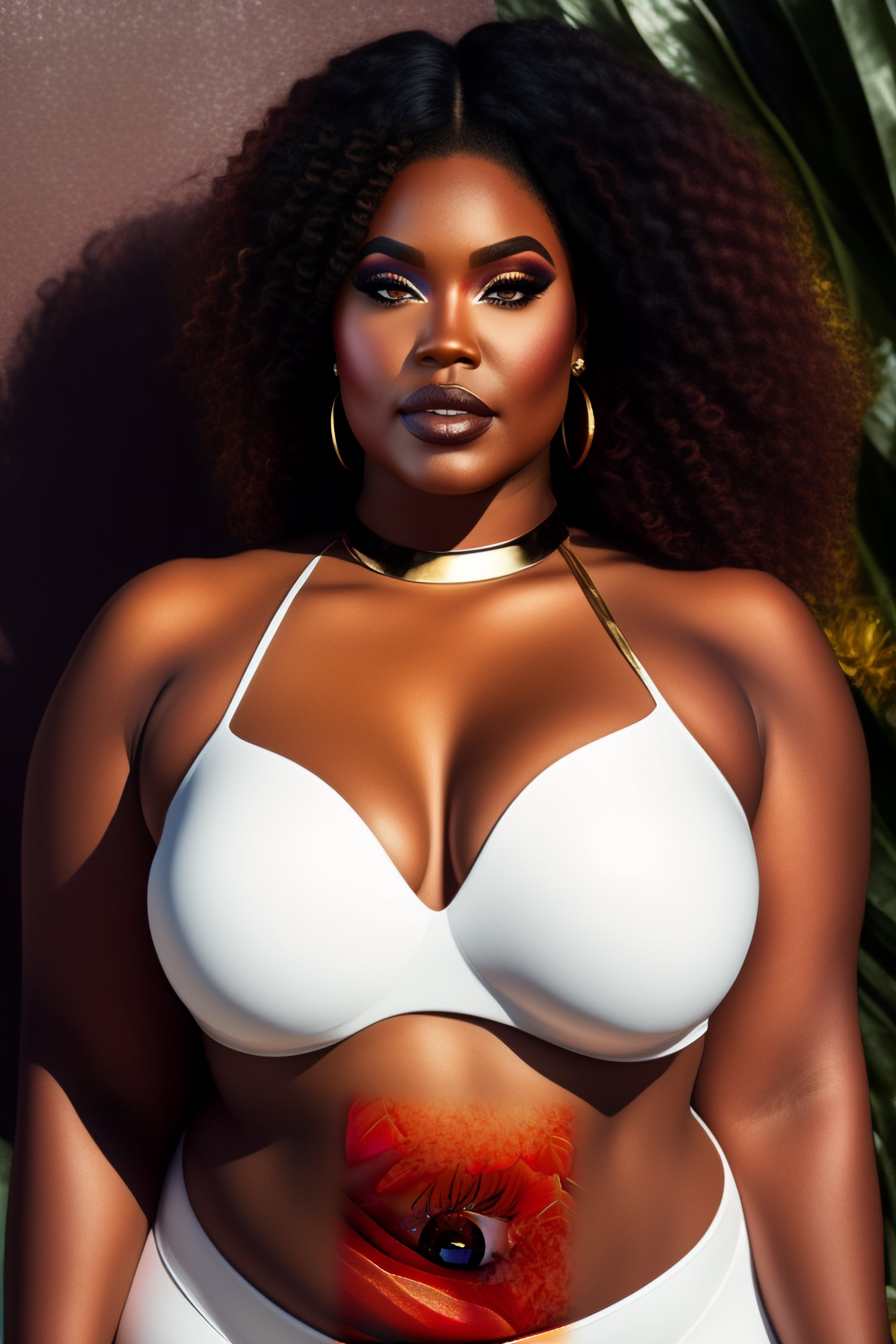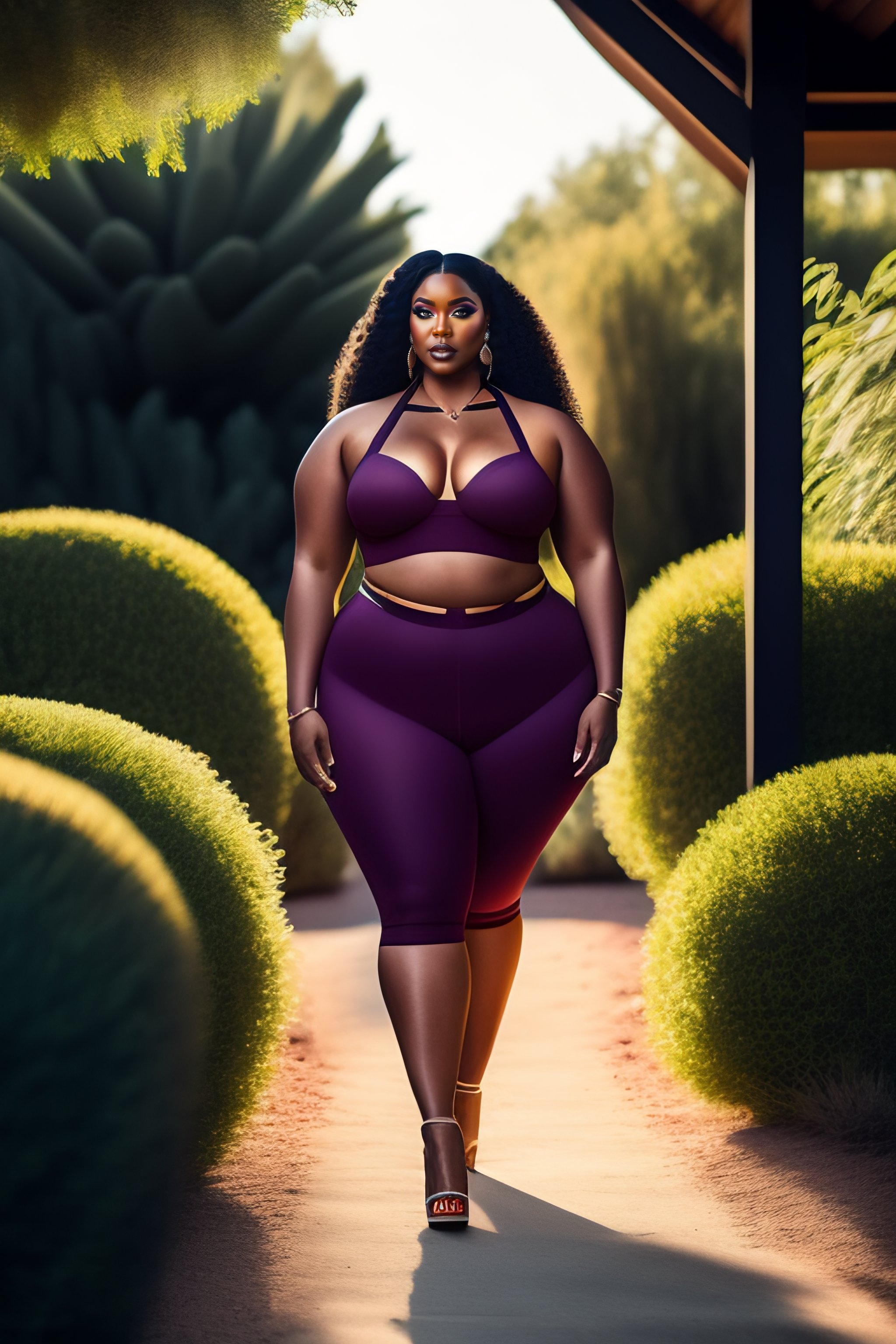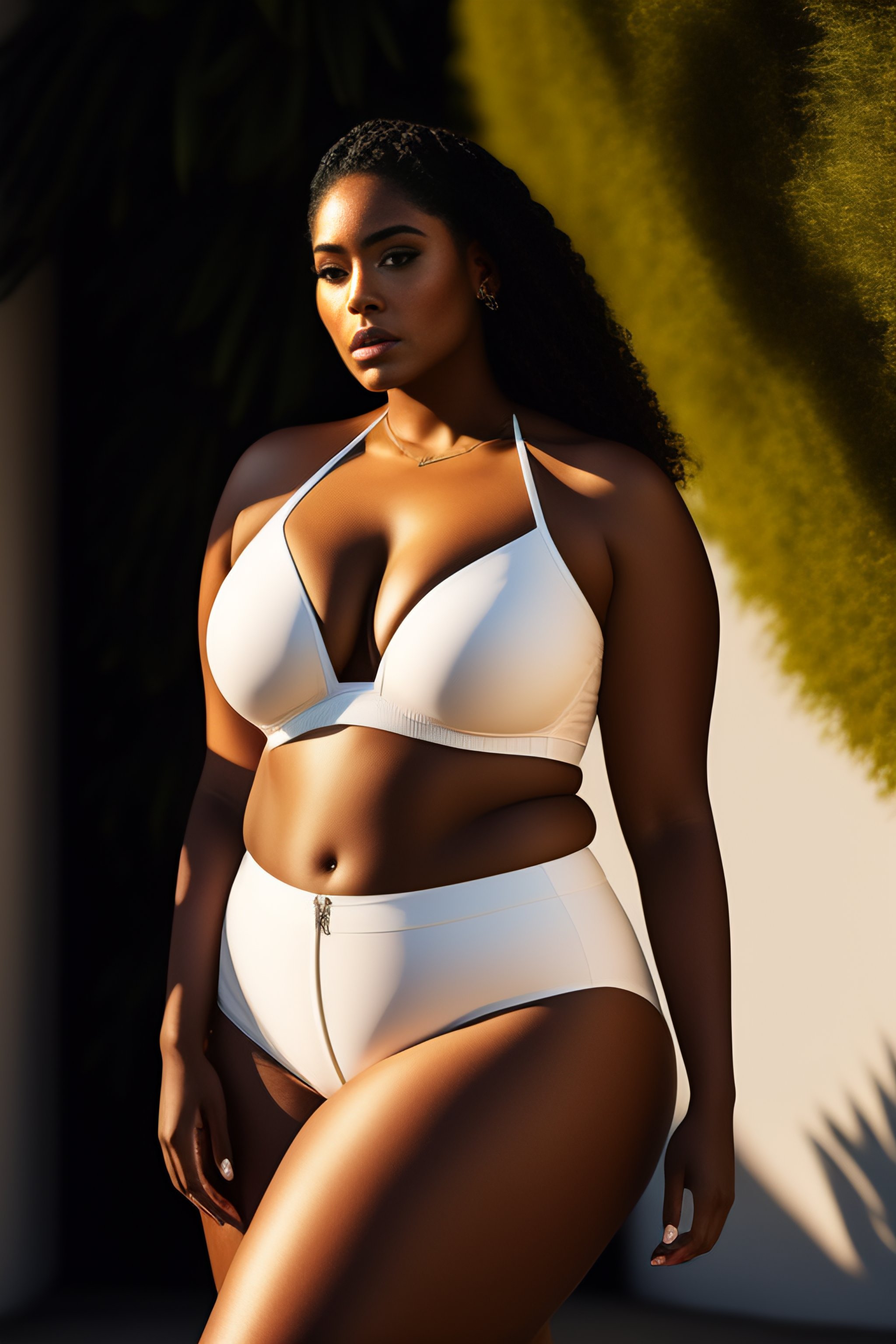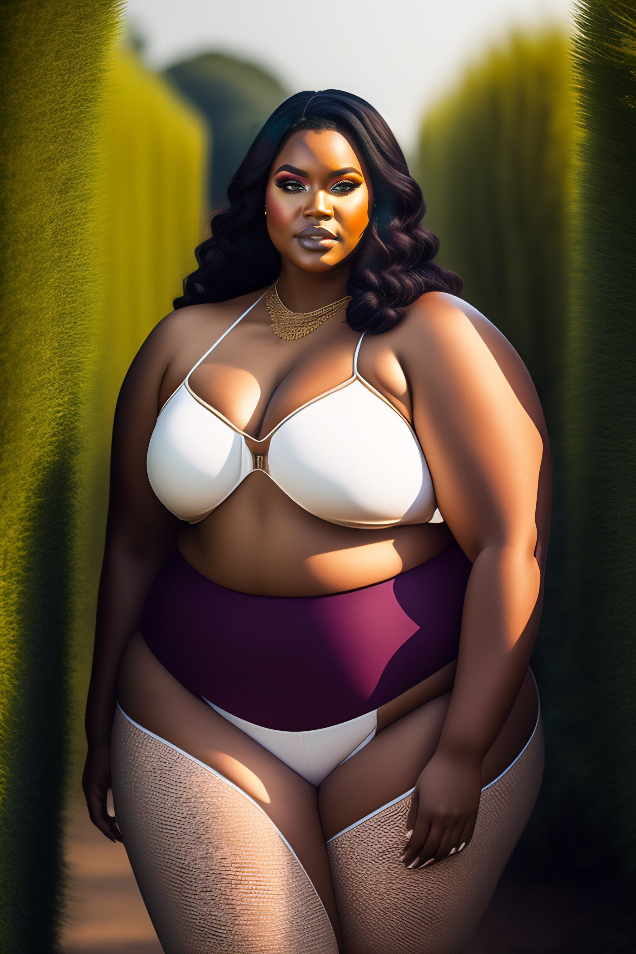 Plus-sized model, makeup, eyeliner, wide hips, pretty symmetrical face, outdoor, plants, natural light, photograph