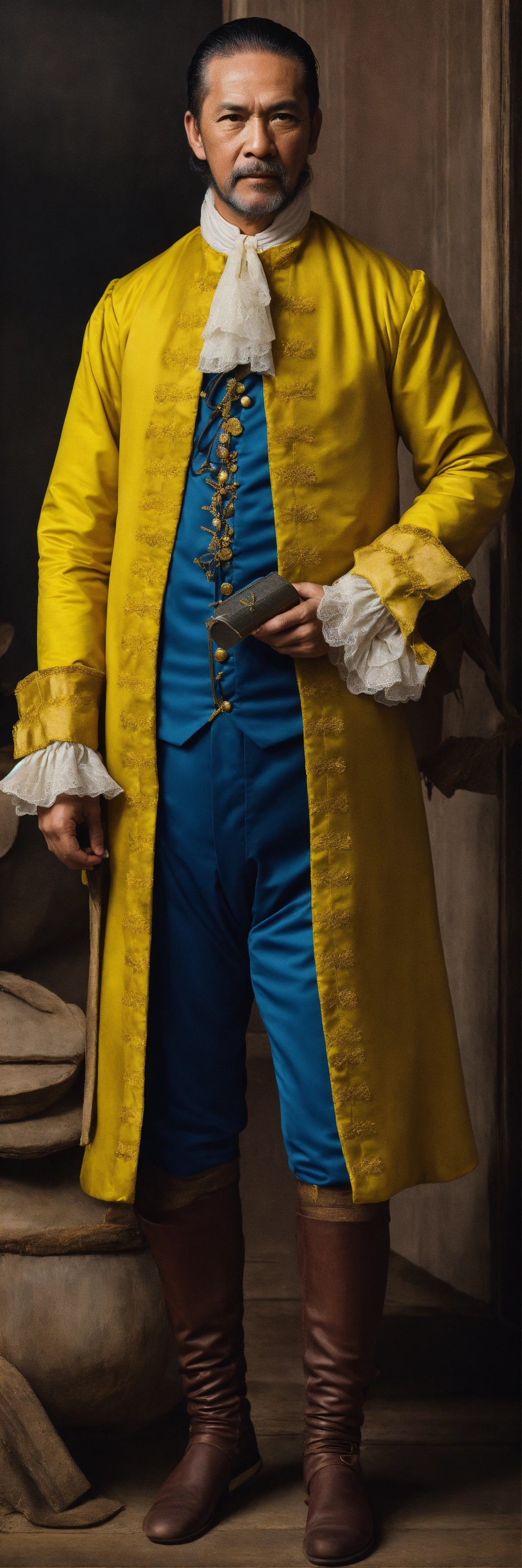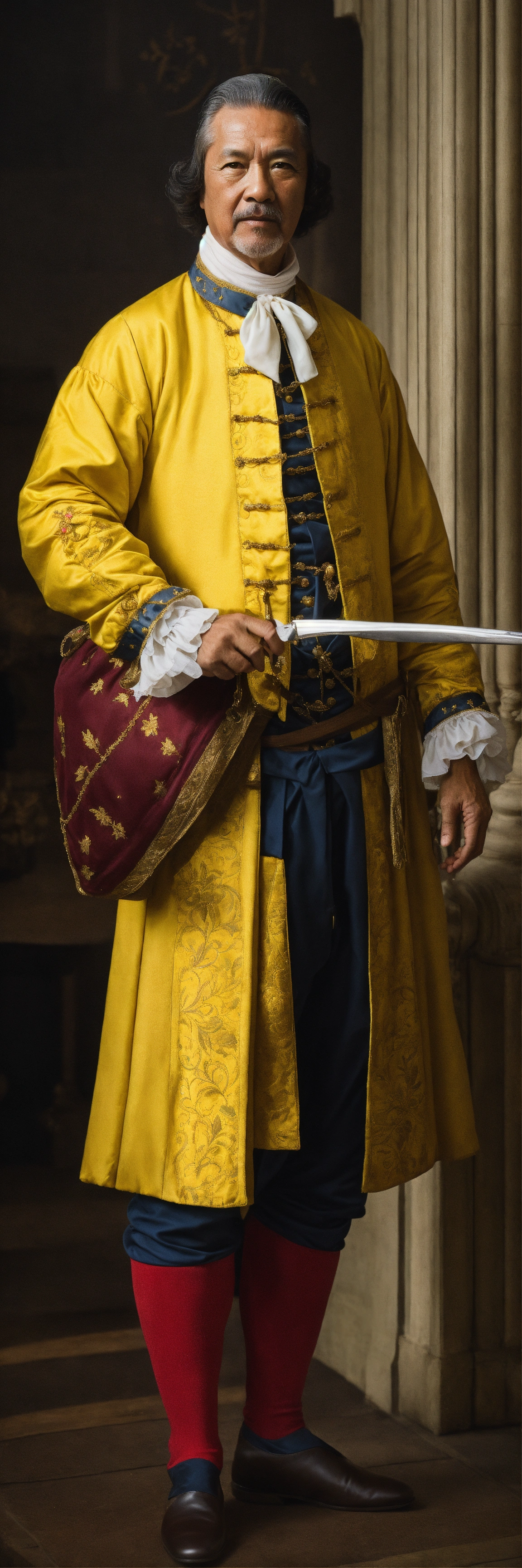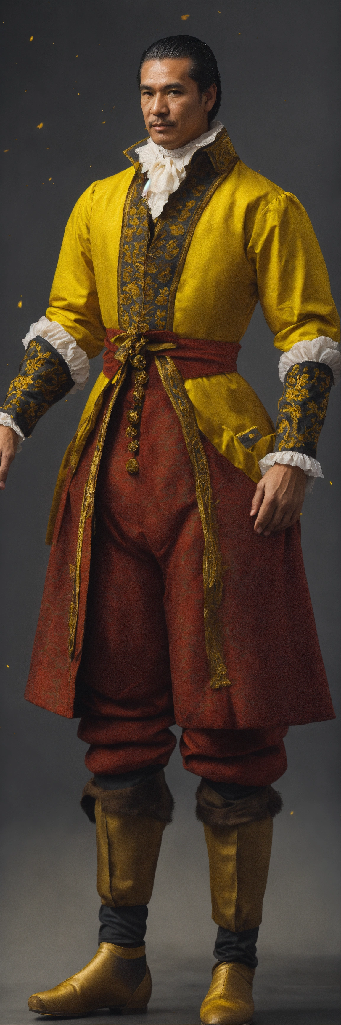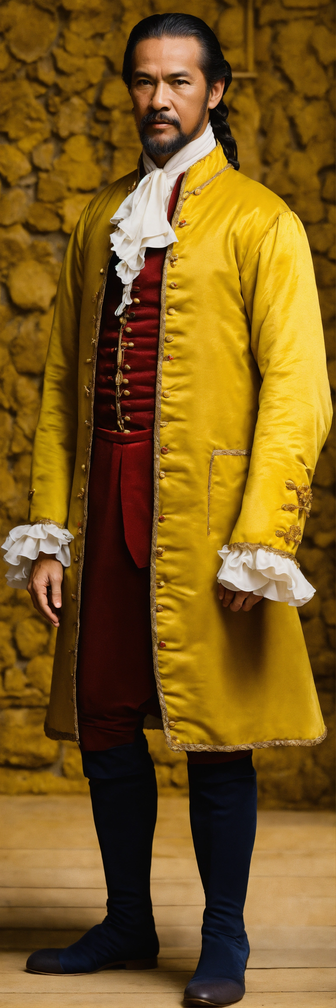 A 50 year old worker in 1600s costume with slicked-back hair and bright yellow skin in feet