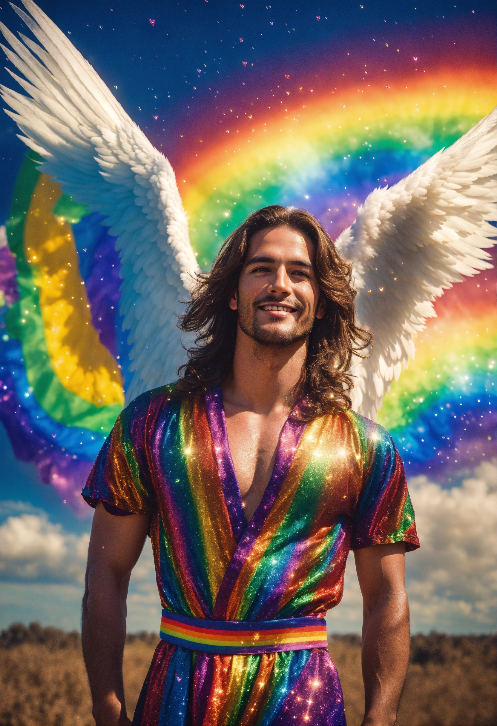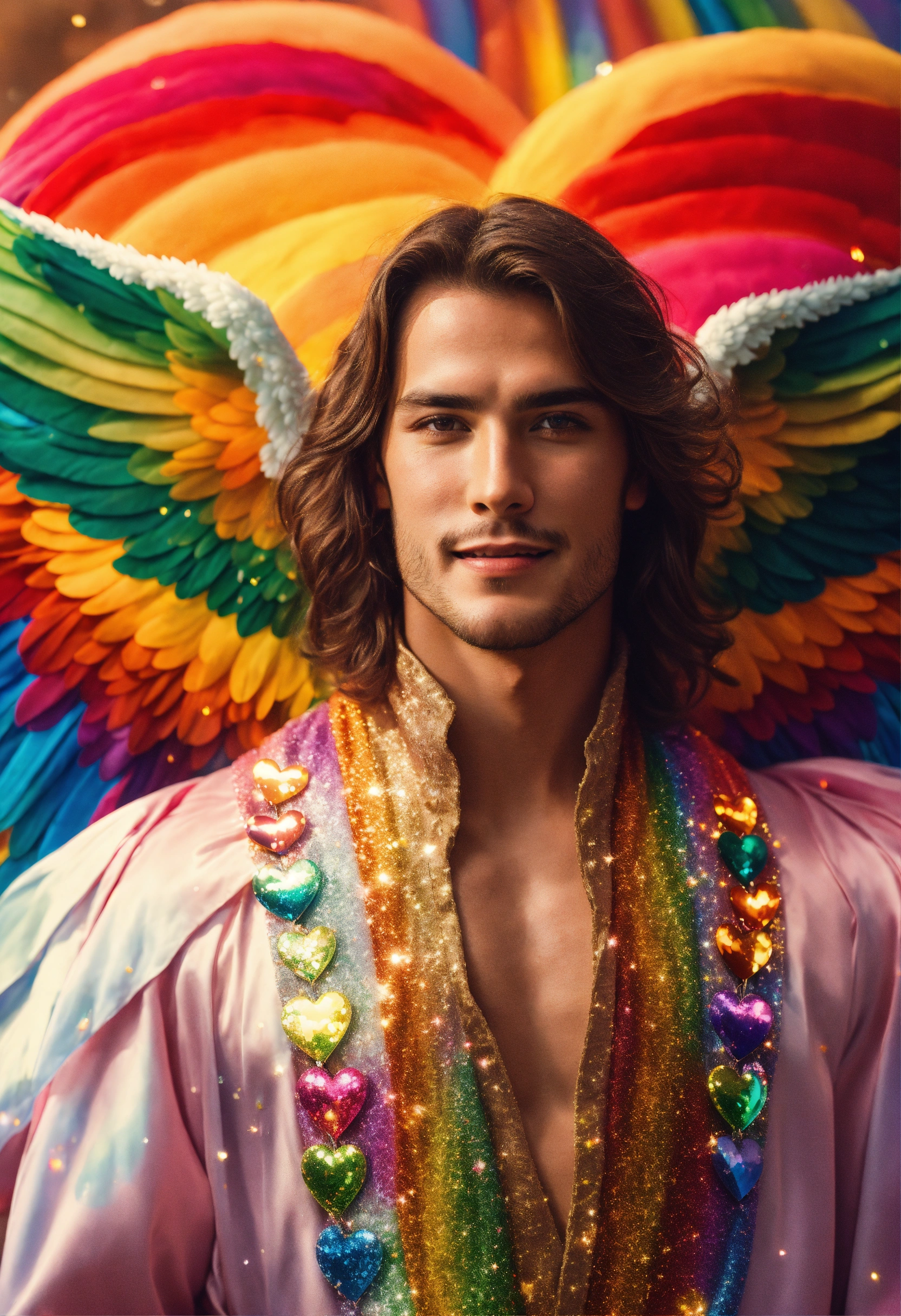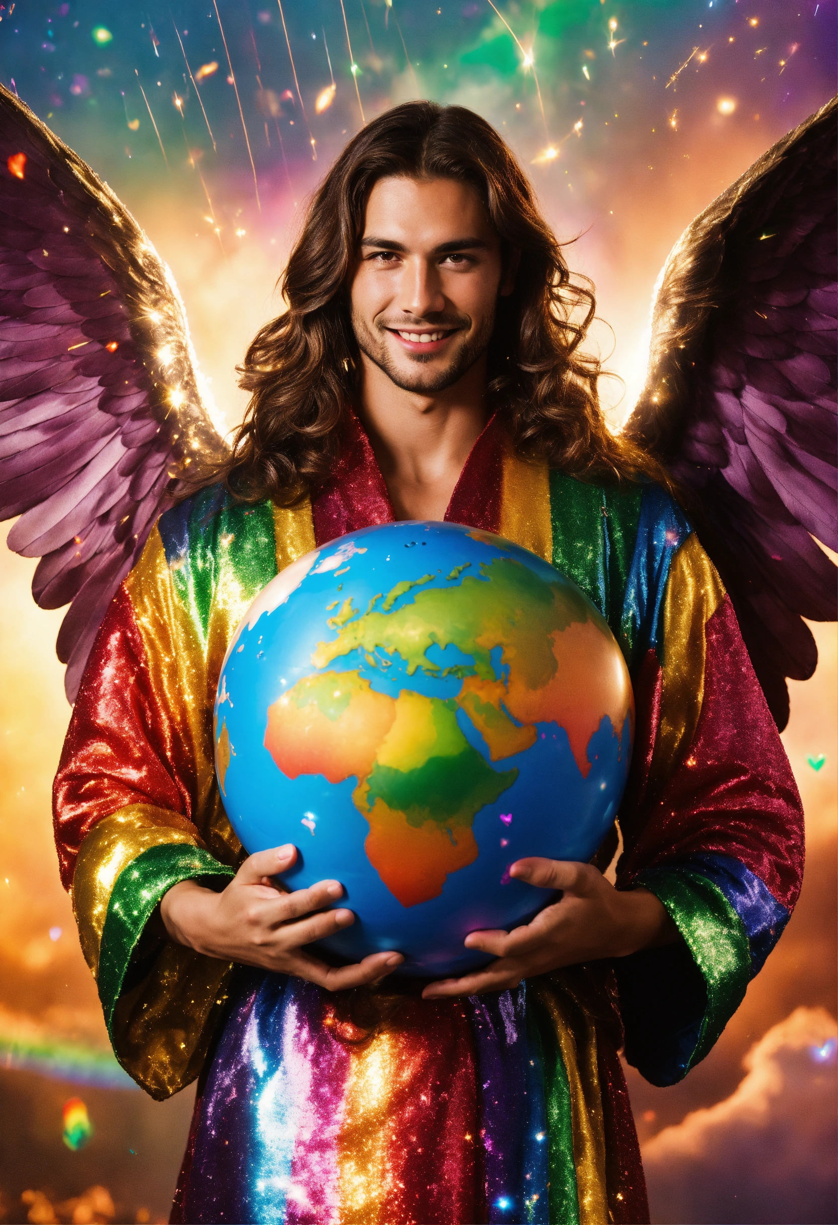 Surrealistic photographic close up portrait of masculine robust archangel with massive gigantic white wings spreading out from his back, young italian supermodel male, background is explosion of rainbow colours and raining sparkly hearts in rainbow sky, smiling and holding a glowing magical globe of planet earth, staring intensely straight ahead directly into camera as if listening to me, long brown hair, loving brown eyes centred towards me, wearing sparkling rainbow-detail robes with high neckline, magazine photoshoot, film grain.