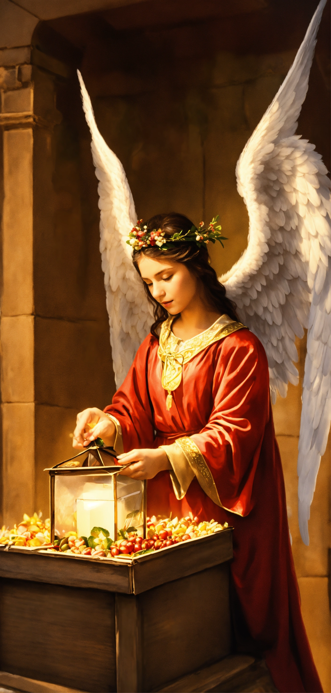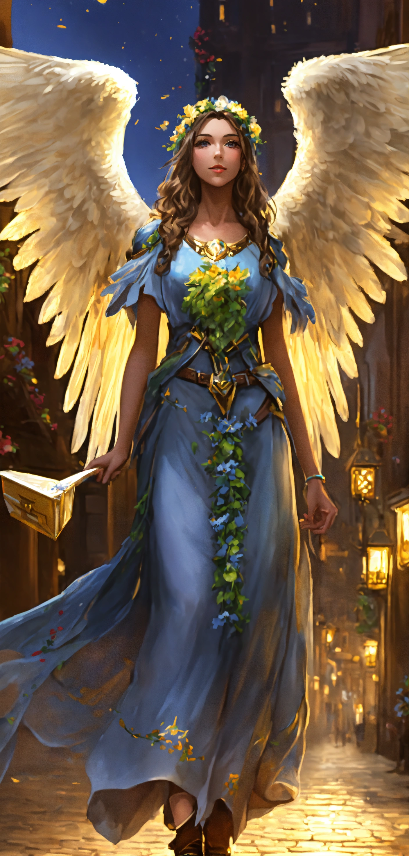 Mach ein bild, kalii ist ein weibliche engel und hat ein postpaket in der hand. tema kallii hilft menschen bei der paket zustellung.