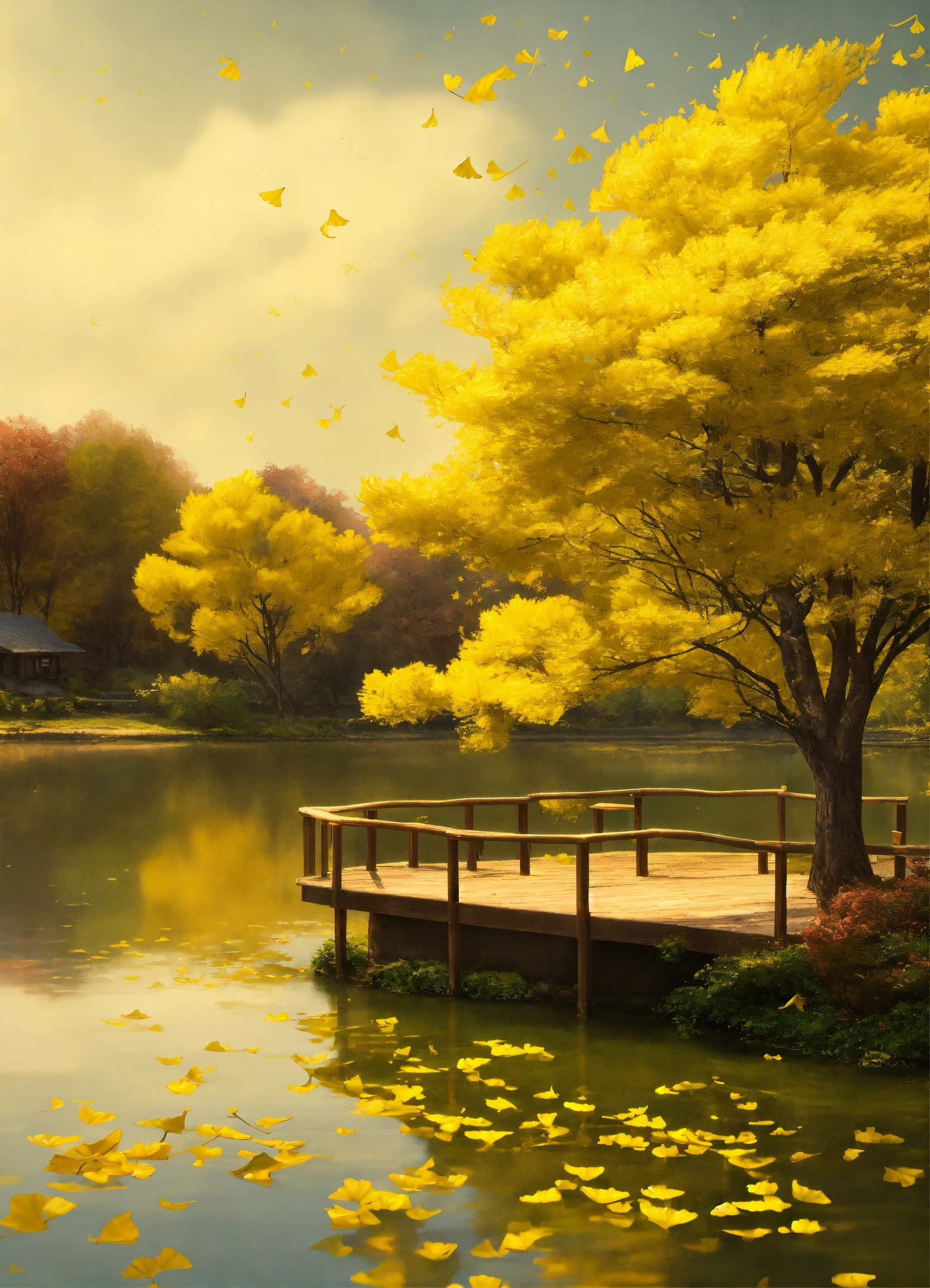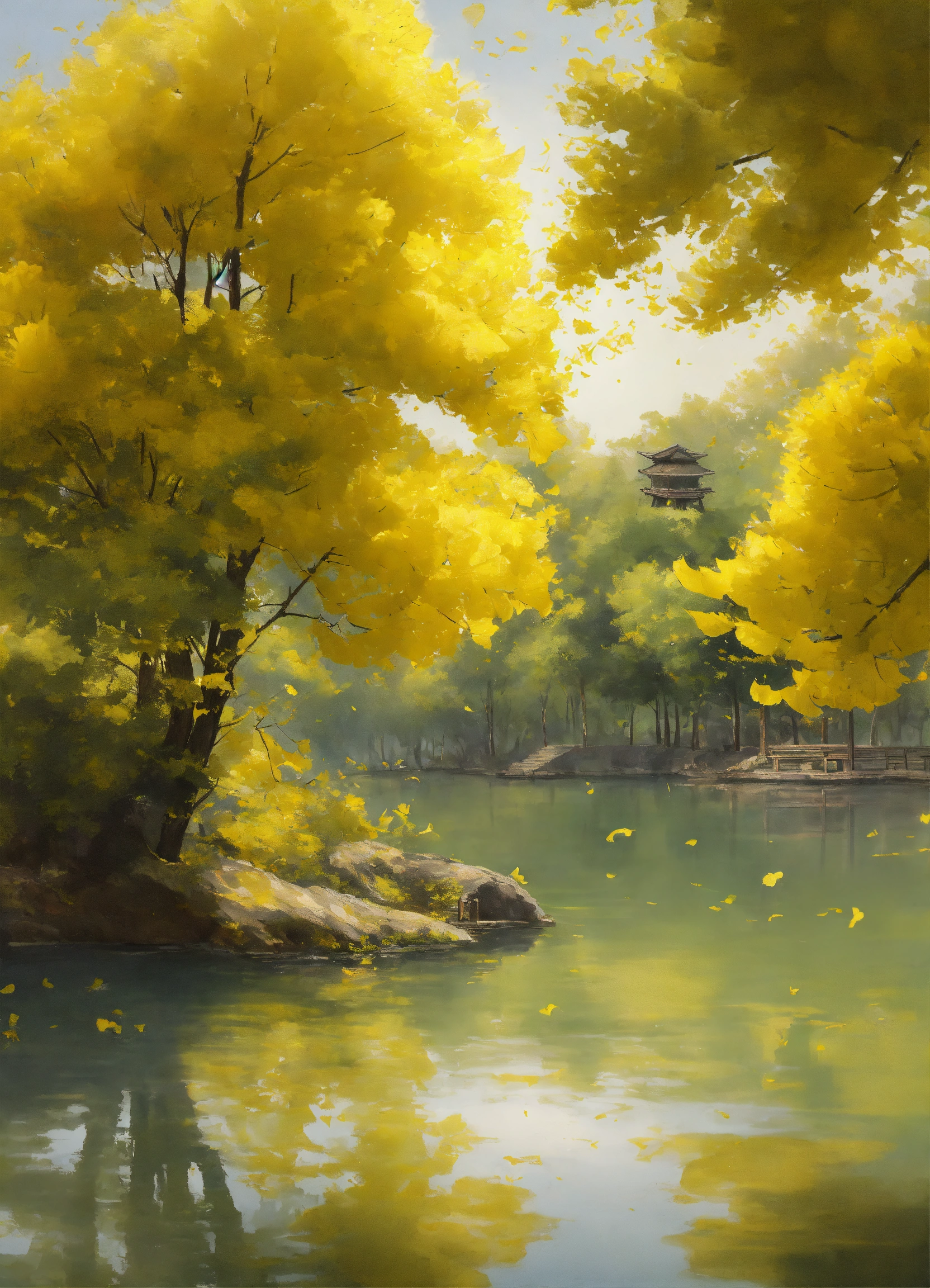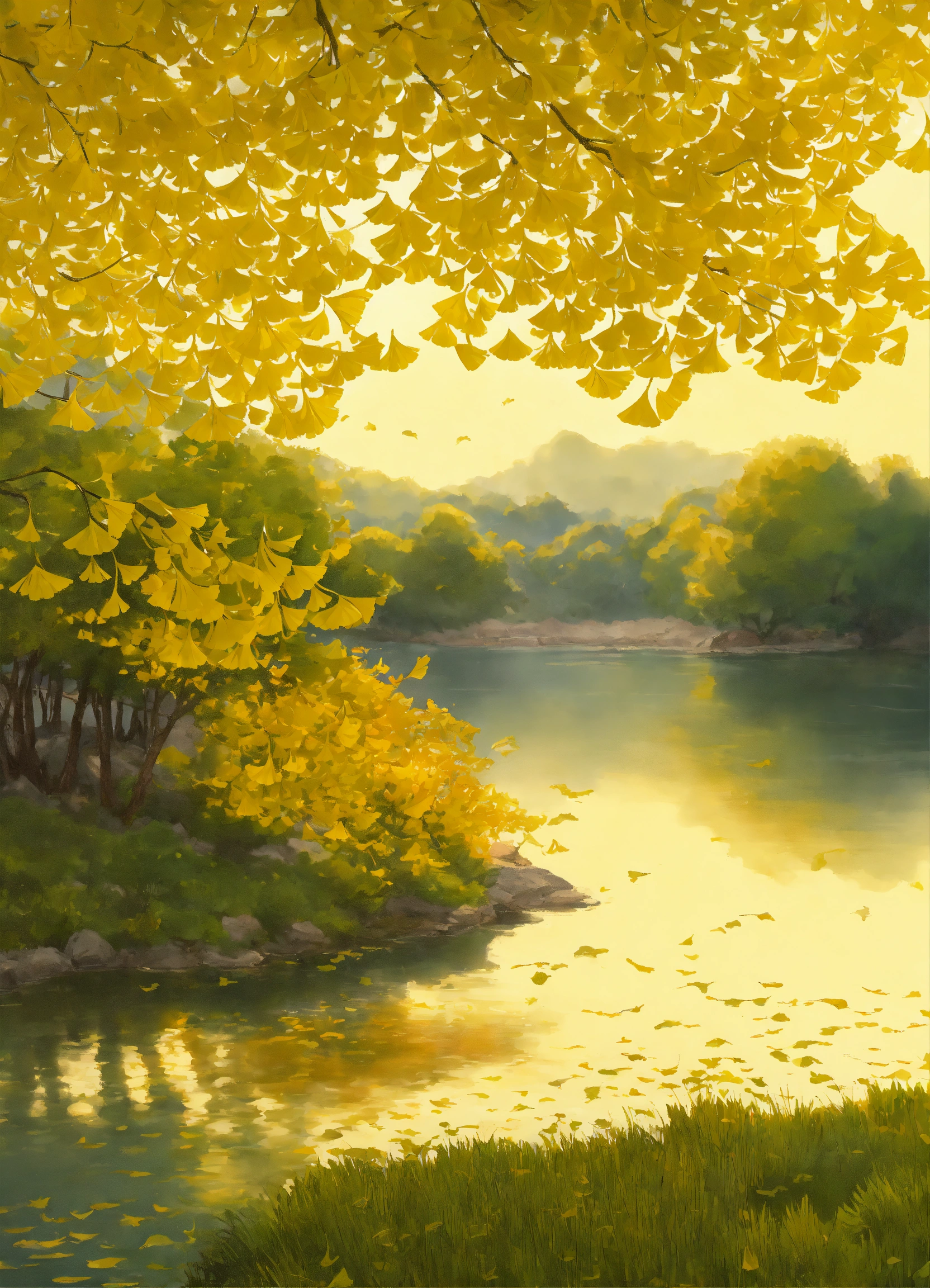There are many soft, small ginkgo trees on the edge of a small lake, and the wind blows, causing the ginkgo leaves to flutter, creating realistic and detailed images.