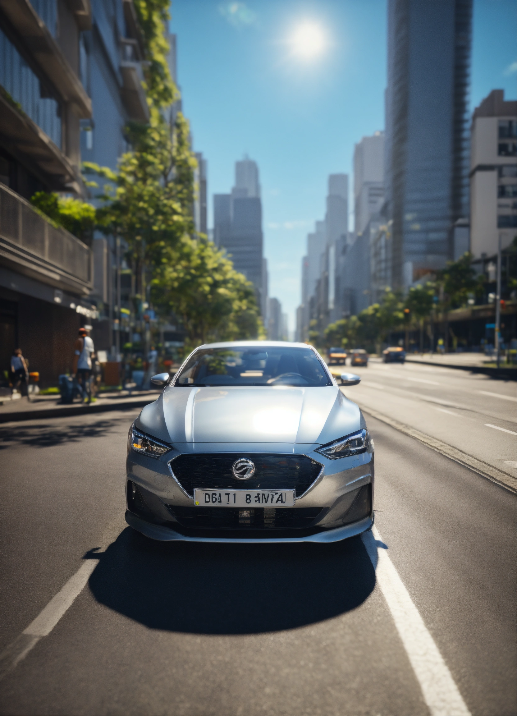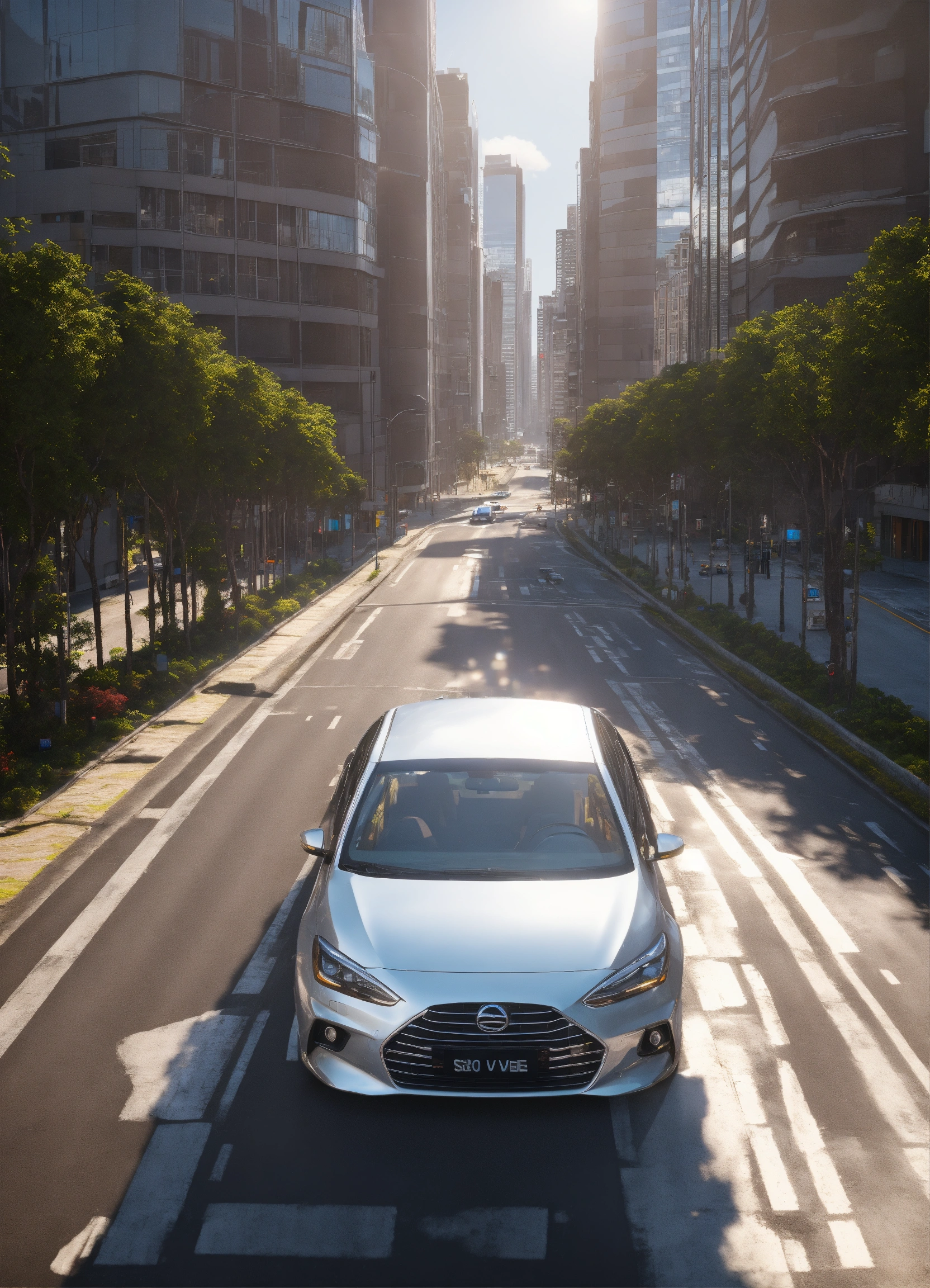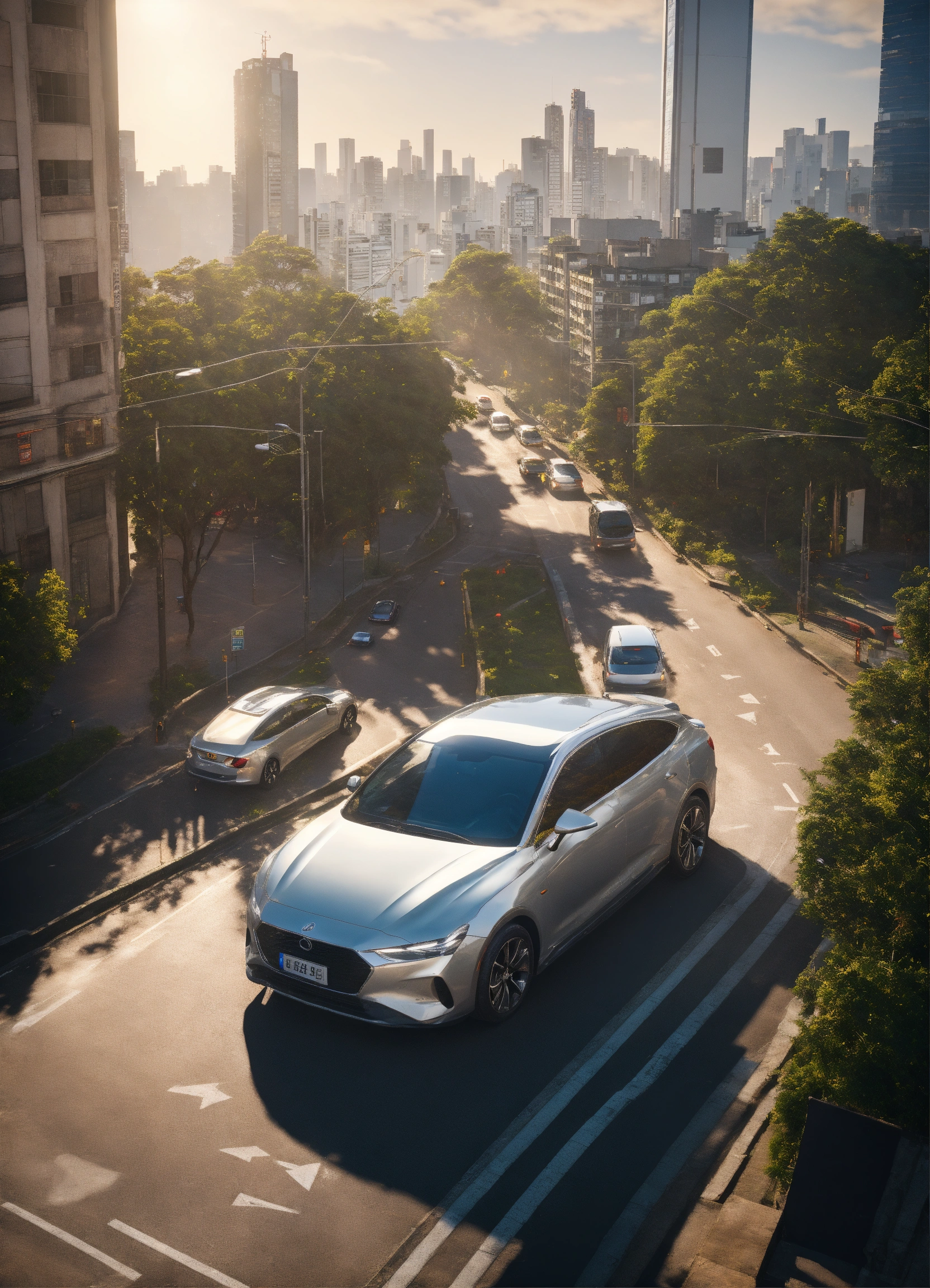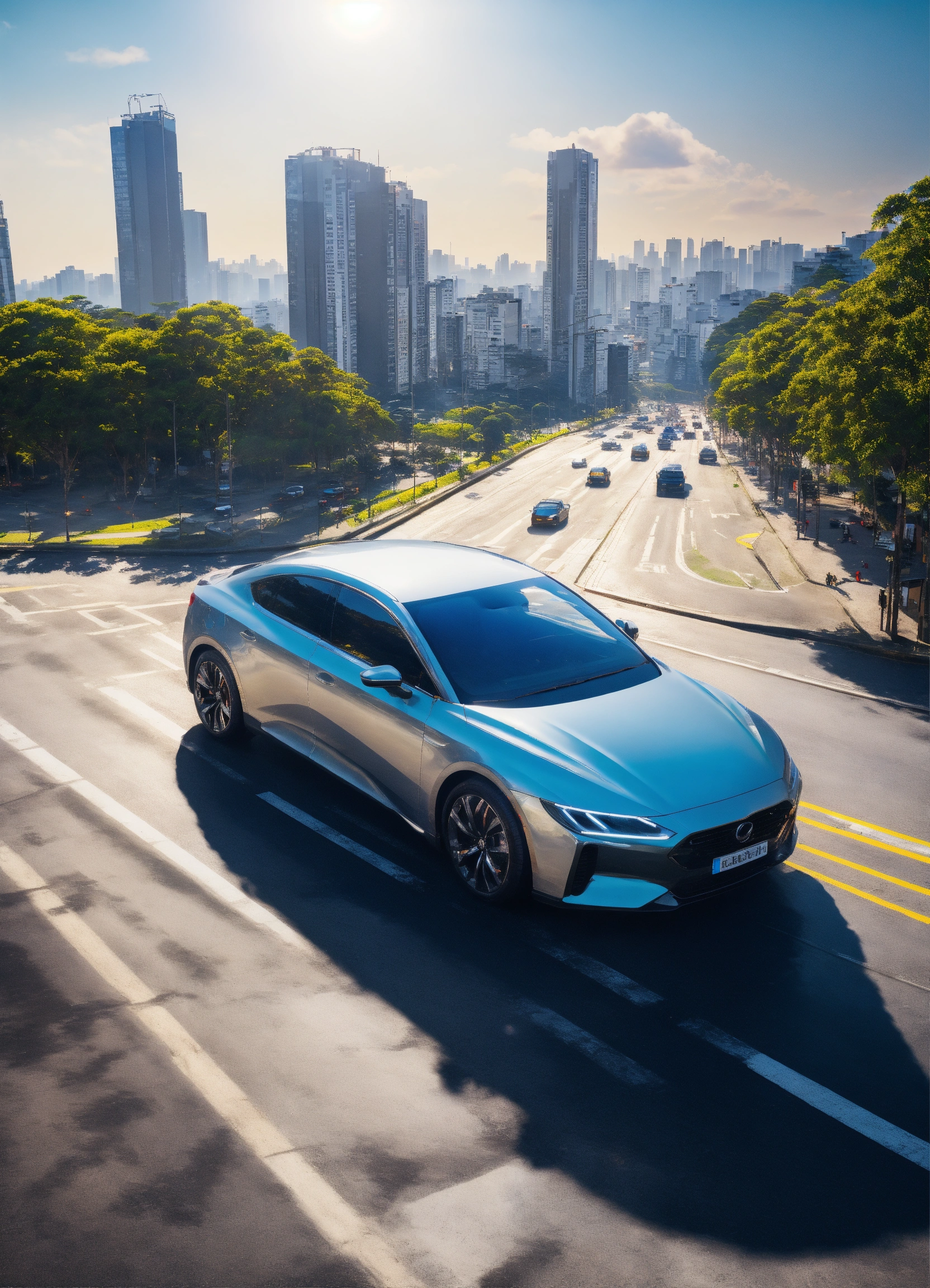 Hybrid silver car in sao paulo road, buildings, realistic, sunny day, aerial view, vibrant, unreal engine, 8k