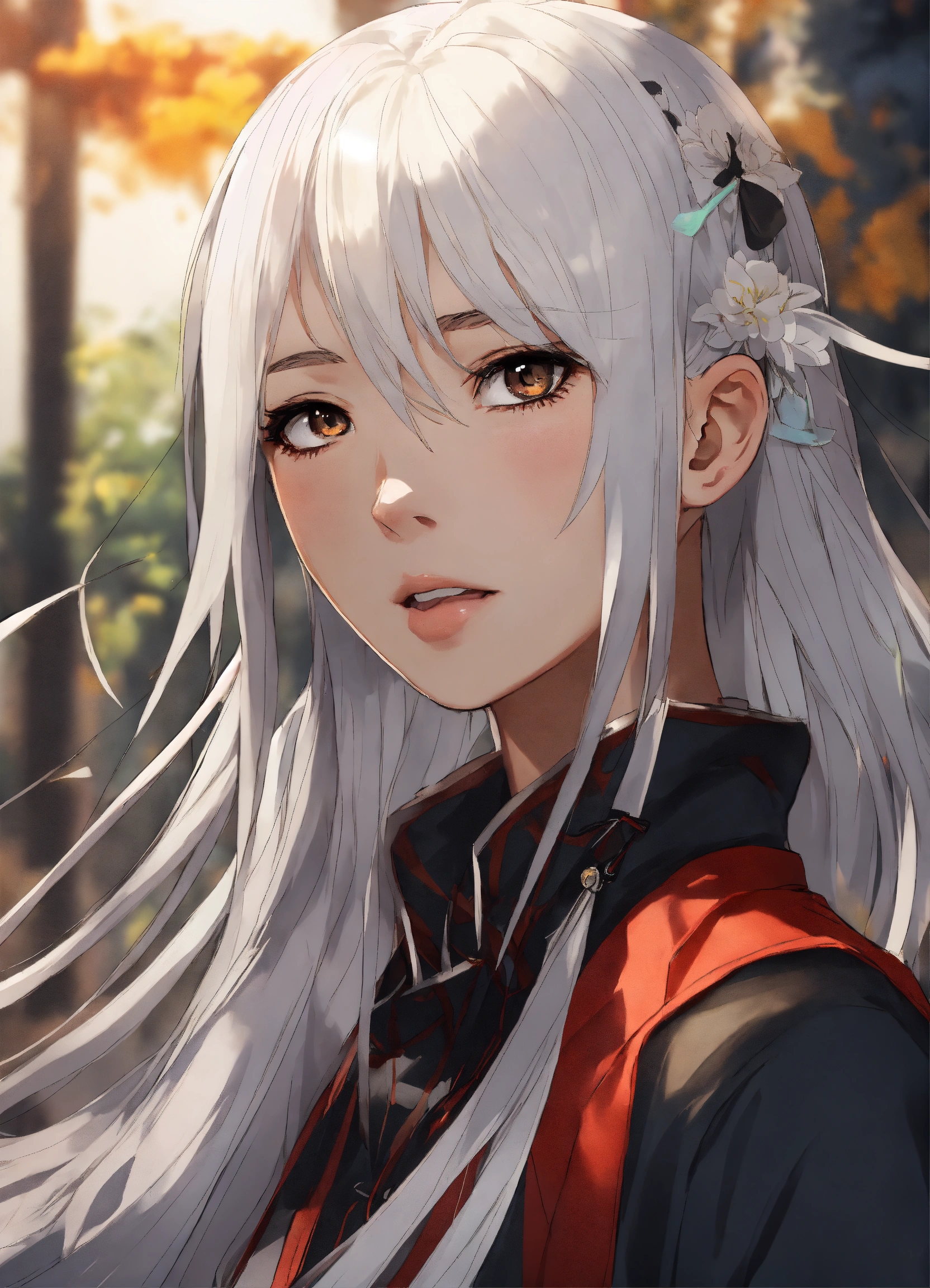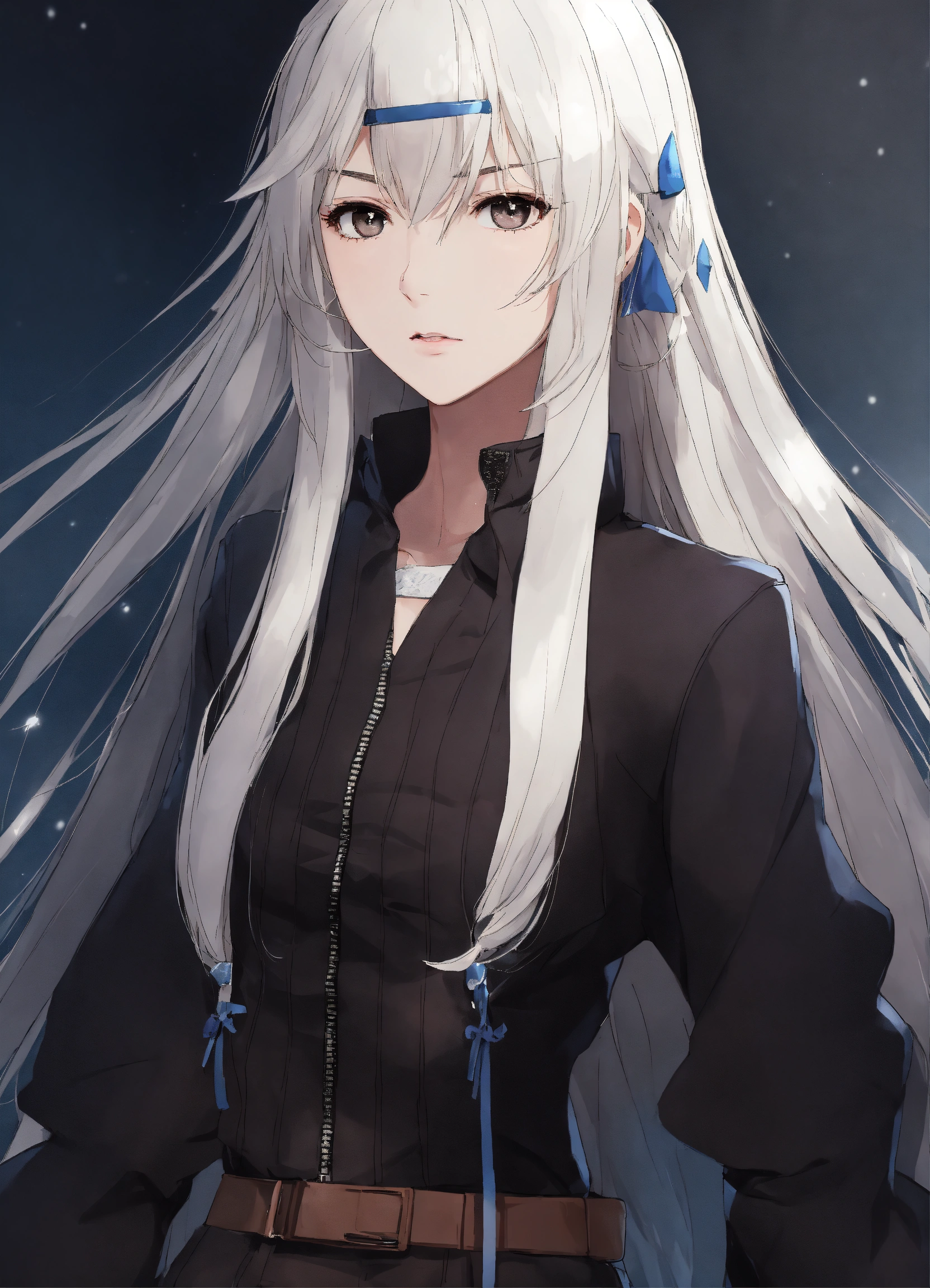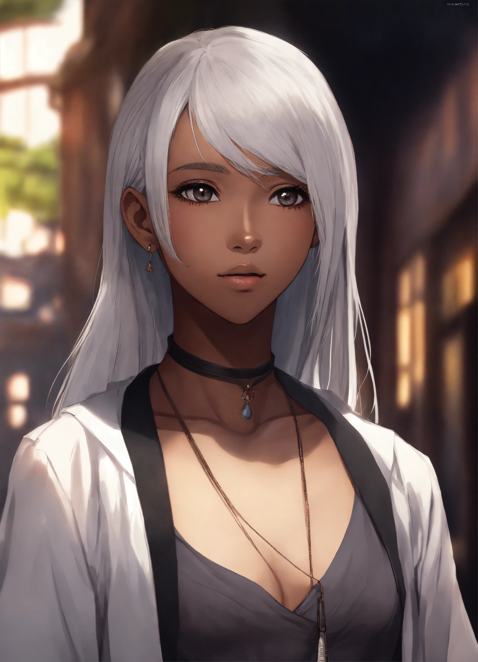 Girl 17 years old, dark skin, white straight hair, black eyes, fragile figure, height 173, anime reskin style