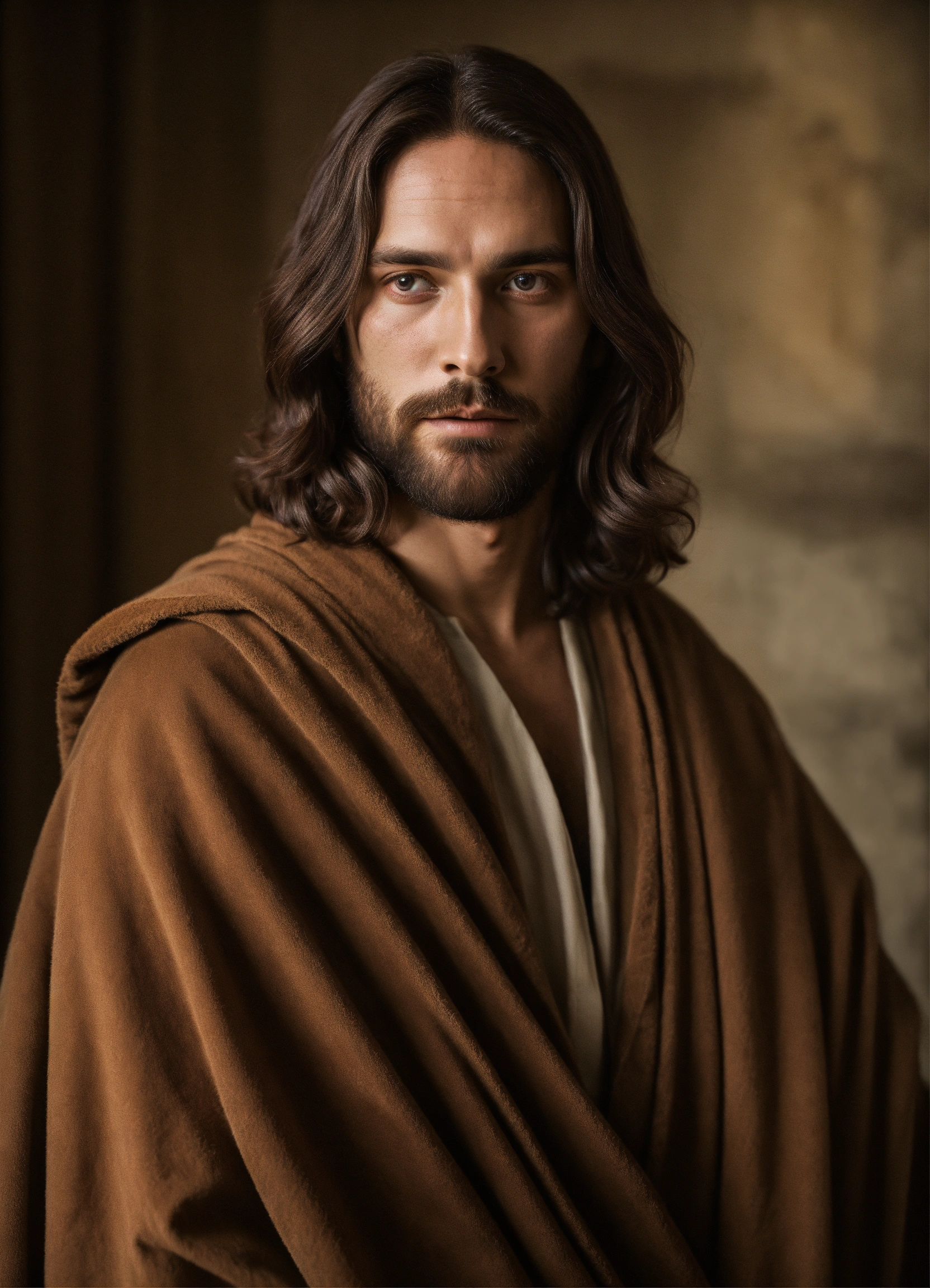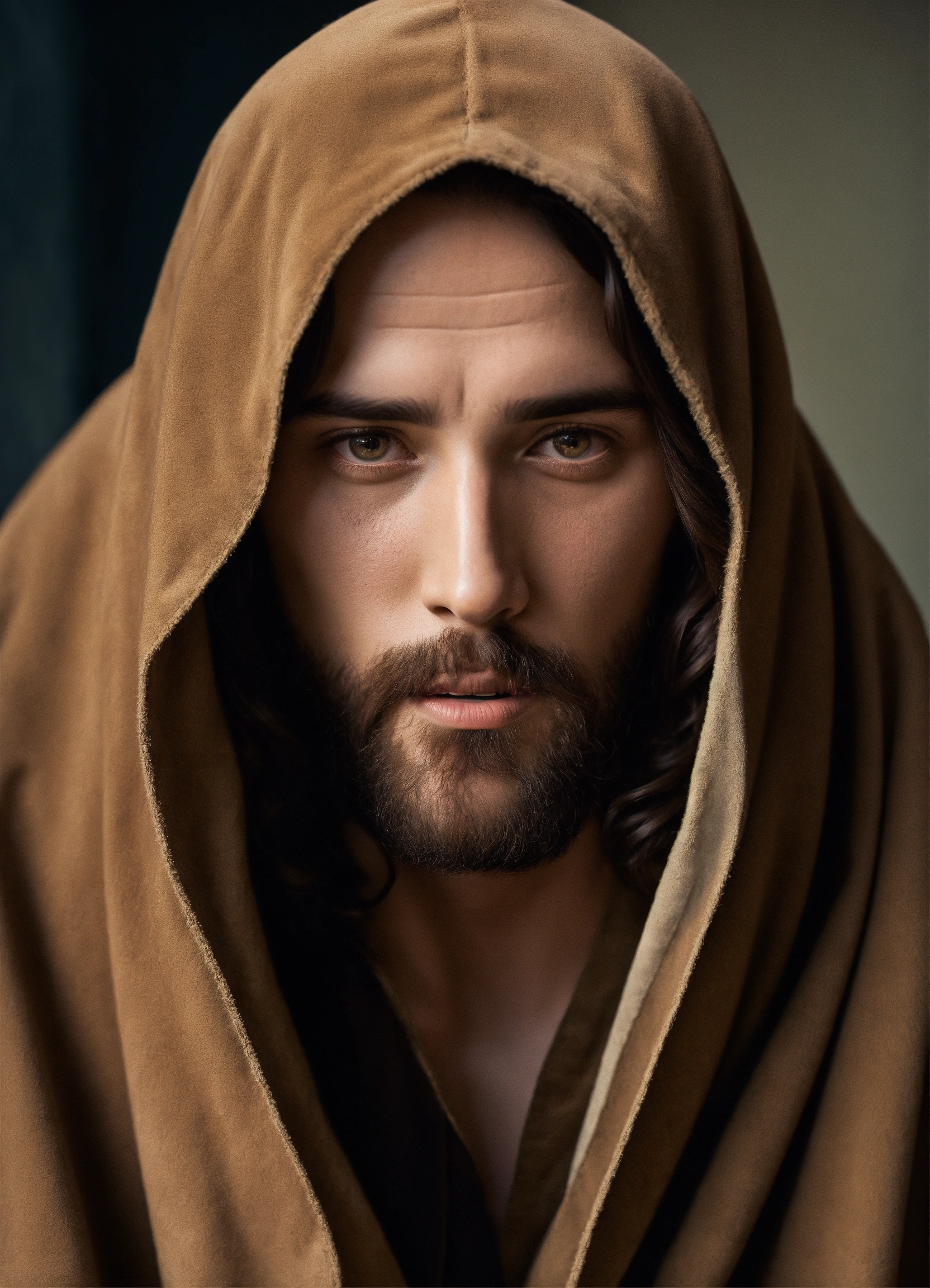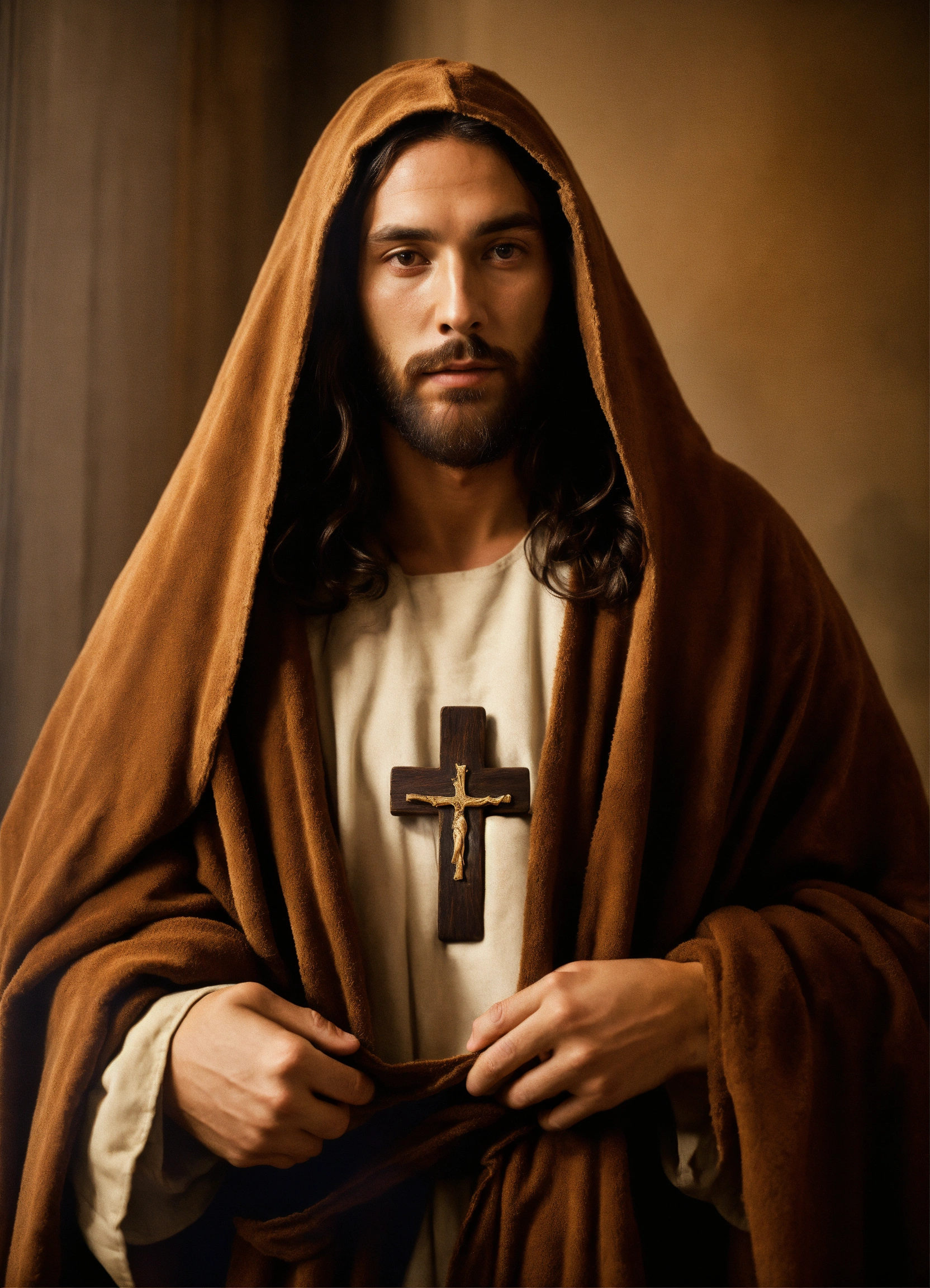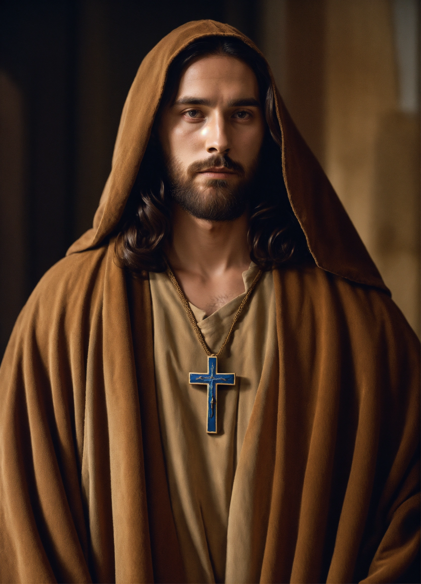 Jesus christ, realist photography, wearing clothes, brown robe, wearing a cross, cloak covering the back half of his head, looking straight ahead.