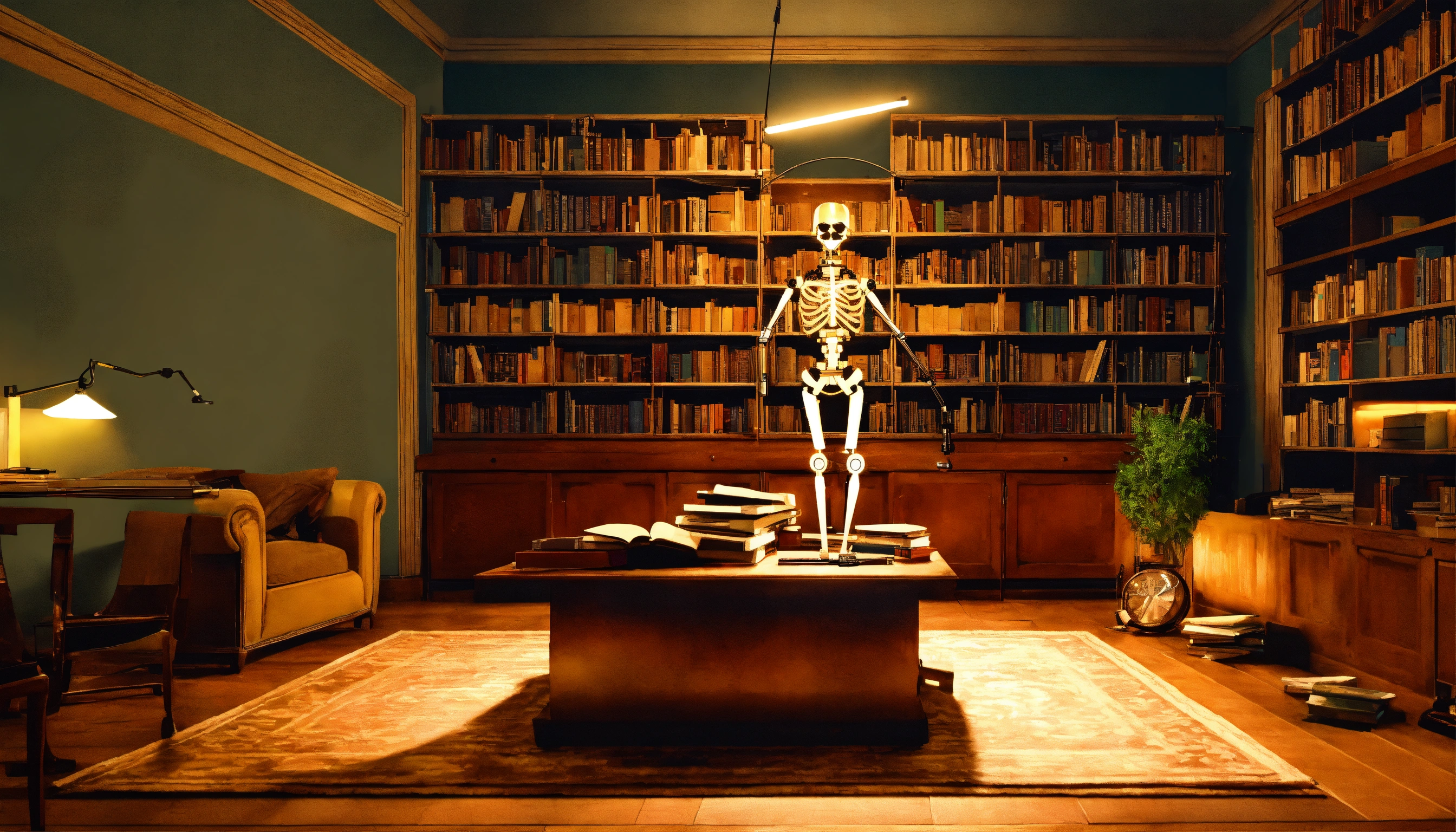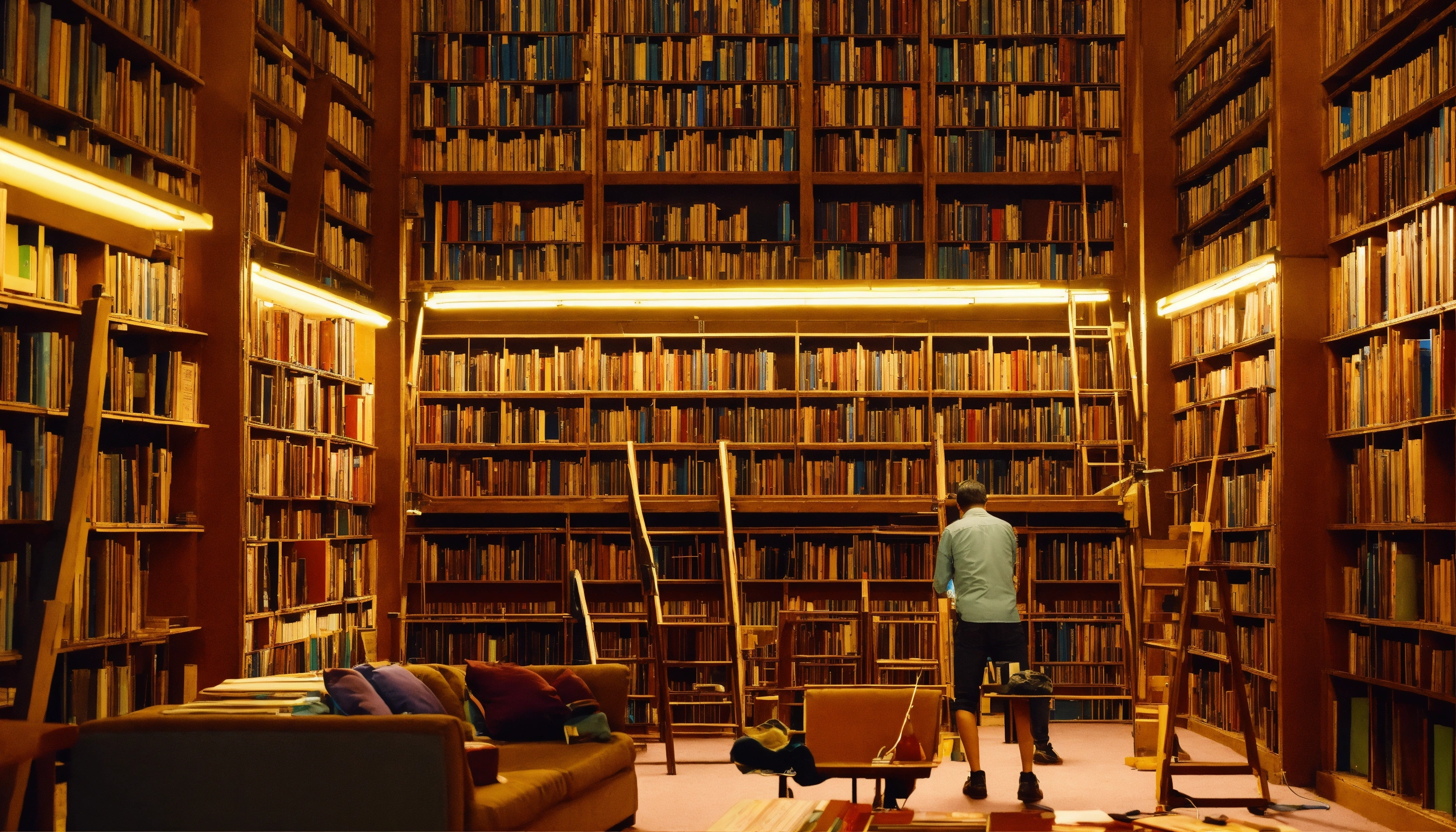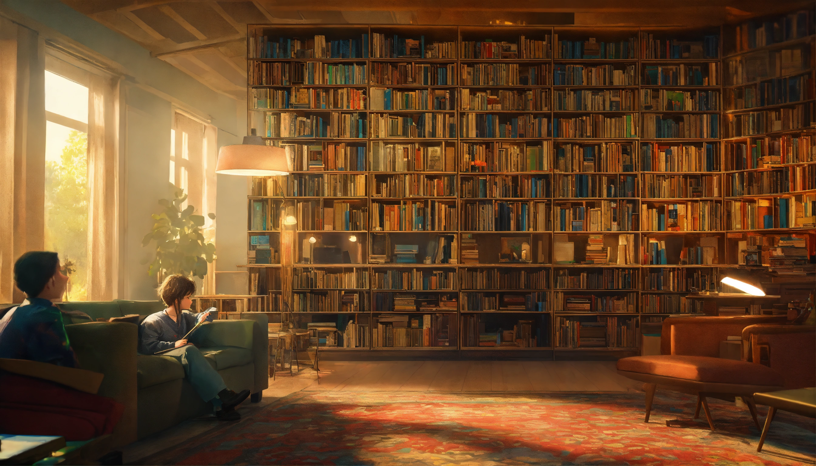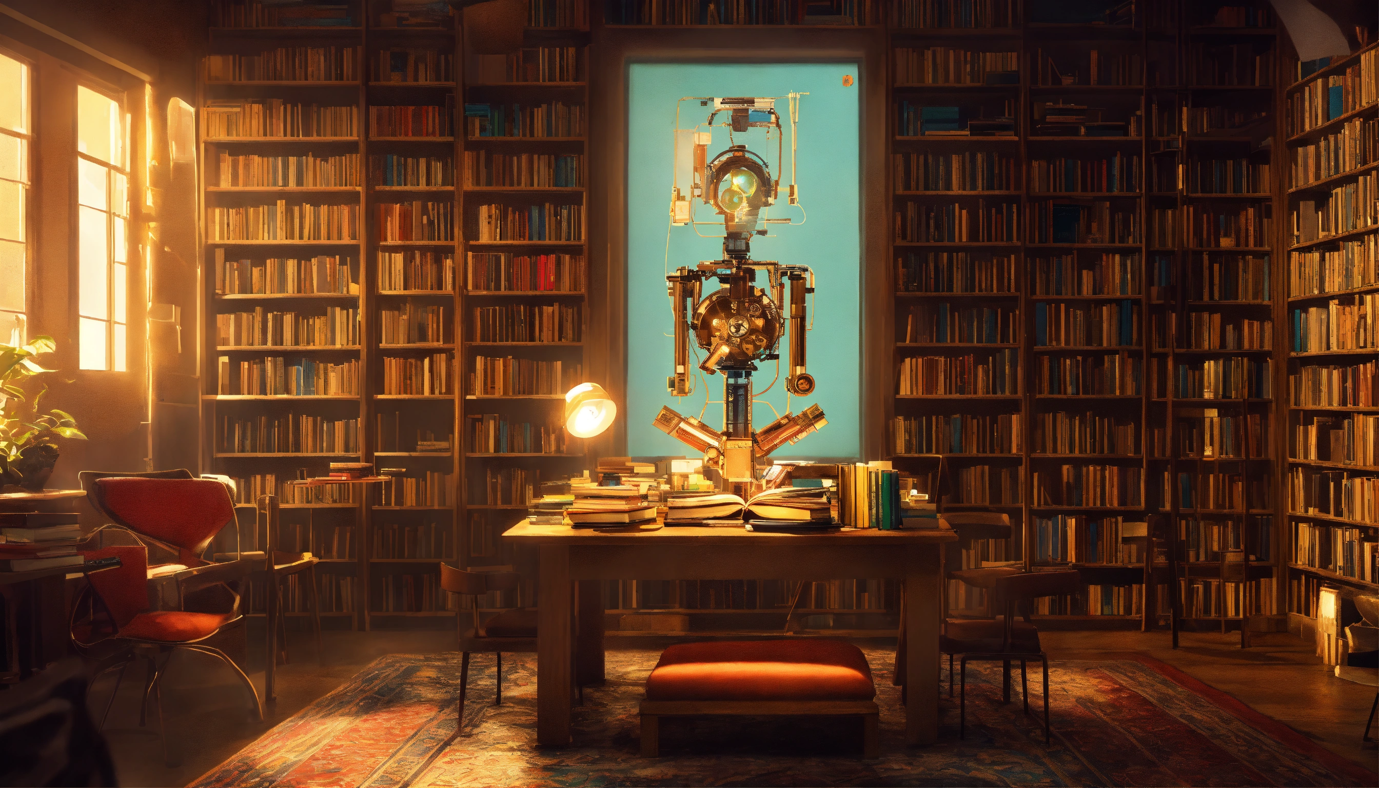 Una imagen de una inteligencia artificial generativa representada por un humanoide en posición pensativa, incluye libros, imágenes y videos dentro de un salón