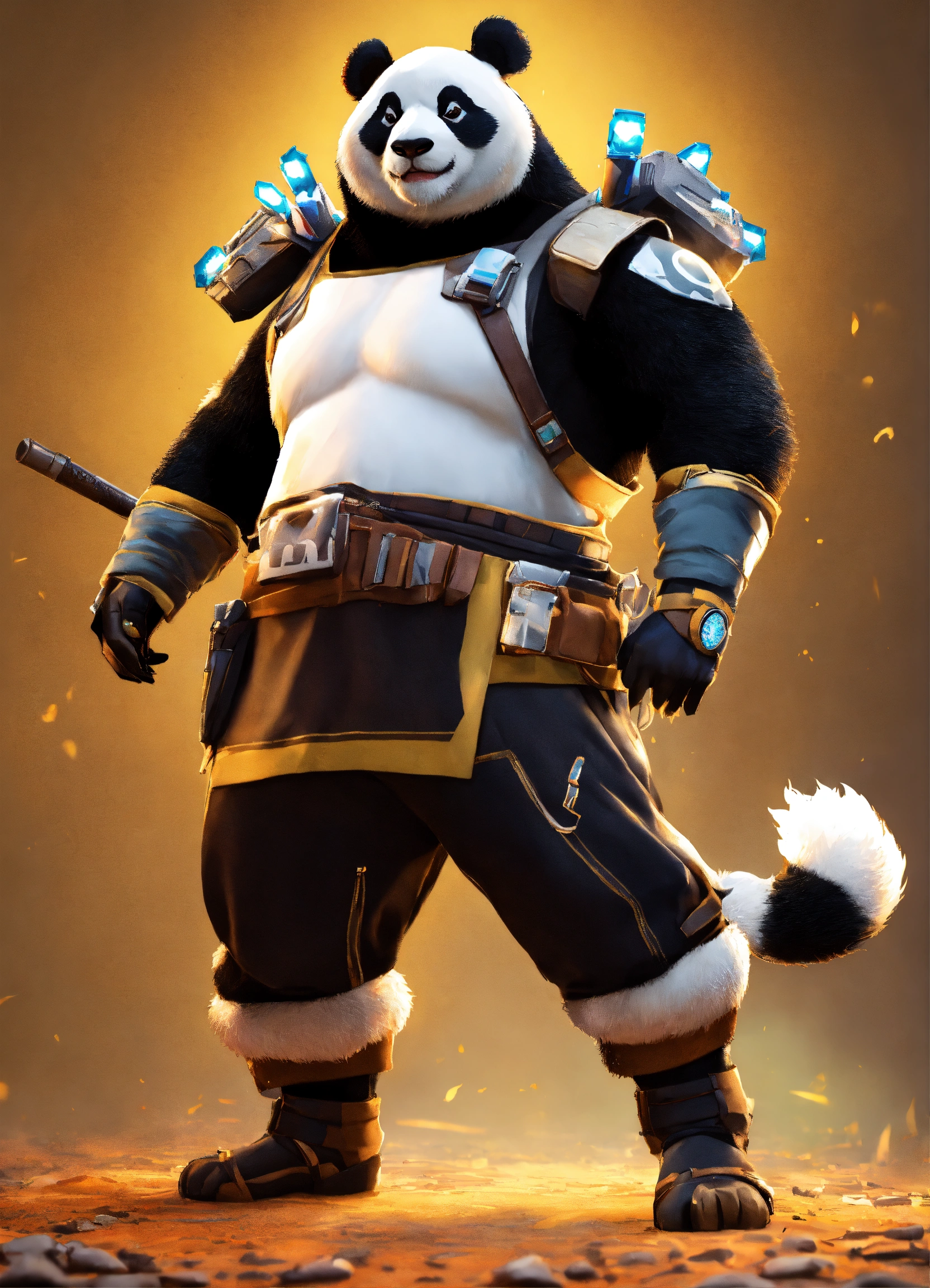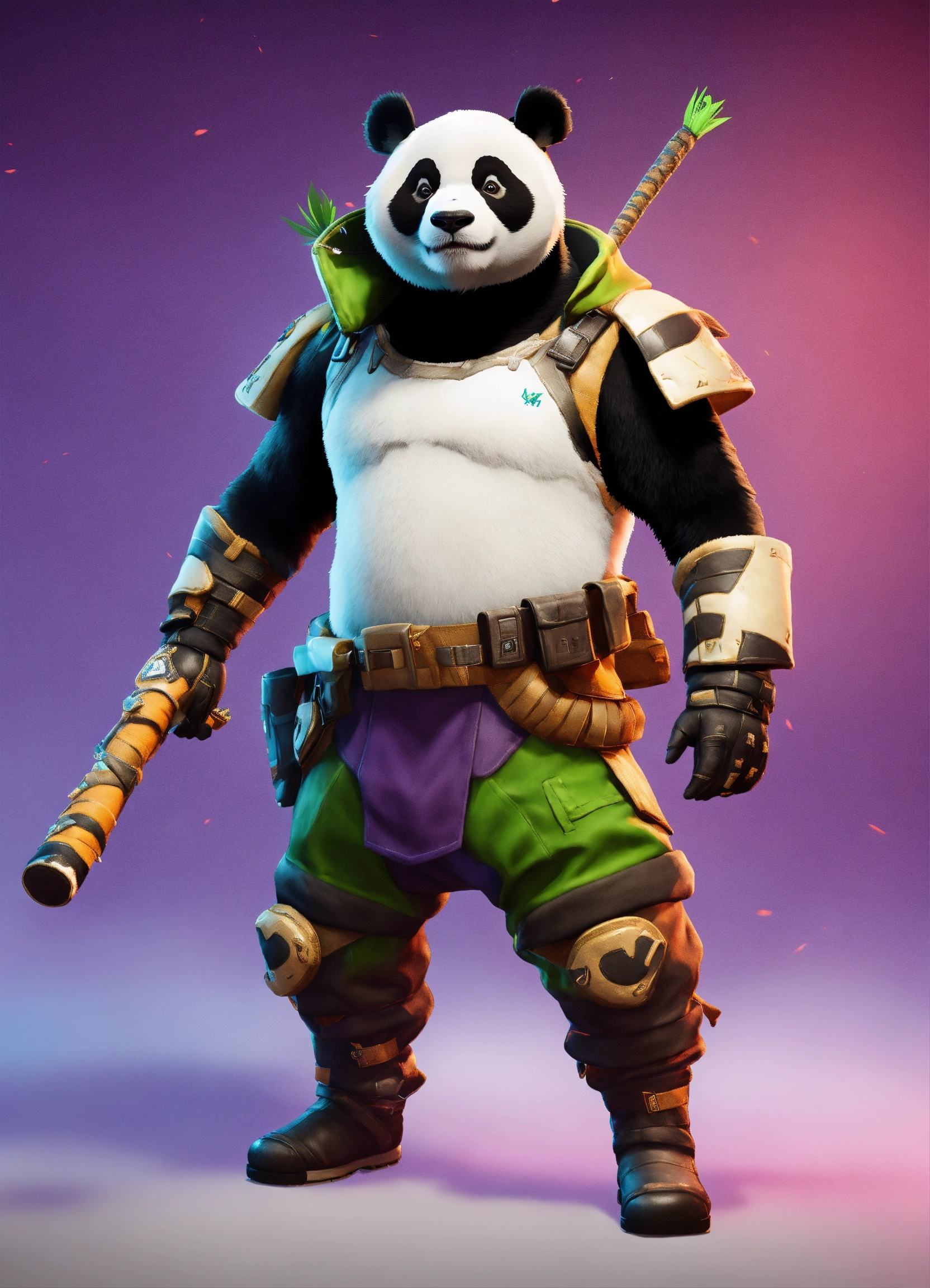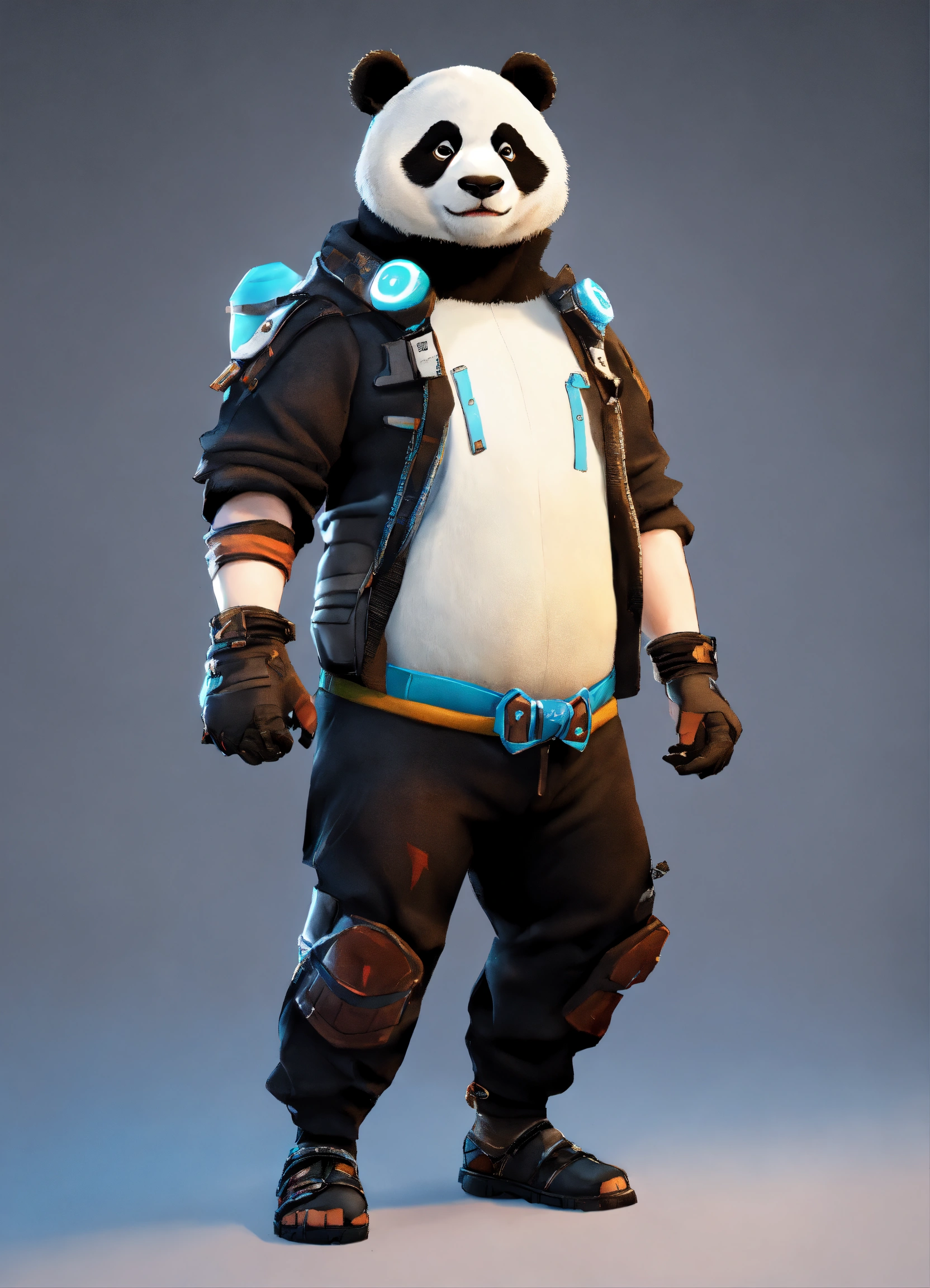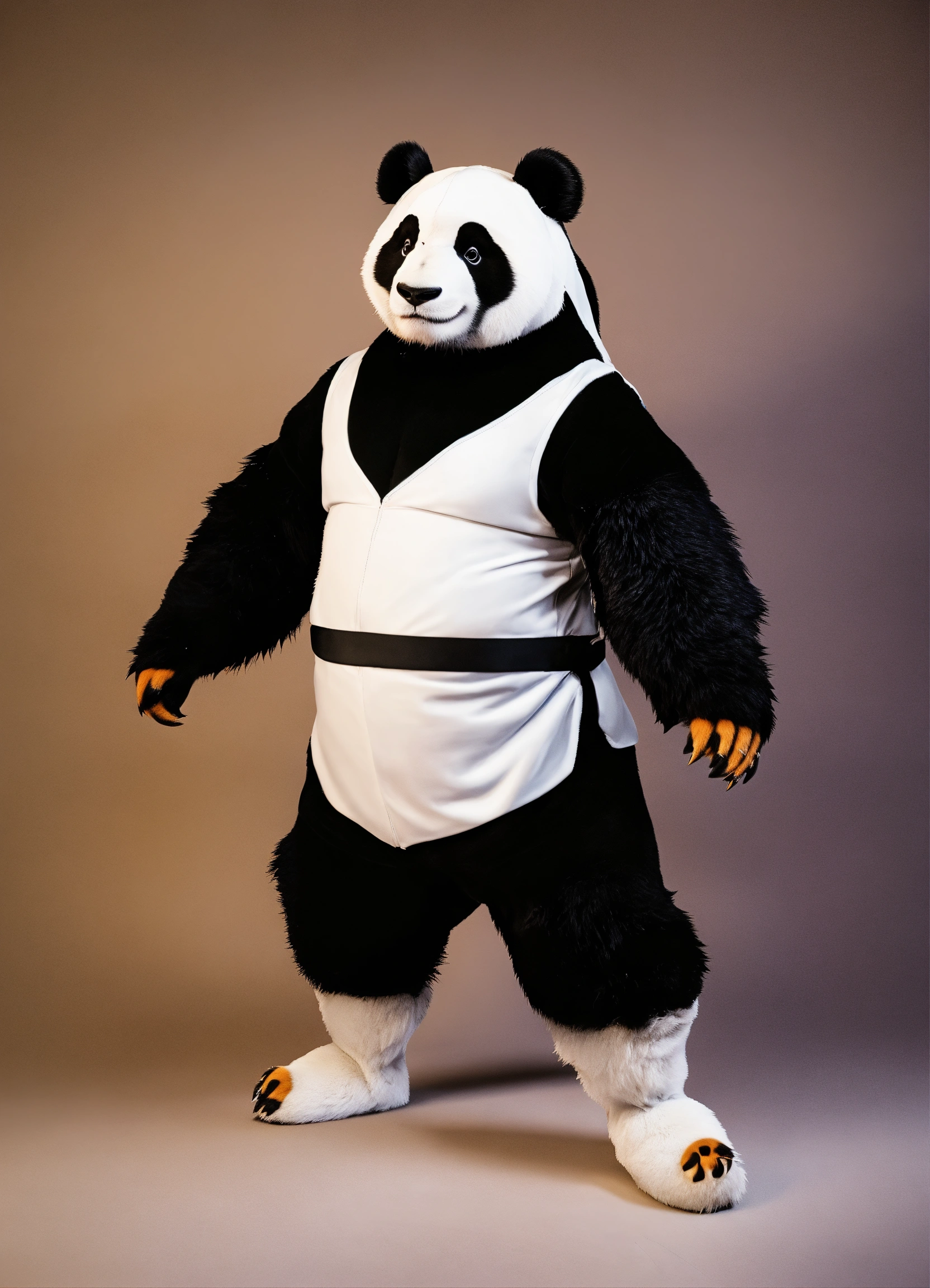 A photograph of a costume of a panda for a male character with fortnite style, male costume, white background, turnaround, claws, tail, full body