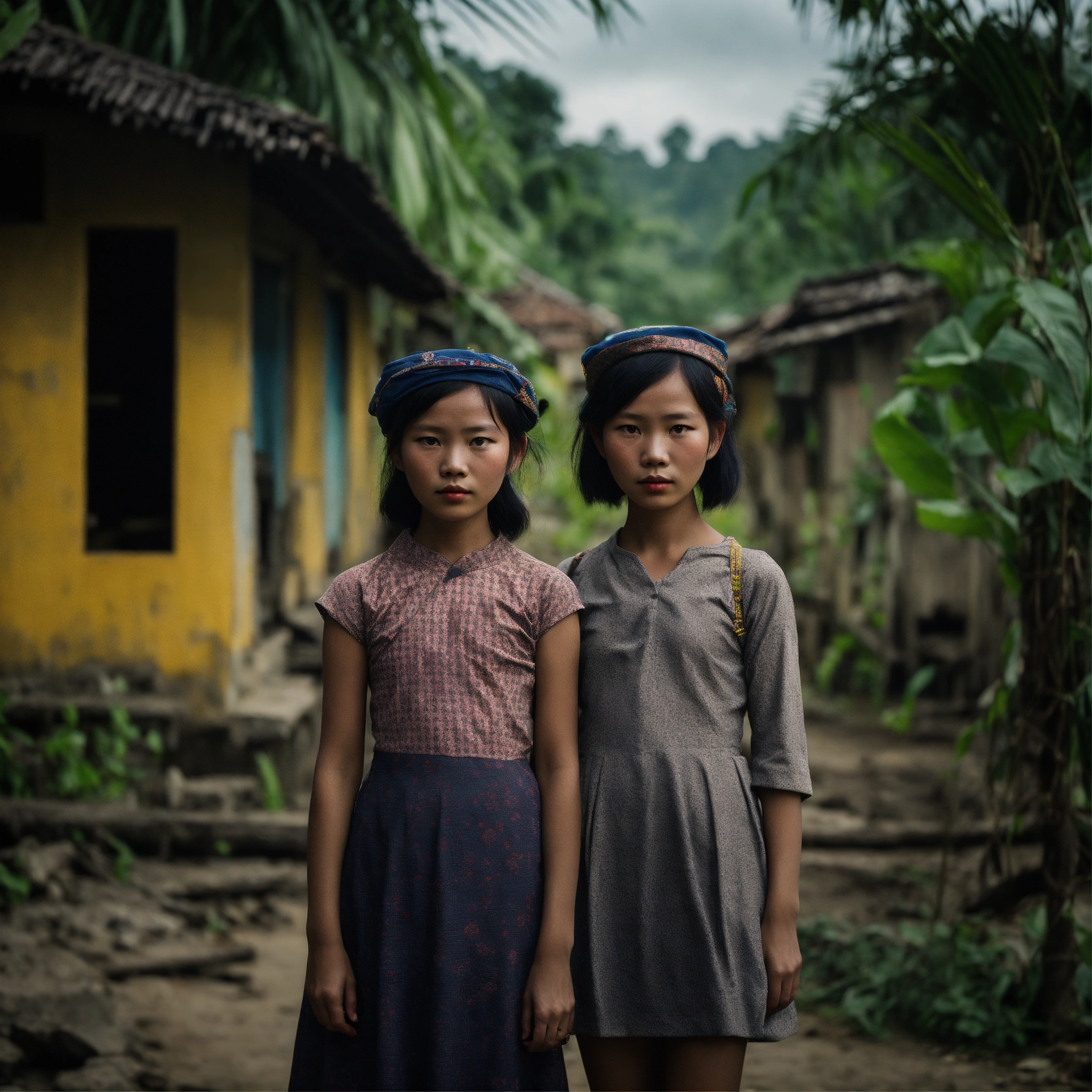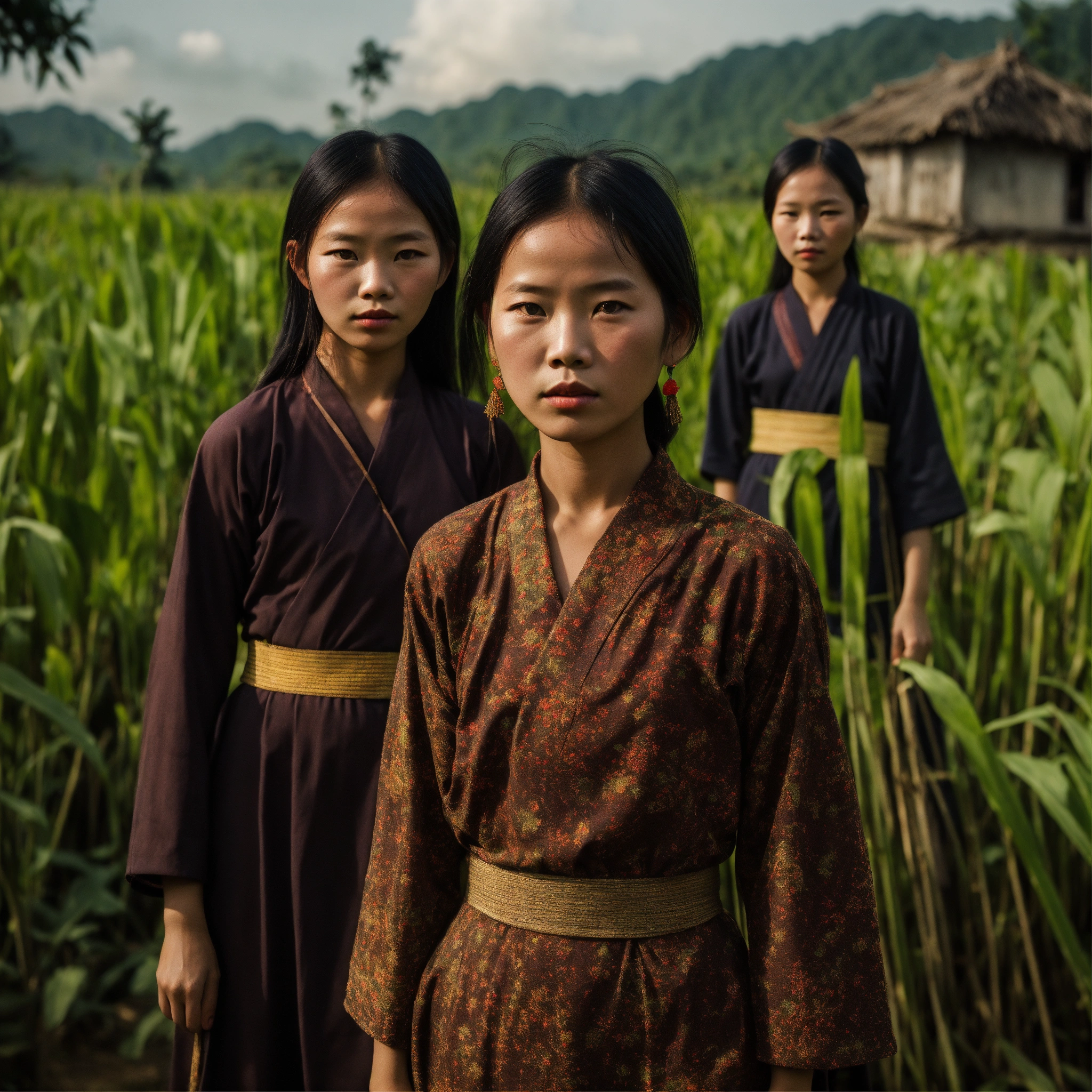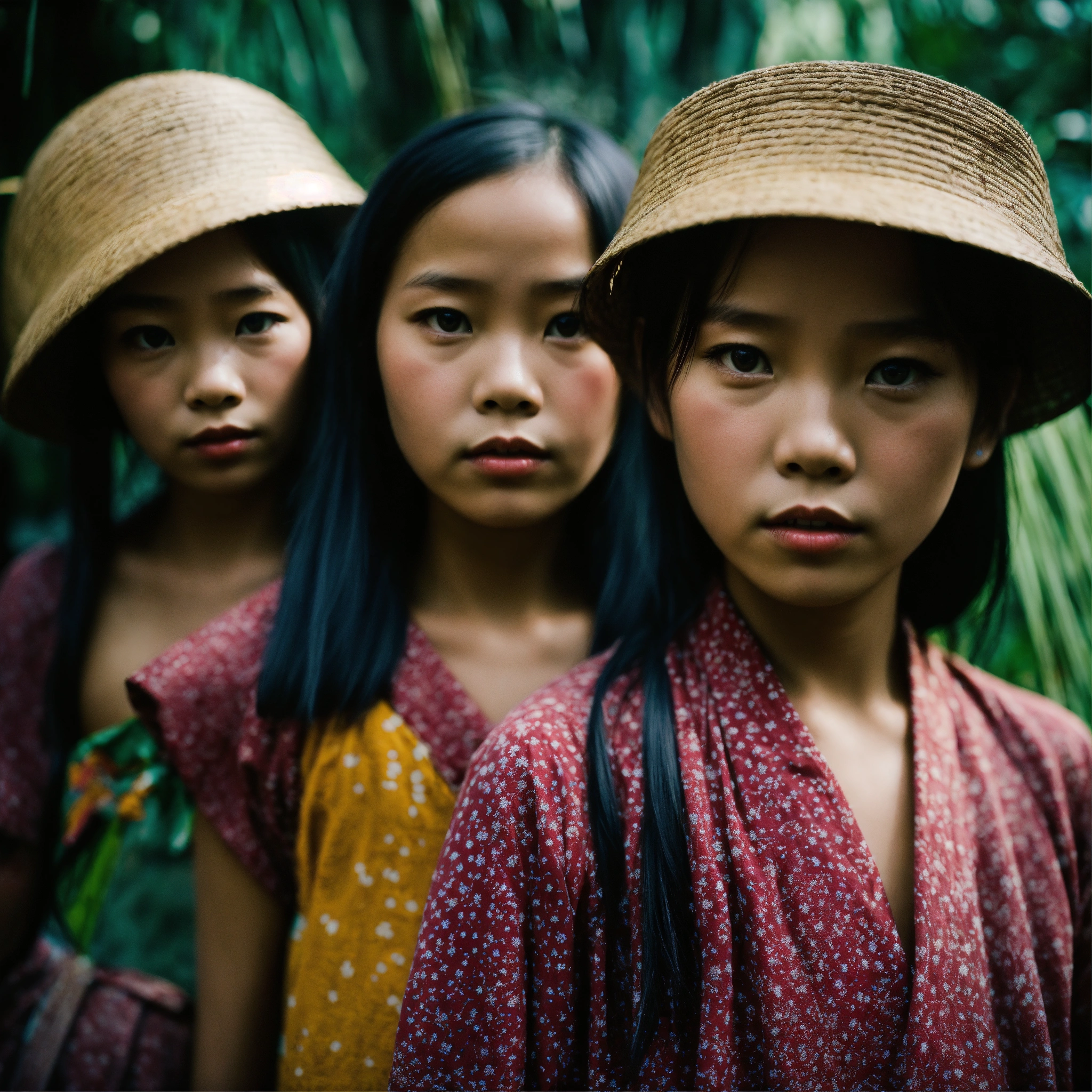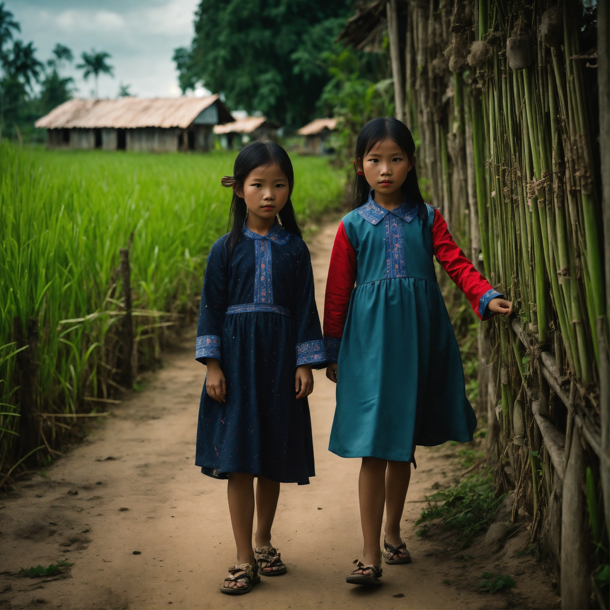 Leica portrait of young girls, in the style of dark hues, rural vietnam, coded patterns, sparse and simple, uhd image, urbancore, sovietwave