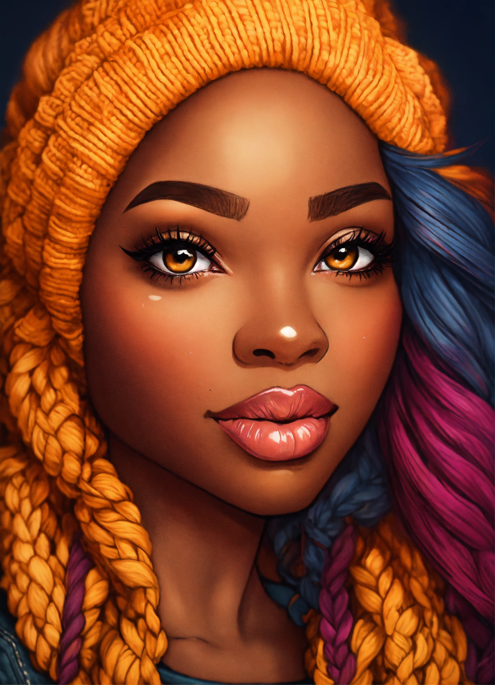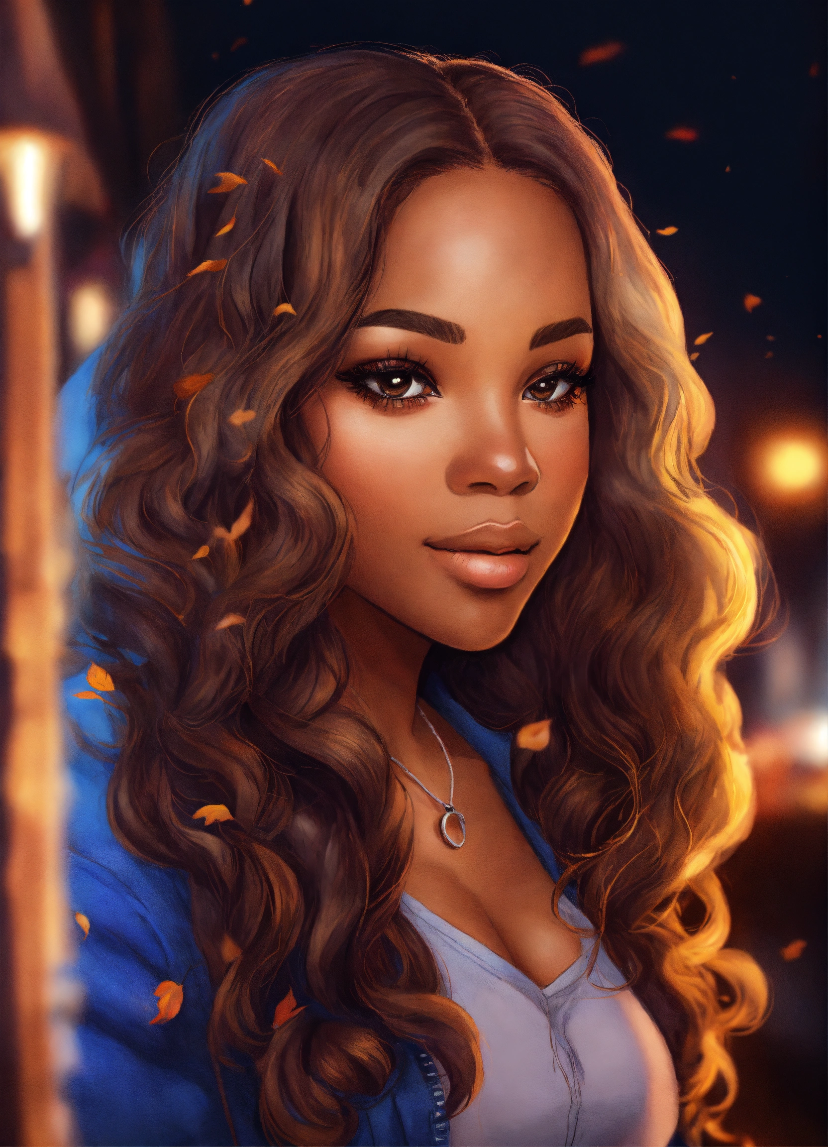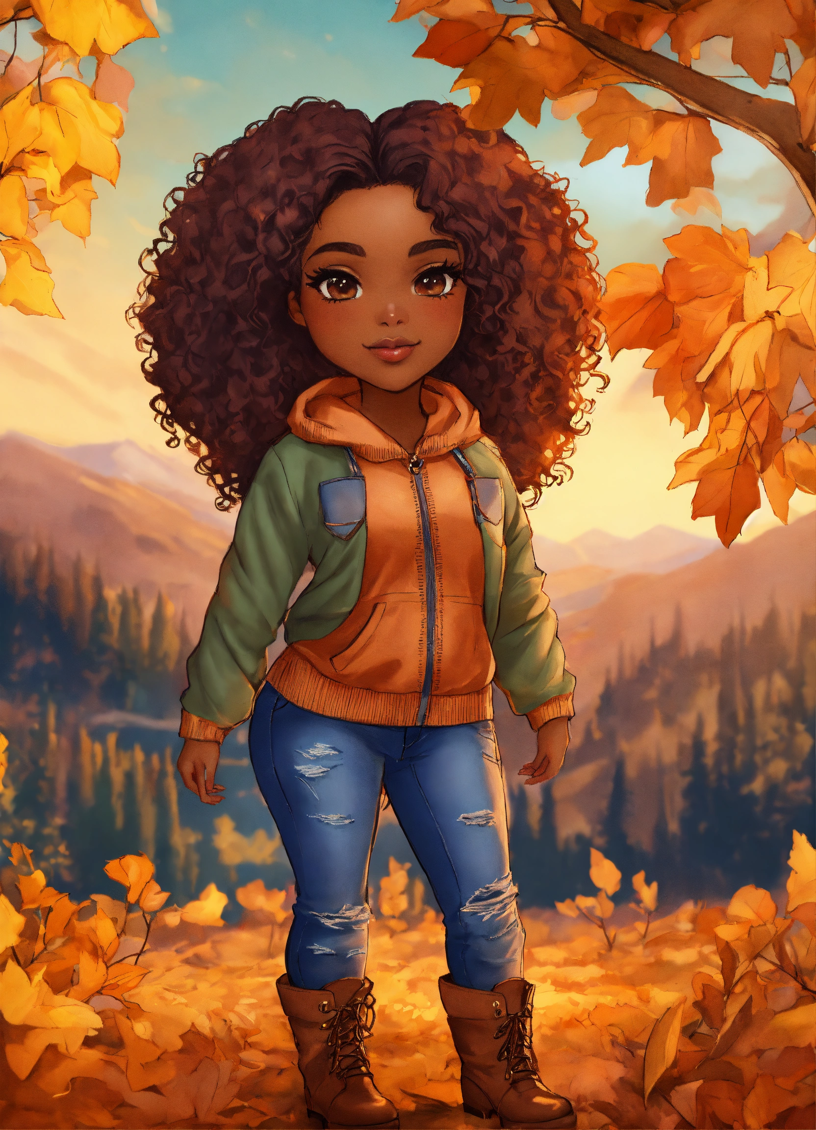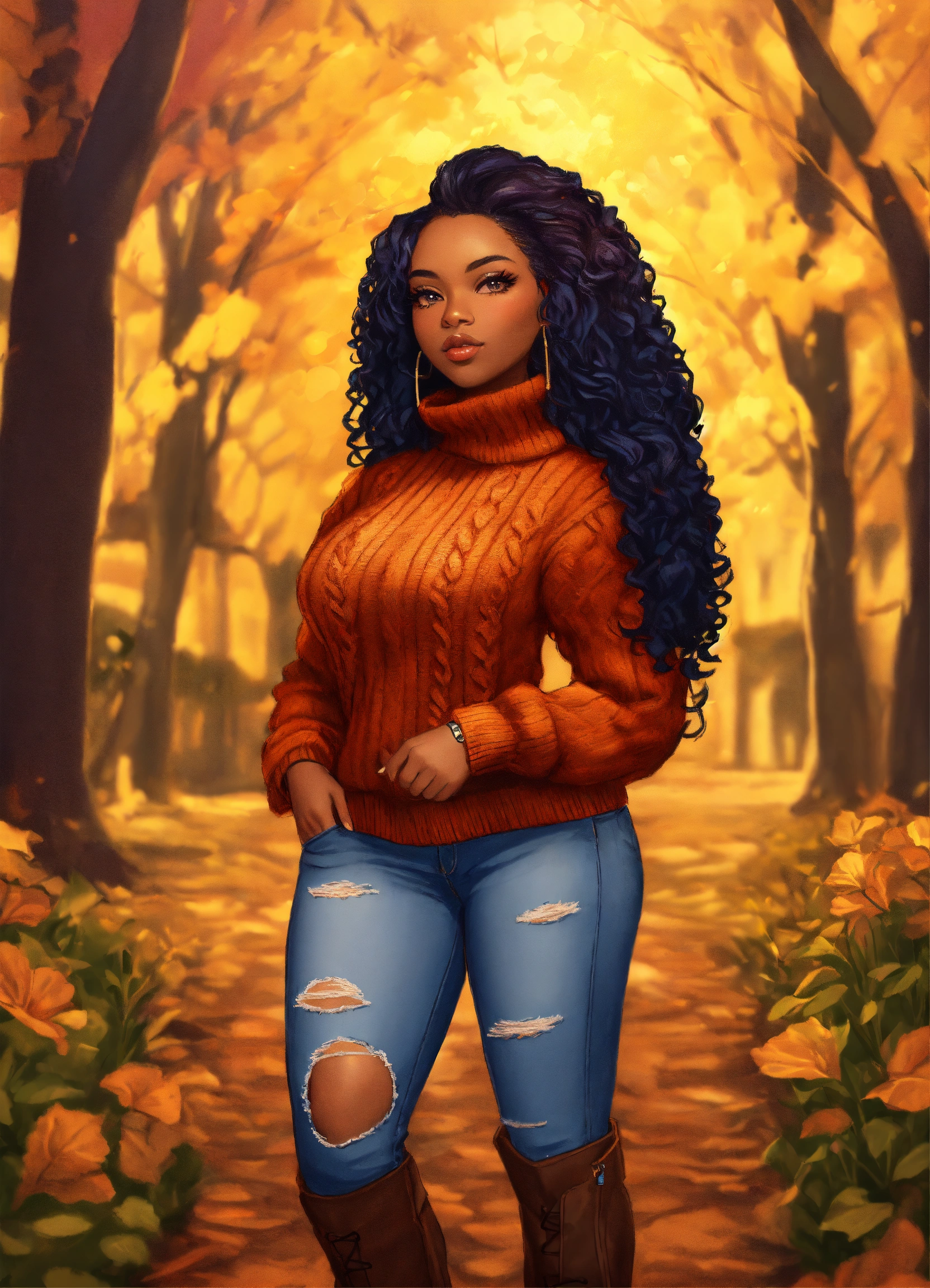 Generate a detailed color pencil drawing illustration in chibi art style. the composition should be a longshot, featuring an african american woman around 35 years old, full body photo, full figured, full lips, onyx skin tone, hyper-detailed features, long lashes, and long wavy hair. she should be wearing a neutral colored cable knit sweater, jeans, and boots. she should stand int in background reflecting the fall season. the artwork should be computer-generated using octane rendering . the final image should be of high quality, preferably in 8k resolution.