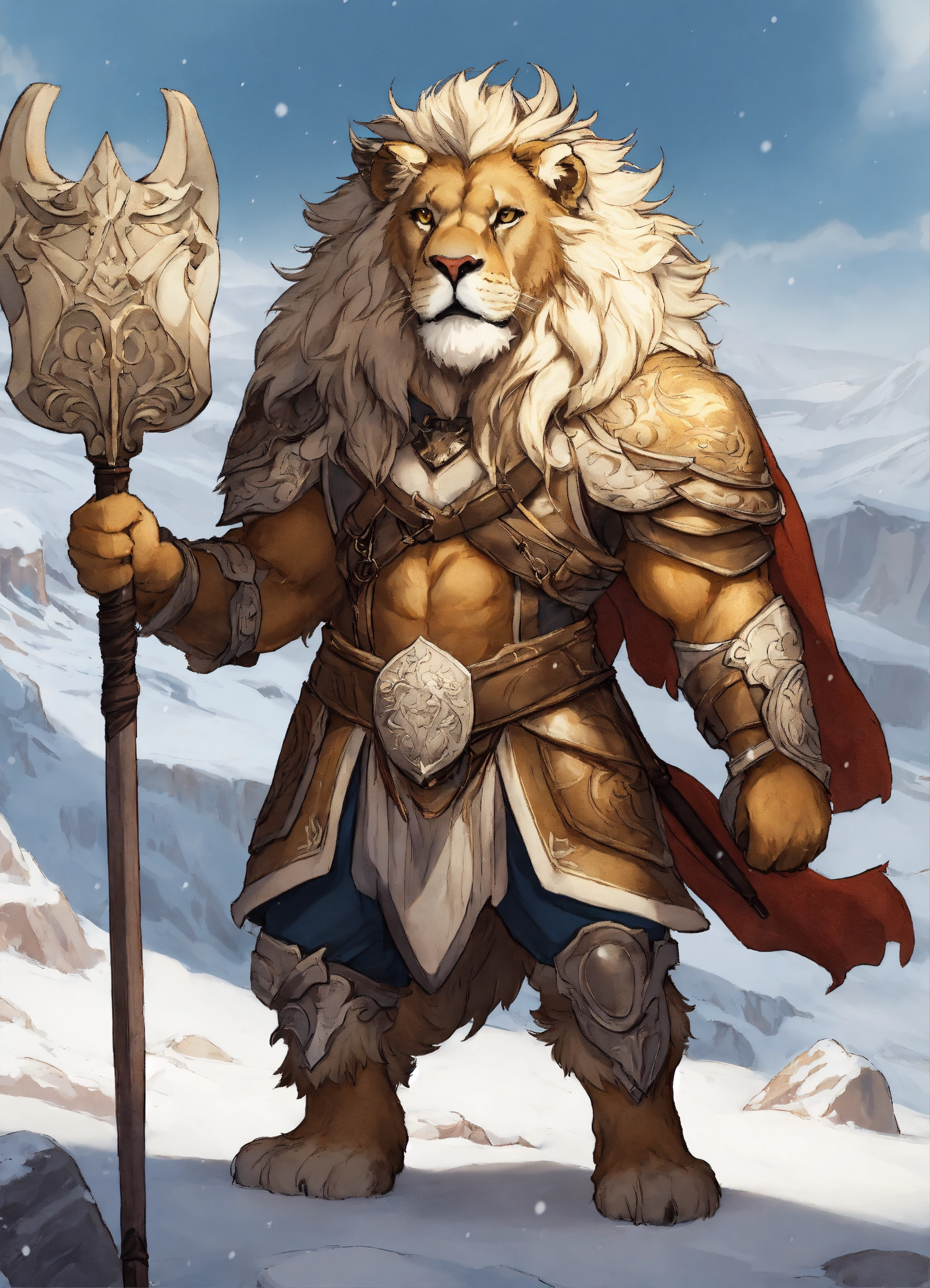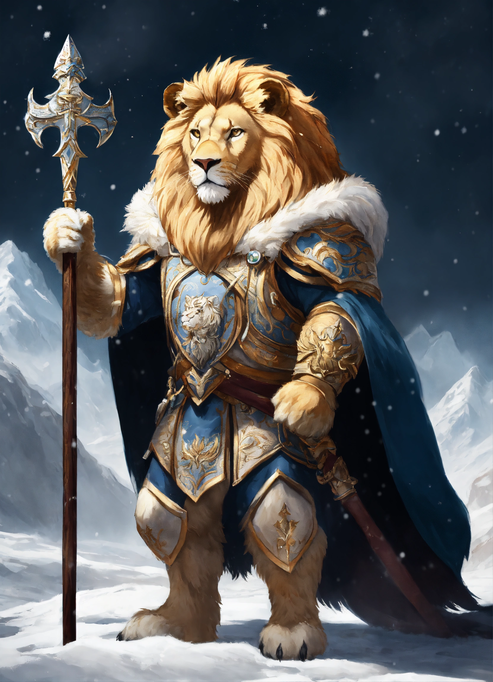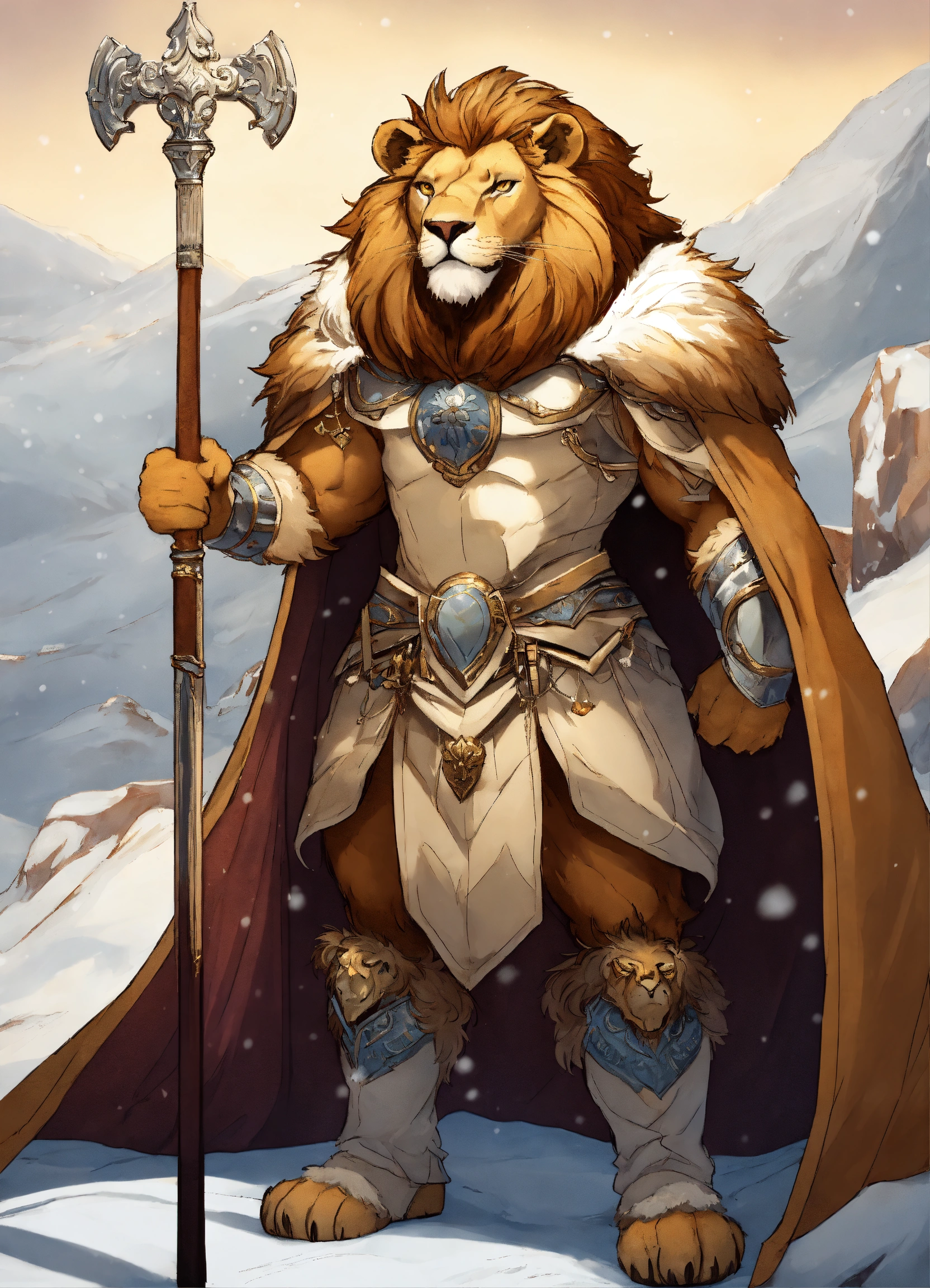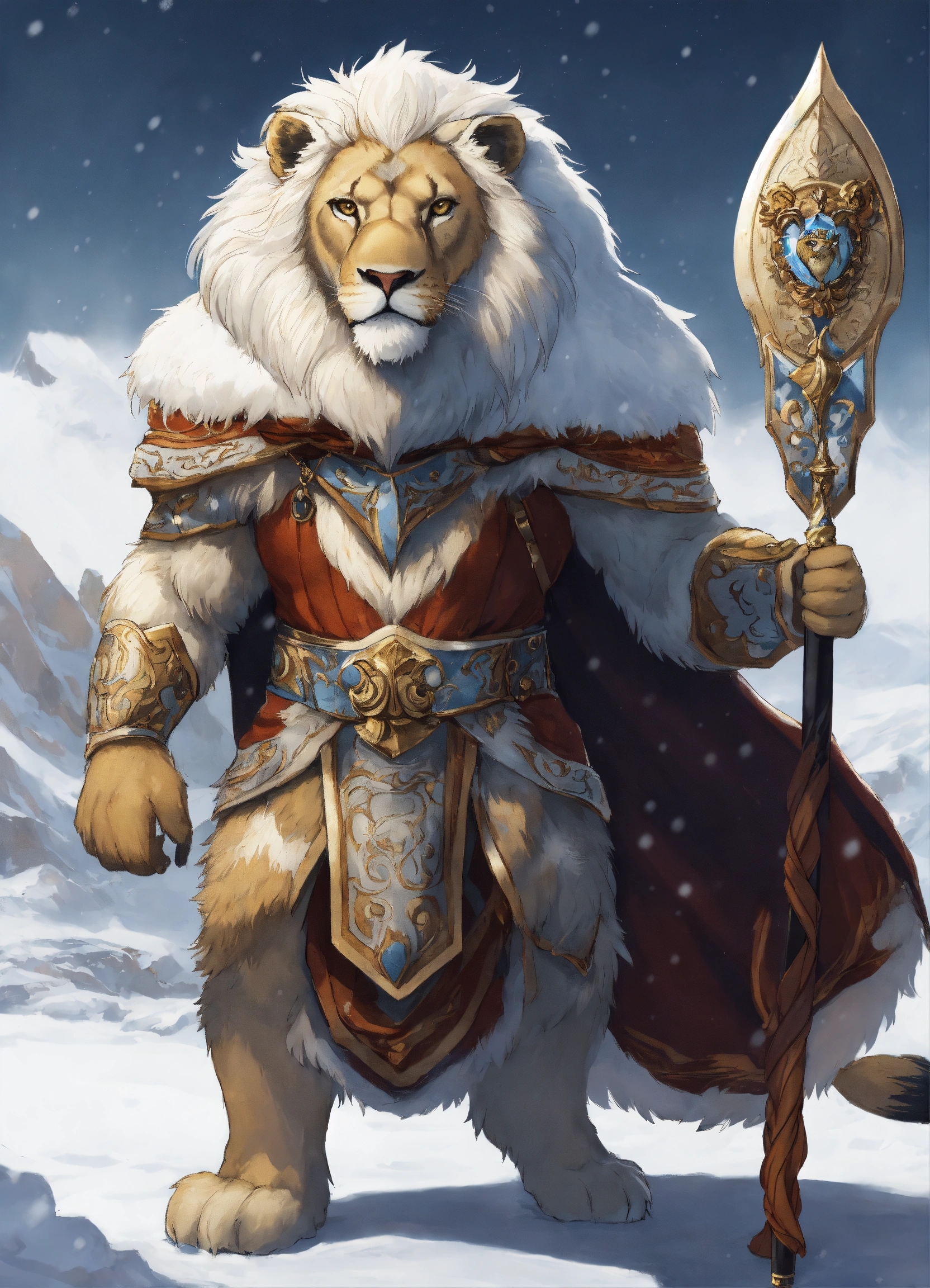 Anthropomorphic, buff lion with white fur, wearing a heavy cloak. the background is a snowy tundra. the lion has white fur and is holding a staff